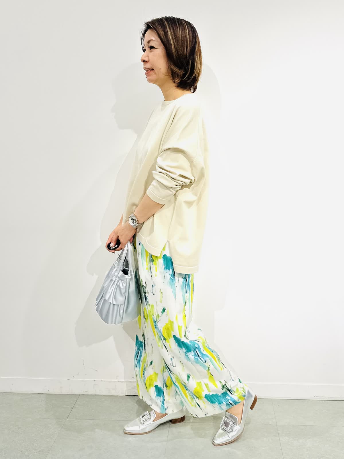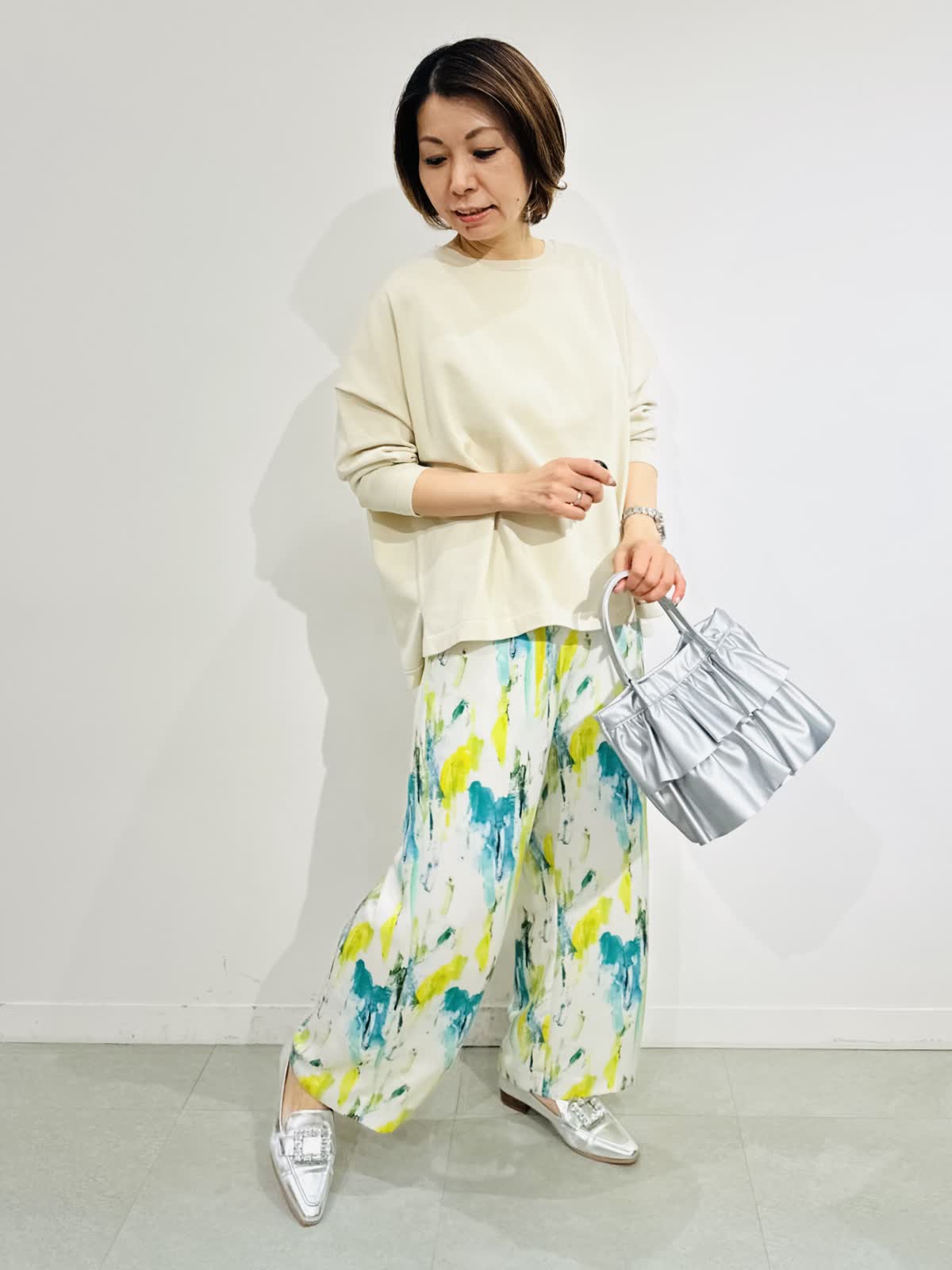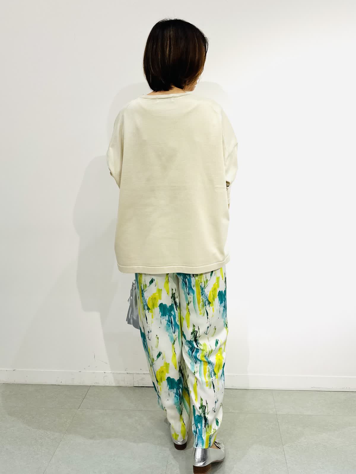 【着用サイズ】全て9号 【着用カラー】ニット:ベージュ パンツ:ペパーミント 春夏ピッタリ!休日コーデ。ニットは軽く膨らみがありハリ感があります。サラッとした上質コットンなので着心地が◎サイドスリット入りなので横から見てもオシャレ。パンツは、INEDオリジナルプリントでサラッとした肌触りとシワになりにくい素材。ウエスト調整可能なので楽ちんパンツです。着映えするプリントパンツで休日お出かけコーデおすすめです。
