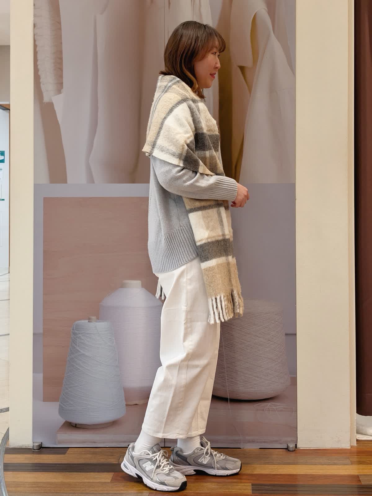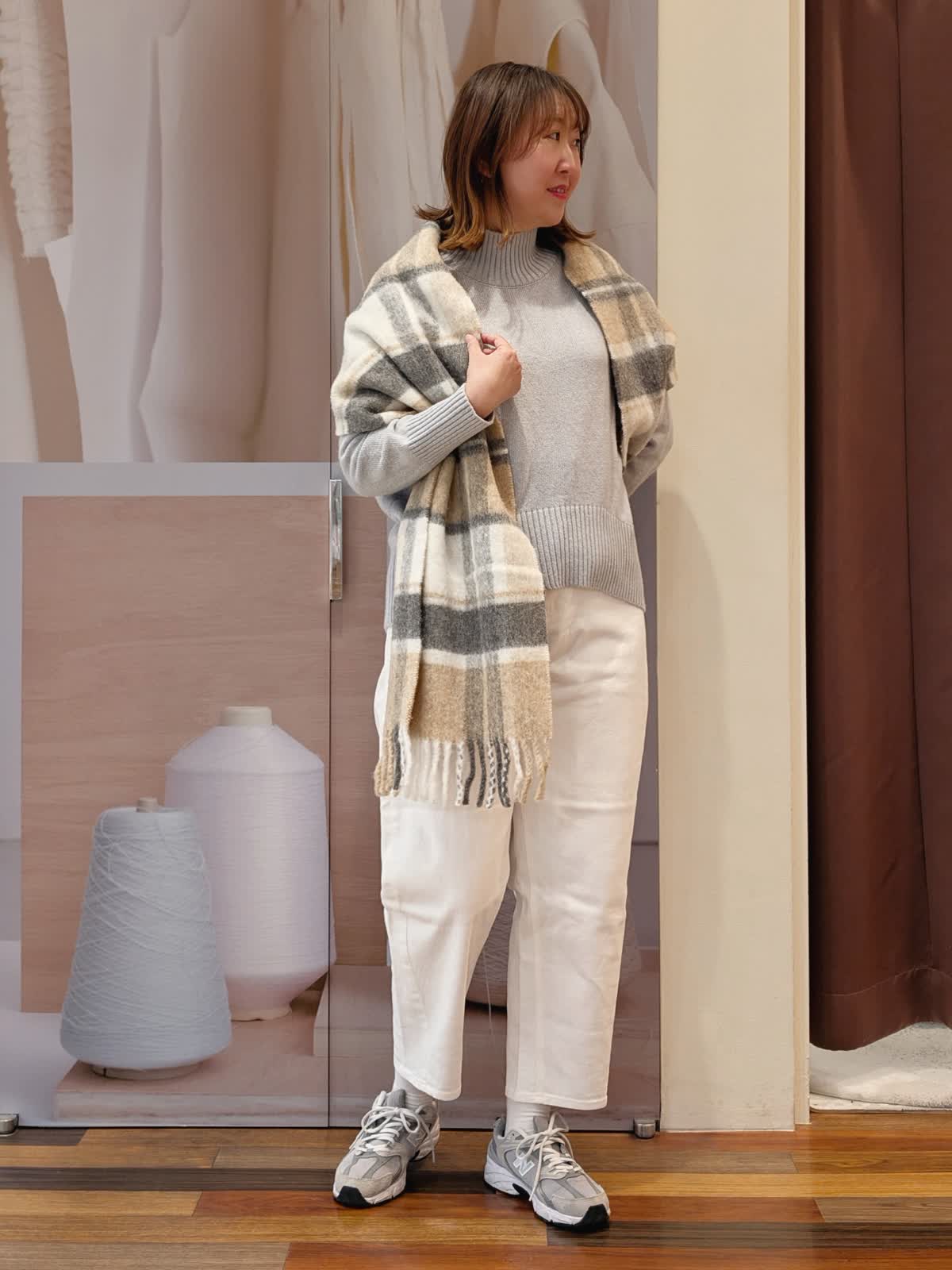 【着用サイズ】ニット:フリー パンツ:11号【着用カラー】ニット:グレー パンツ:オフホワイト ストール:ベージュ 休日リラックススタイル。淡いトーンでまとめて、春先まで着回せるコーディネートにしました。ニットは明るめのグレーで優しい色合い。ハイネックのデザインで首元まで暖かいです。裾は前後差を付けているので前はスッキリ、後ろはヒップまで隠れてバランス良く着ていただけます。デニムパンツを合わせてカジュアルに。ストールは厚みがありふんわボリューム感が可愛いです。首に巻いても、羽織にしても使えるます。