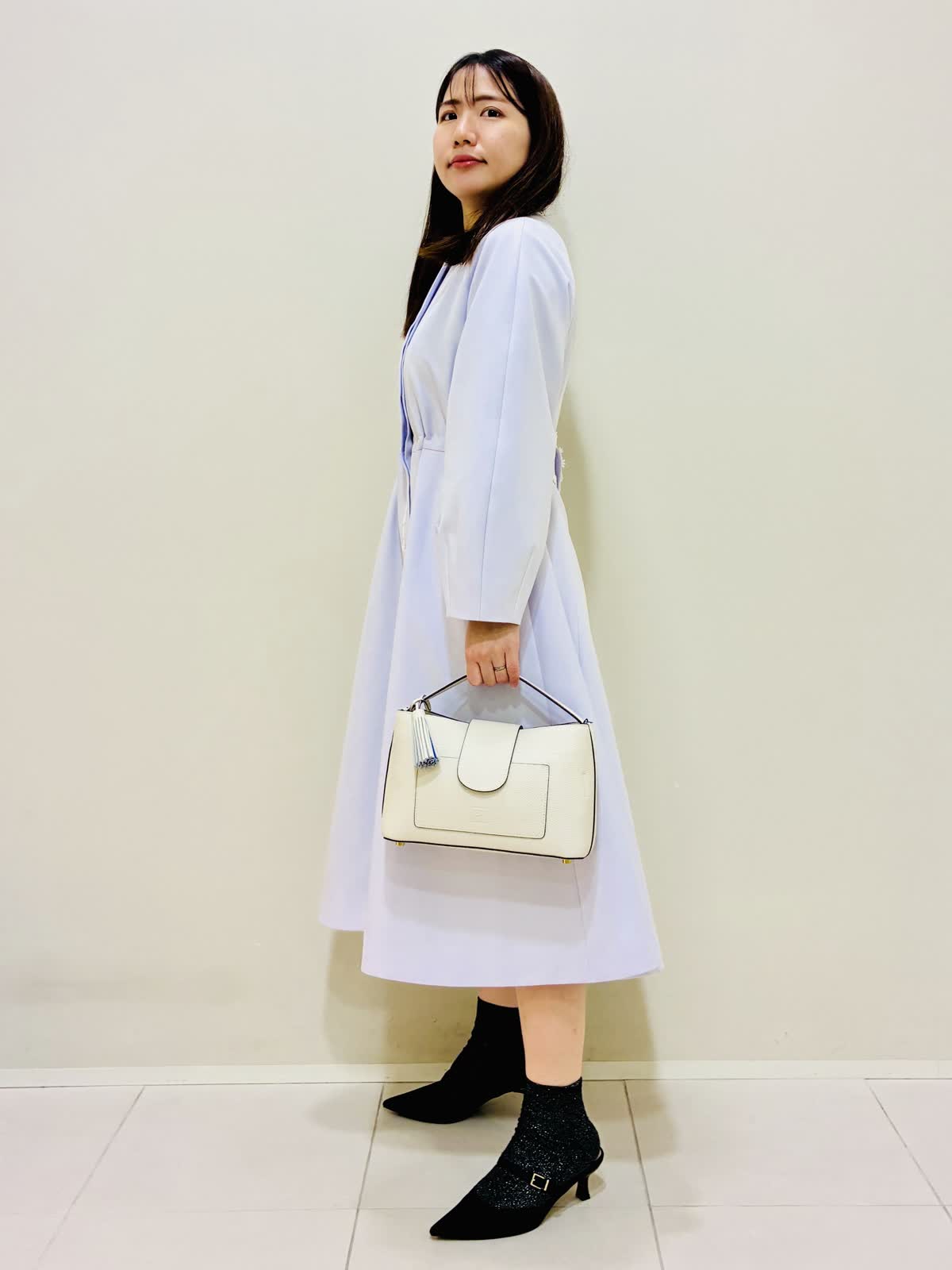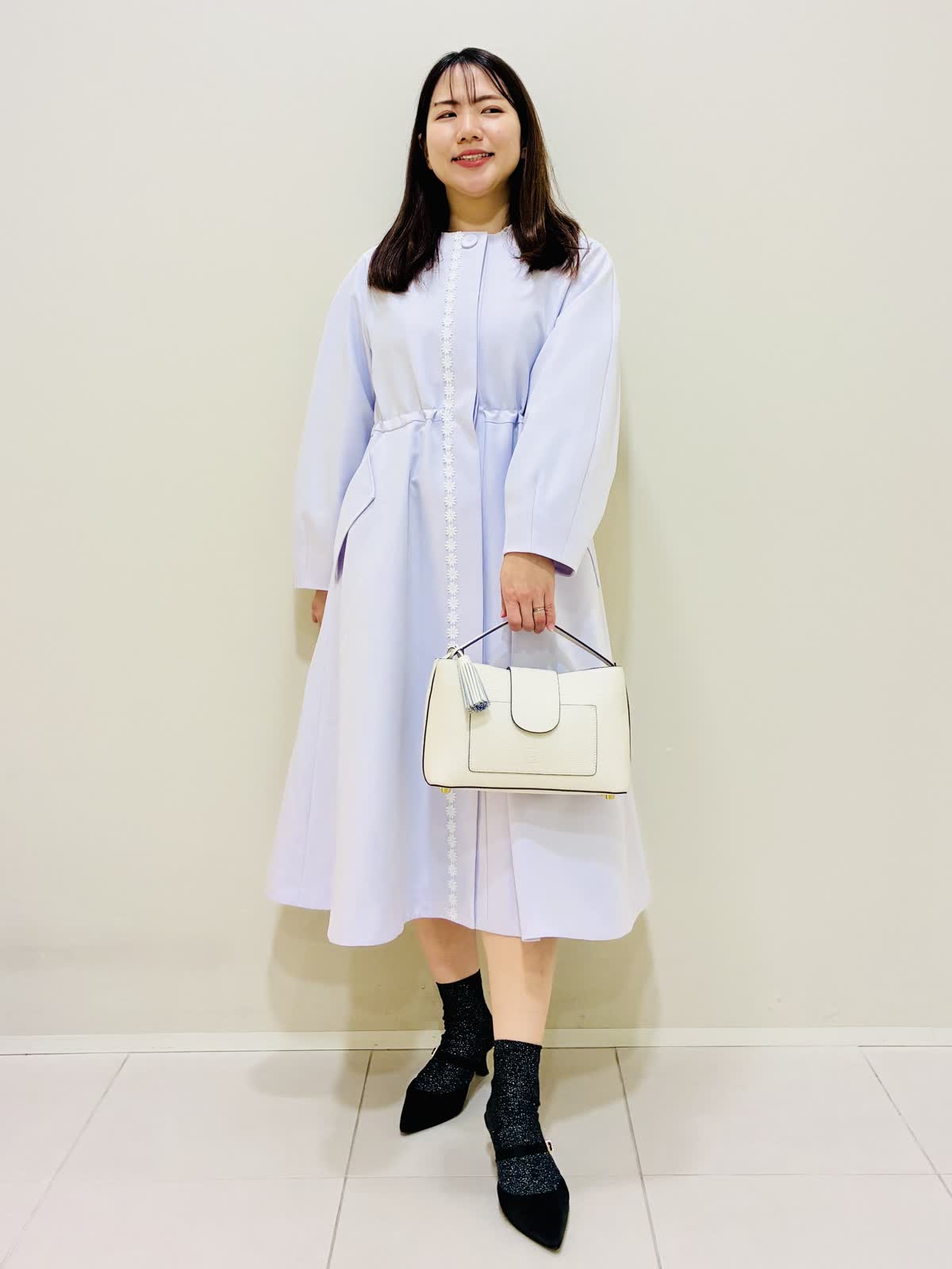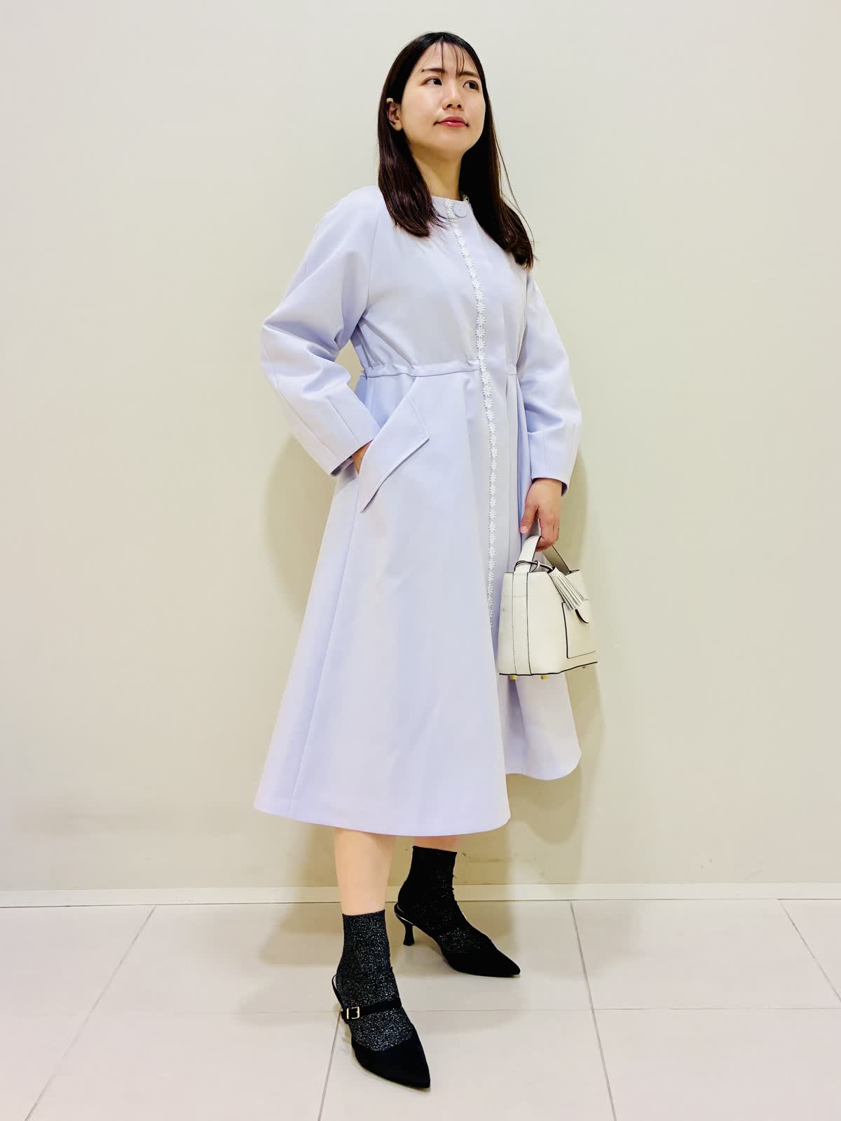 【着用サイズ】 コート:ラベンダー:9号サイズ ワンピース:ネイビー:9号サイズ バッグ:ベージュ 『春のコートスタイリング』 ラベンダーのコートの色が鮮やかで華やかになります。 ウエストを内側で絞れるドロスト仕様になっているので、シルエットに変化を出せます。 バッグはショルダーとしても使えます。