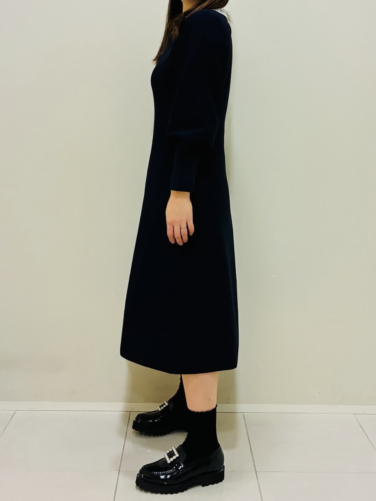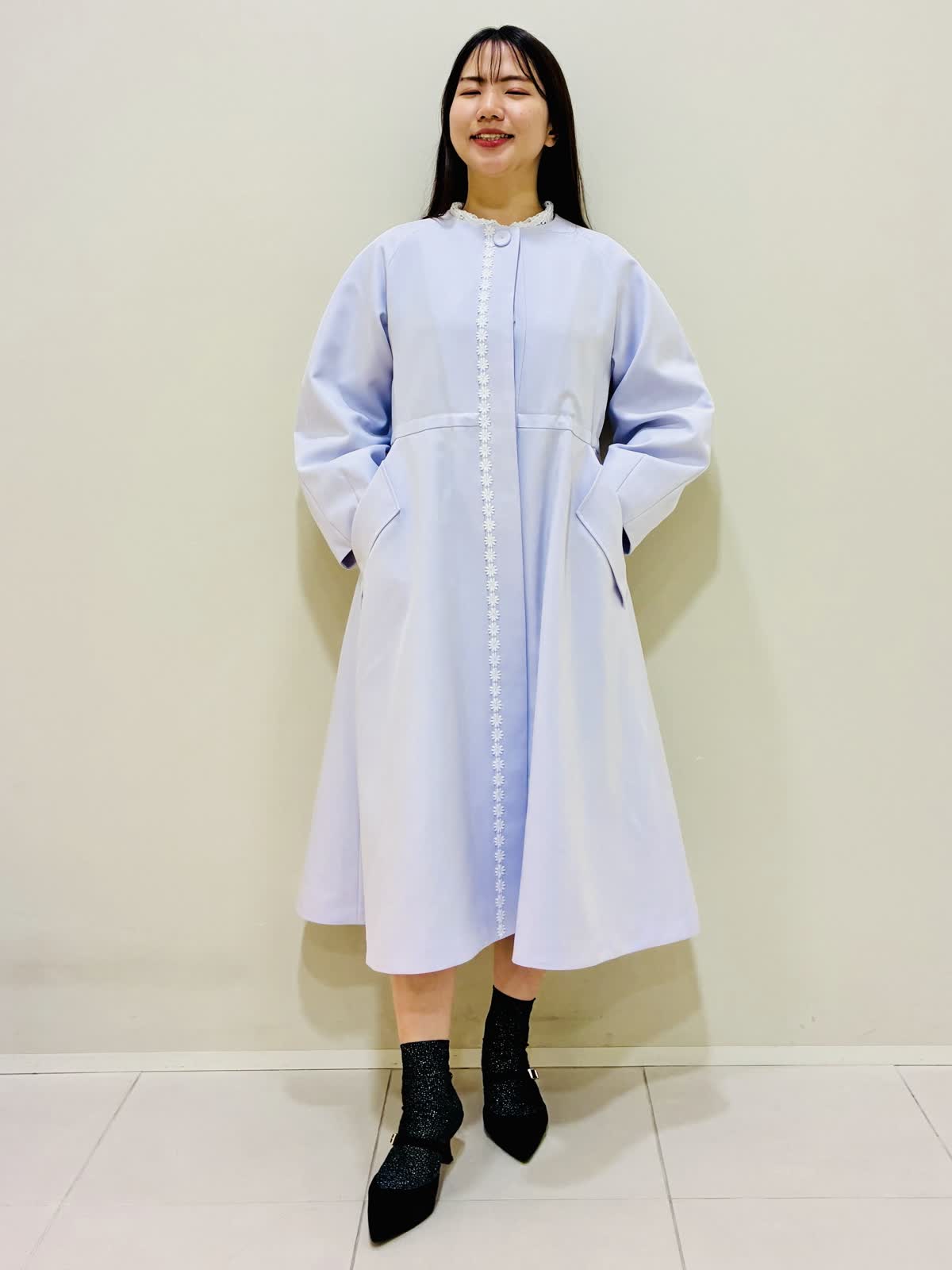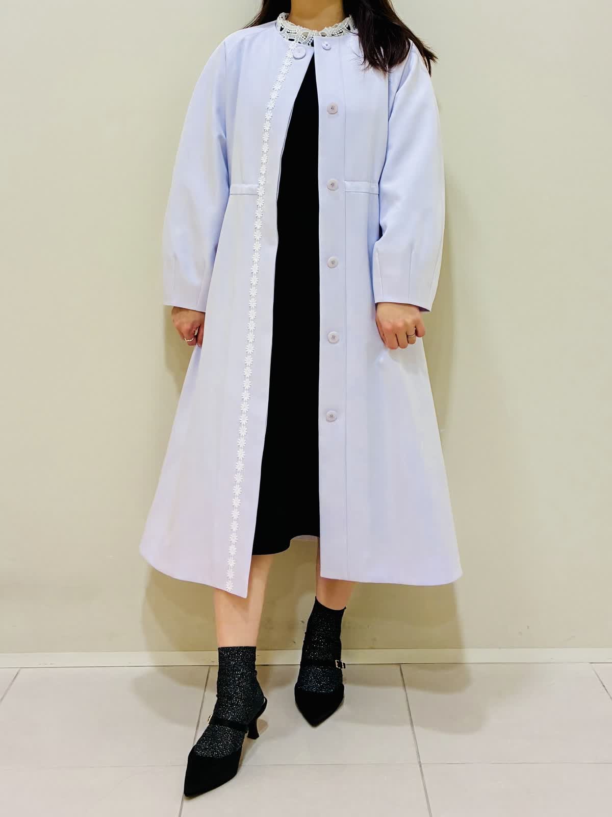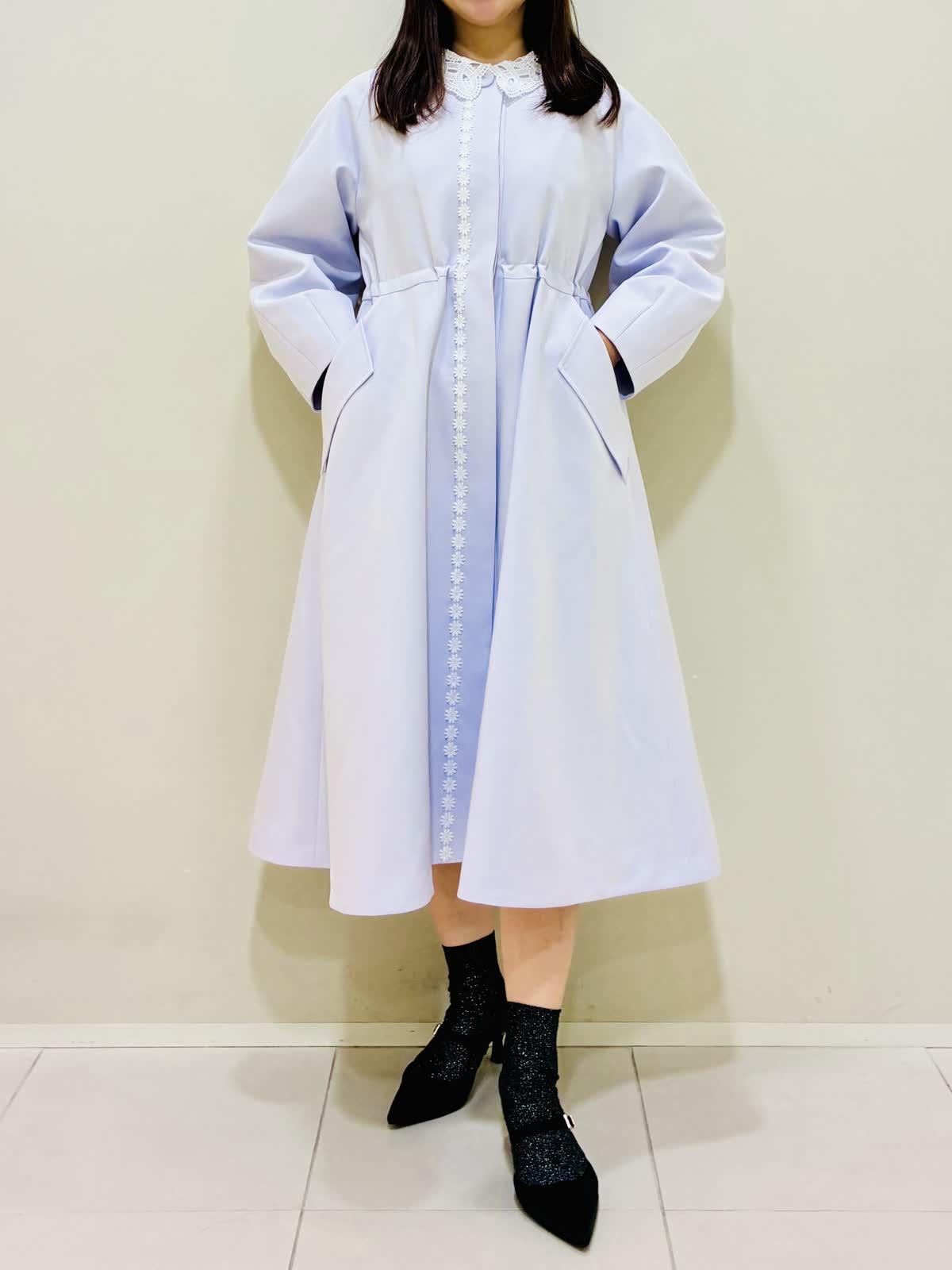 【着用サイズ】 コート:ラベンダー:9号サイズ ワンピース:ネイビー:9号サイズ バッグ:ベージュ 『春のコートスタイリング』 ラベンダーのコートの色が鮮やかで華やかになります。 ウエストを内側で絞れるドロスト仕様になっているので、シルエットに変化を出せます。 バッグはショルダーとしても使えます。