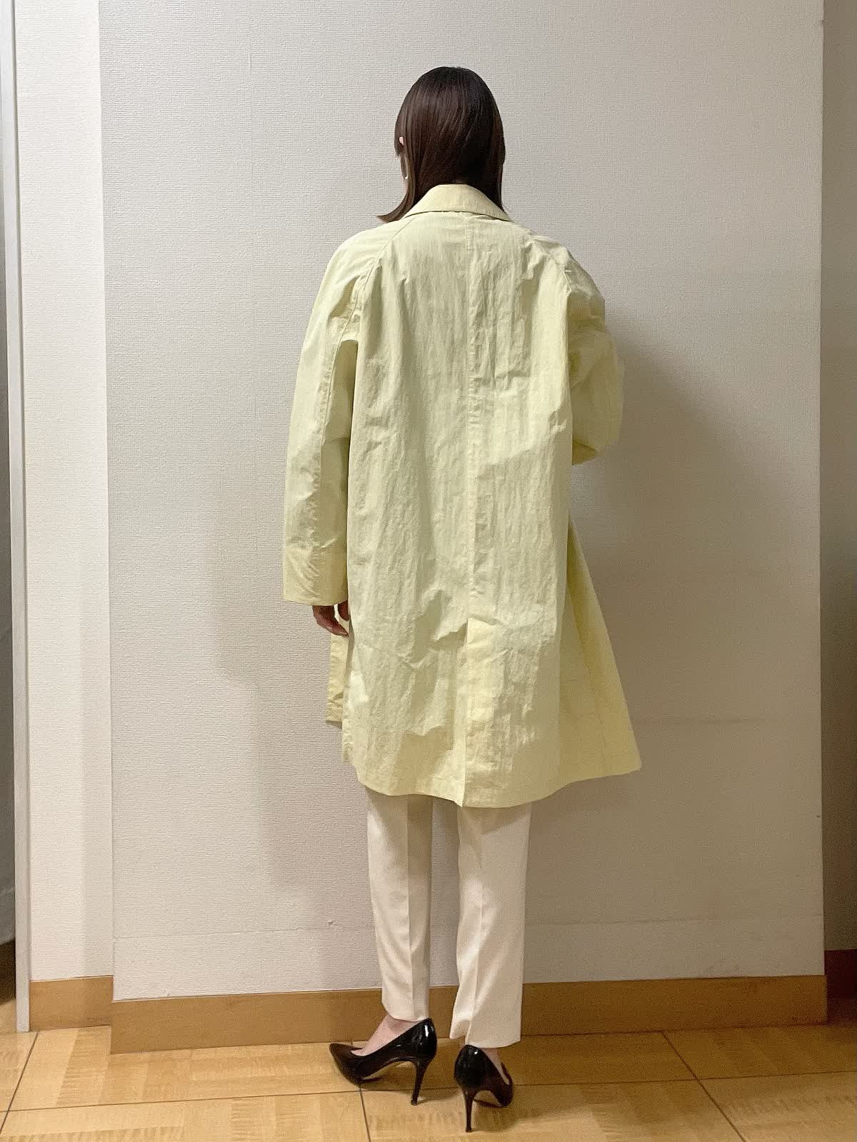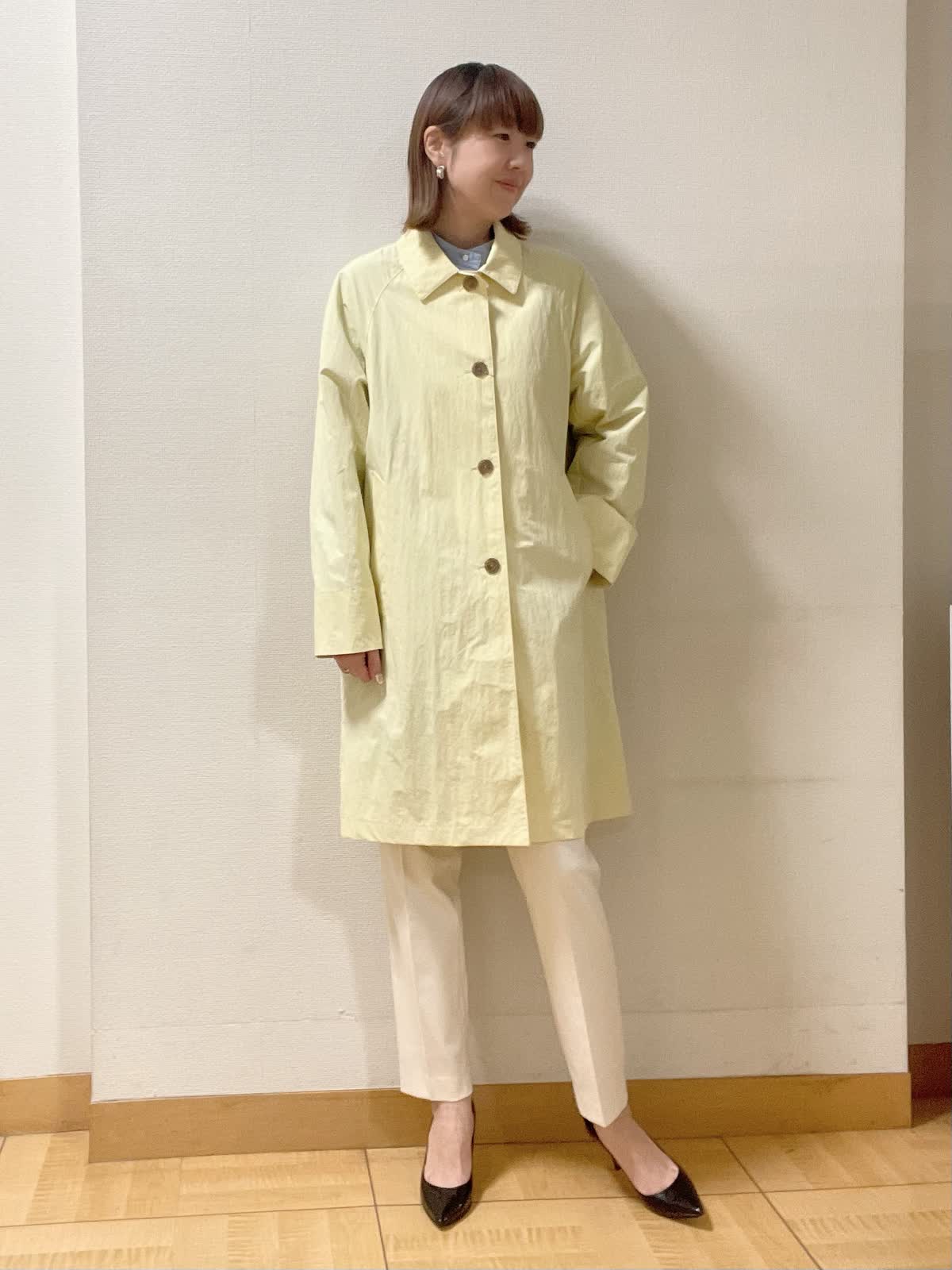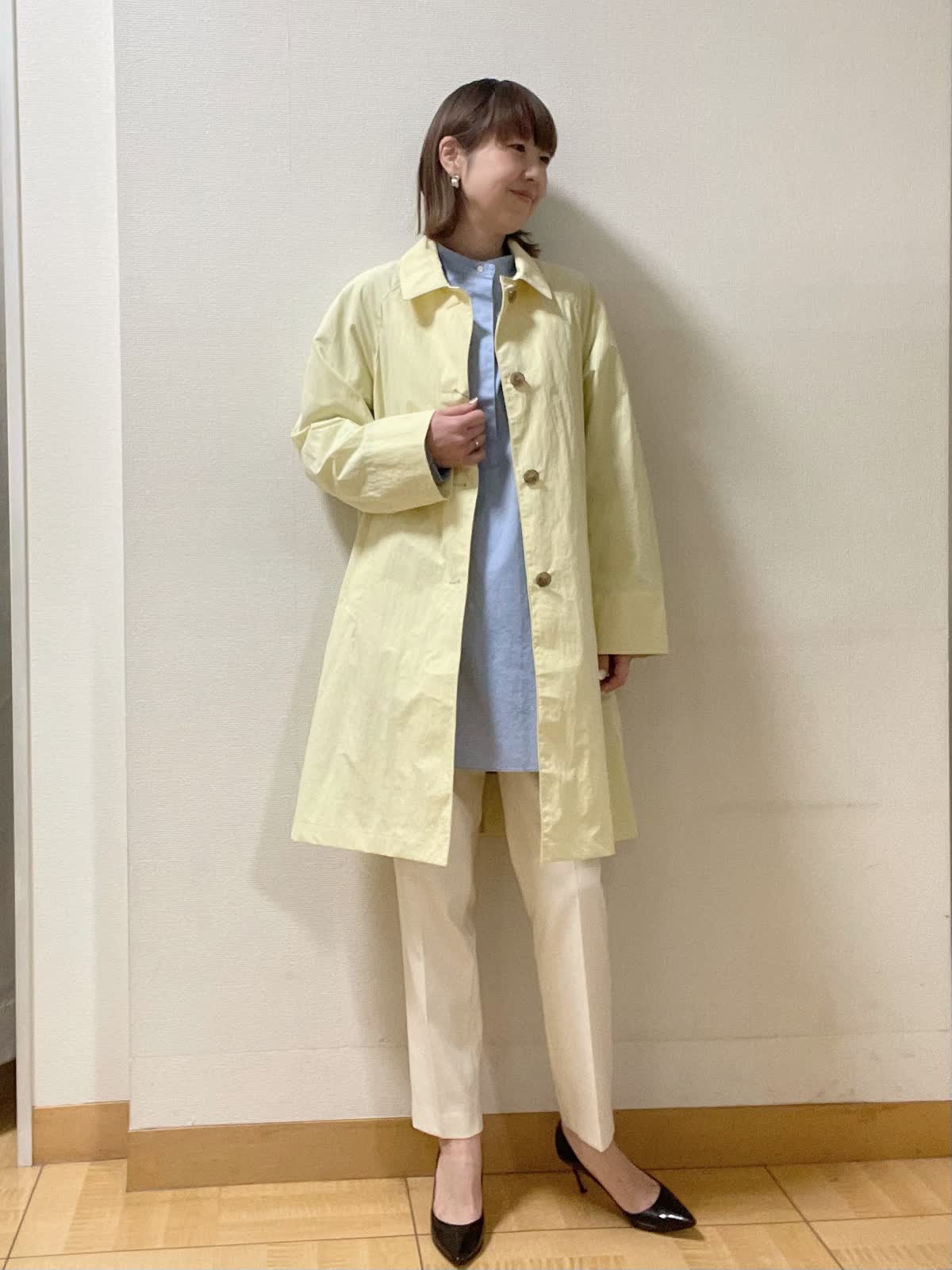 【着用サイズ】コート、パンツ共に9号 シャツ:フリー【着用カラー】コート:イエロー シャツ:ブルー パンツ:オフホワイト 程よいゆとりがありシンプルデザインのステンカラーコート。イエローカラーで春先取り通勤スタイルに。