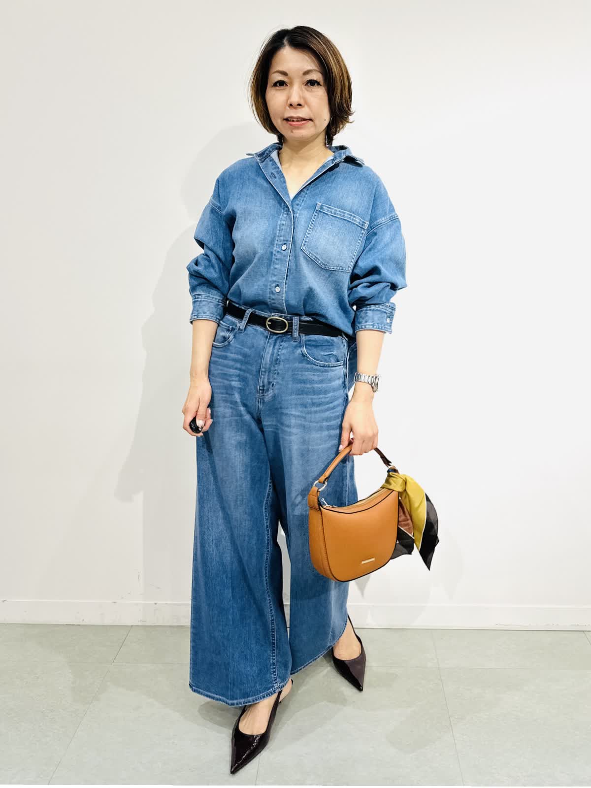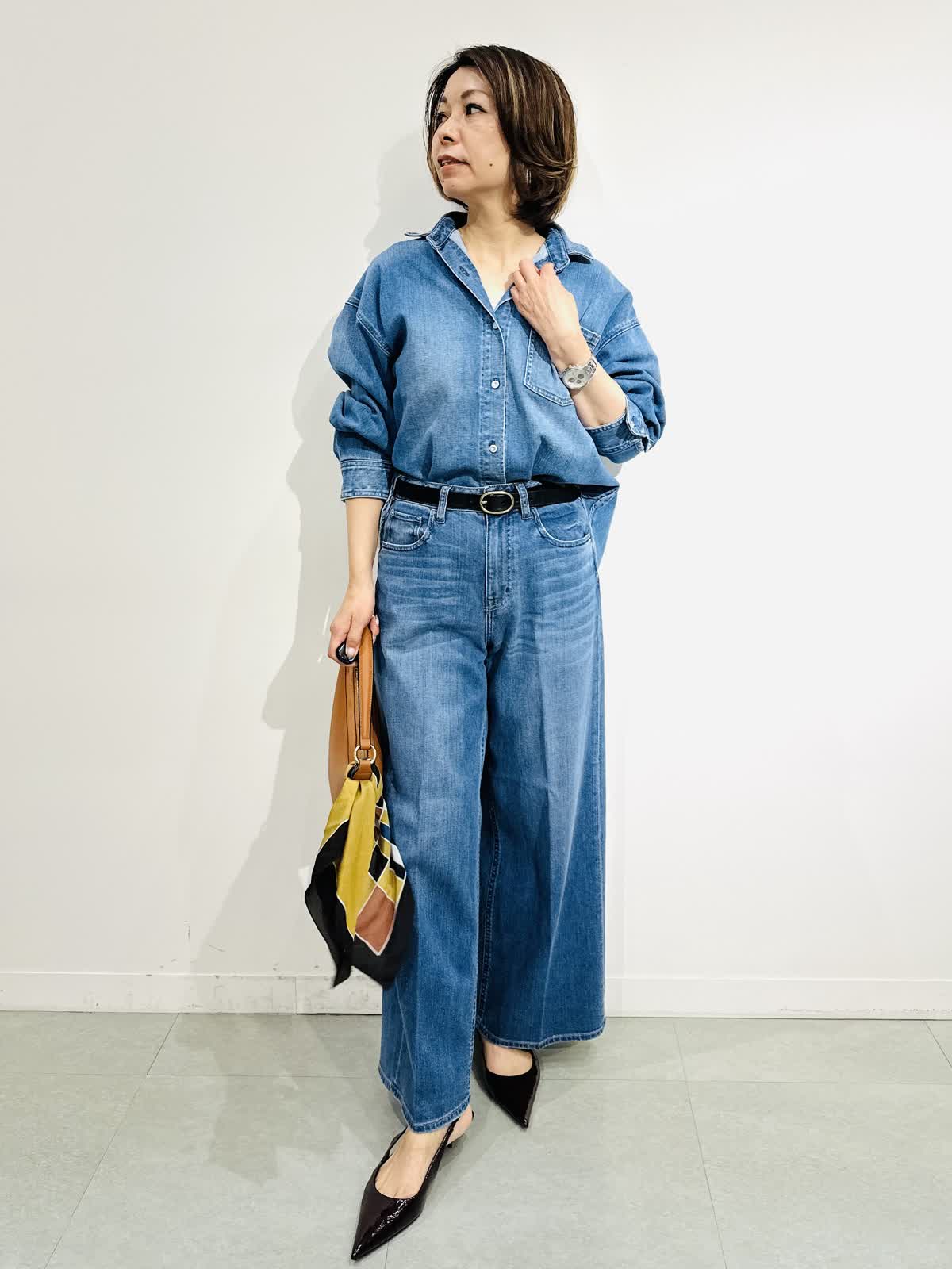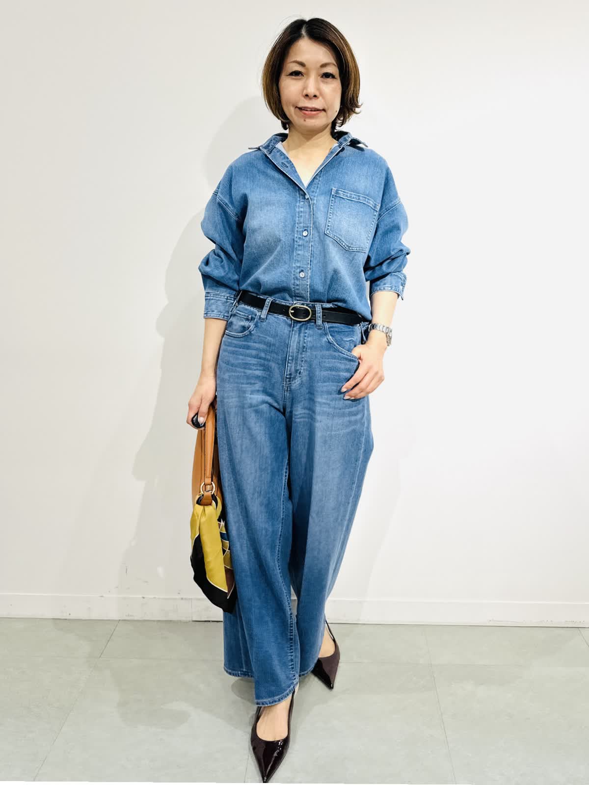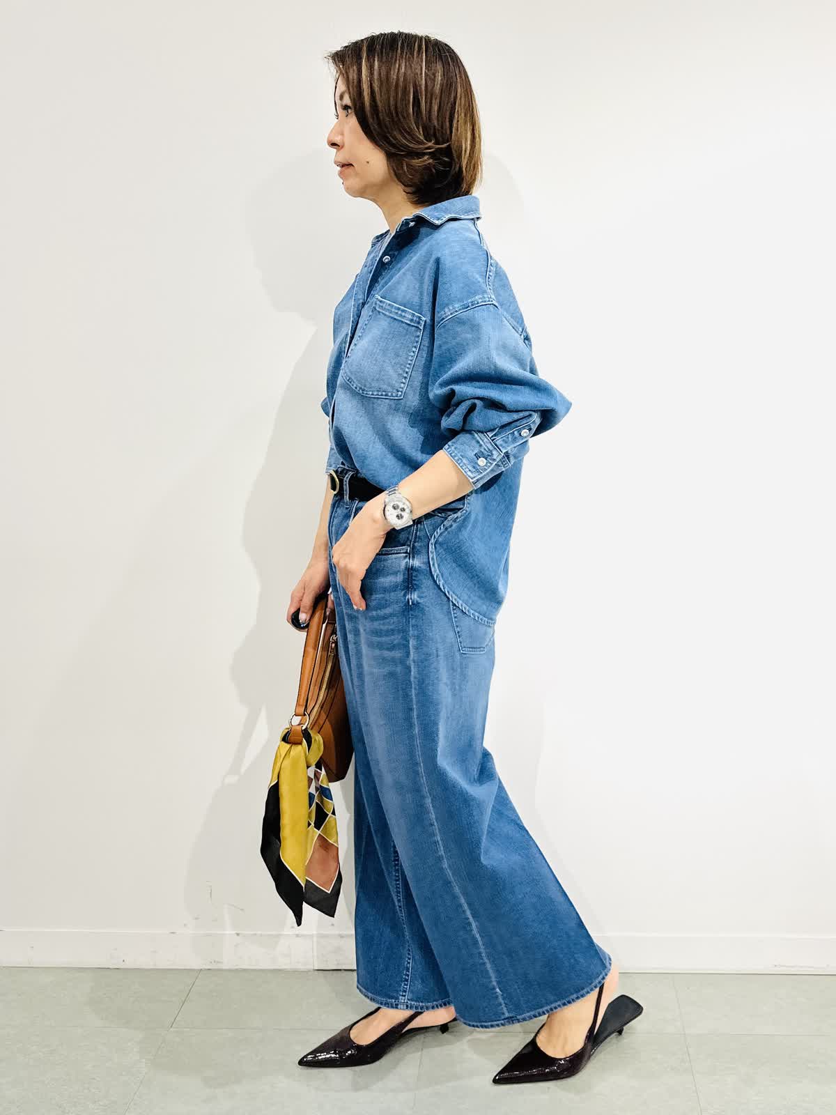 【着用サイズ】全て9号 【着用カラー】シャツ:インディゴ パンツ:インディゴ スカーフ:ダークブラウン ベルト:ブラック デニム×デニムワントーンコーデ 。 Healthy DENIM INED別注のシャツ&デニムパンツです。オーバーサイズのビックシャツでメンズライクに着て、ハイライズバギーパンツで脚長効果がでます。柔らかな肌触りがおすすめポイントです。