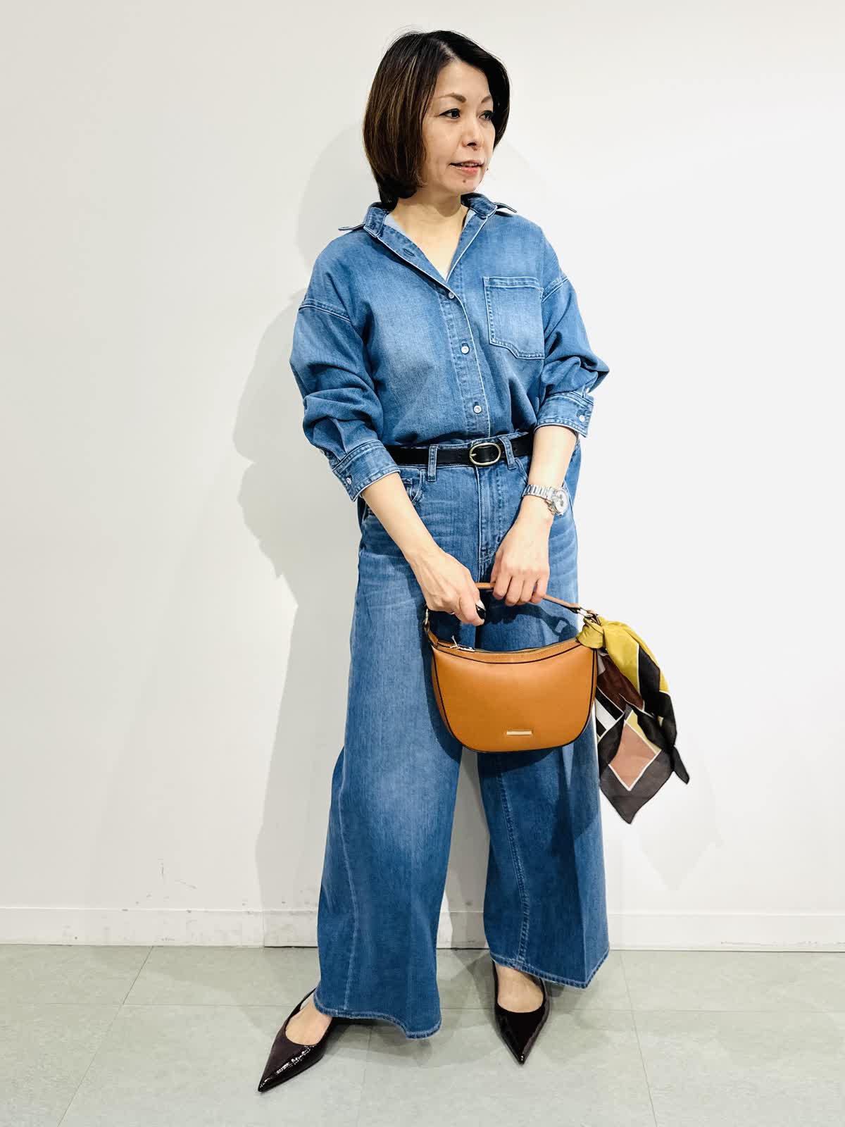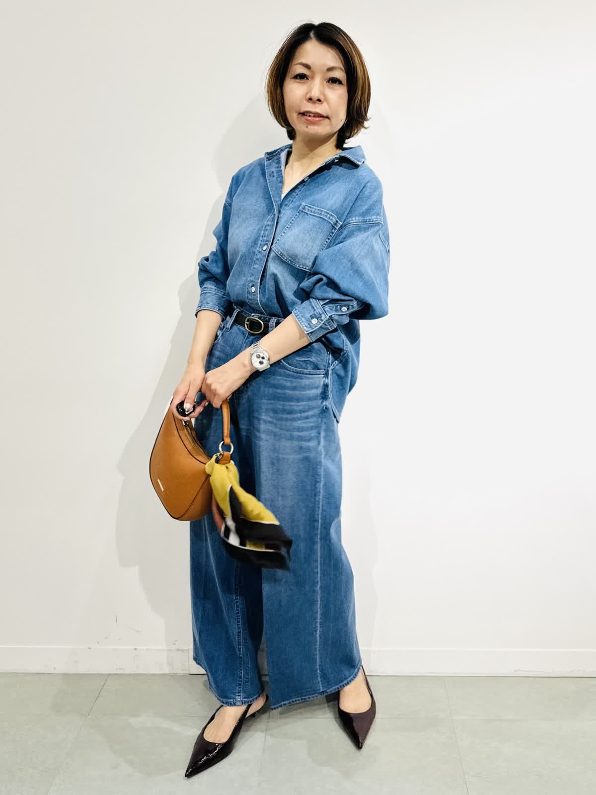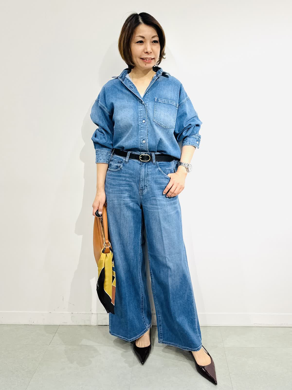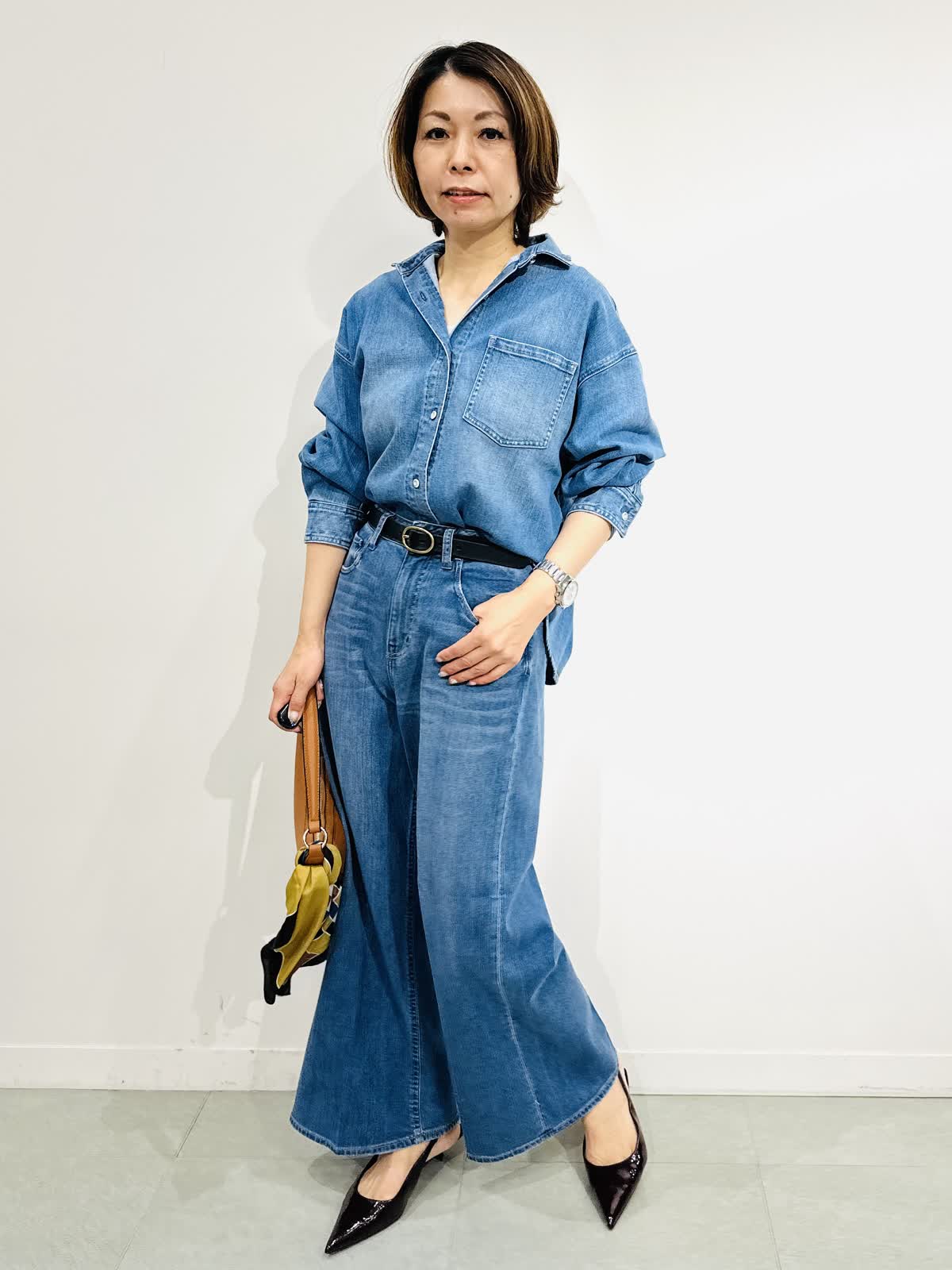 【着用サイズ】全て9号 【着用カラー】シャツ:インディゴ パンツ:インディゴ スカーフ:ダークブラウン ベルト:ブラック デニム×デニムワントーンコーデ 。 Healthy DENIM INED別注のシャツ&デニムパンツです。オーバーサイズのビックシャツでメンズライクに着て、ハイライズバギーパンツで脚長効果がでます。柔らかな肌触りがおすすめポイントです。