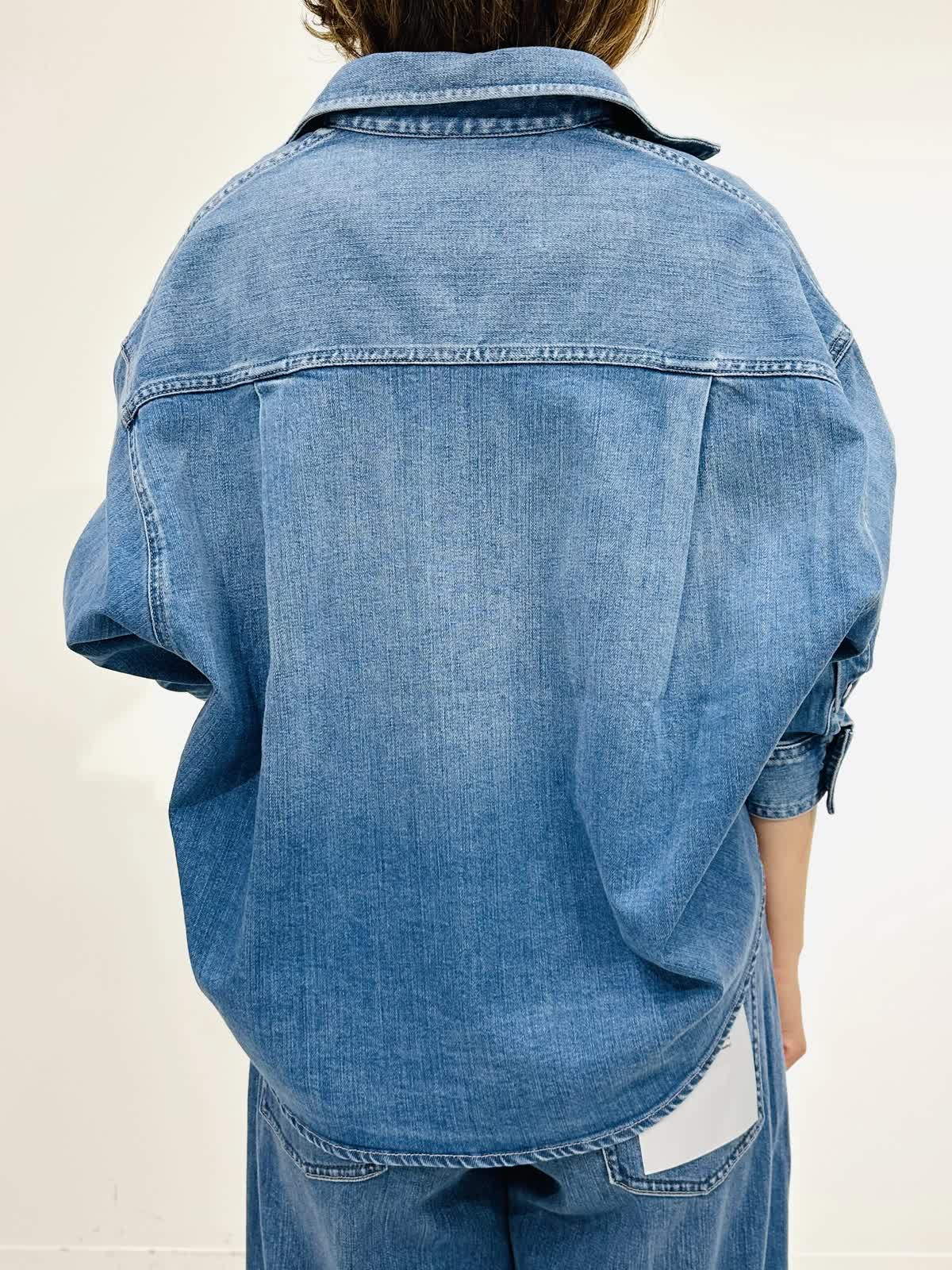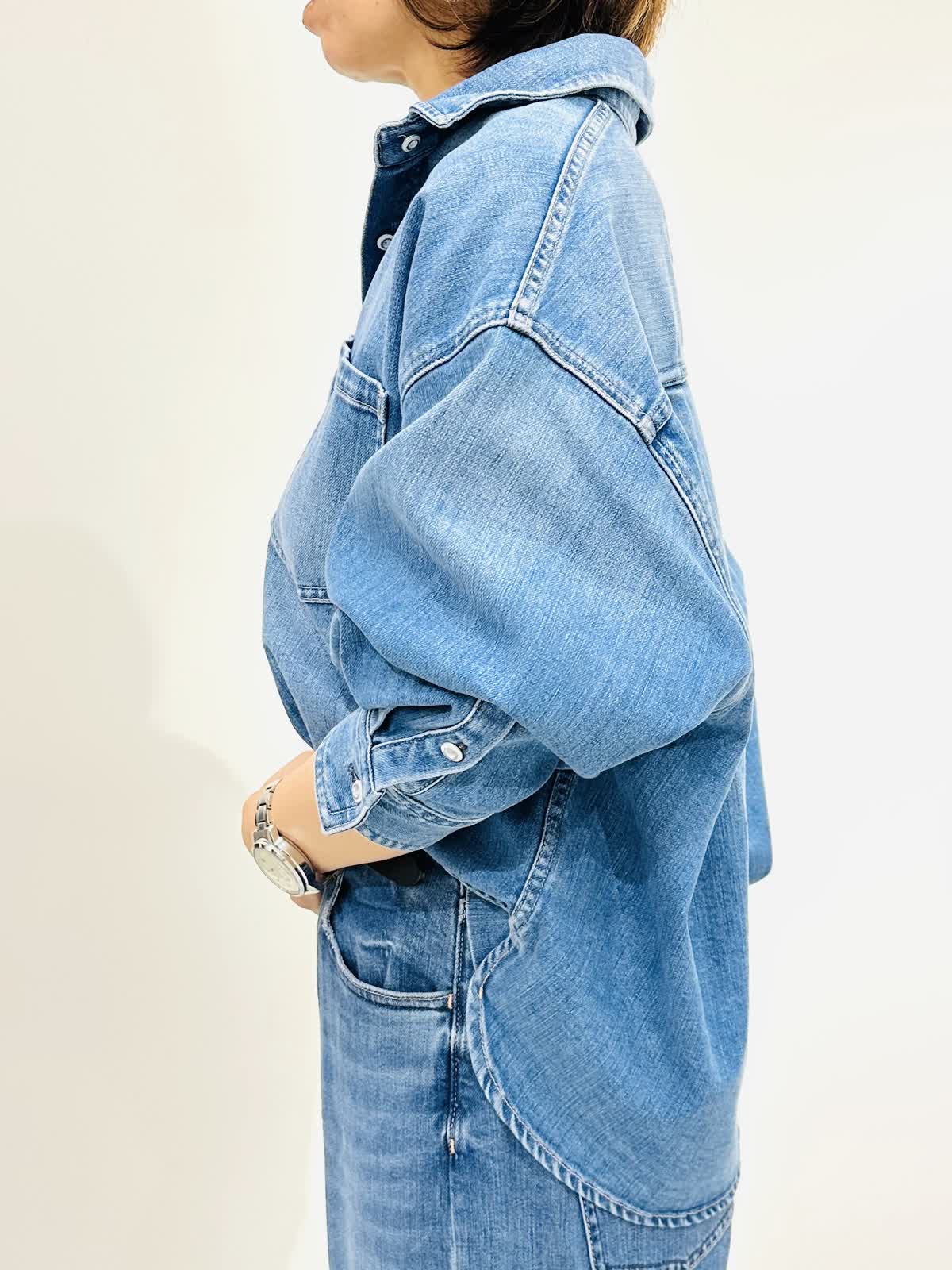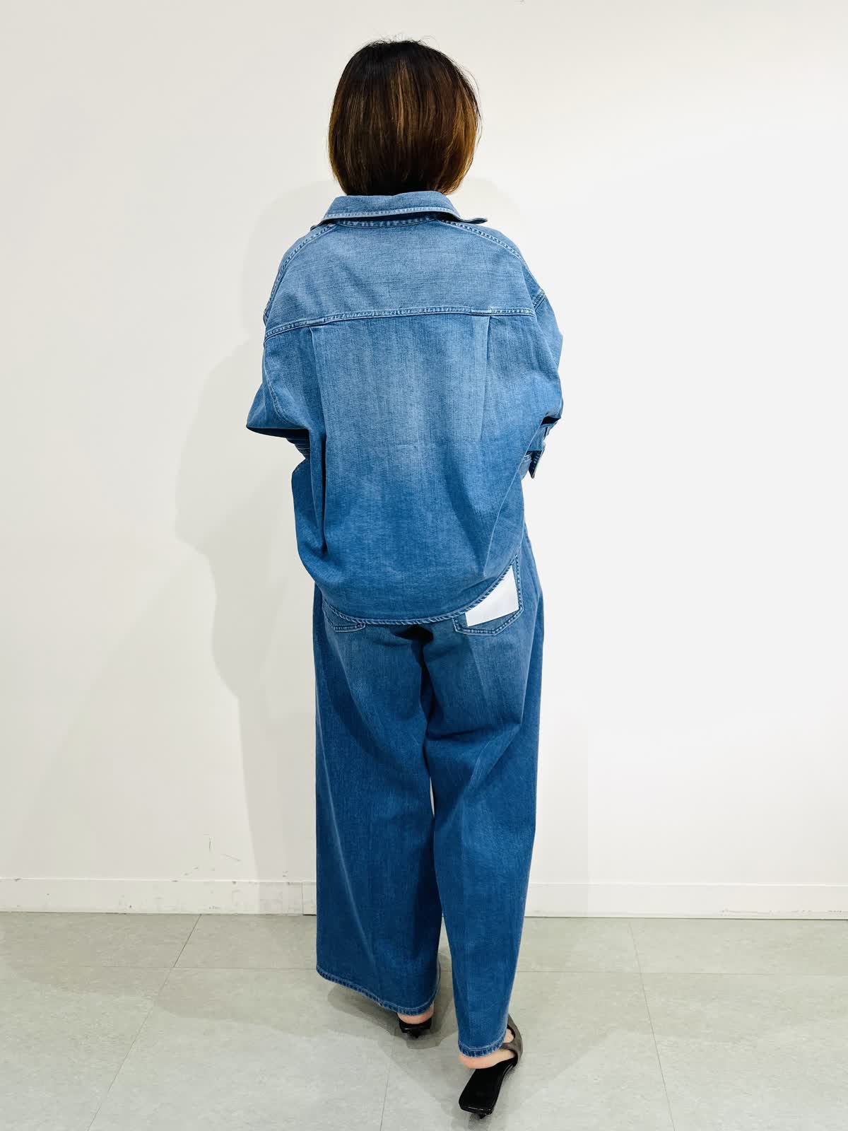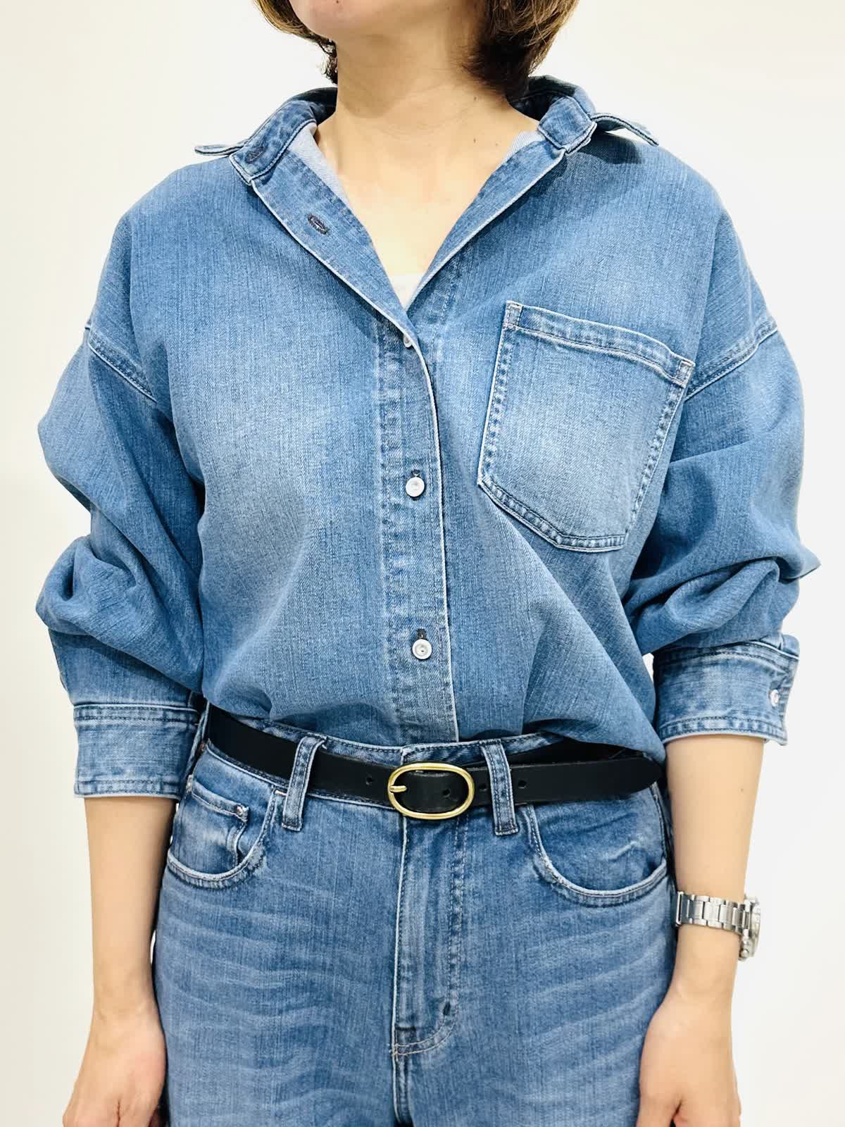 【着用サイズ】全て9号 【着用カラー】シャツ:インディゴ パンツ:インディゴ スカーフ:ダークブラウン ベルト:ブラック デニム×デニムワントーンコーデ 。 Healthy DENIM INED別注のシャツ&デニムパンツです。オーバーサイズのビックシャツでメンズライクに着て、ハイライズバギーパンツで脚長効果がでます。柔らかな肌触りがおすすめポイントです。