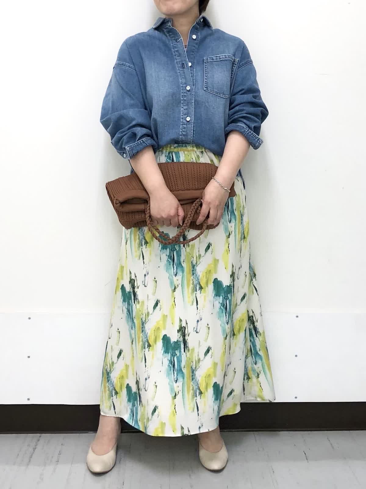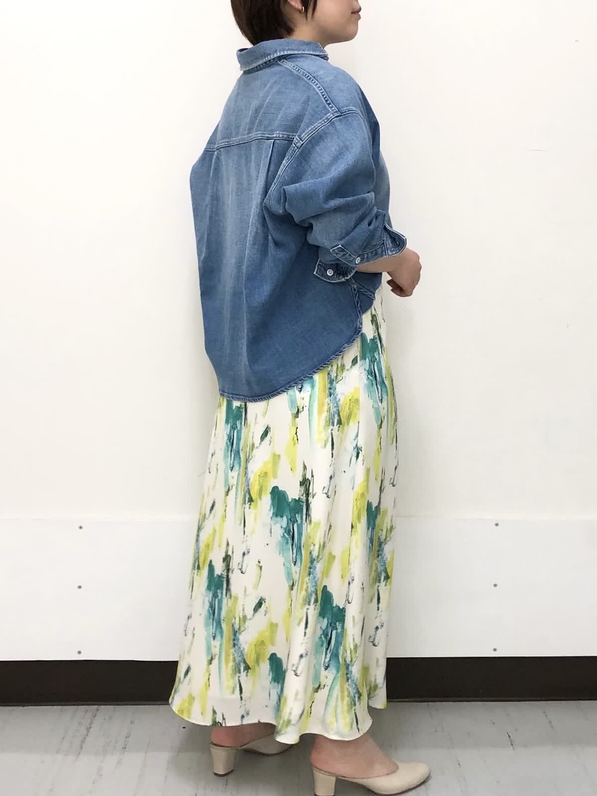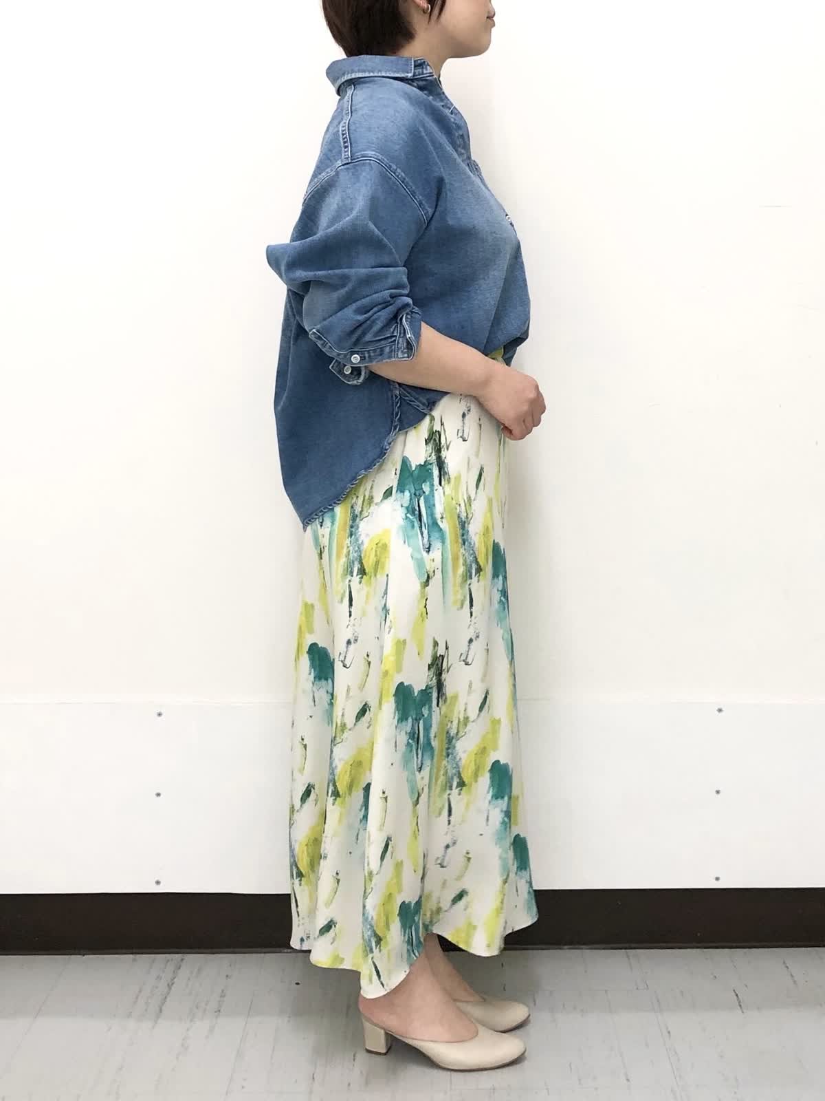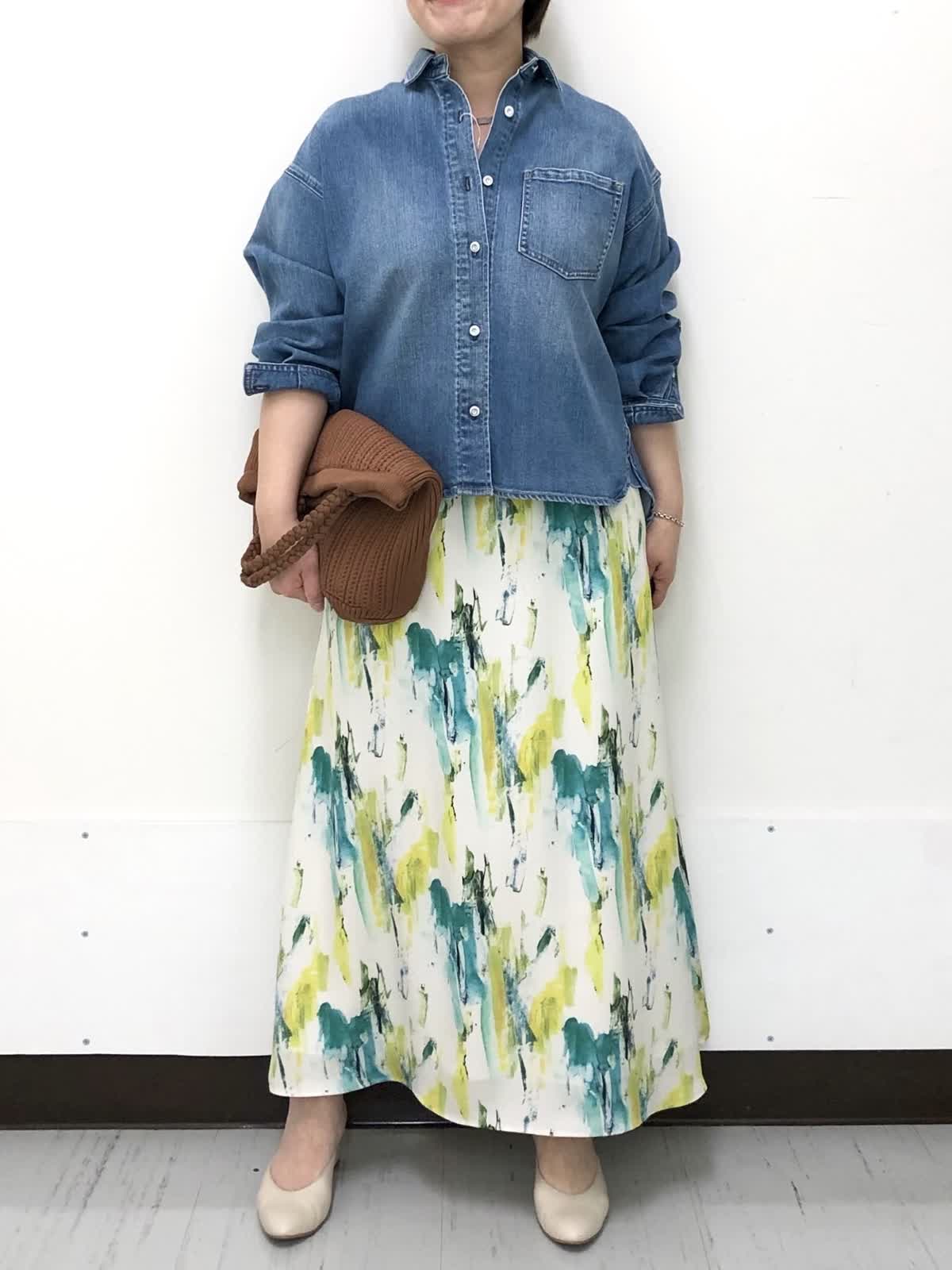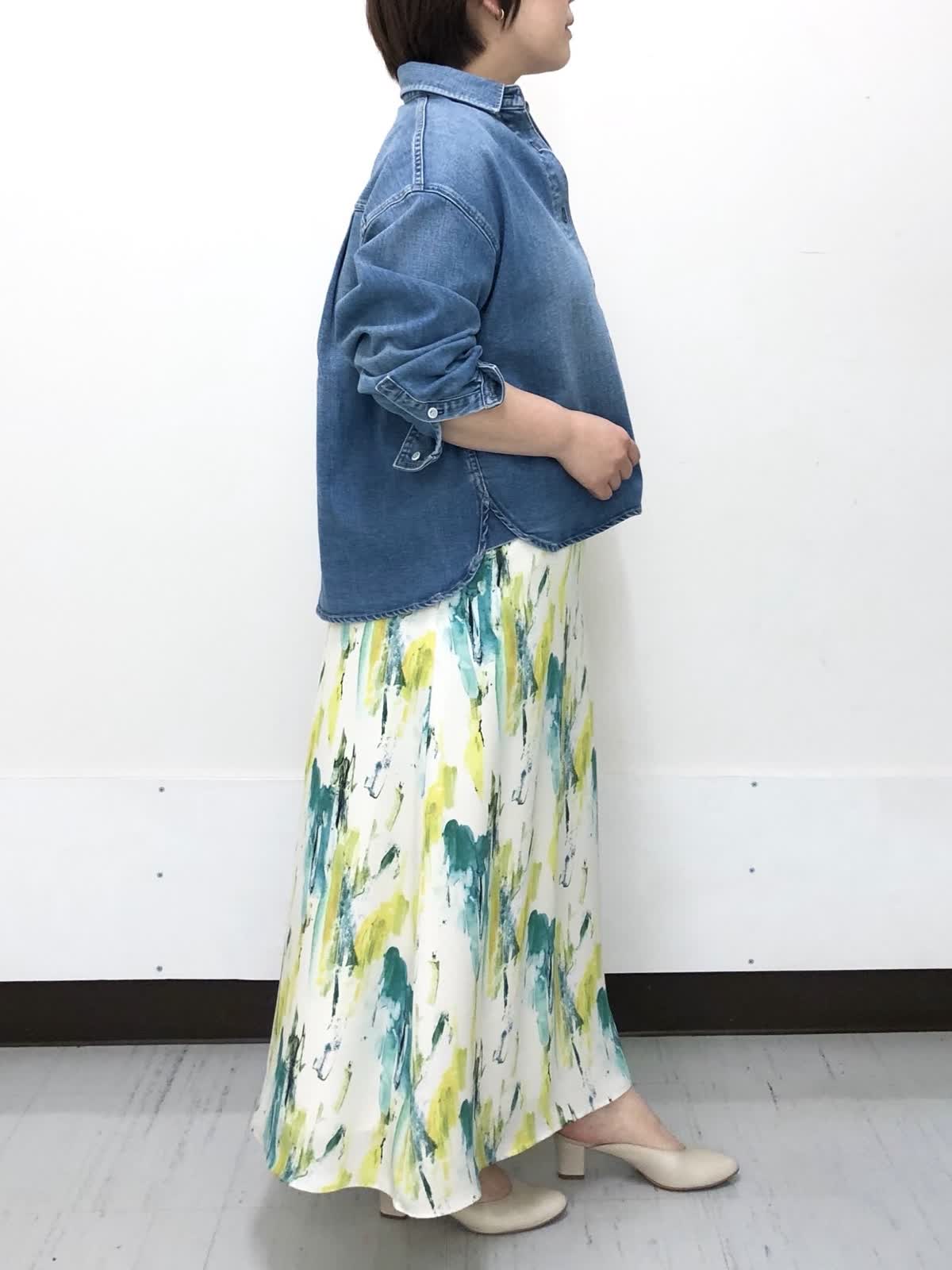 【着用サイズ】全て9号【着用カラー】シャツ:インディゴ スカート:ペパーミント デニム×プリントスカートで春のお出かけコーデ。ゆったりとしたサイジングと着丈のバランスがちょうどいいデニムシャツは程よい厚みで季節の変わり目にぴったり。柔らかい着心地でロングシーズン活躍のアイテムです。INEDオリジナルプリントのスカートで一気に装いも気分も春の始まりです。
