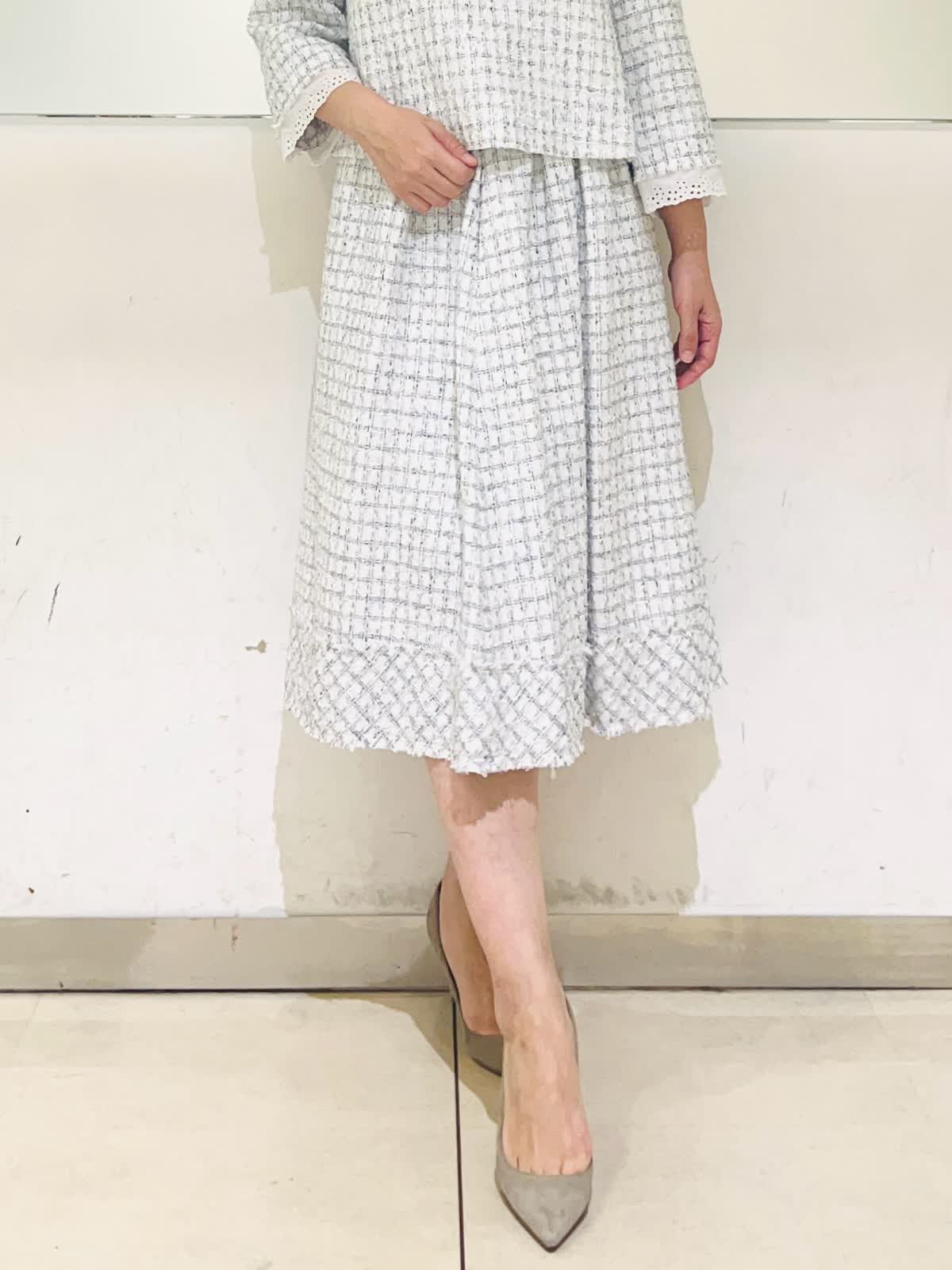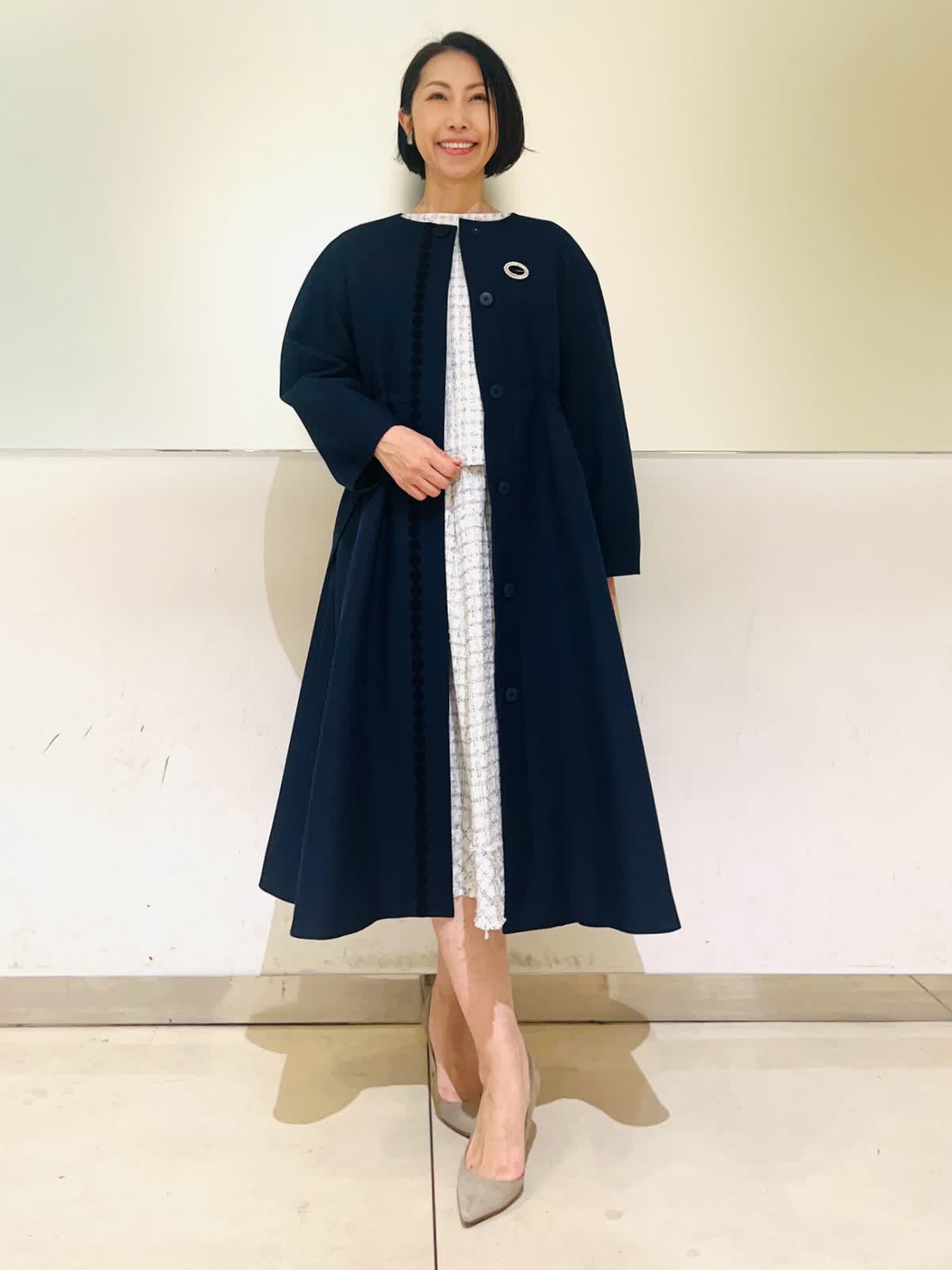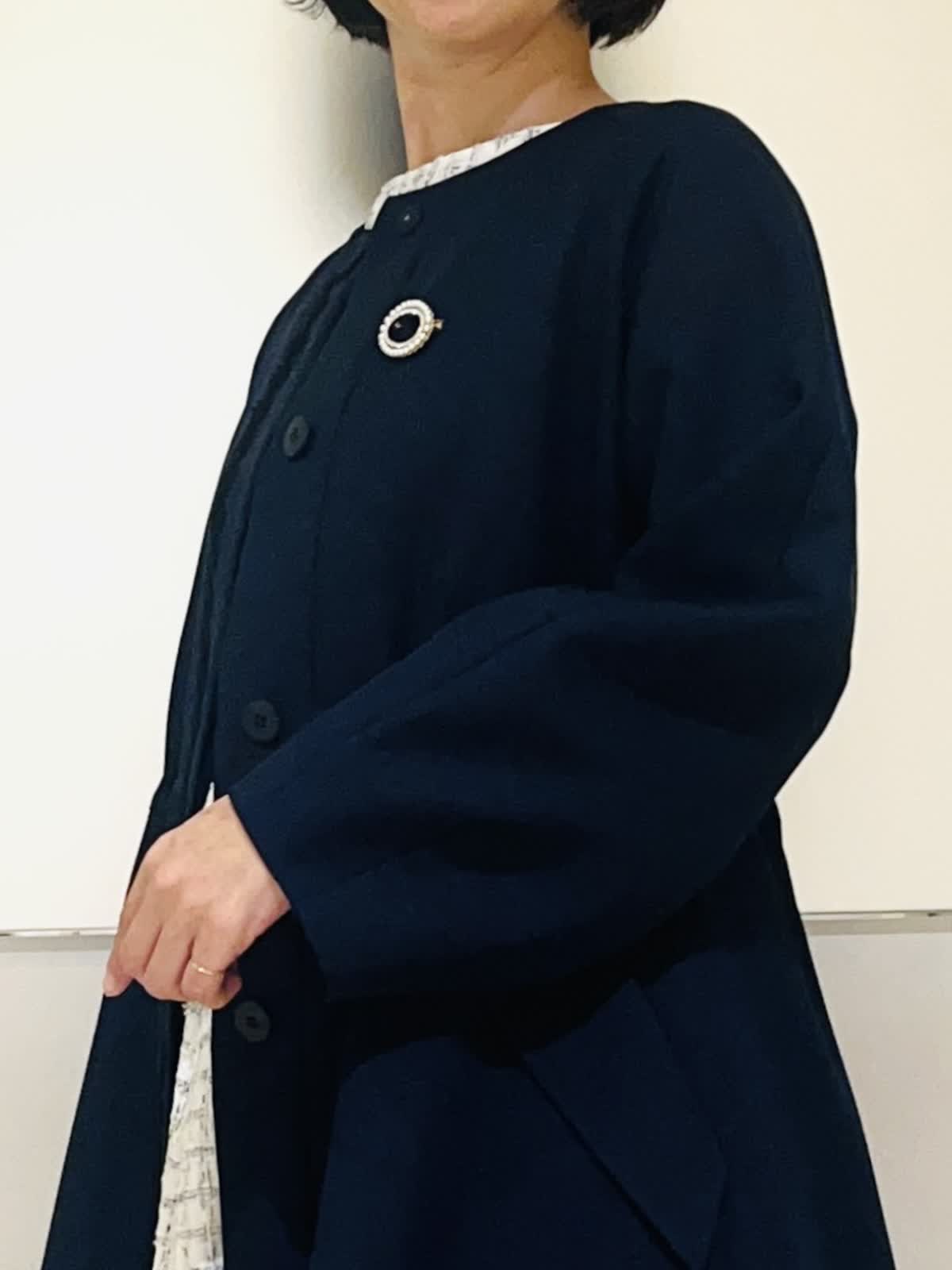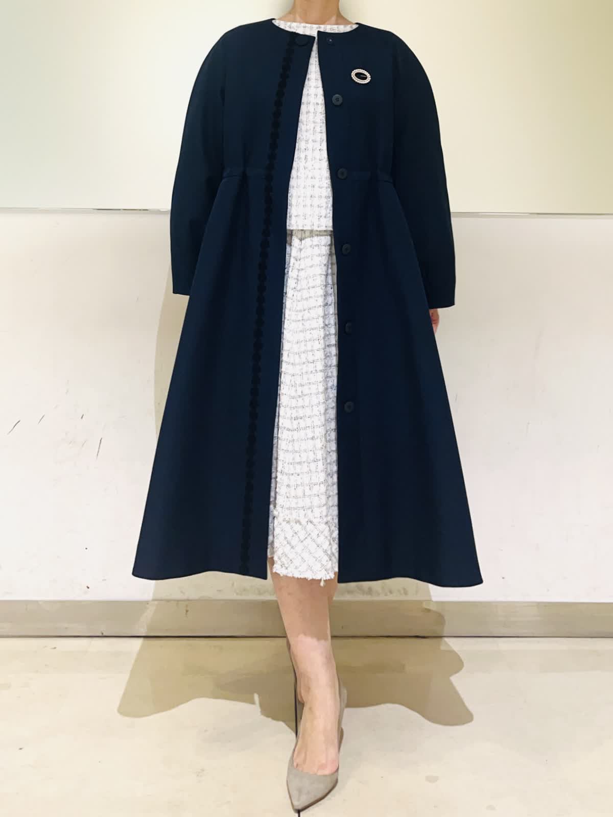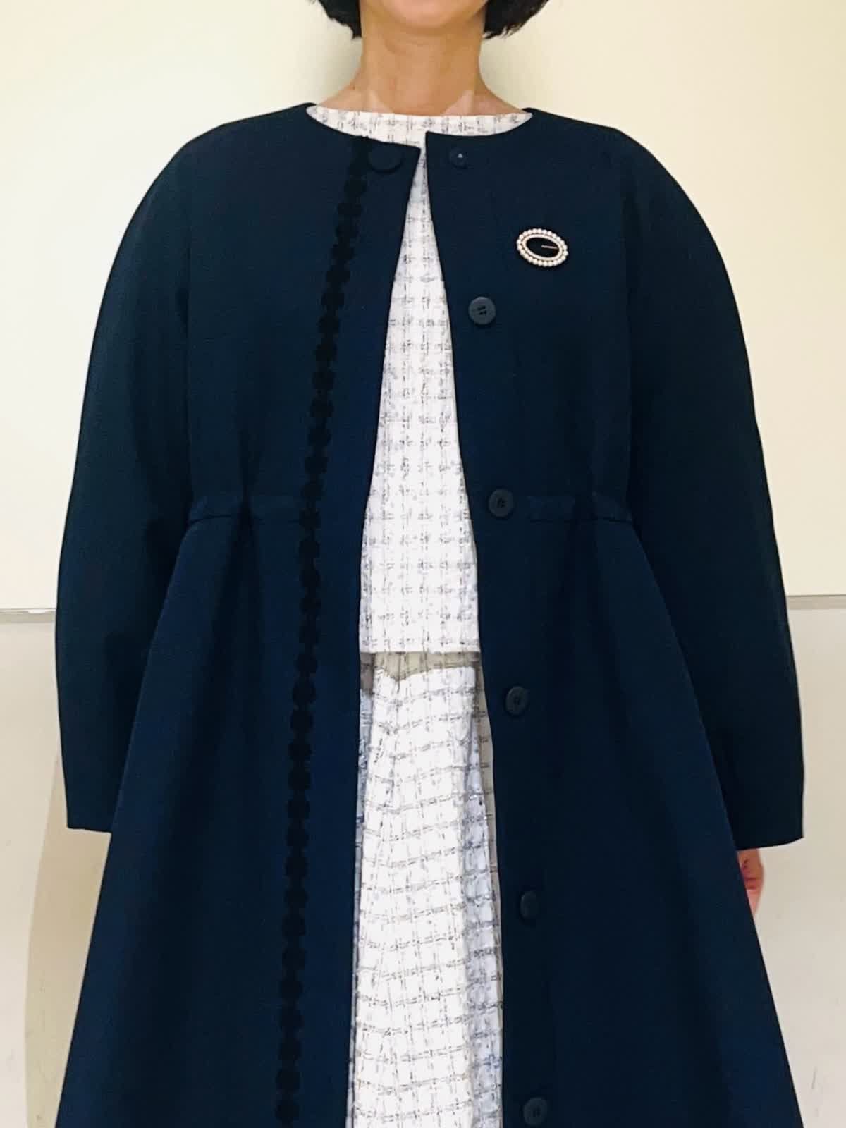 【着用アイテム】すべて9号 【着用カラー】コート:ネイビー ブラウス、スカート:サックス ハレの日からお呼ばれまで、大切な行事のときにおすすめのコーディネート。ホワイトとサックスを基調に、キラキラのラメを散りばめた華やかなツイードの2ピース。入学式やお顔合わせなどにもお召しいただけます。合わせたネイビーのコートはお花のレースが可愛いデザイン。ウエストのドロストを絞るとドレスのようなシルエットに。フォーマルの場所へお出かけの時にもお羽織りいただけます。 サイズ感はいつものサイズで大丈夫でした。