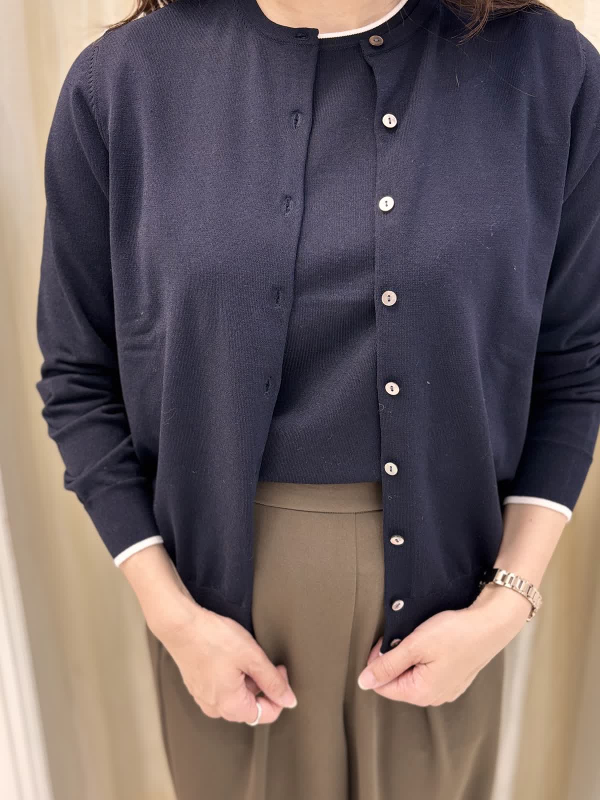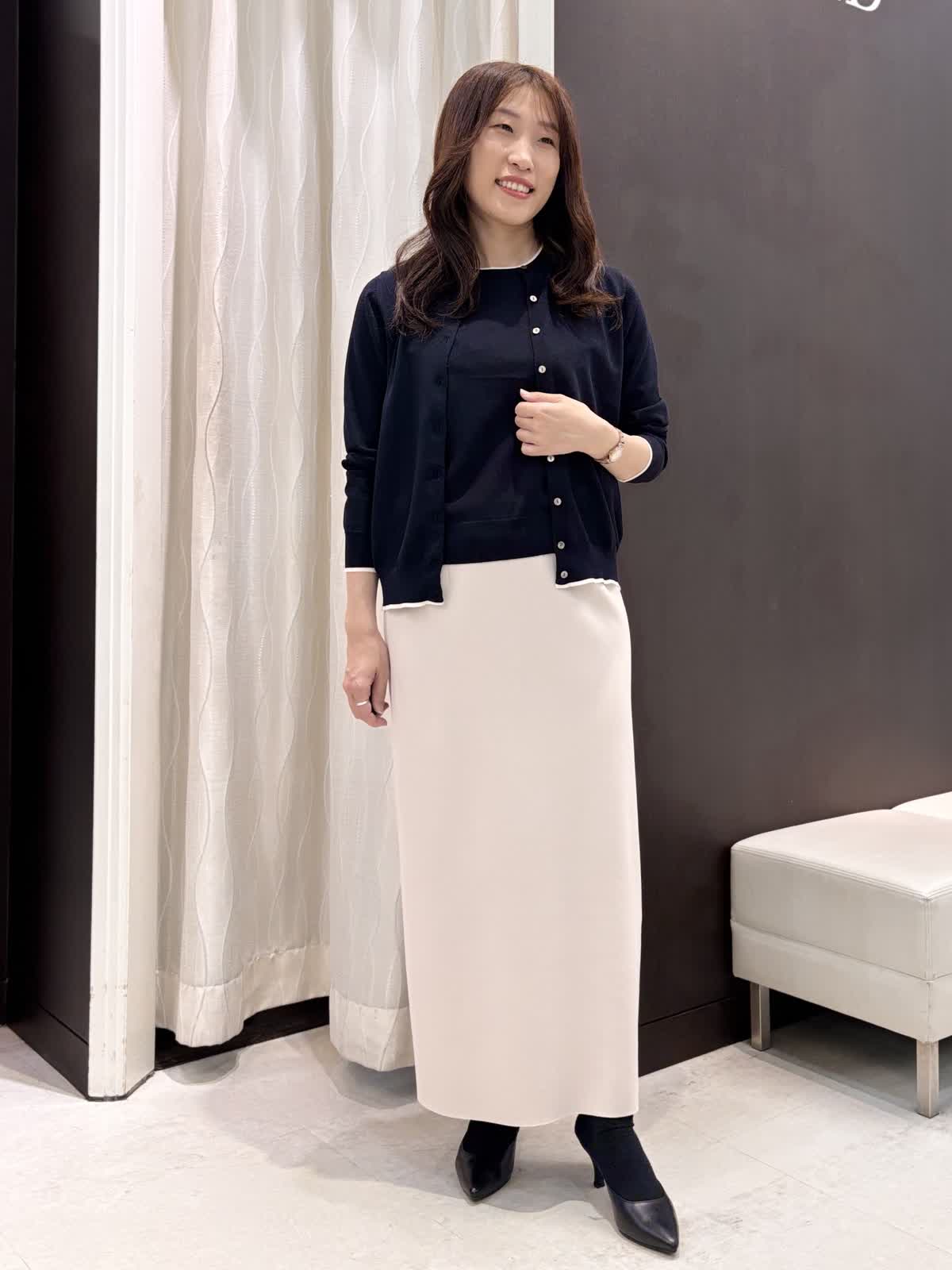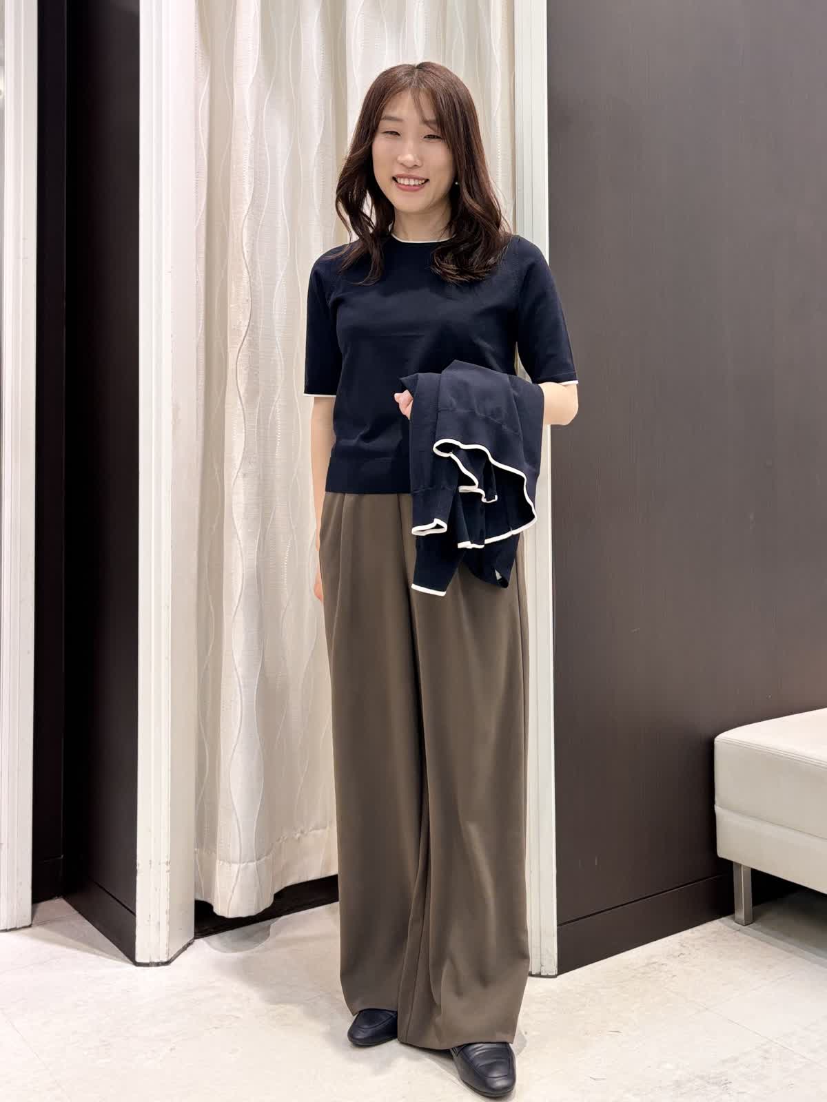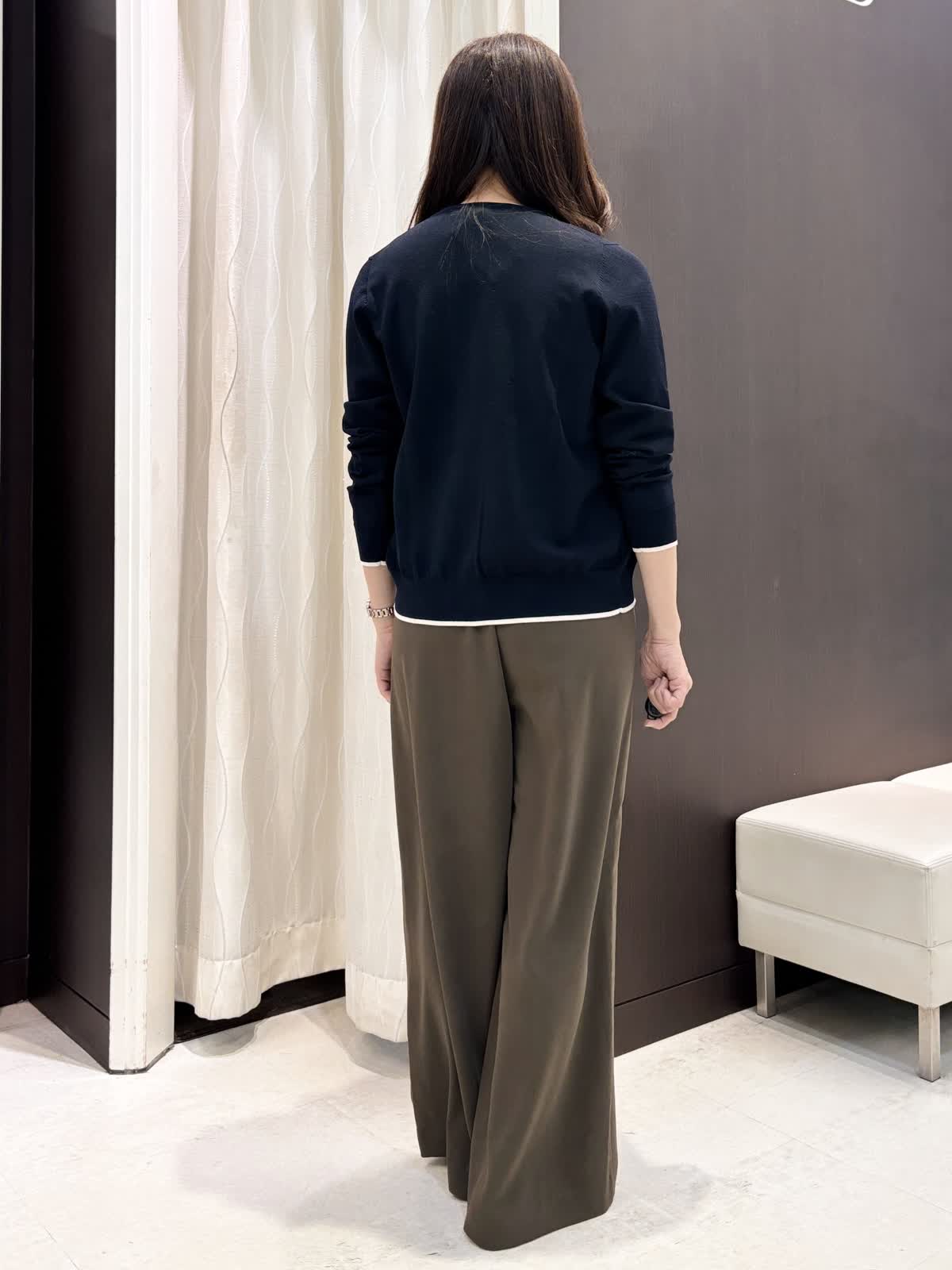 オンでもオフでもさまざまな場面で活用ができるオールマイティなアンサンブル。バイカラーの配色がネイビーを春らしく見せてくれます。柔らかいけどシャリっとした素材なので着心地良いです。パンツでもスカートでも、インしなくても使える着丈です◎カーディガンは腰巻きに応用したり楽しめますよう?パンツはとろみのある素材でカッコよく決まります。スカートはとっても楽チンでビックリしました!!