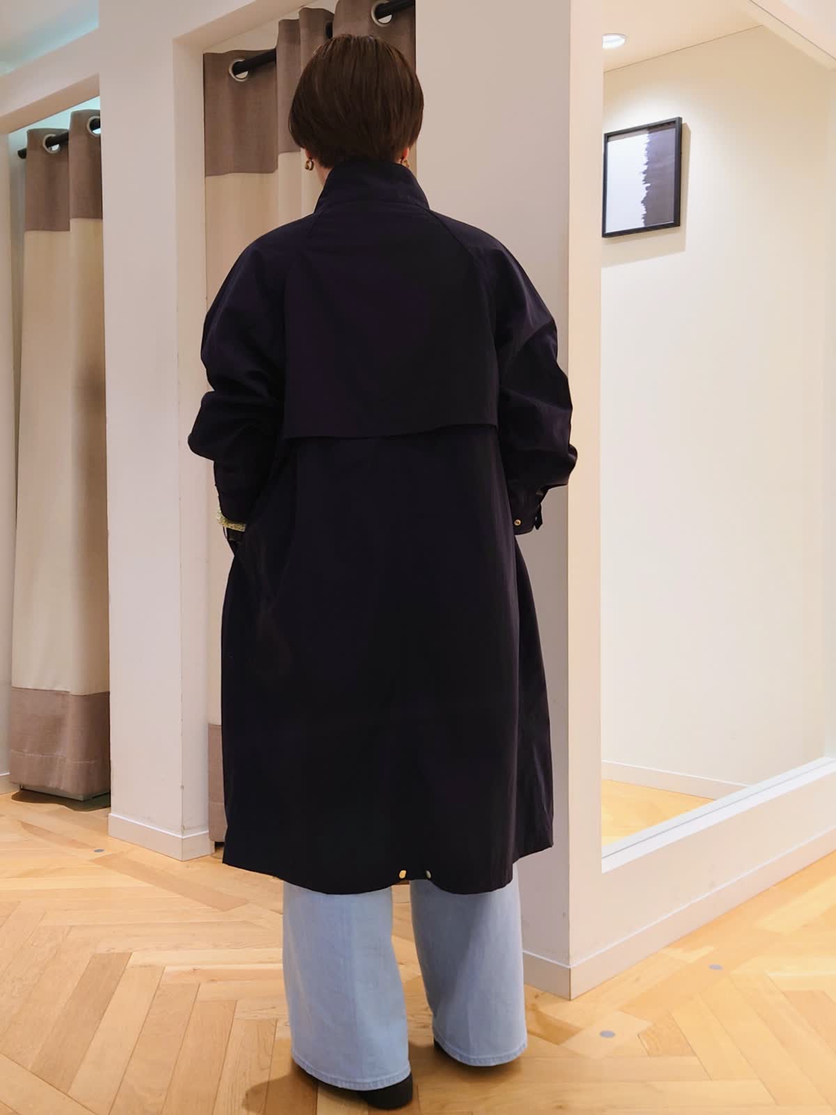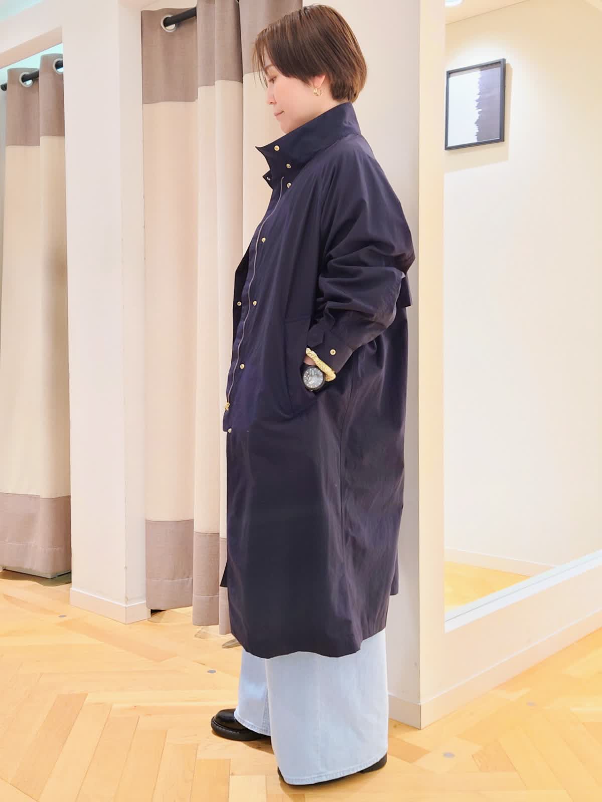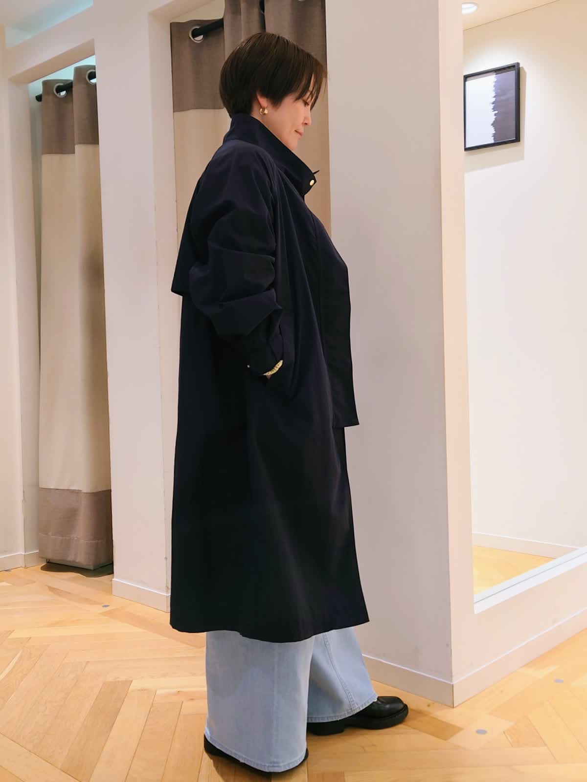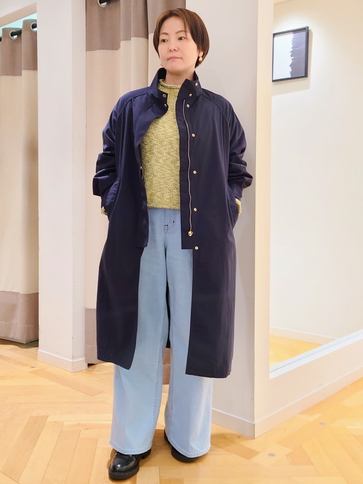 【着用サイズ】コート:9号 ニット:9号 パンツ:9号【着用カラー】コート:ネイビー ニット:イエロー パンツ:サックス コートはほどよいハリ感のある素材で、軽やかな着心地。季節の変わり目にも取り入れやすい素材感です。ワイドパンツやスカートと合わせて、リラックス感のある大人カジュアルスタイルに。ニットは1枚で着映えしますが、ロングシャツの上からレイヤードする着こなしもおすすめです。パンツはバギーデニムですが、柔らかい素材で落ち感のあるシルエット。