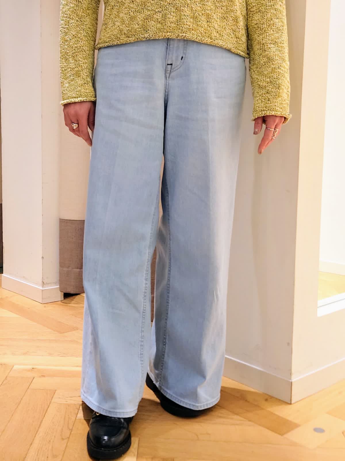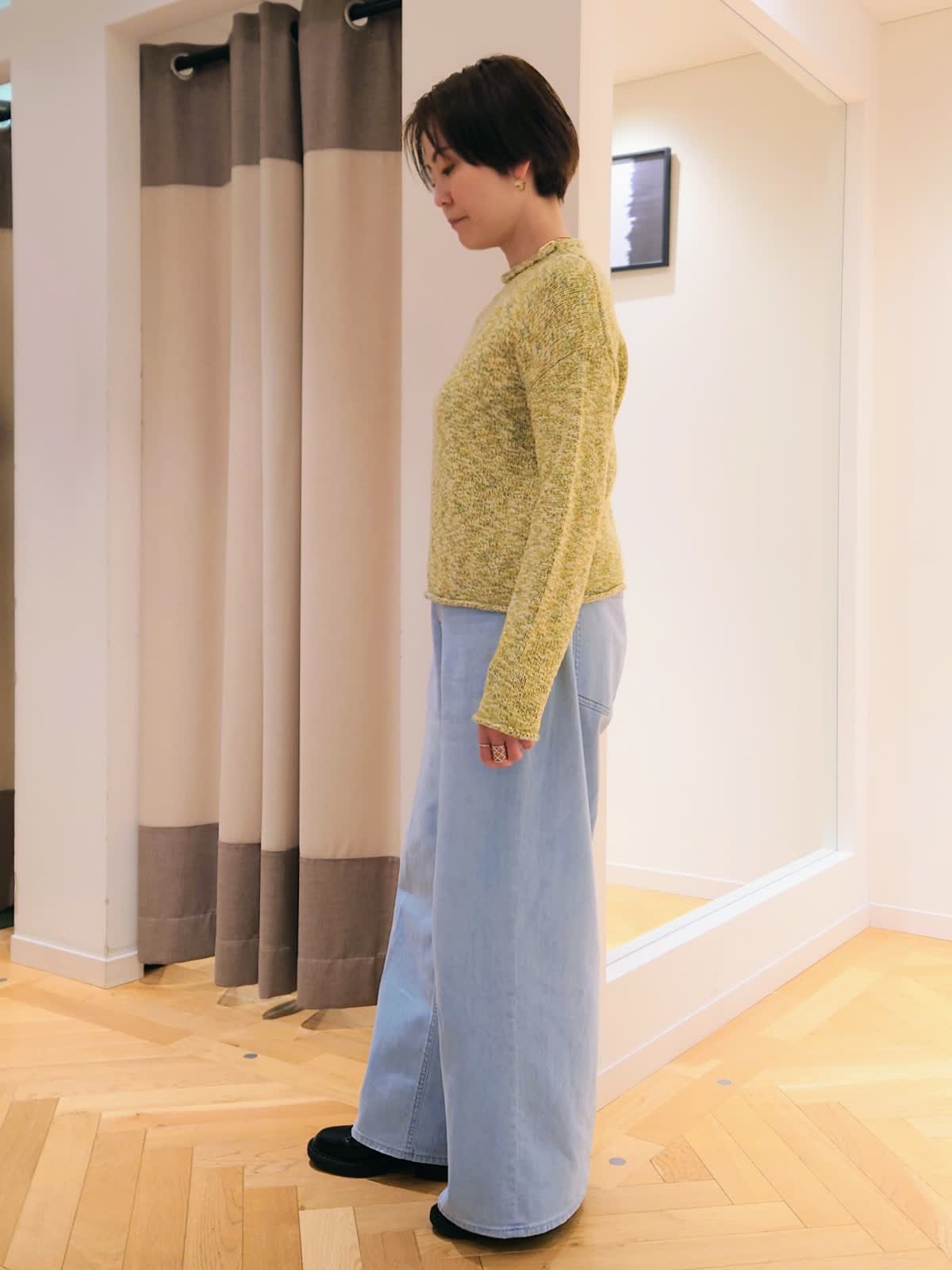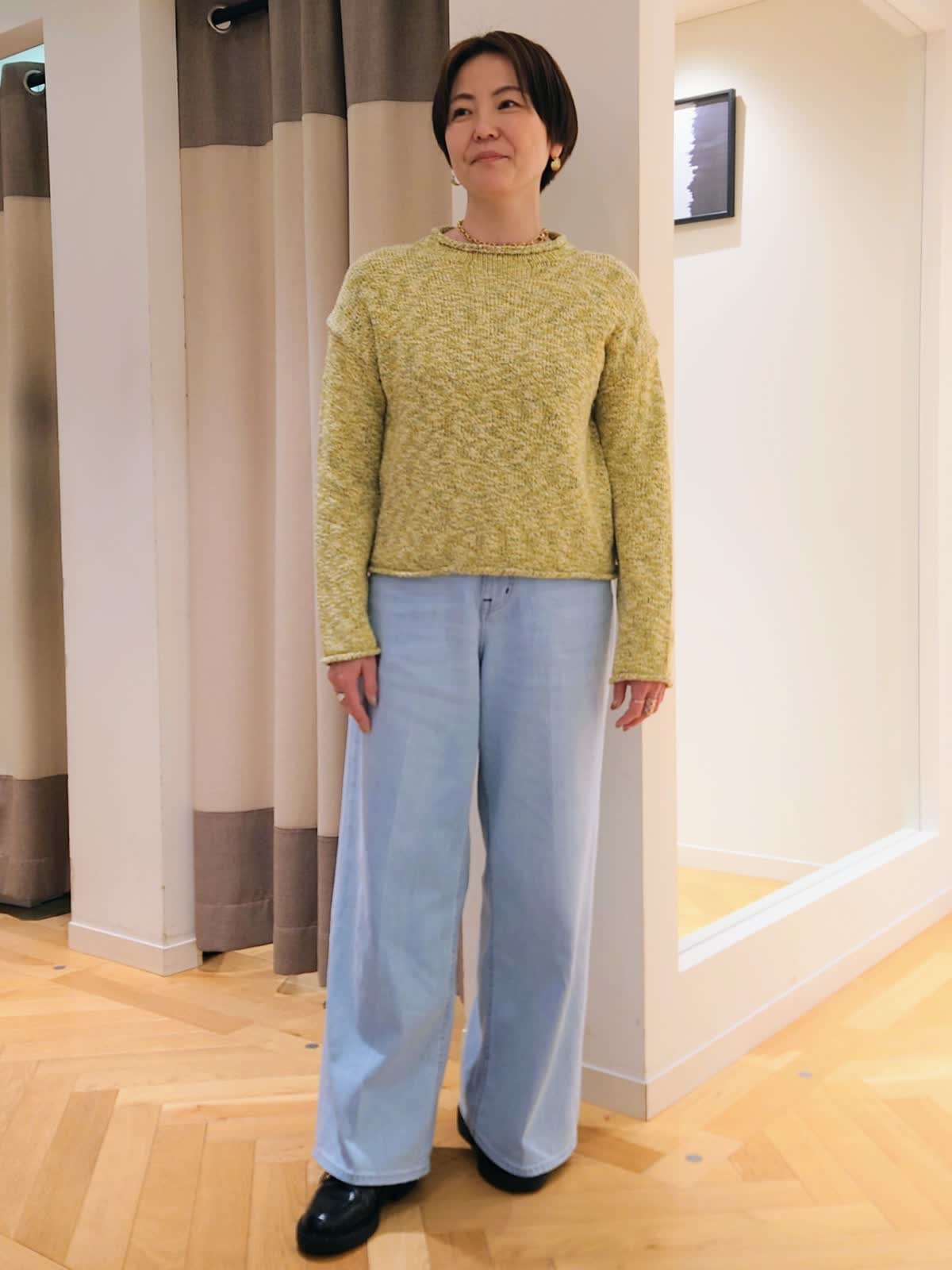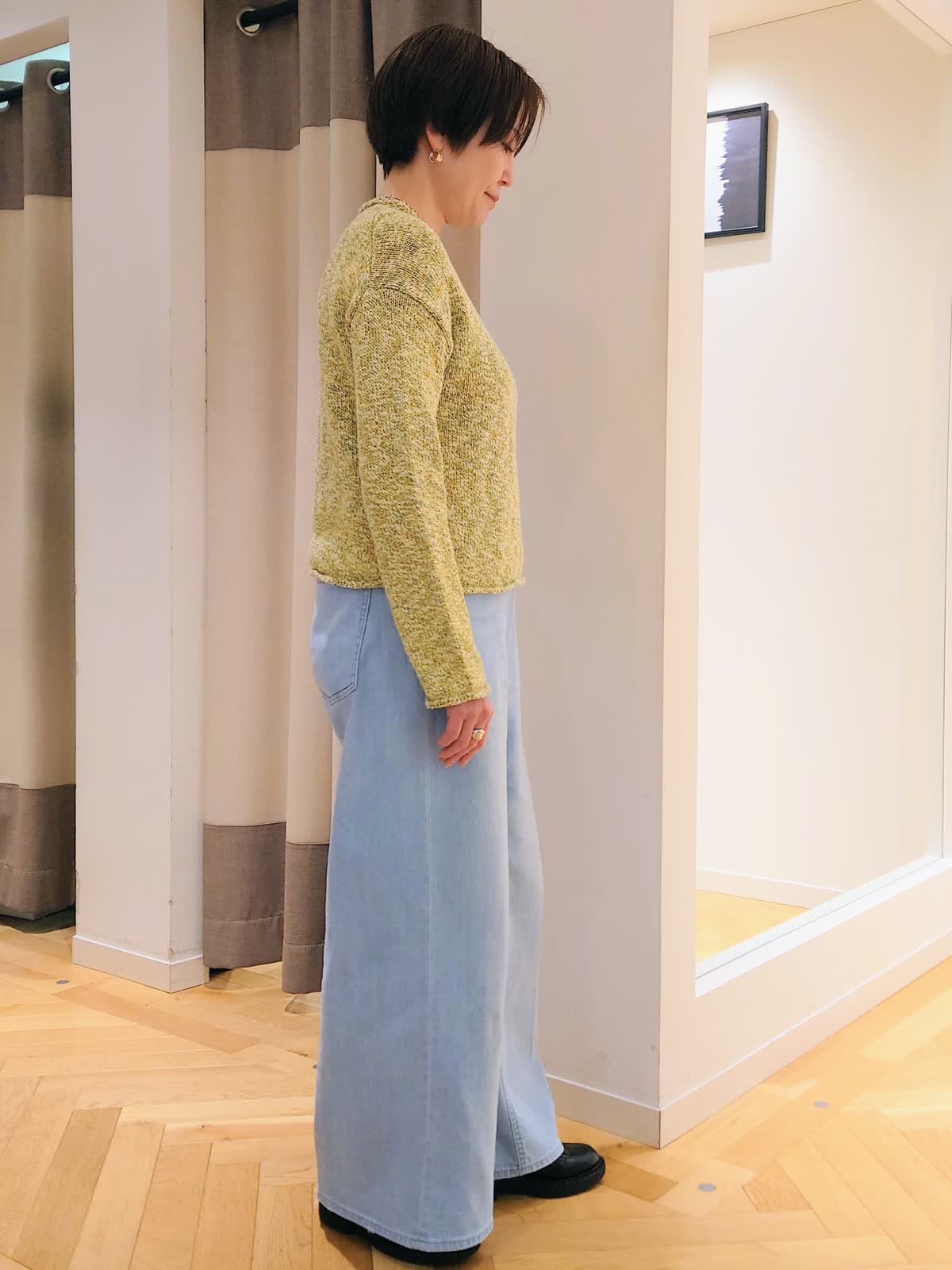 【着用サイズ】コート:9号 ニット:9号 パンツ:9号【着用カラー】コート:ネイビー ニット:イエロー パンツ:サックス コートはほどよいハリ感のある素材で、軽やかな着心地。季節の変わり目にも取り入れやすい素材感です。ワイドパンツやスカートと合わせて、リラックス感のある大人カジュアルスタイルに。ニットは1枚で着映えしますが、ロングシャツの上からレイヤードする着こなしもおすすめです。パンツはバギーデニムですが、柔らかい素材で落ち感のあるシルエット。