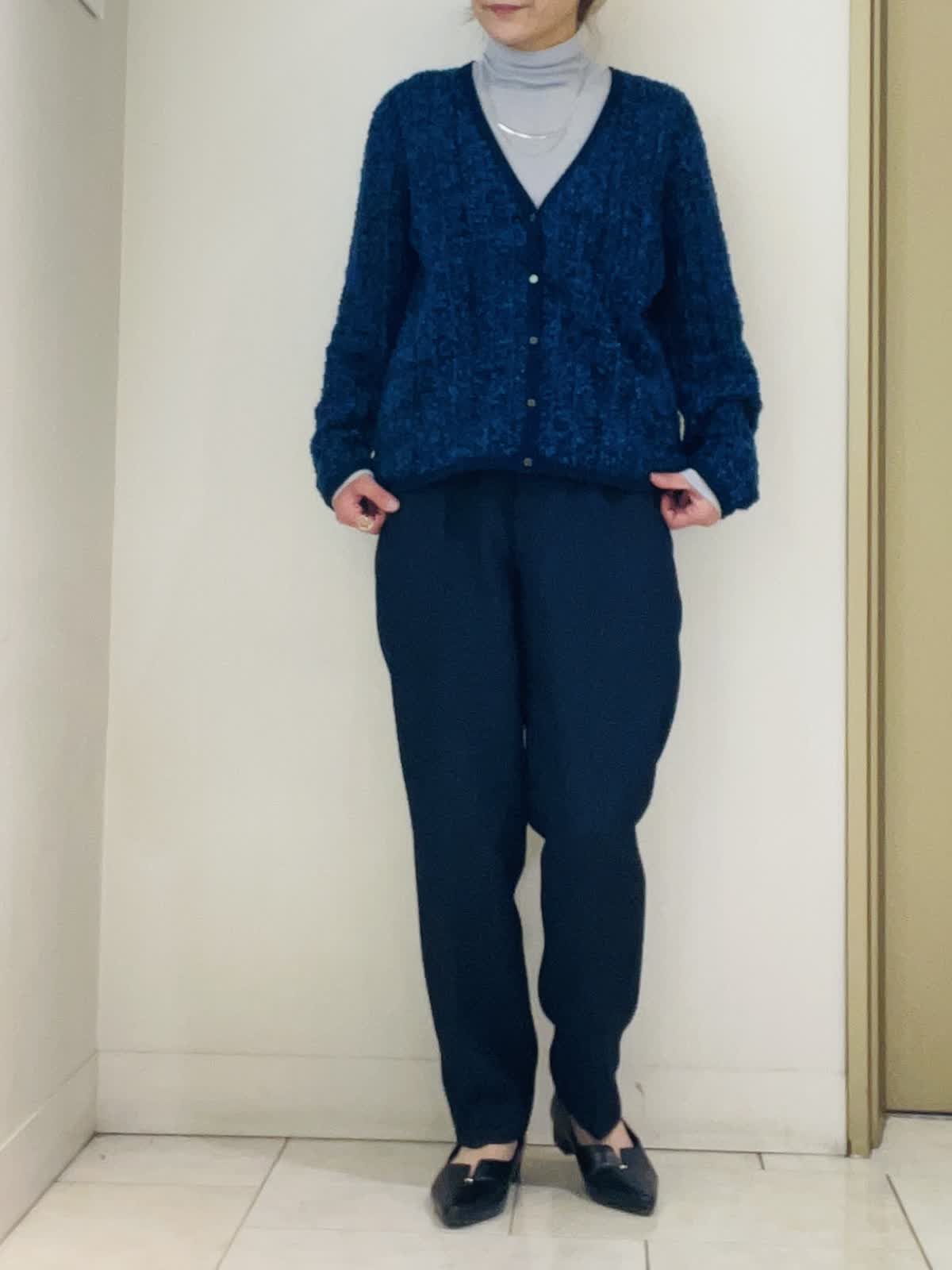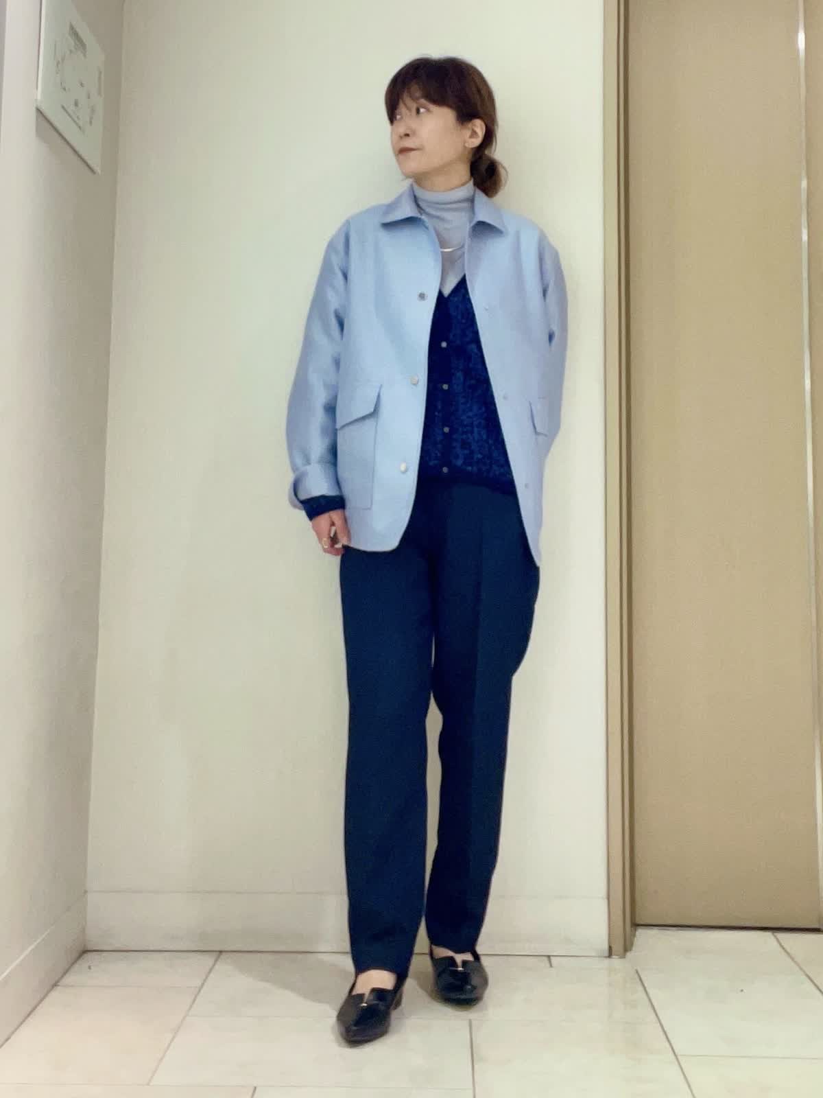 【着用サイズ/カラー】ジャケットサックス:9号サイズ :カーディガンネイビー:フリーサイズ インナーブルーグレー:フリーサイズ パンツネイビー:11号サイズ アウターから春をとりいれるオフィスカジュアル。透け感のあるハイネックとツィードカーディガン合わせは重ね着の重さがなく快適な着心地です◎。