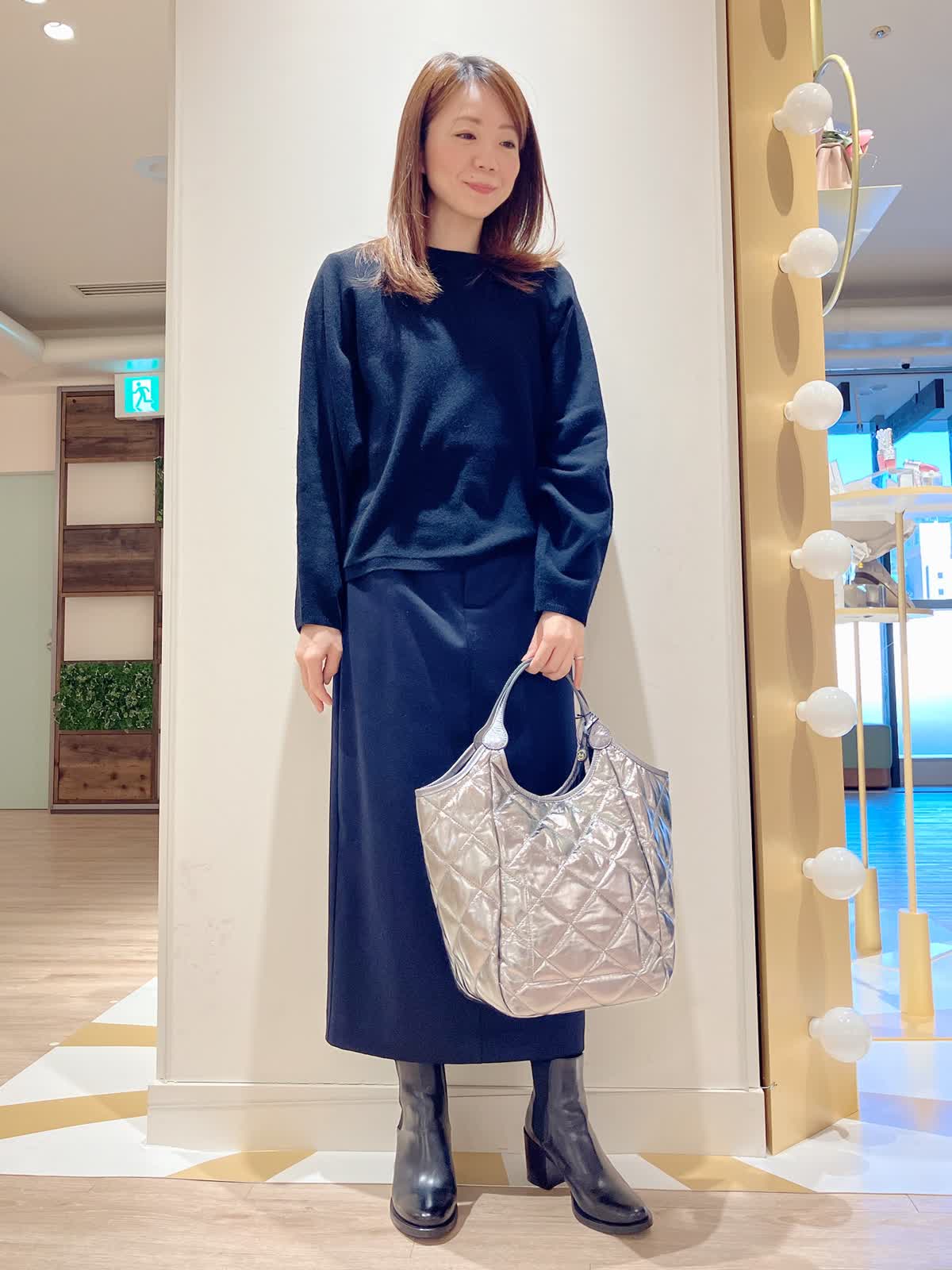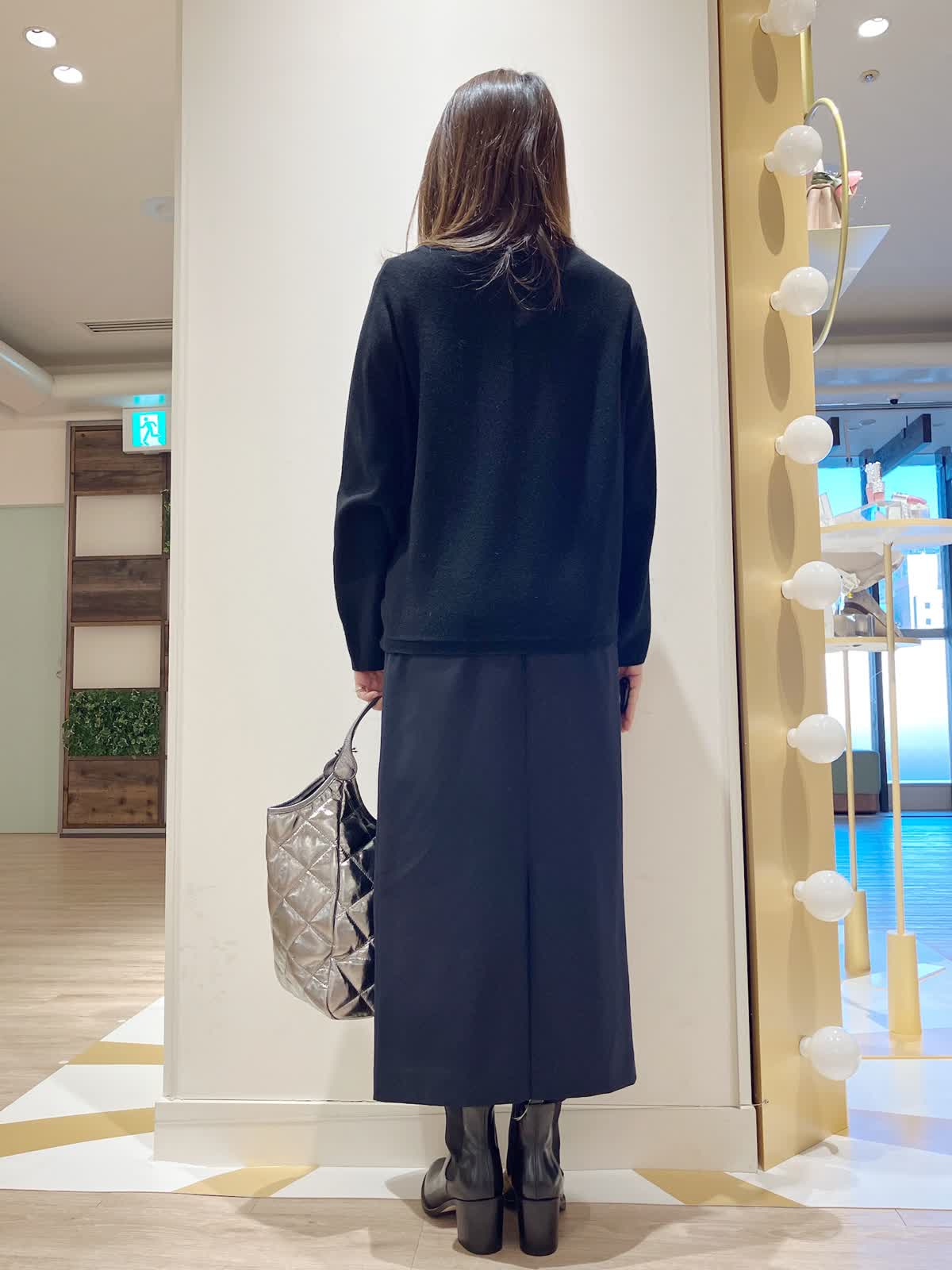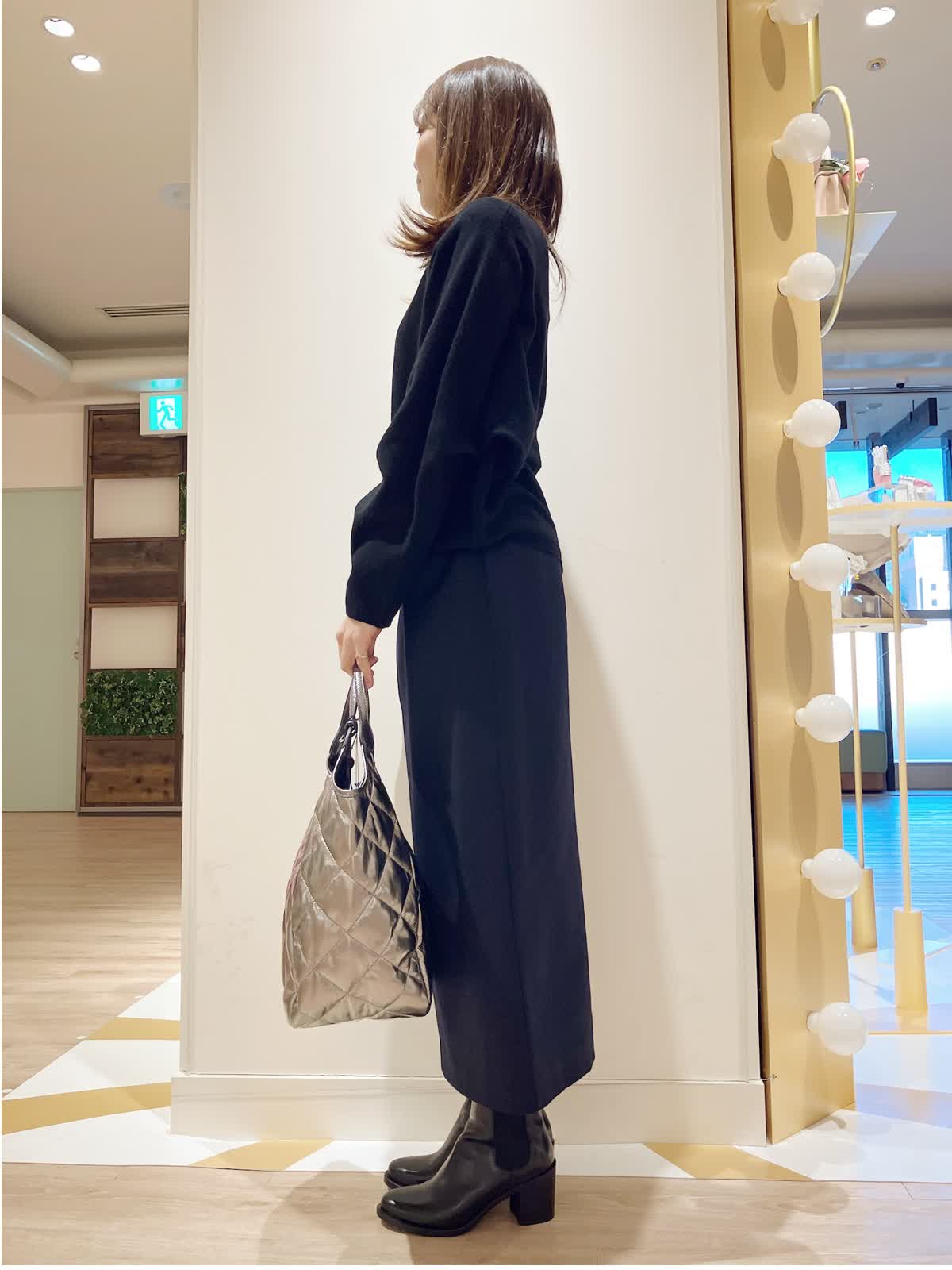 【着用サイズ】ニット:9号 スカート:7号 【着用カラー】ニット:ブラック スカート:ネイビー コーディネートのテーマはシックなお出かけスタイリングです。 カシミヤ混のニットは、袖がゆったりしているわりに、華奢見えが叶う美シルエットで、薄手なのに暖かく、これからの時期も大活躍。ウォッシャブルなのも嬉しいポイント。タイトめのスカートと合わせて前身落ち着いたカラーでシックな装いのお出かけスタイリングにおすすめです。
