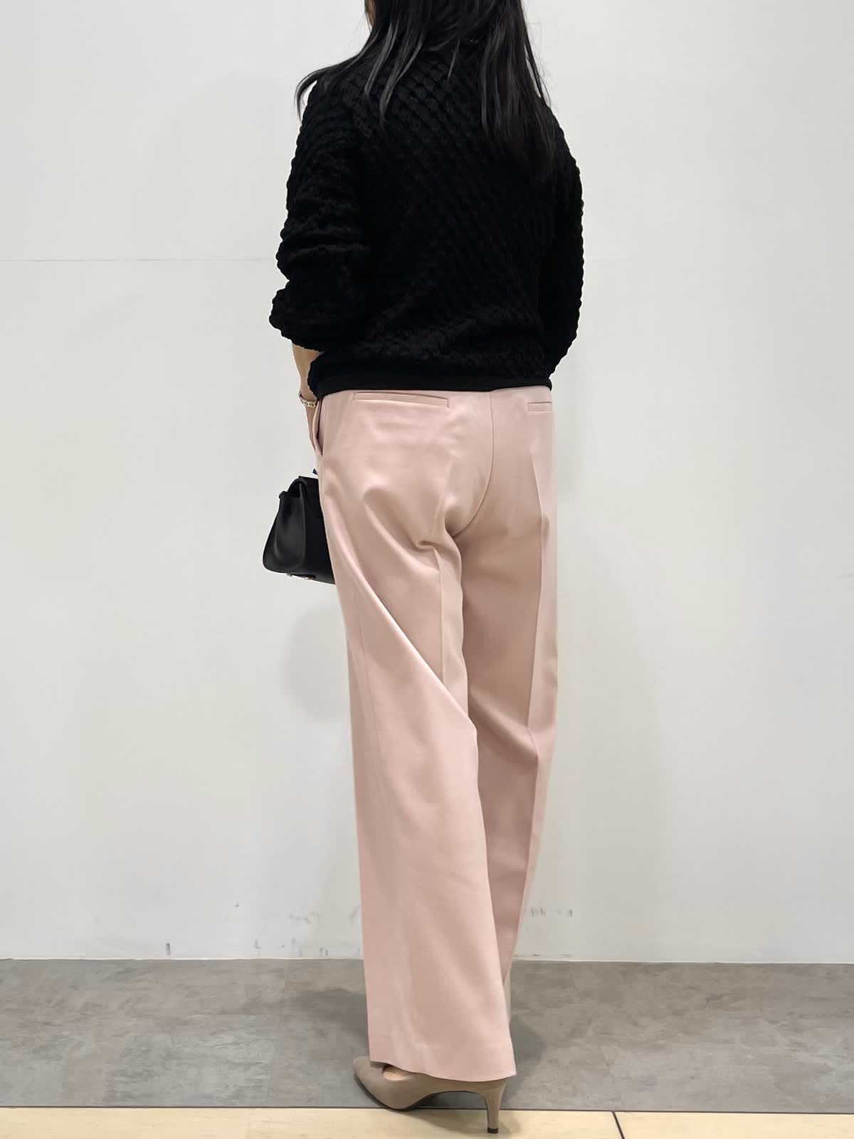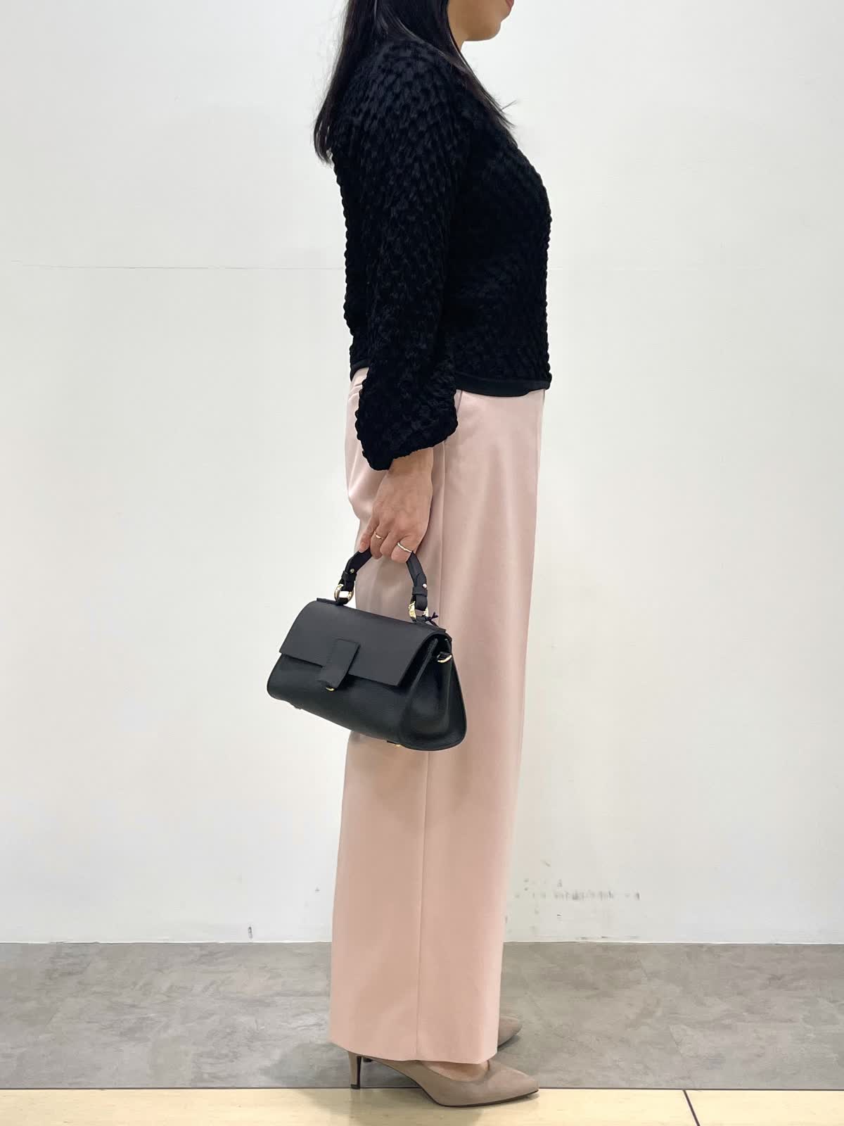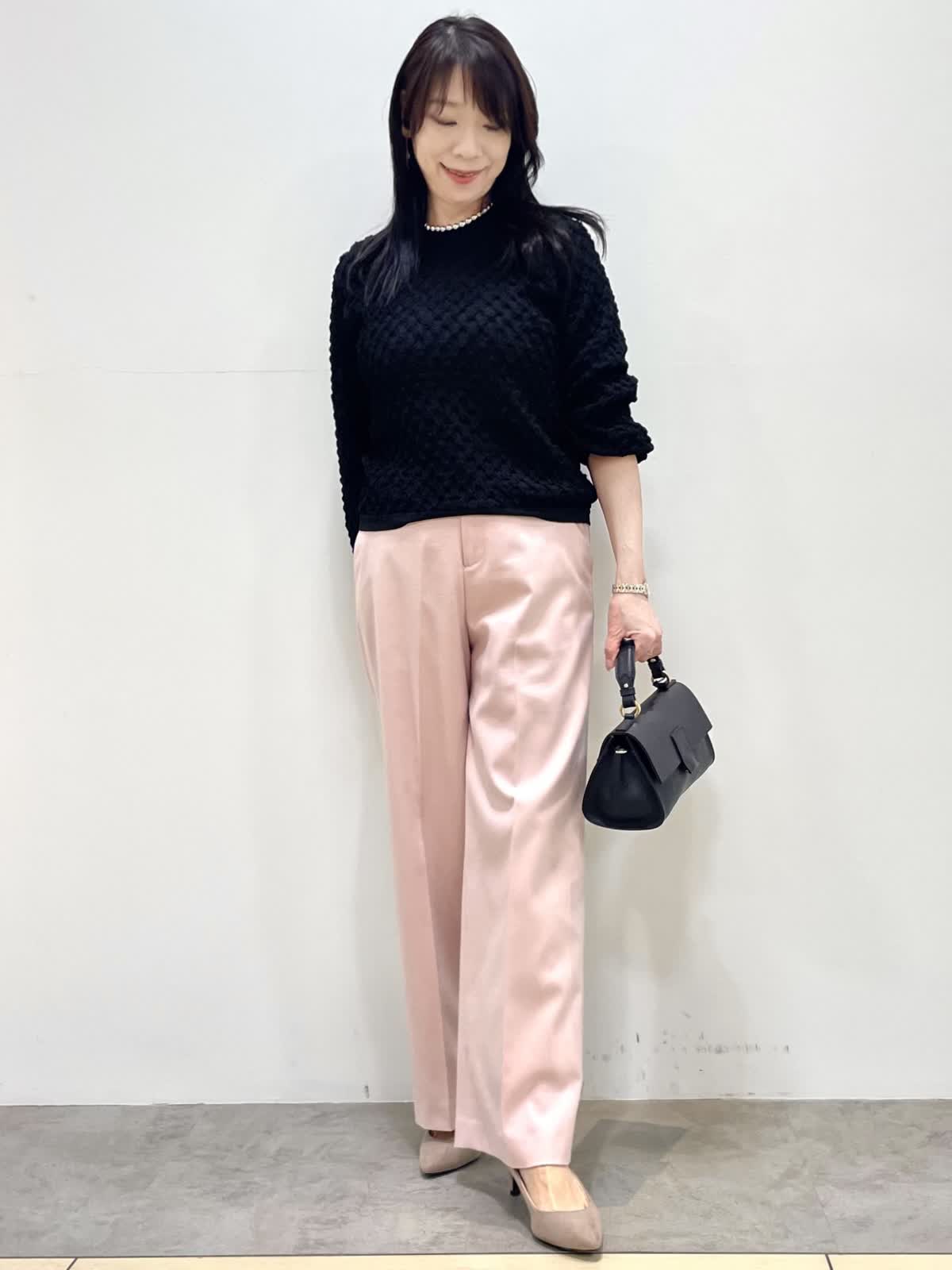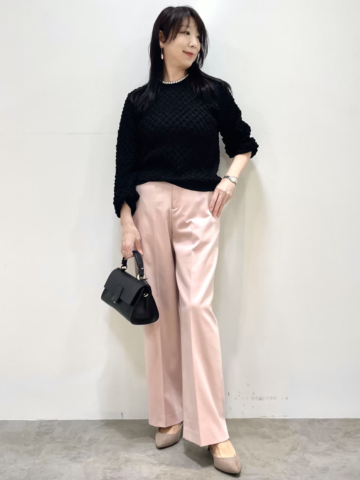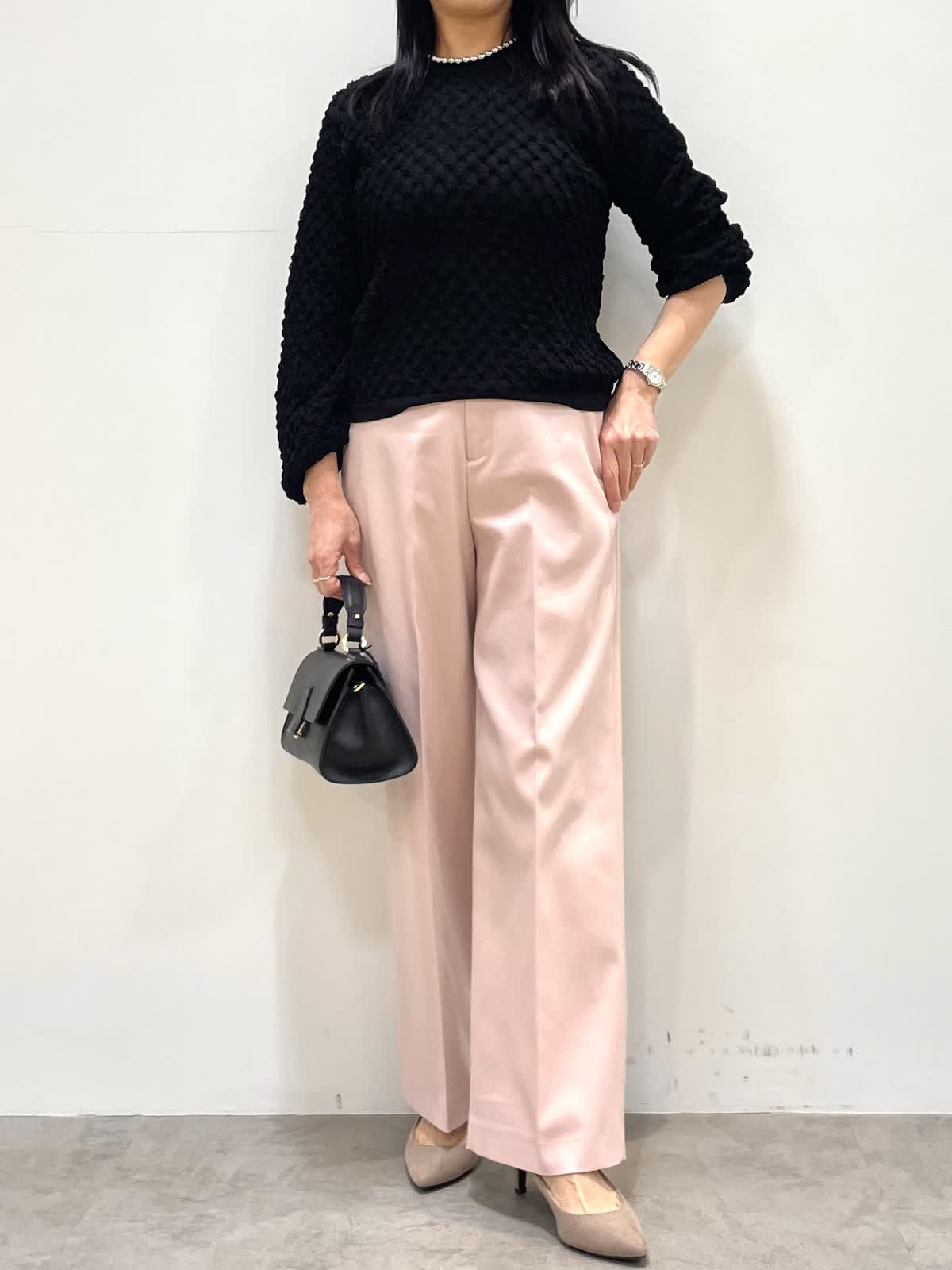 【着用サイズ】9号 【着用カラー】ニット:ブラック パンツ:ピンク 春のお出かけコーデ。ニットはジャガード編みでポコポコとした表面感がポイント。さりげないパフスリーブが女性らしいです。パンツ、スカートどちらにも合わせやすい着丈でボトムスを選びません。パンツは幅広すぎないセミワイド。センタープレスでIラインを強調する事でスタイルアップ見えします。