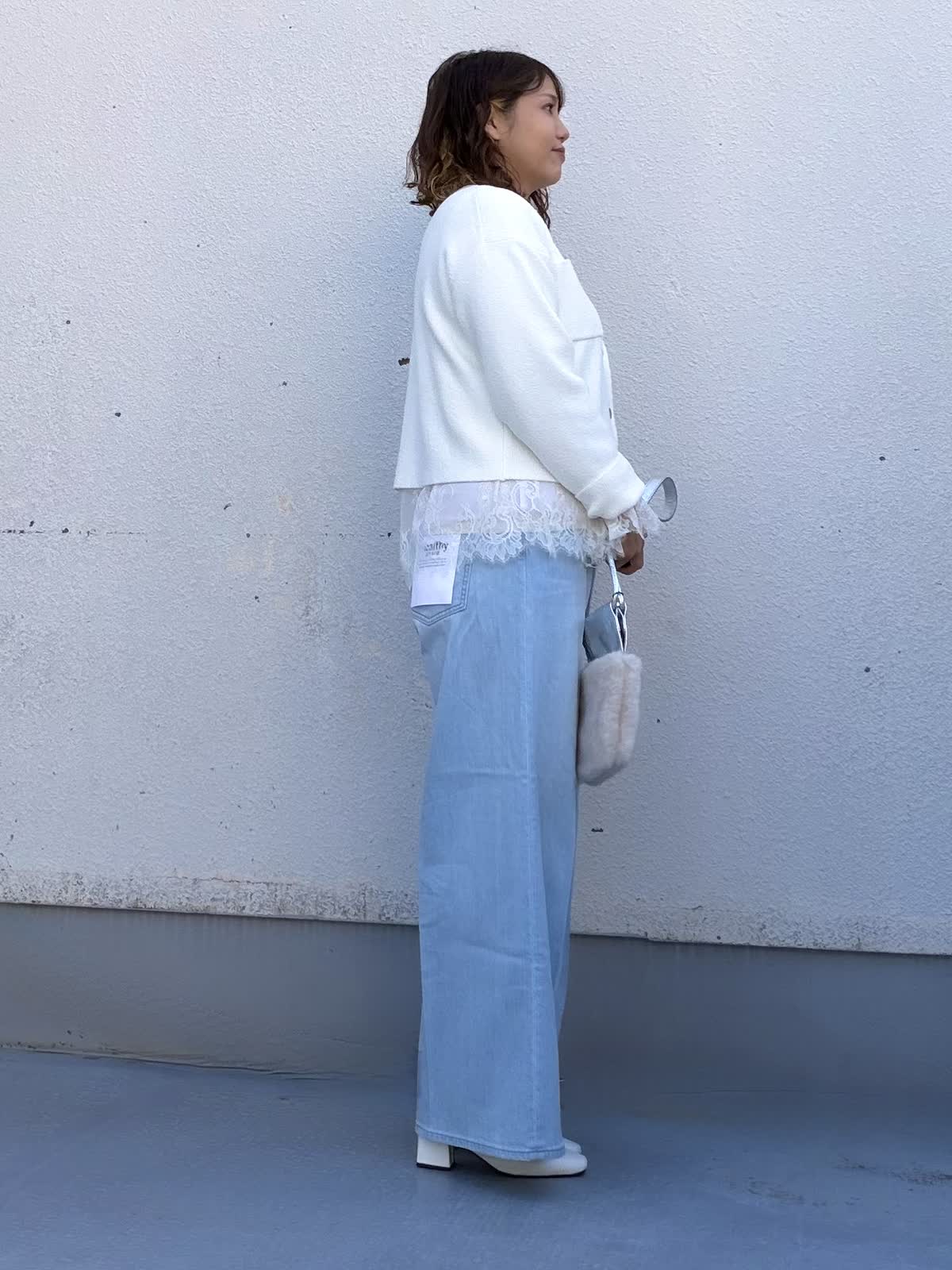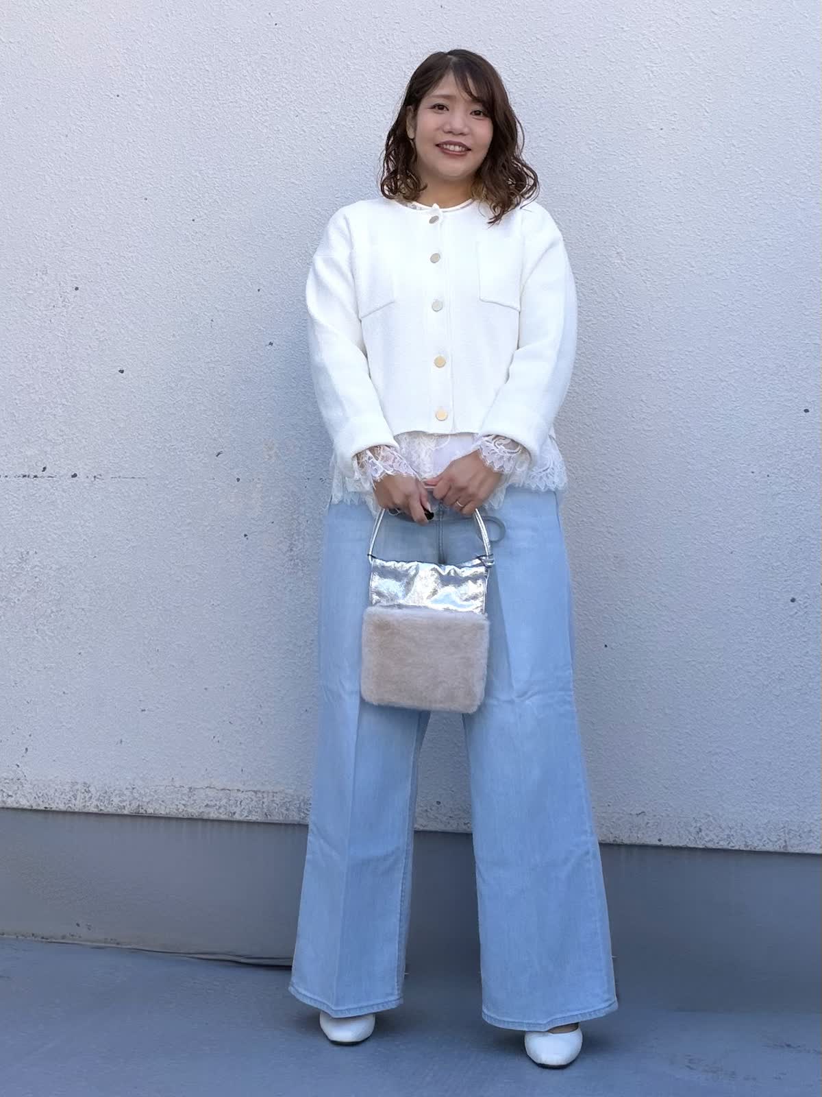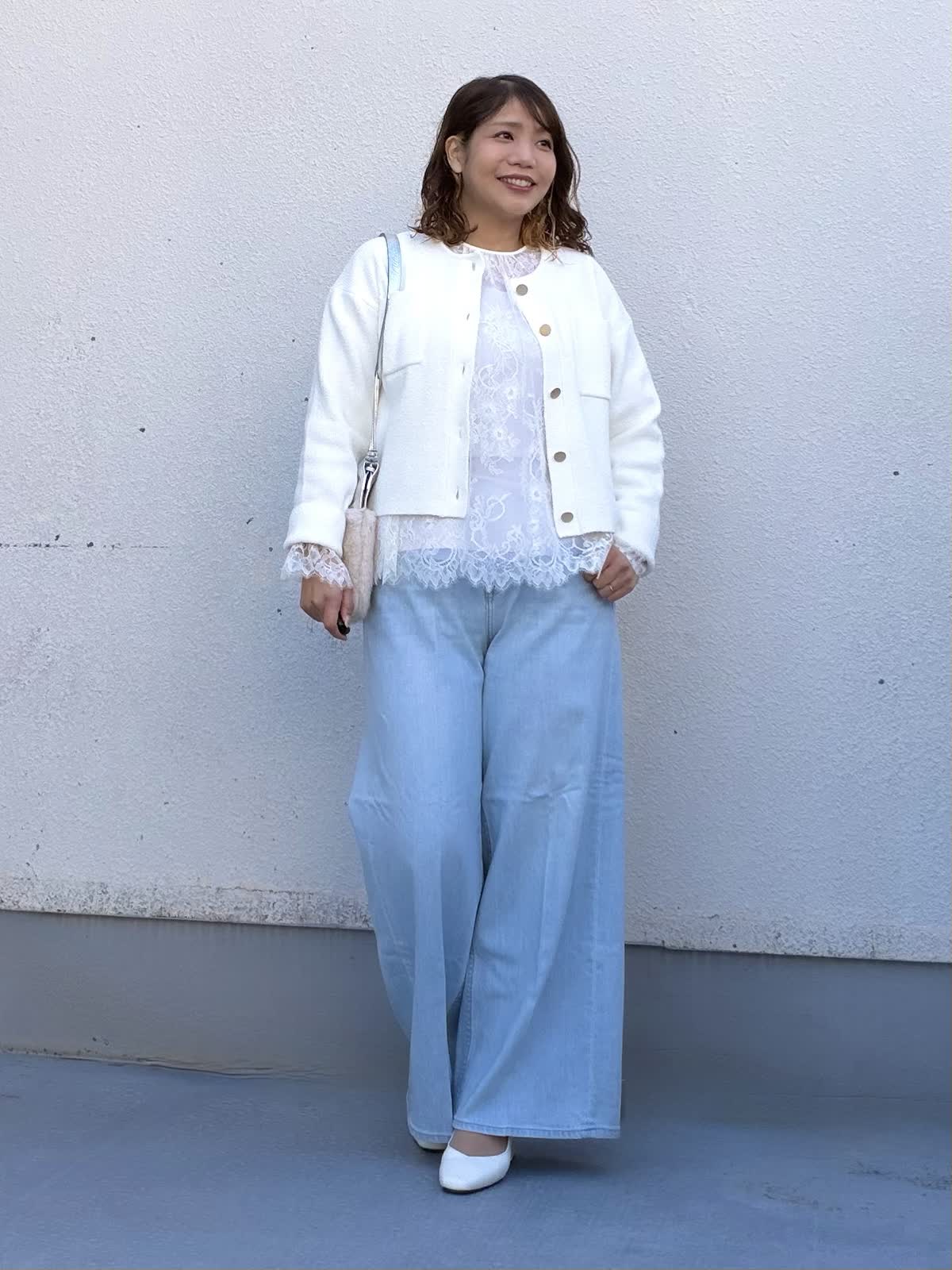 【着用アイテム:カラー/サイズ】 カーディガン:オフホワイト/9号 ブラウス:オフホワイト/9号 パンツ:サックス/11号 コンパクトな丈感のカーディガンは、ボタンを閉じてプルオーバー風にも着て頂けます。丈が短めなのでレースブラウスをレイヤードしました。 シンプルながら華やかな印象に仕上げてくれます。 ボトムは淡いブルーのワイドデニム。 柔らかなカラーで春らしさを演出しつつ、脚のラインを拾いにくいシルエットでリラックス感も◎