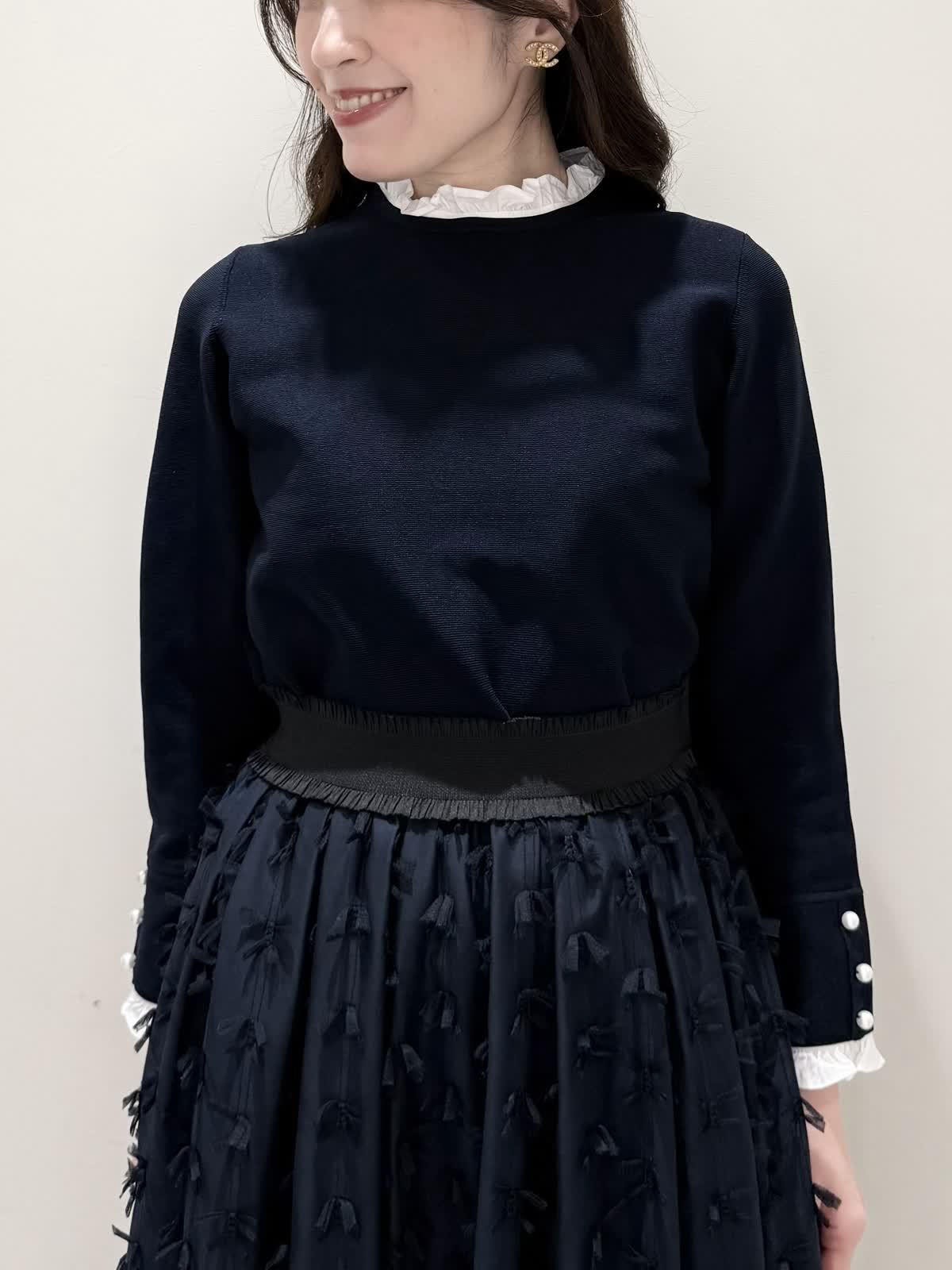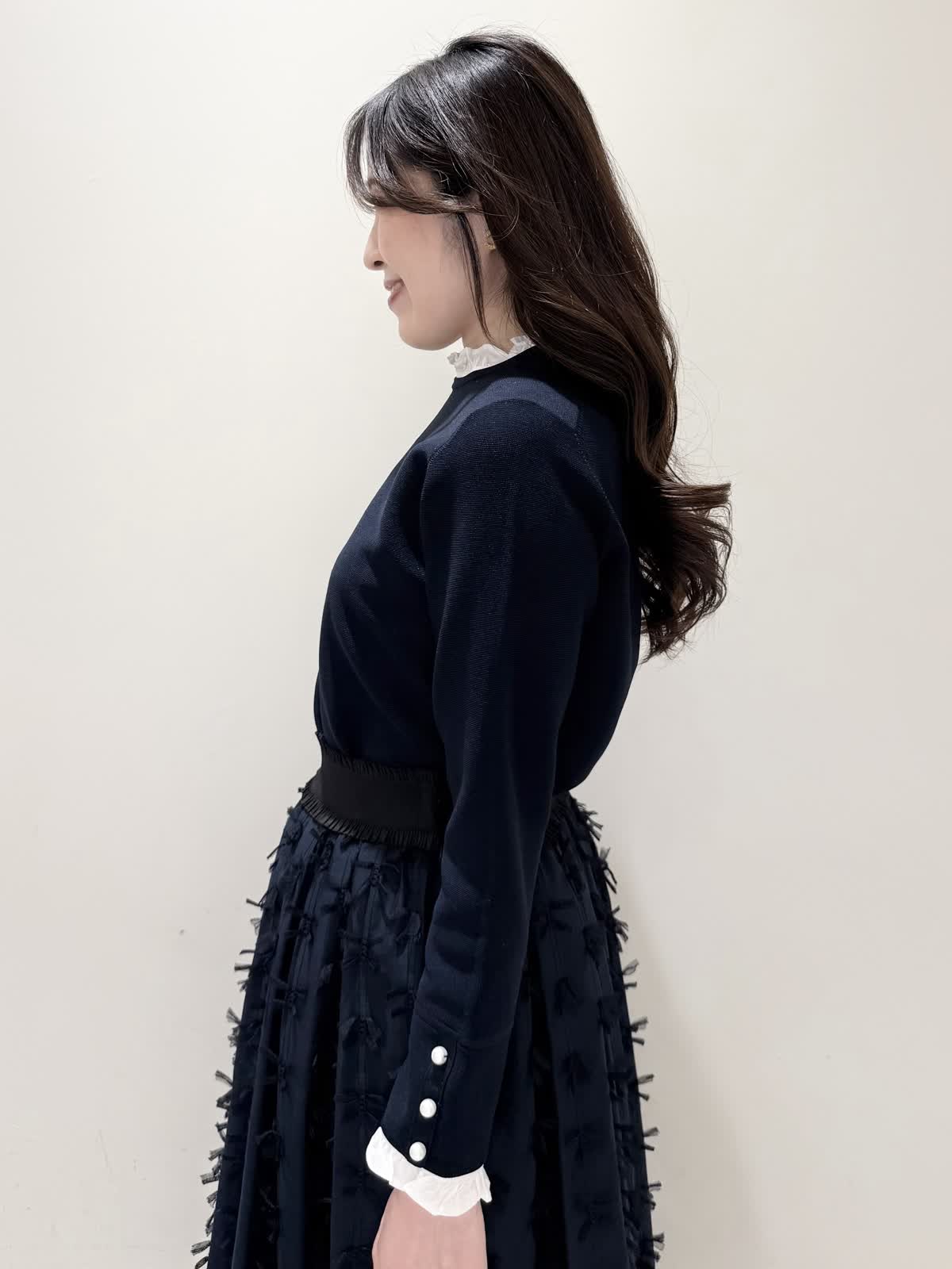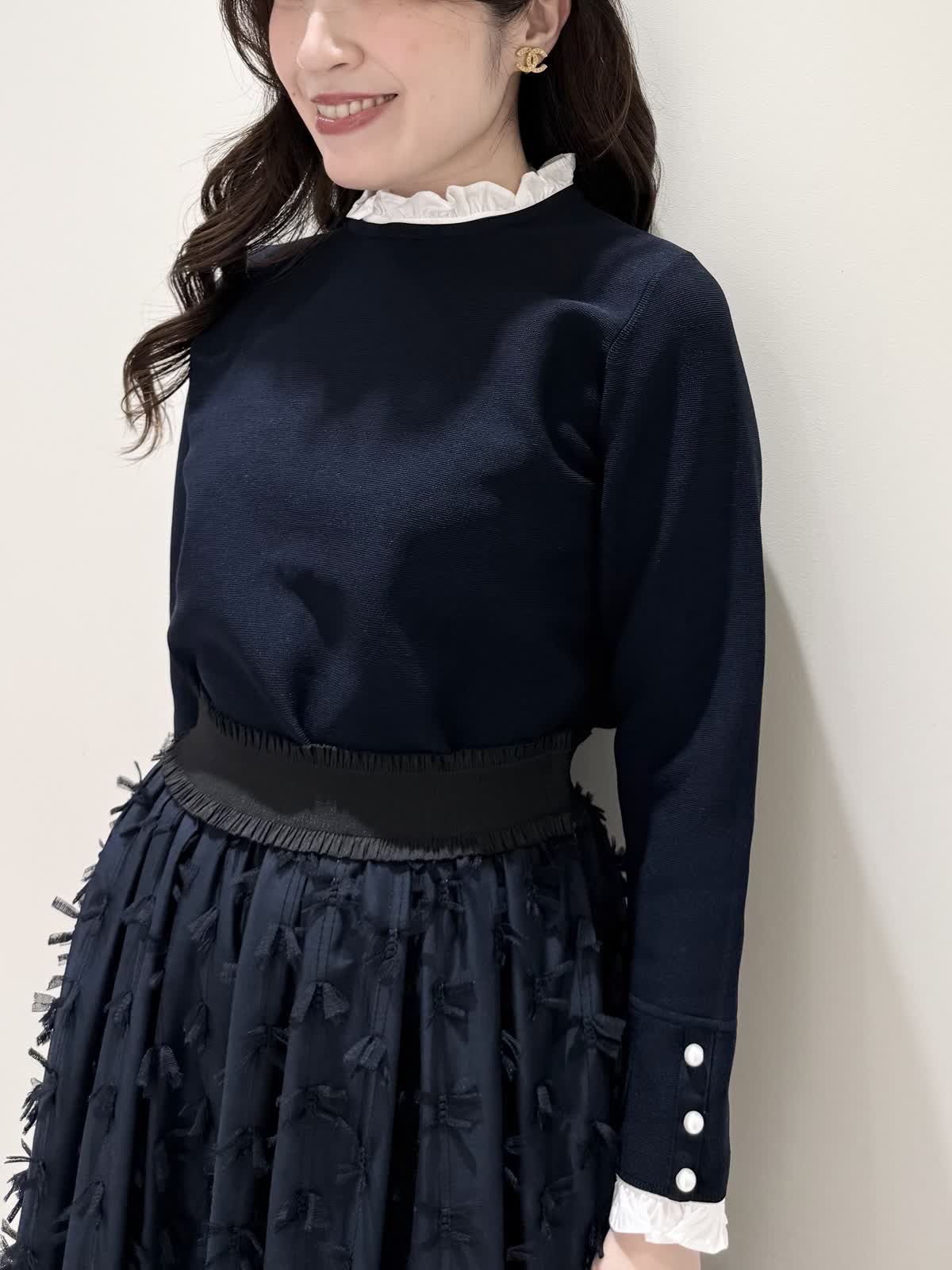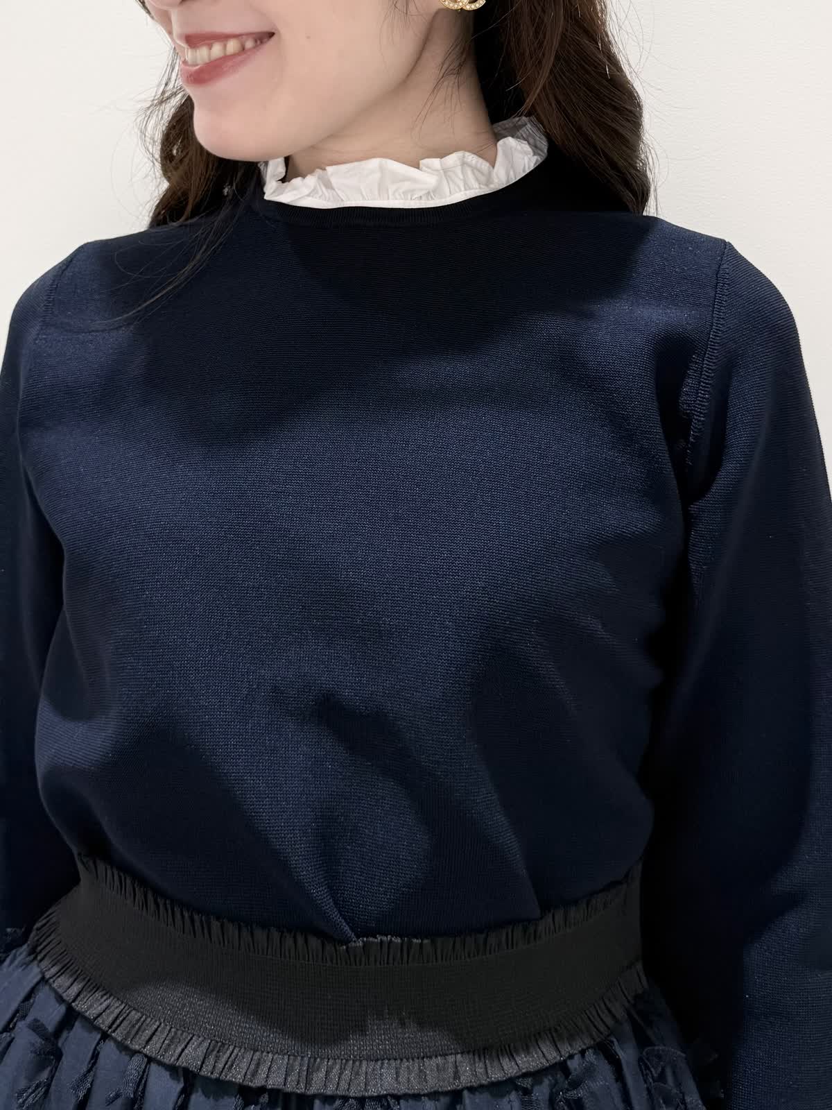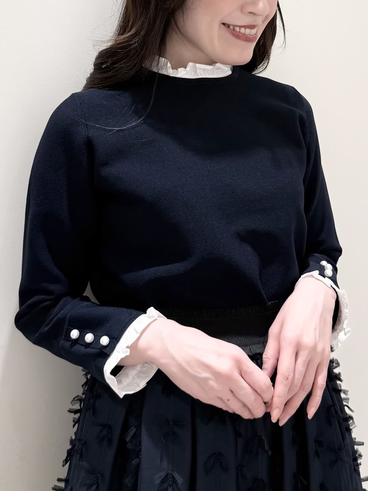 【着用サイズ/カラー】ニット:7号/ネイビー スカート:5号/ネイビー コート:7号/ラベンダー 暖かくなったらすぐ着られるおすすめコーディネート。ブラウスとのレイヤード風のニットは身頃はスポンディッシュでサラッとした着心地。裾がスリット入りでストンと落ちたシルエットなのでアウトでもバランスよく着られます。ネック周りは窮屈感なく、ブラウス生地のフリルがあたらないので着やすく、袖口と共に取り外し可能です。ジャケットのインナーにも映える1着です。合わせはリボンデザインが目を惹くふわっと軽く着られるスカート。ウエストはフリルデザインが可愛い柔らかいギャザーゴム。ゴムの所の伸び感はありますが、スカートとの縫い合わせの部分はゴムのみの所に比べると伸び感は少なめです。ただ、他のスカートよりはギャザーゴムが柔らかく、とっても履きやすいです。上下共いつものサイズで大丈夫です。羽織りはラベンダーカラーが綺麗なコート。ウエストが内側で絞りができるので絞るとフィット&フレアシルエット、絞らなくても綺麗に着られます。軽い生地で前を閉じてワンピース風に着たりしても可愛いです。いつものサイズで大丈夫です。
