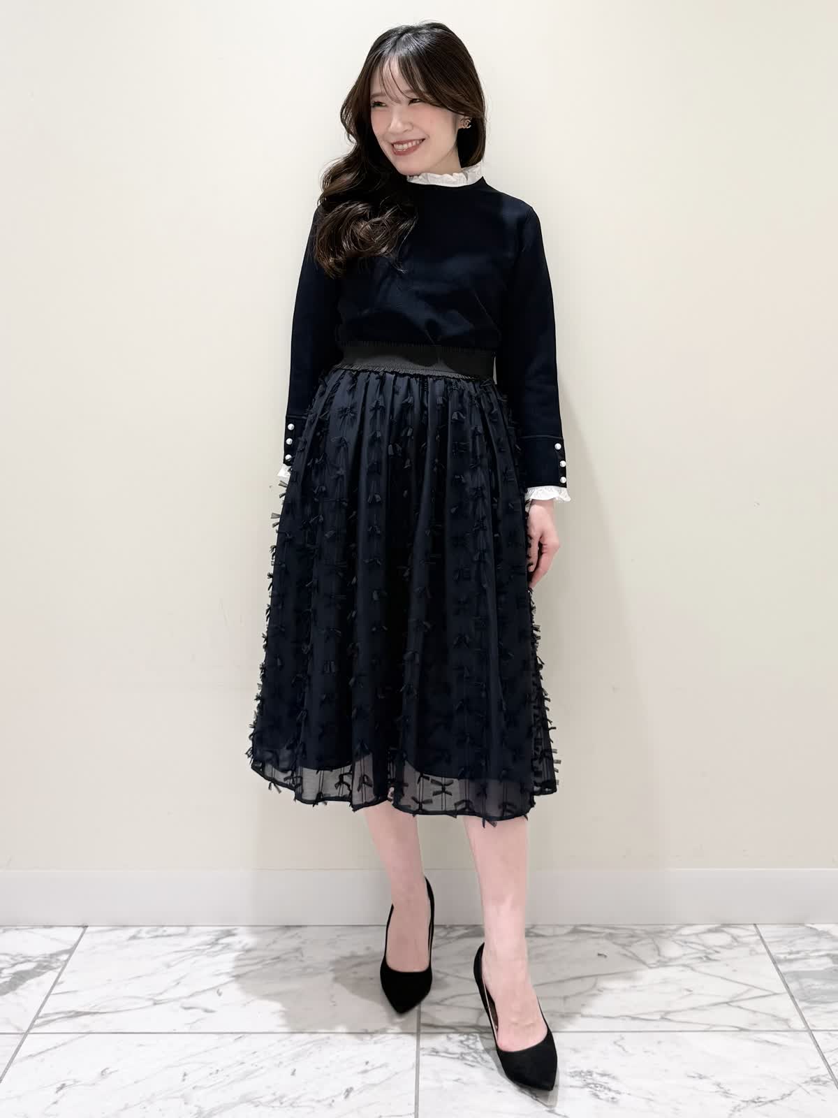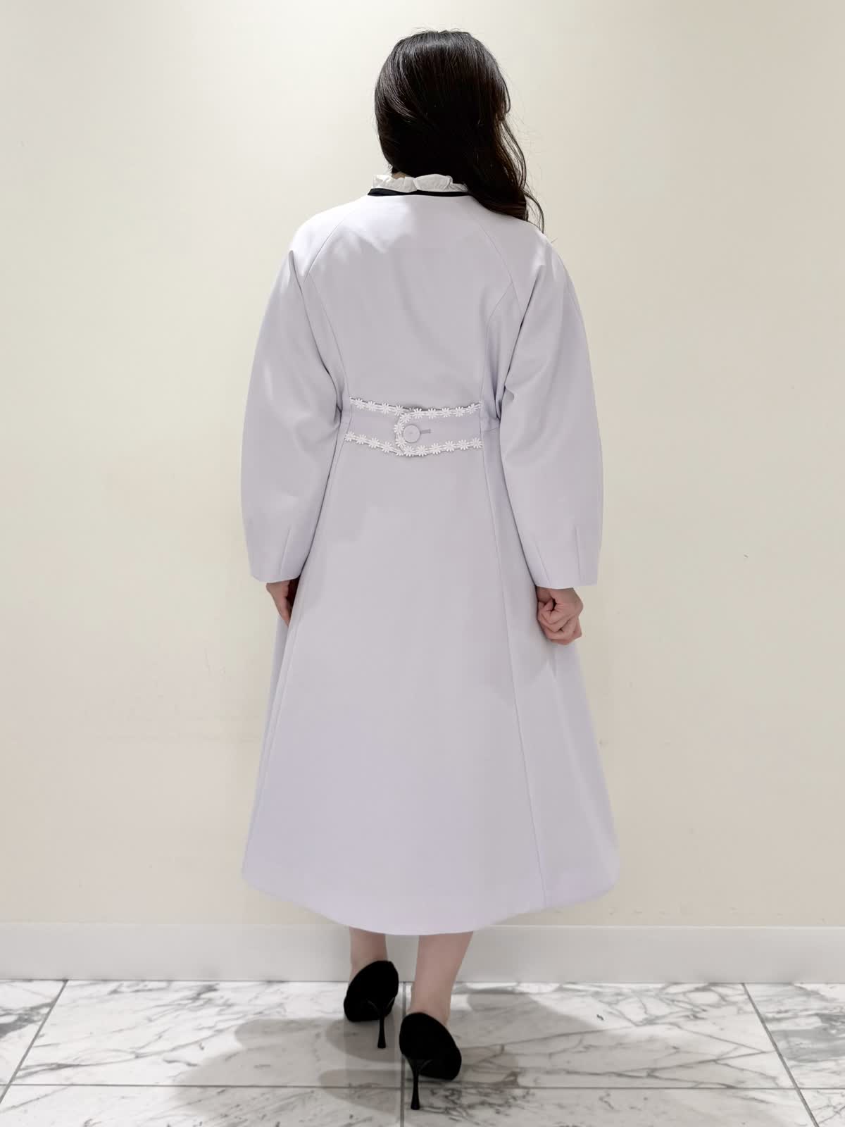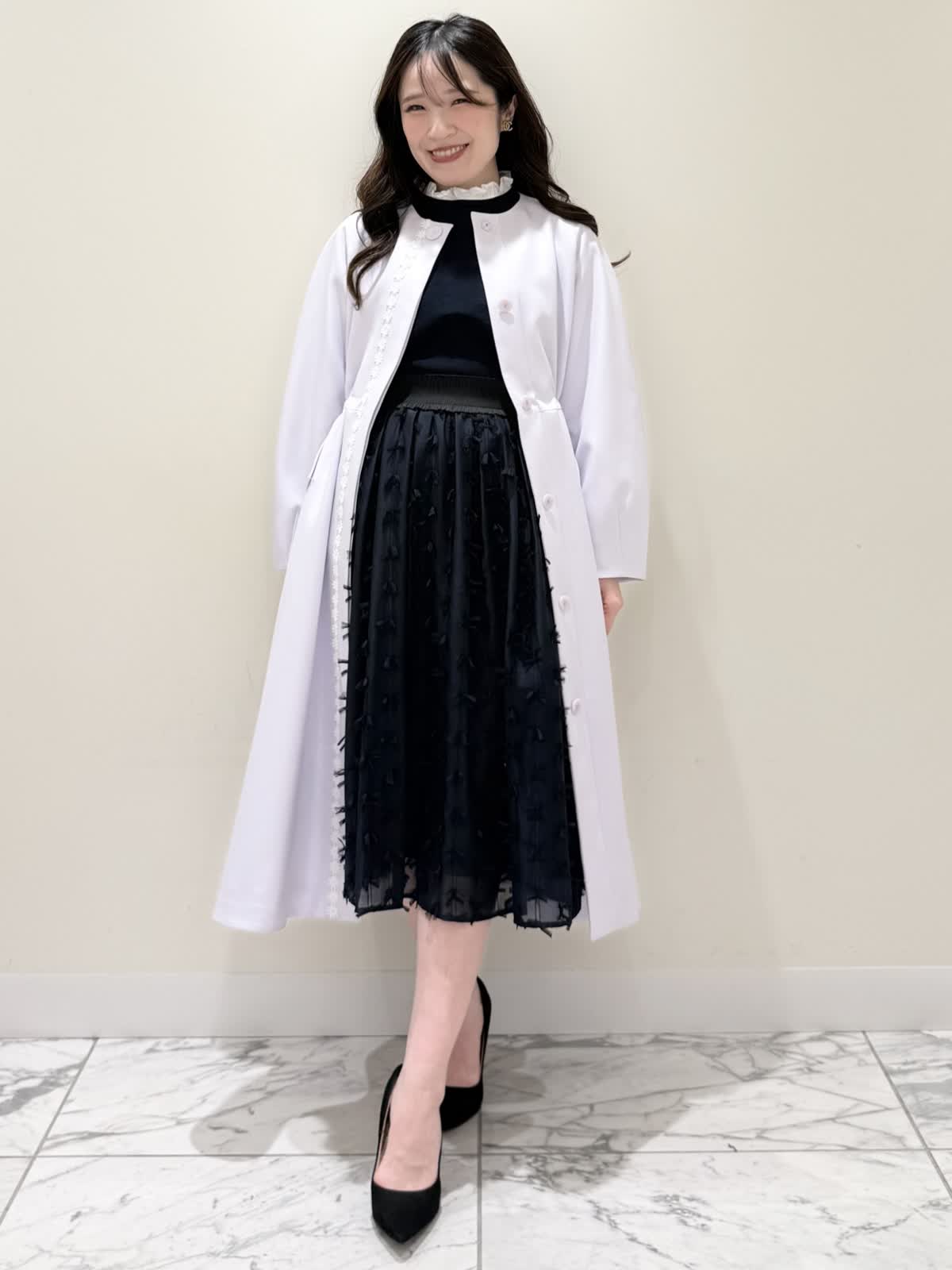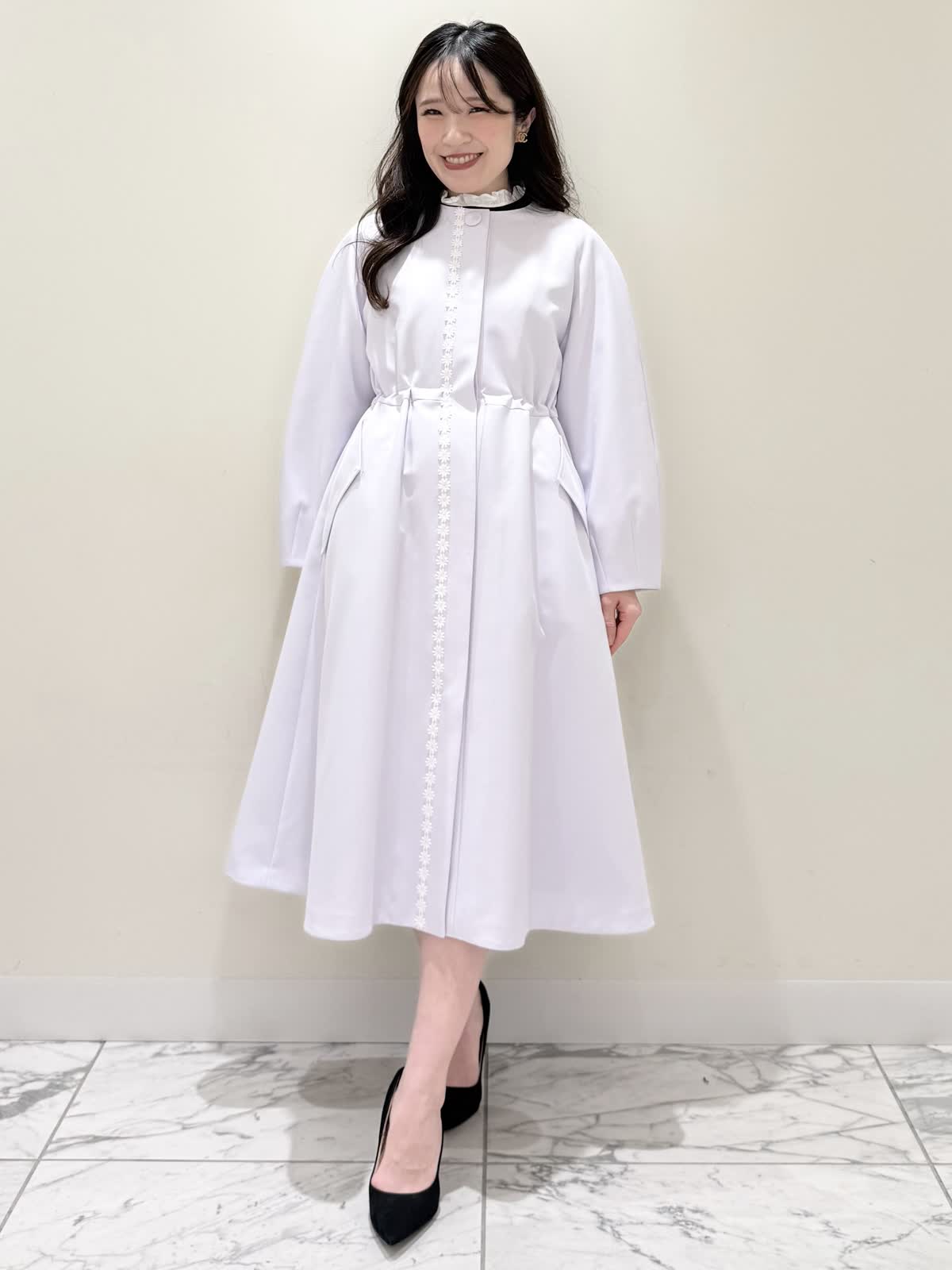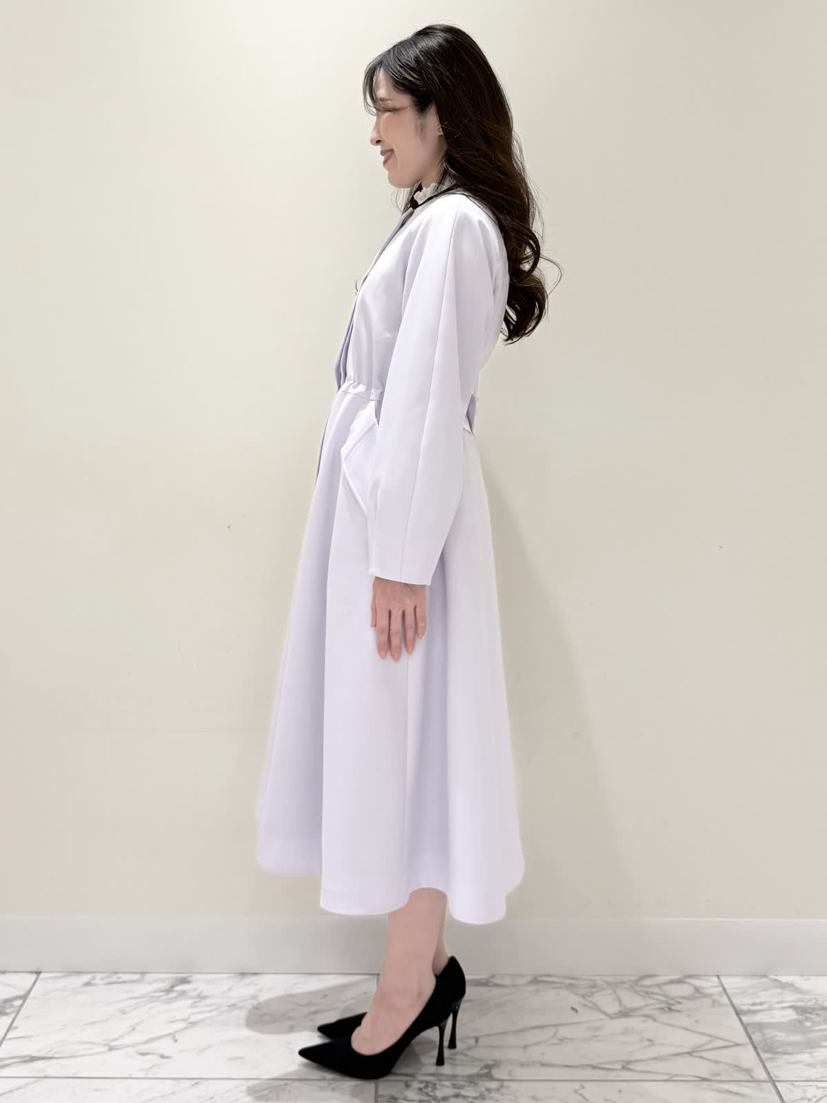 【着用サイズ/カラー】ニット:7号/ネイビー スカート:5号/ネイビー コート:7号/ラベンダー 暖かくなったらすぐ着られるおすすめコーディネート。ブラウスとのレイヤード風のニットは身頃はスポンディッシュでサラッとした着心地。裾がスリット入りでストンと落ちたシルエットなのでアウトでもバランスよく着られます。ネック周りは窮屈感なく、ブラウス生地のフリルがあたらないので着やすく、袖口と共に取り外し可能です。ジャケットのインナーにも映える1着です。合わせはリボンデザインが目を惹くふわっと軽く着られるスカート。ウエストはフリルデザインが可愛い柔らかいギャザーゴム。ゴムの所の伸び感はありますが、スカートとの縫い合わせの部分はゴムのみの所に比べると伸び感は少なめです。ただ、他のスカートよりはギャザーゴムが柔らかく、とっても履きやすいです。上下共いつものサイズで大丈夫です。羽織りはラベンダーカラーが綺麗なコート。ウエストが内側で絞りができるので絞るとフィット&フレアシルエット、絞らなくても綺麗に着られます。軽い生地で前を閉じてワンピース風に着たりしても可愛いです。いつものサイズで大丈夫です。