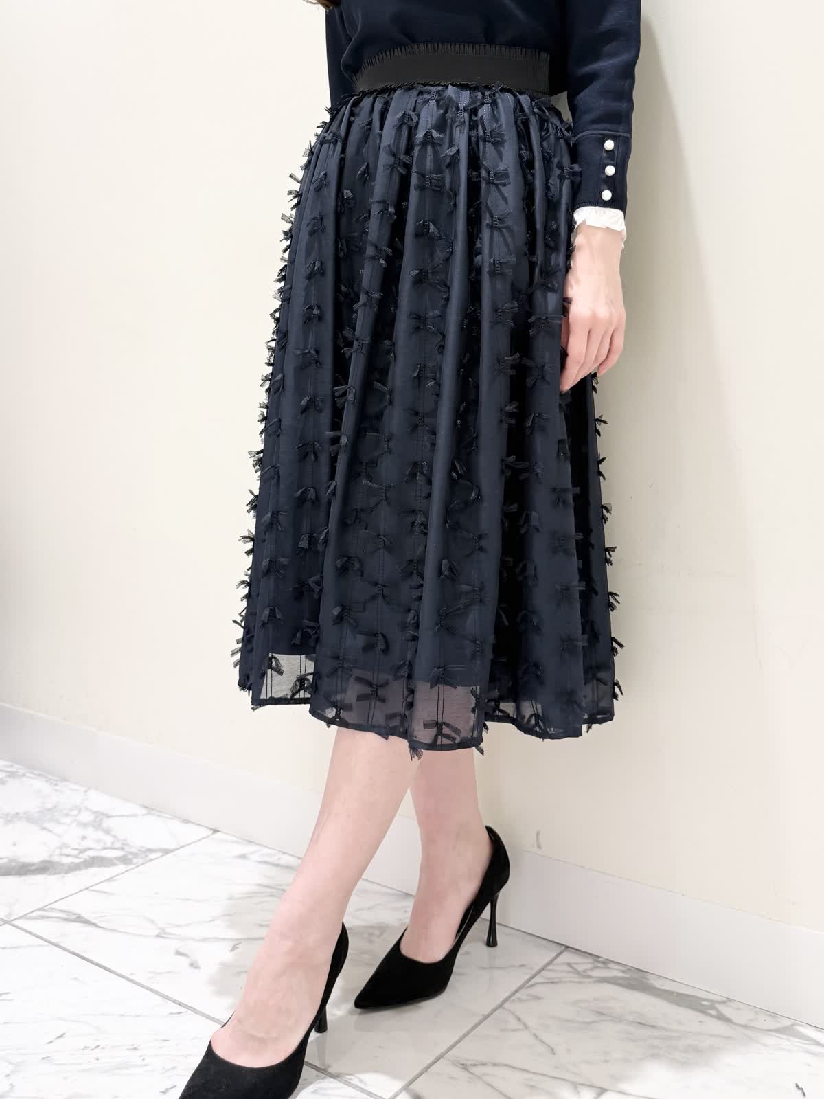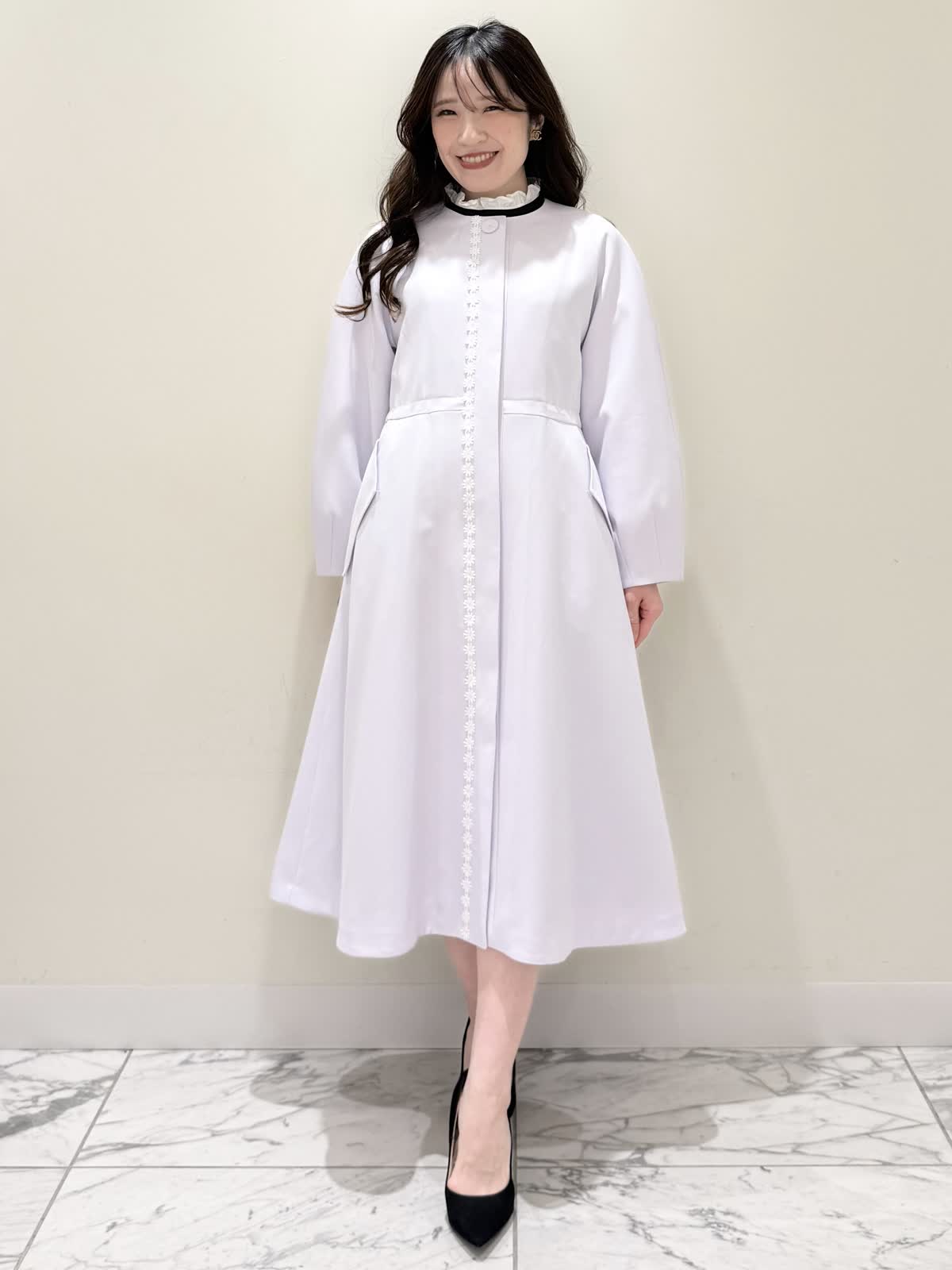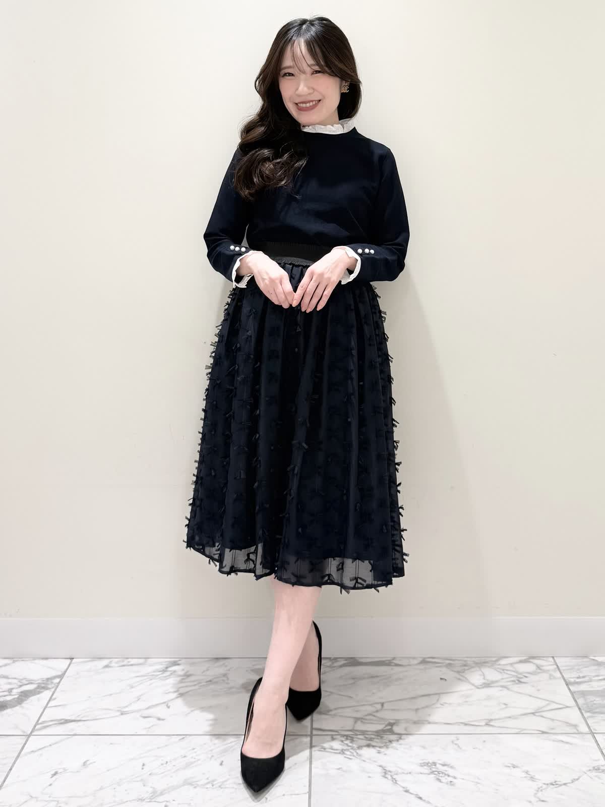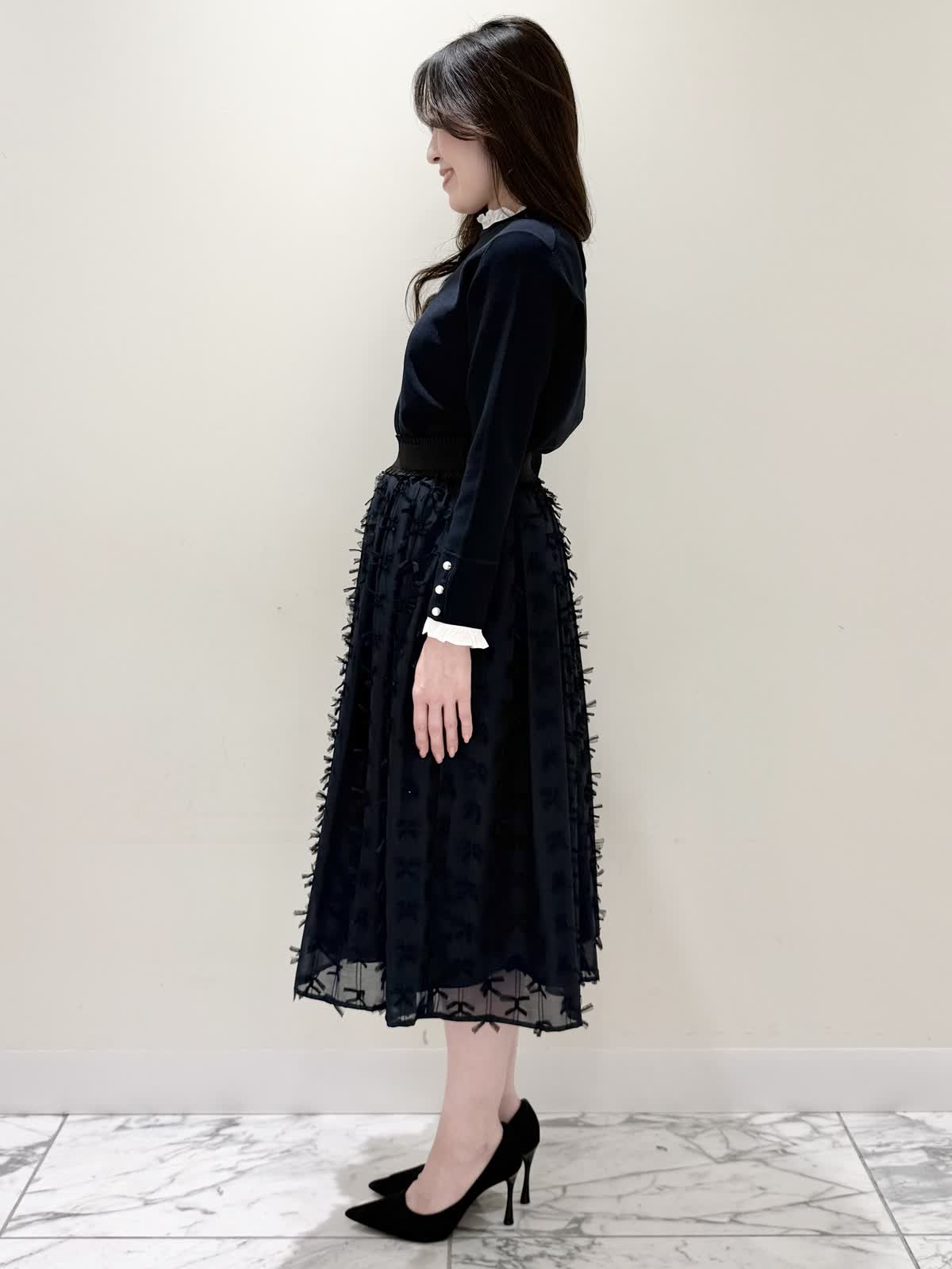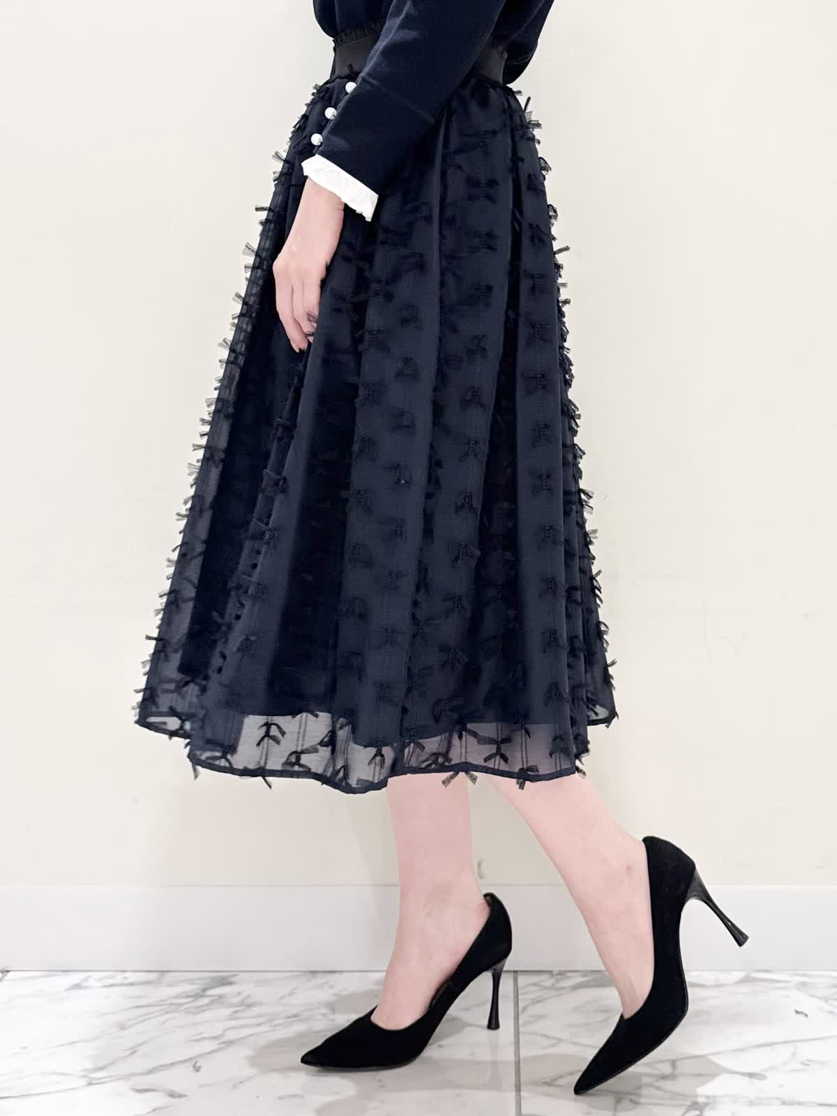 【着用サイズ/カラー】ニット:7号/ネイビー スカート:5号/ネイビー コート:7号/ラベンダー 暖かくなったらすぐ着られるおすすめコーディネート。ブラウスとのレイヤード風のニットは身頃はスポンディッシュでサラッとした着心地。裾がスリット入りでストンと落ちたシルエットなのでアウトでもバランスよく着られます。ネック周りは窮屈感なく、ブラウス生地のフリルがあたらないので着やすく、袖口と共に取り外し可能です。ジャケットのインナーにも映える1着です。合わせはリボンデザインが目を惹くふわっと軽く着られるスカート。ウエストはフリルデザインが可愛い柔らかいギャザーゴム。ゴムの所の伸び感はありますが、スカートとの縫い合わせの部分はゴムのみの所に比べると伸び感は少なめです。ただ、他のスカートよりはギャザーゴムが柔らかく、とっても履きやすいです。上下共いつものサイズで大丈夫です。羽織りはラベンダーカラーが綺麗なコート。ウエストが内側で絞りができるので絞るとフィット&フレアシルエット、絞らなくても綺麗に着られます。軽い生地で前を閉じてワンピース風に着たりしても可愛いです。いつものサイズで大丈夫です。