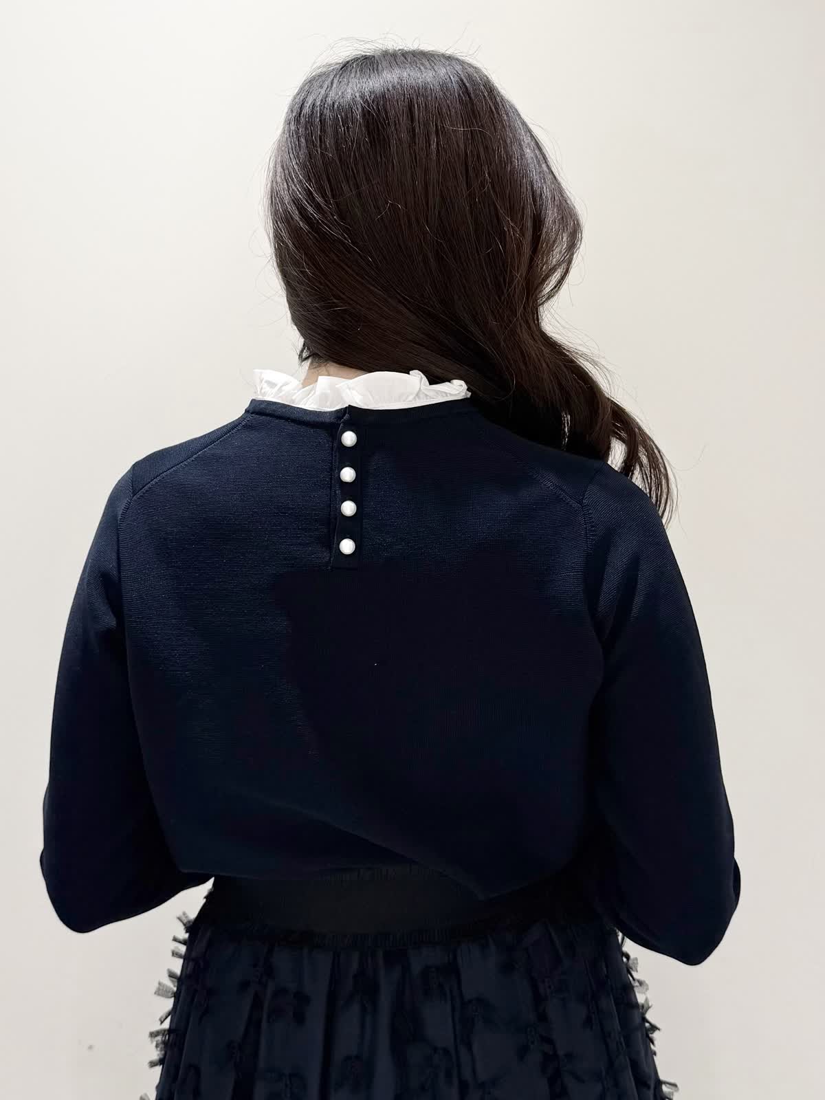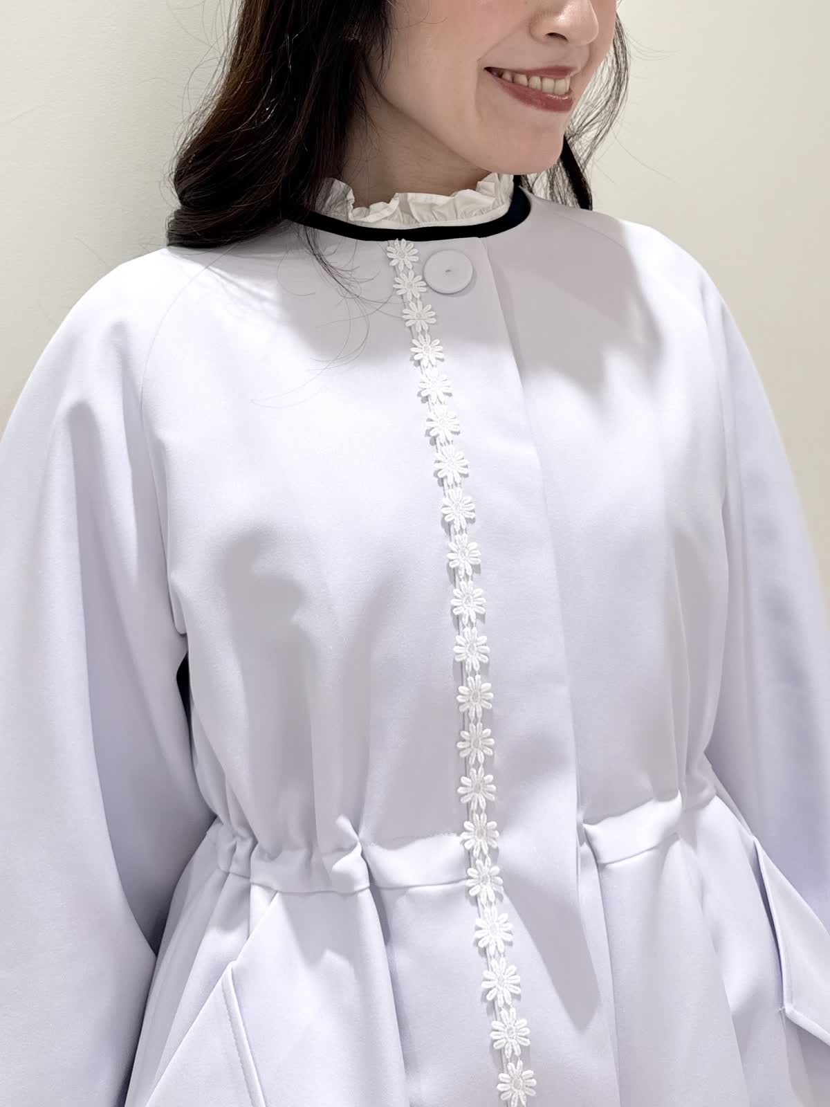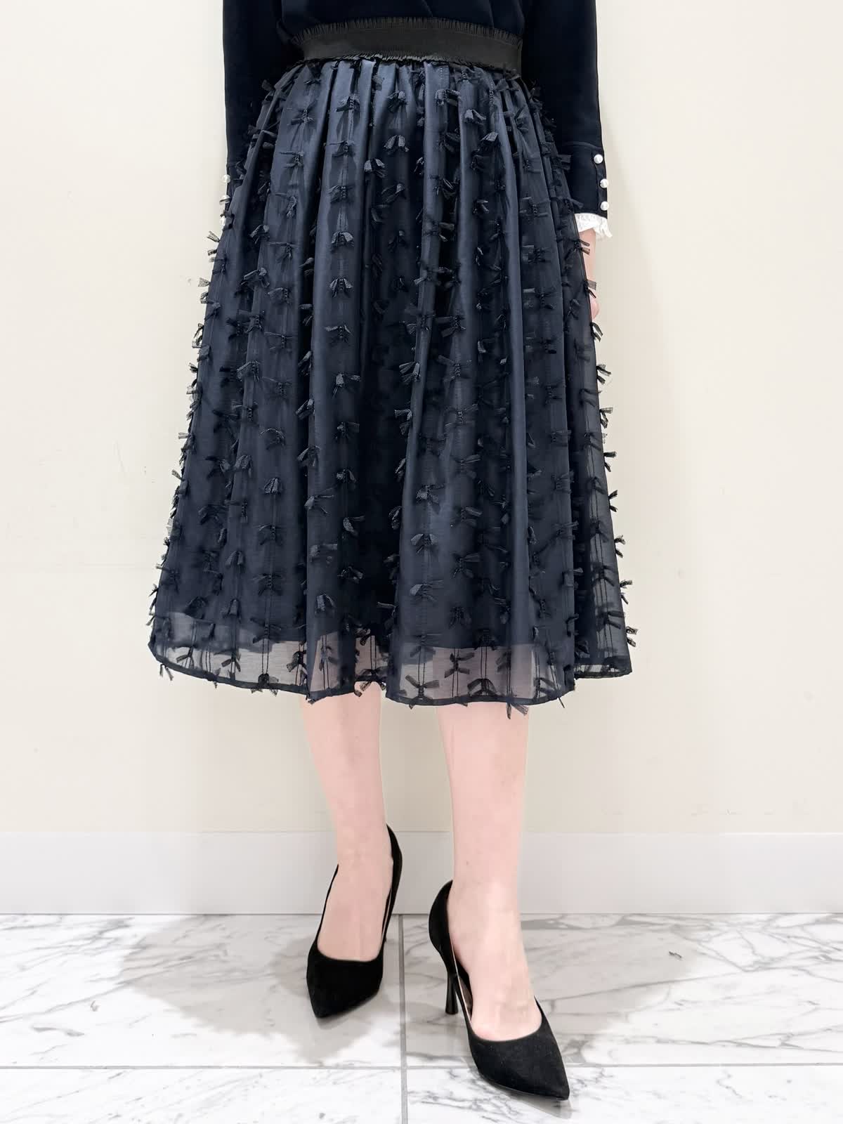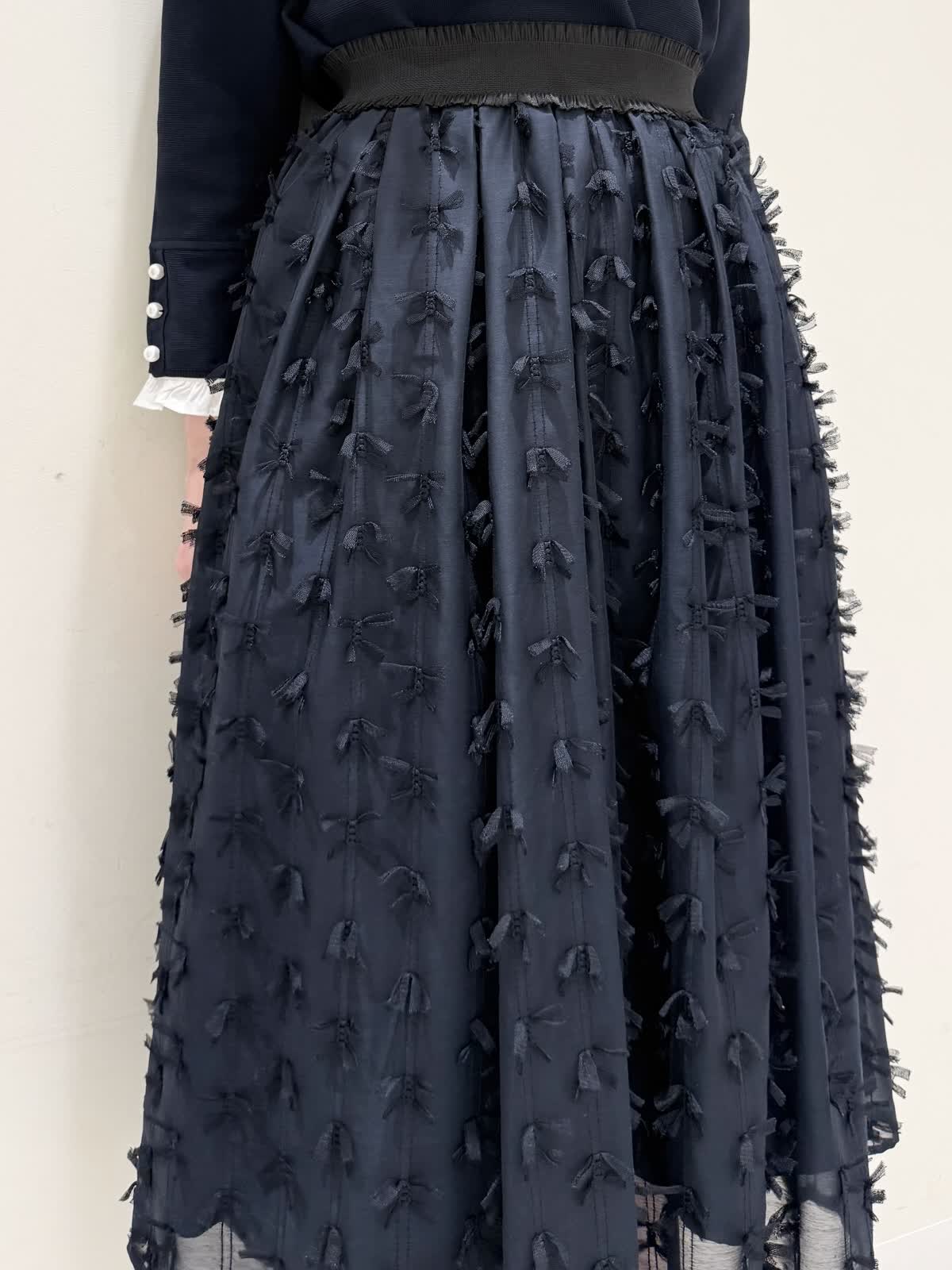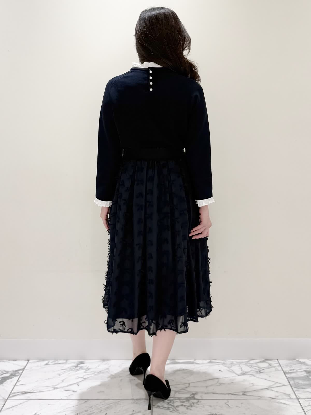 【着用サイズ/カラー】ニット:7号/ネイビー スカート:5号/ネイビー コート:7号/ラベンダー 暖かくなったらすぐ着られるおすすめコーディネート。ブラウスとのレイヤード風のニットは身頃はスポンディッシュでサラッとした着心地。裾がスリット入りでストンと落ちたシルエットなのでアウトでもバランスよく着られます。ネック周りは窮屈感なく、ブラウス生地のフリルがあたらないので着やすく、袖口と共に取り外し可能です。ジャケットのインナーにも映える1着です。合わせはリボンデザインが目を惹くふわっと軽く着られるスカート。ウエストはフリルデザインが可愛い柔らかいギャザーゴム。ゴムの所の伸び感はありますが、スカートとの縫い合わせの部分はゴムのみの所に比べると伸び感は少なめです。ただ、他のスカートよりはギャザーゴムが柔らかく、とっても履きやすいです。上下共いつものサイズで大丈夫です。羽織りはラベンダーカラーが綺麗なコート。ウエストが内側で絞りができるので絞るとフィット&フレアシルエット、絞らなくても綺麗に着られます。軽い生地で前を閉じてワンピース風に着たりしても可愛いです。いつものサイズで大丈夫です。