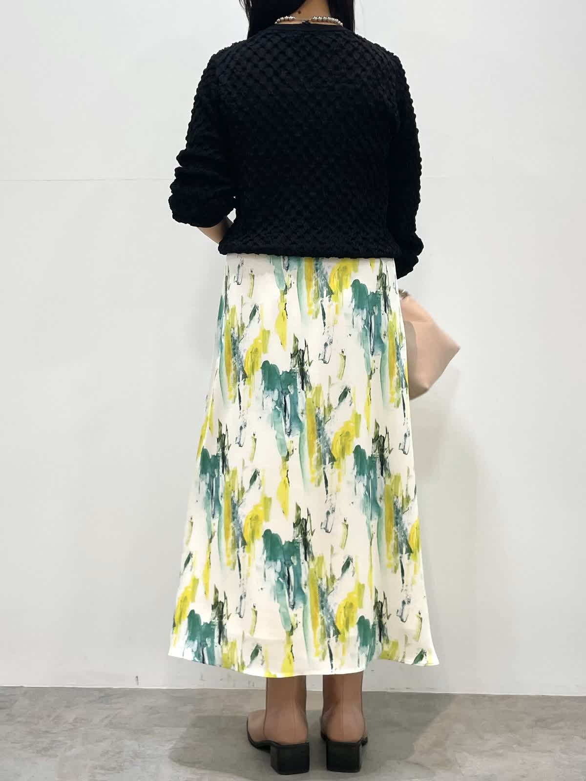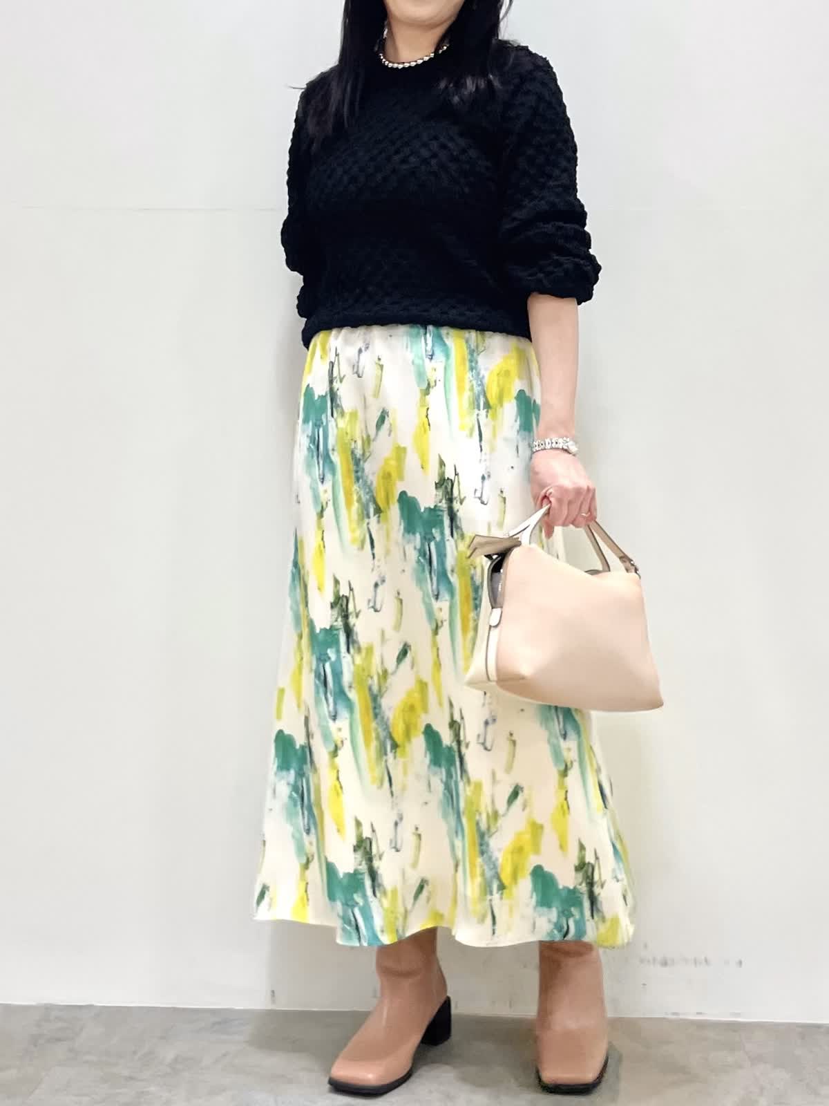 【着用サイズ】9号 【着用カラー】ニット:ブラック スカート:ペパーミント 春のお出かけコーデ。ニットはジャガード編みでポコポコとした表面感がポイント。さりげないパフスリーブが女性らしいです。春らしいカラーのスカートは落ち感のあるスッキリとしたシルエット。シワになりにくい素材でお洗濯可能も嬉しいポイントです。