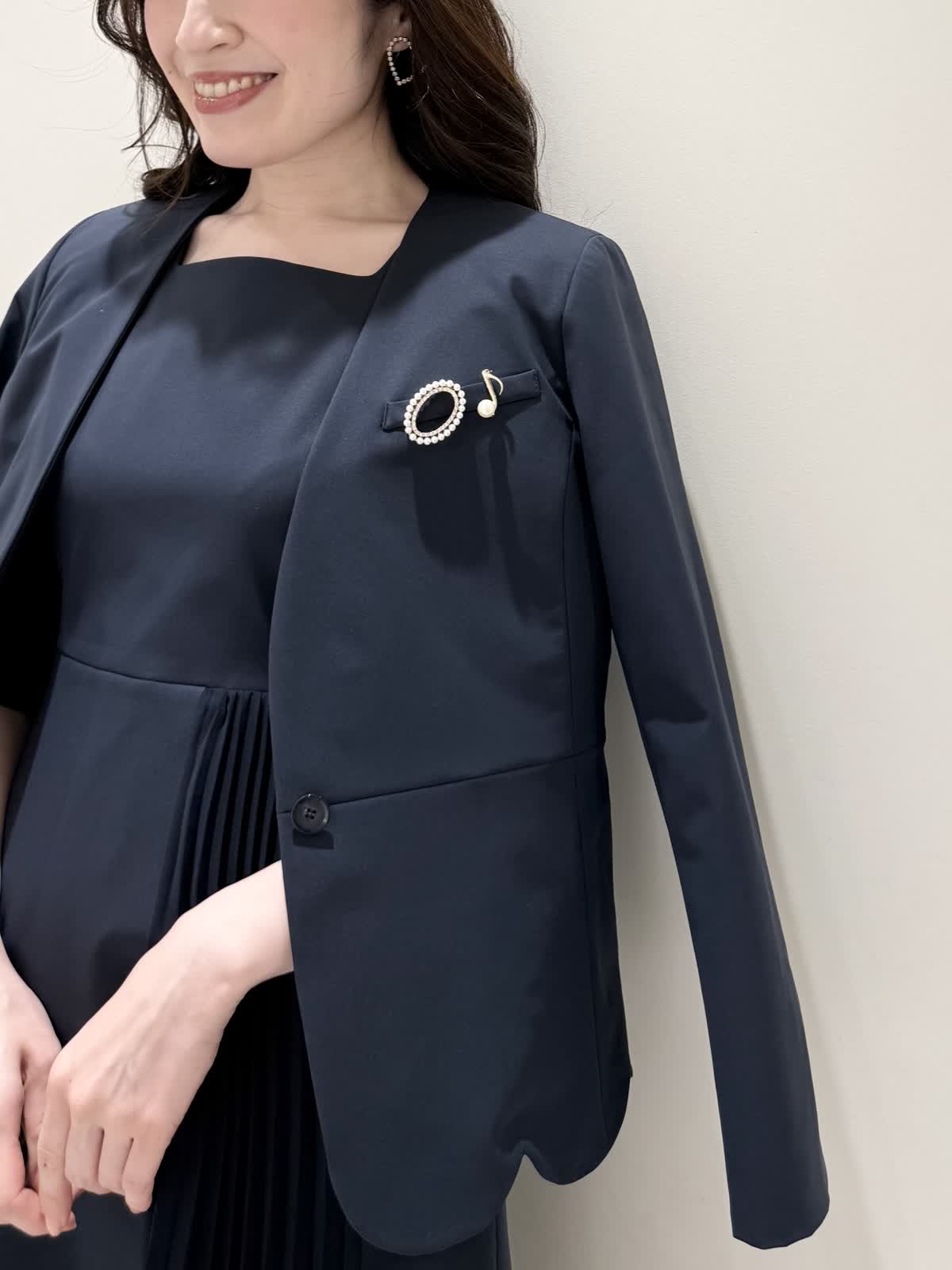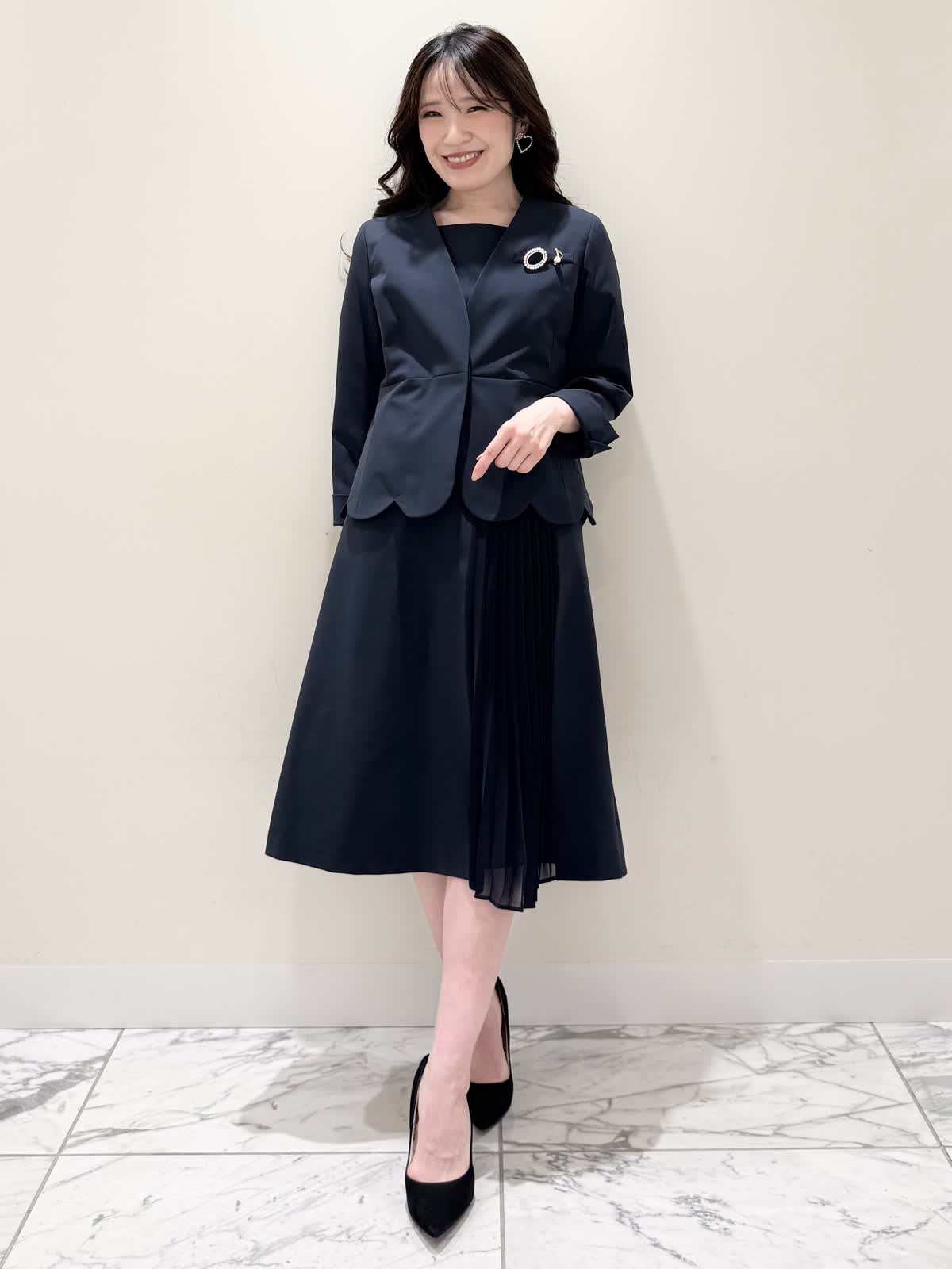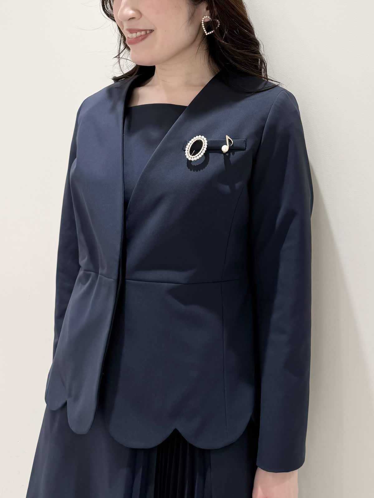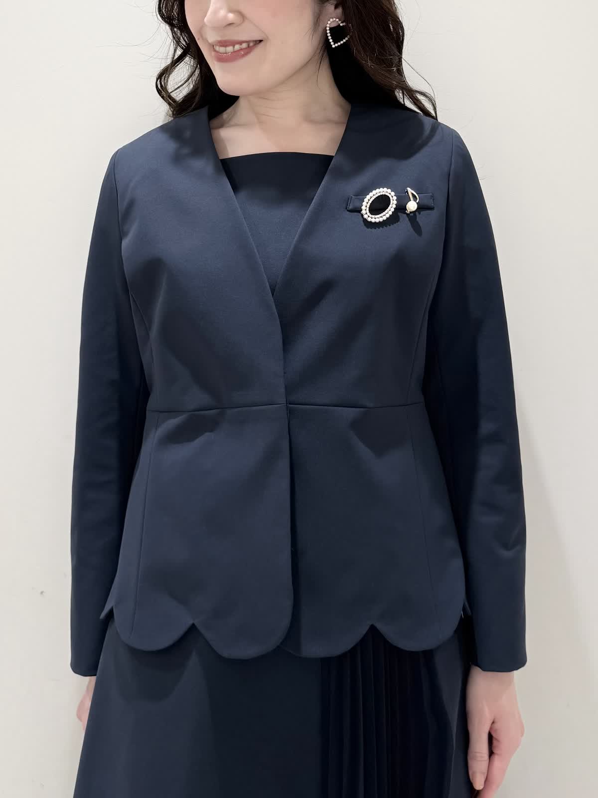 【着用サイズ/カラー】ジャケット:7号/ネイビー ワンピース:5号/ネイビー 『品よく』ハレ服にピッタリなコーディネート。ジャケット&ワンピースのセットで着ると入園?入学、卒園?卒業などのセレモニー、行事毎に着ていただきたい一品。今までにない裾のスカラップがポイントのジャケットはストレッチ性もありアームホールはゆとりがあり着心地◎普段使いもしやすいように着丈はパンツにも合うようになってます。ワンピースは5分袖丈に高め切り替えからのAラインシルエット。プリーツのデザインが歩くたびに品よく、1枚で着映えするワンピースです。どちらもいつものサイズで大丈夫です。ネイビーカラーの1セットはお持ちいただくと安心です。
