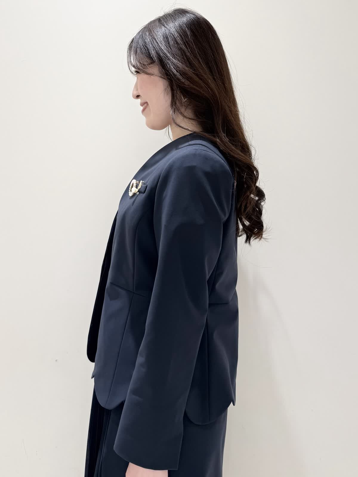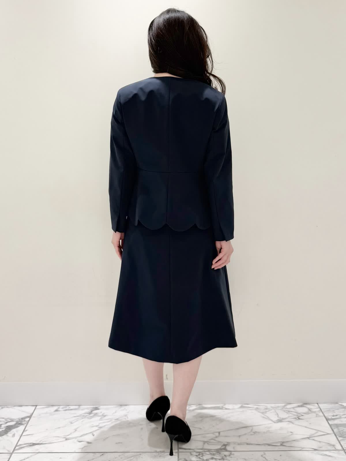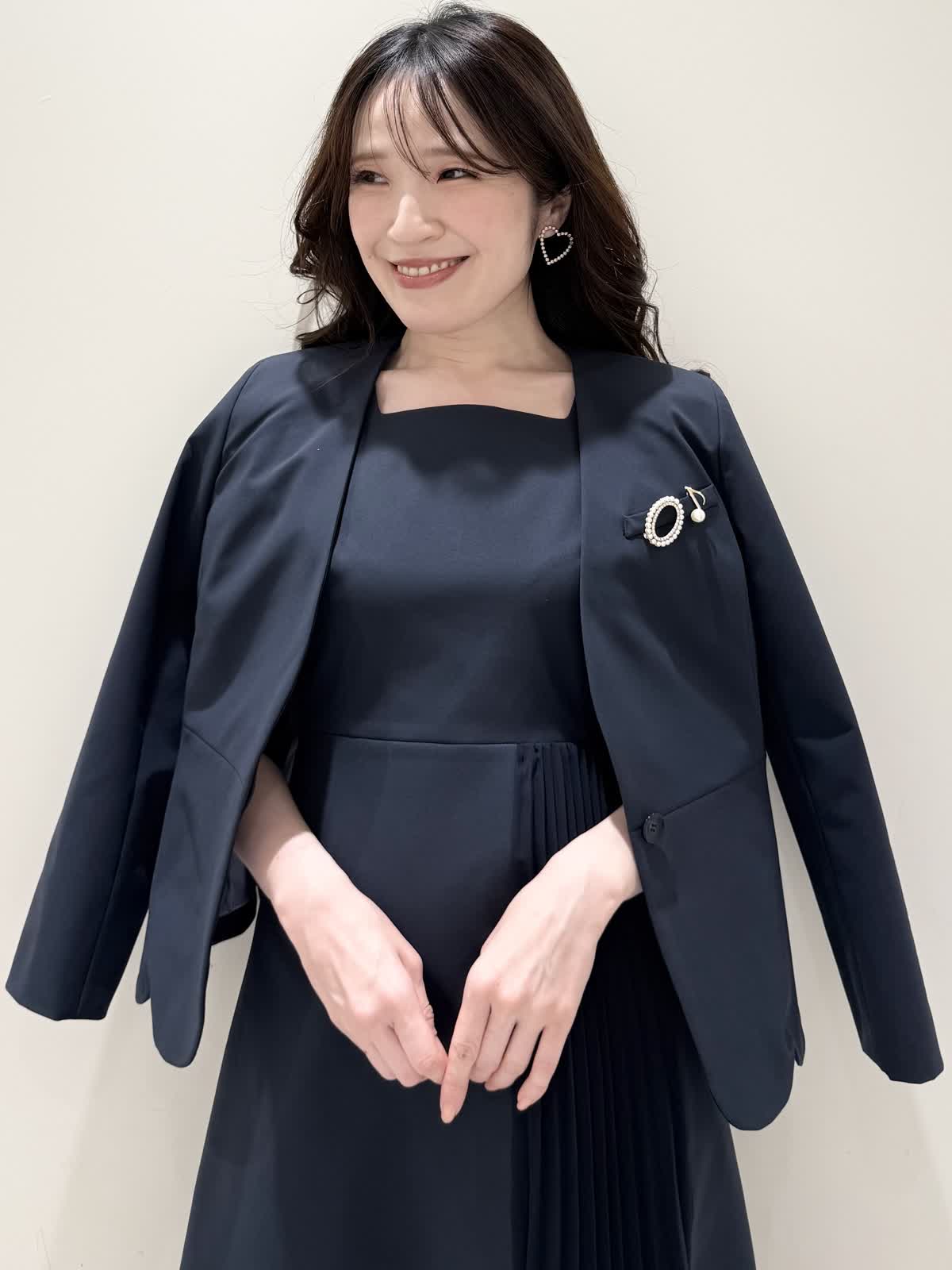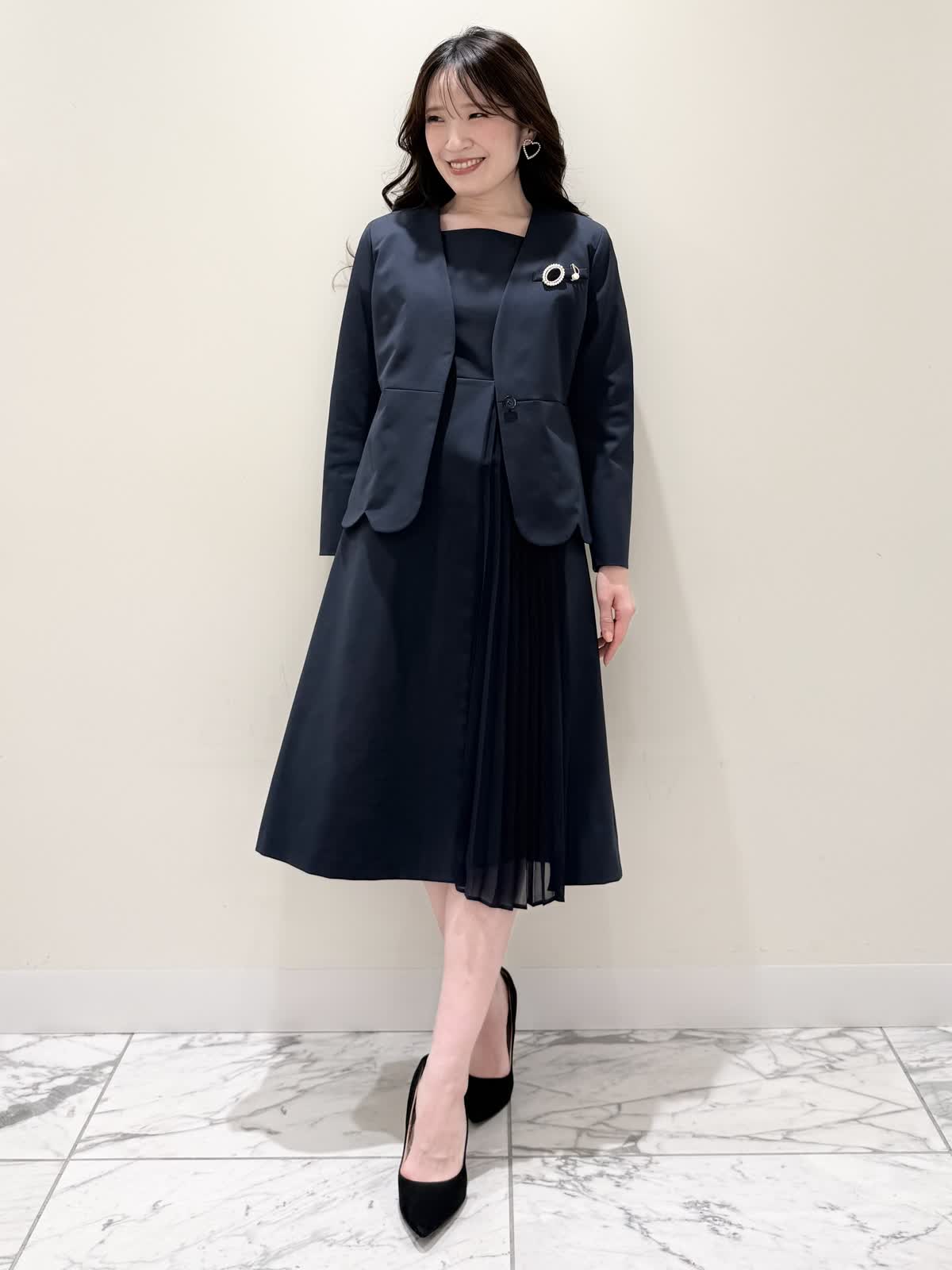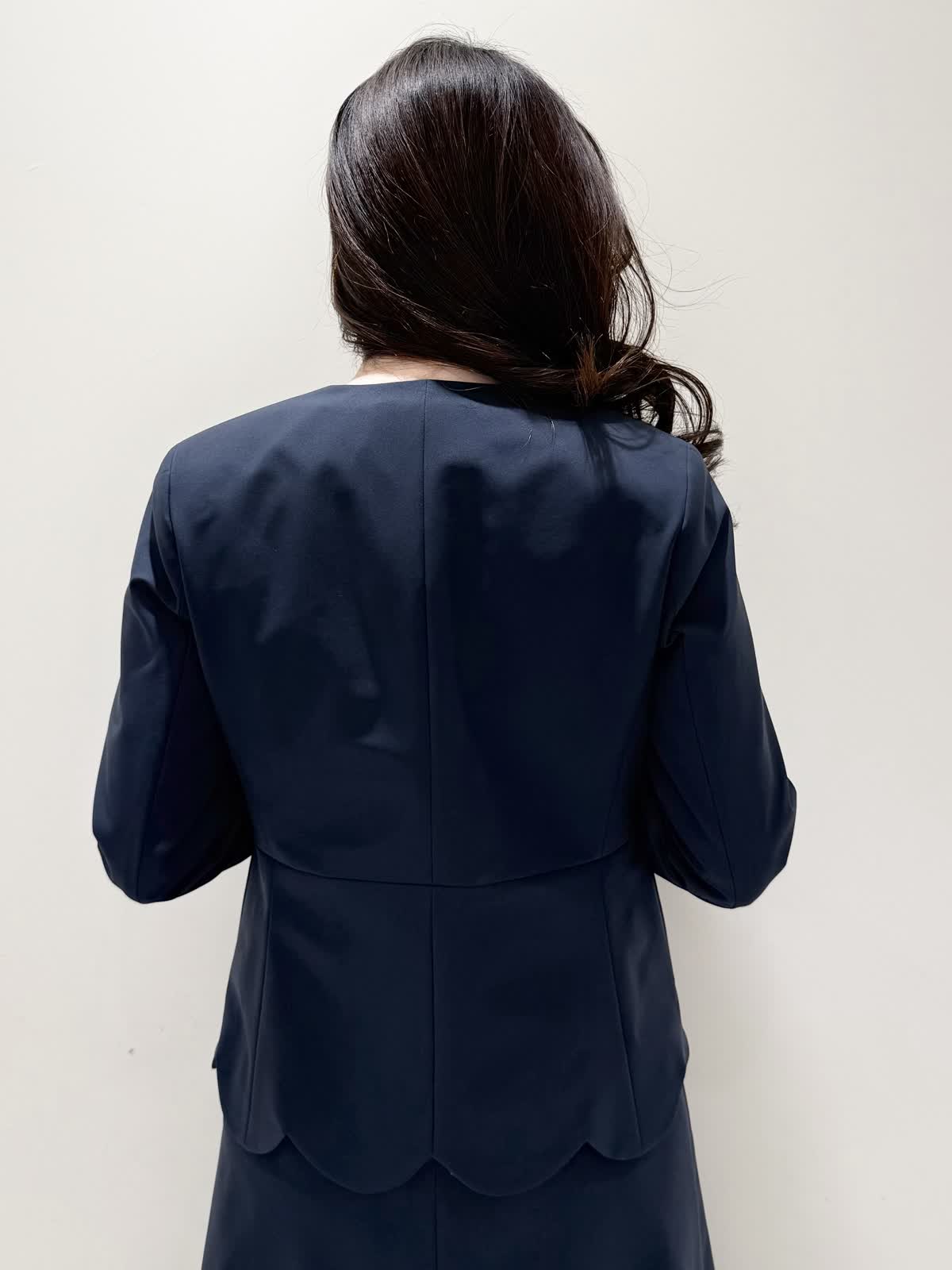 【着用サイズ/カラー】ジャケット:7号/ネイビー ワンピース:5号/ネイビー 『品よく』ハレ服にピッタリなコーディネート。ジャケット&ワンピースのセットで着ると入園?入学、卒園?卒業などのセレモニー、行事毎に着ていただきたい一品。今までにない裾のスカラップがポイントのジャケットはストレッチ性もありアームホールはゆとりがあり着心地◎普段使いもしやすいように着丈はパンツにも合うようになってます。ワンピースは5分袖丈に高め切り替えからのAラインシルエット。プリーツのデザインが歩くたびに品よく、1枚で着映えするワンピースです。どちらもいつものサイズで大丈夫です。ネイビーカラーの1セットはお持ちいただくと安心です。