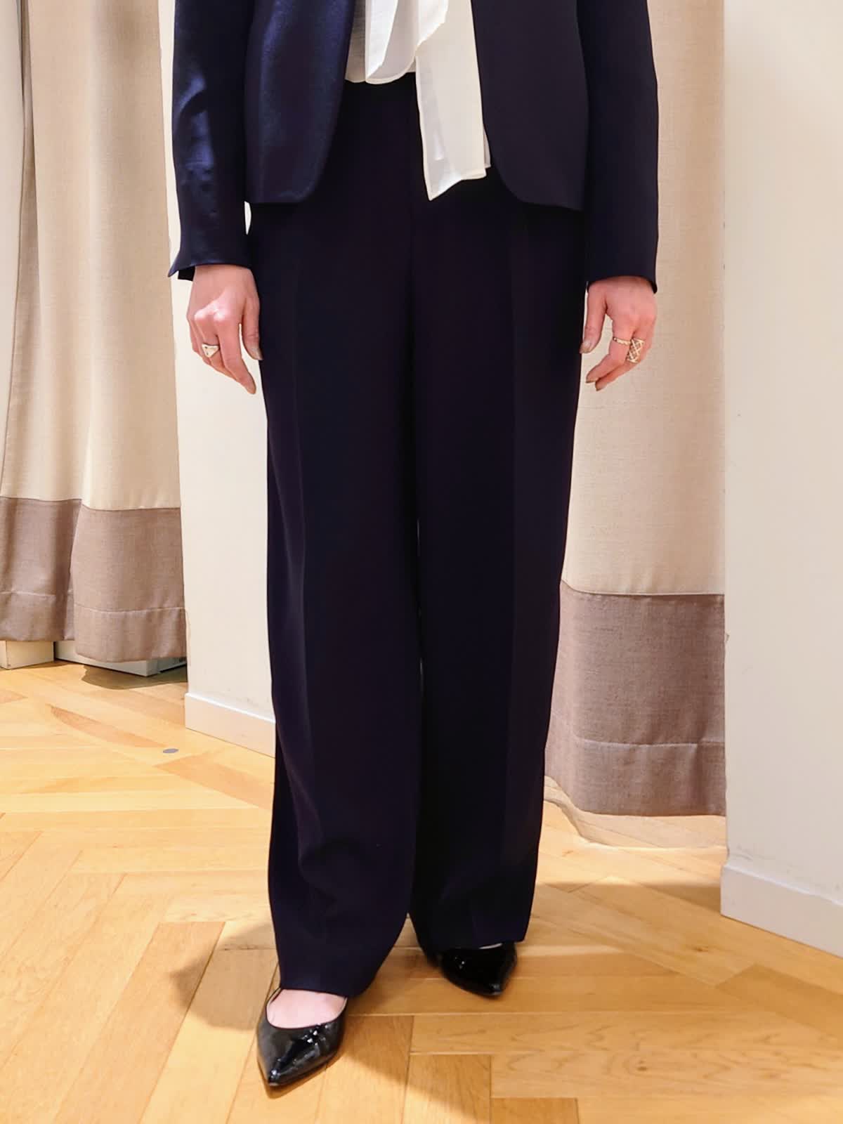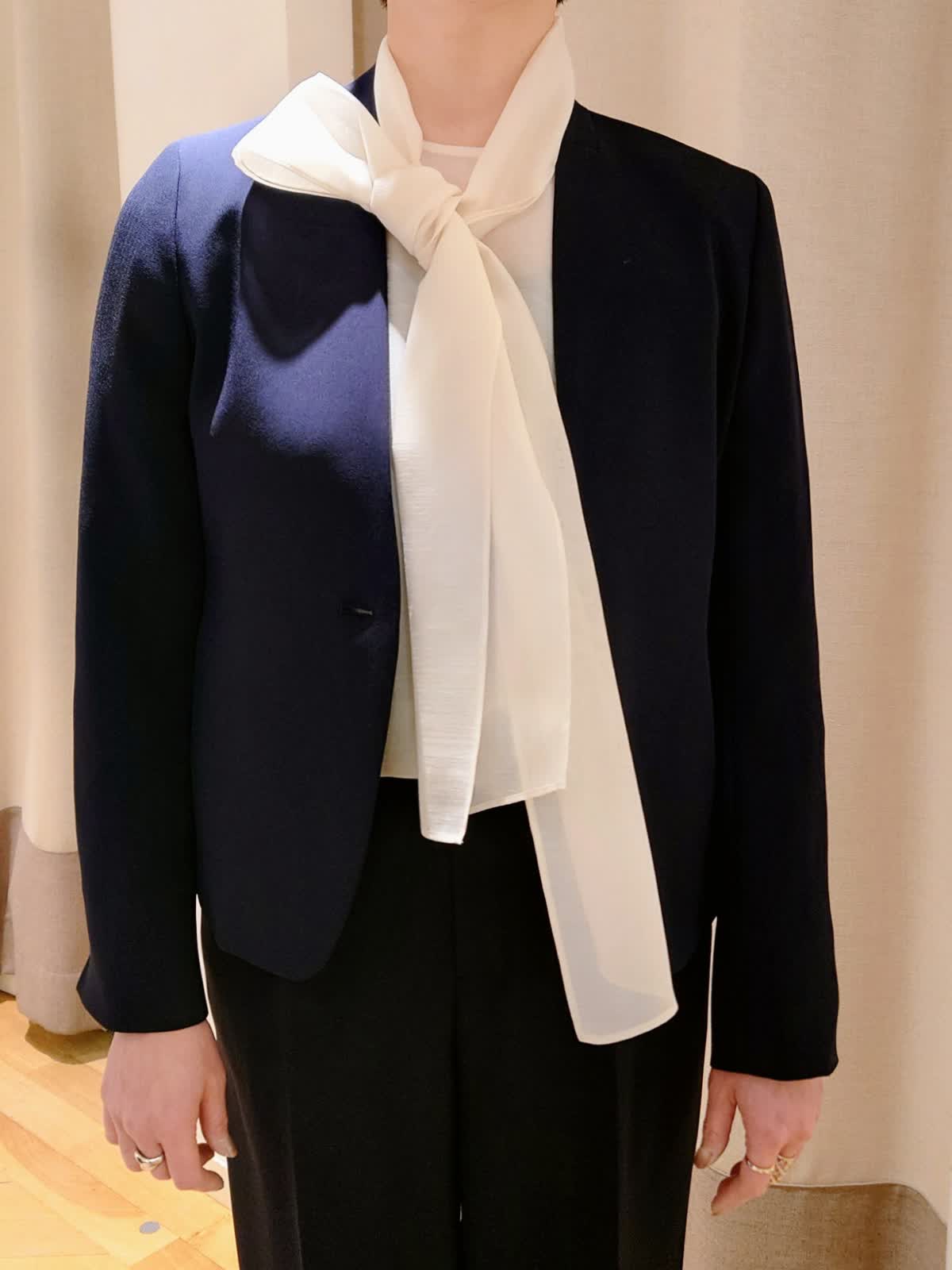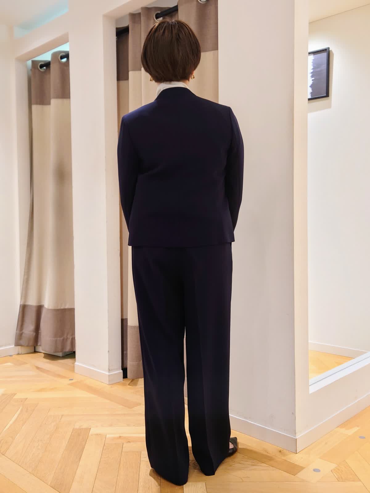 【着用サイズ】ジャケット:9号 ブラウス:9号 パンツ:9号【着用カラー】ジャケット:ネイビー ブラウス:アイボリー パンツ:ネイビー オールシーズン対応仕様のジャケットとパンツのセットアップに、華やかな印象のブラウスを合わせることでセレモニースタイルに。インナーにリブニットやシンプルなブラウスを合わせるとお仕事でも着回せるアイテムです。