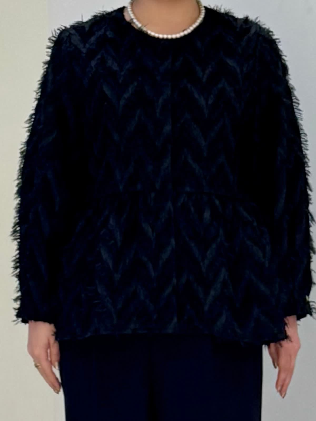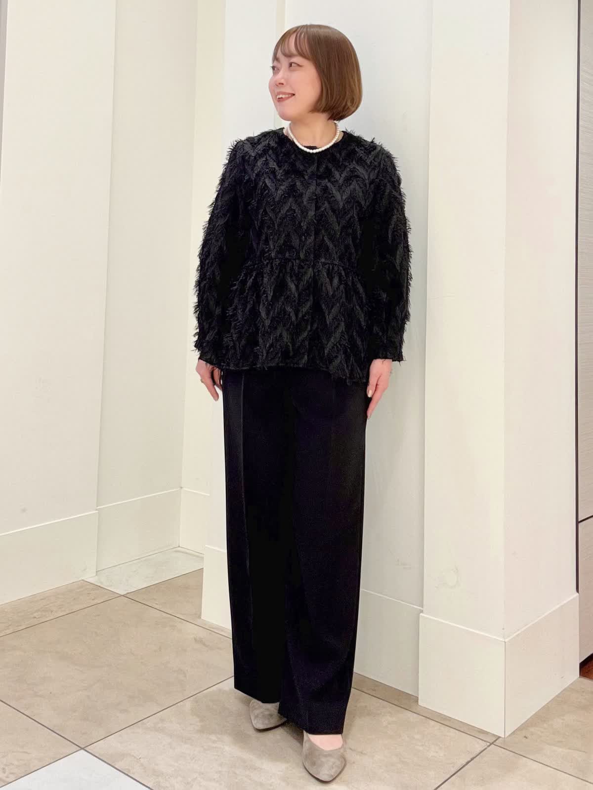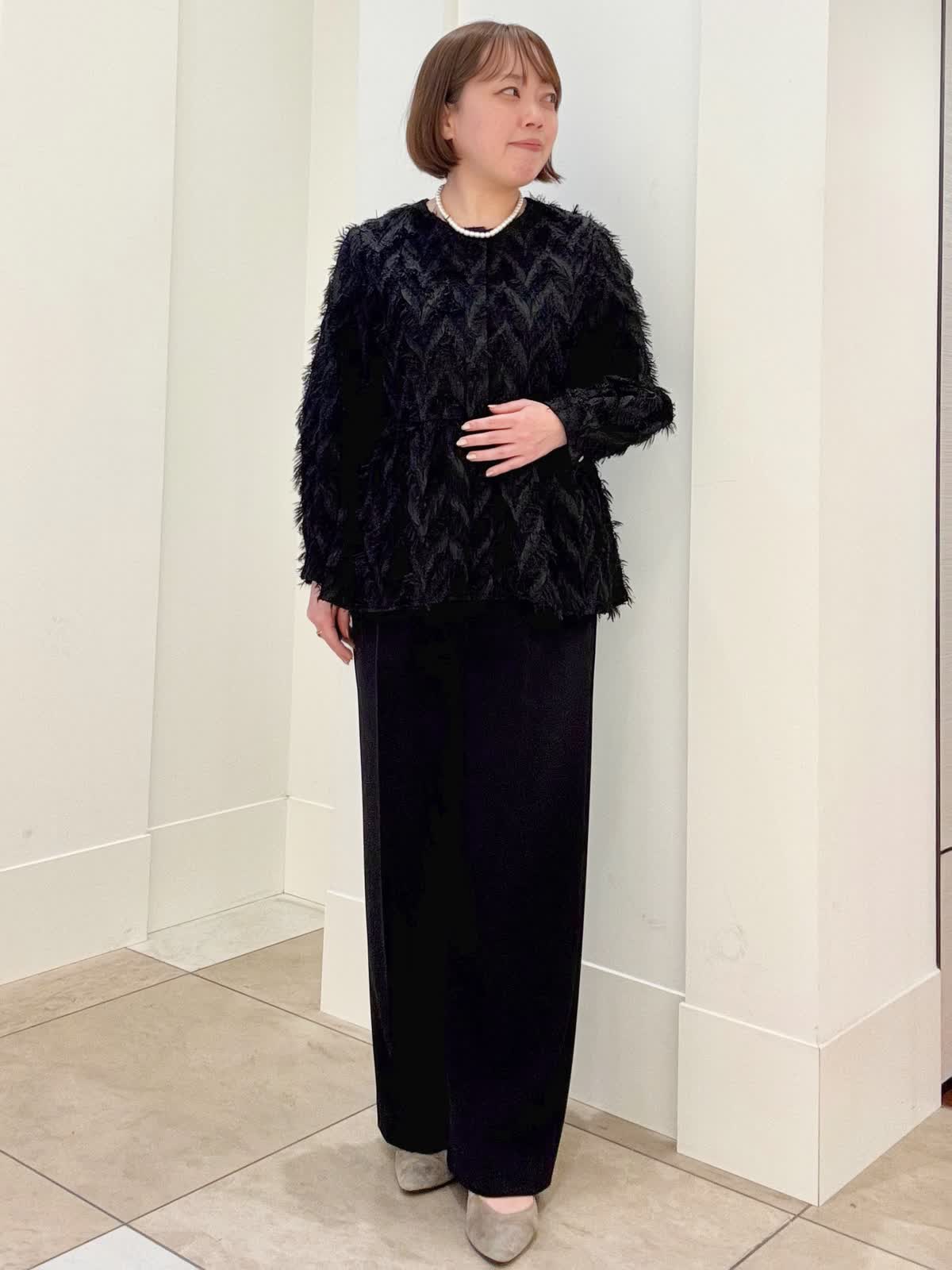ジャガード生地が華やかに見せてくれるブラウス。ペフラム切替で腰回りも上品にカバーします。前開きスタイルなので着脱しやすいです。