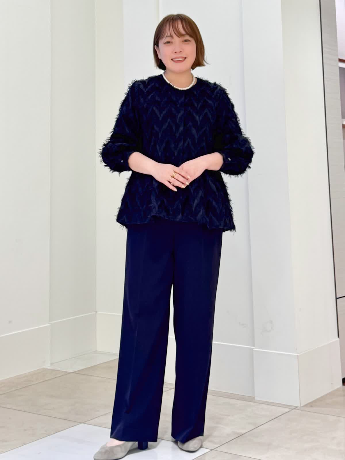 パンツは落ち感のある素材でシルエットが綺麗でふ。程よくストレッチ性がありシワになりにくく、ウエスト後ゴム仕様でノンストレス。