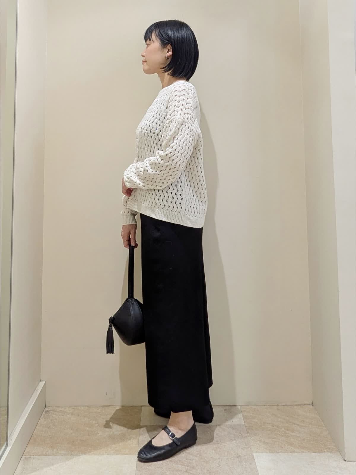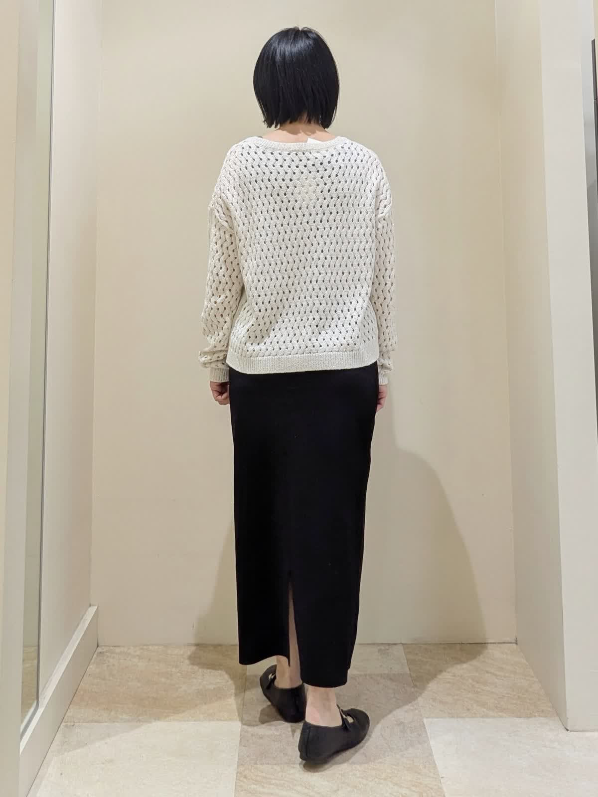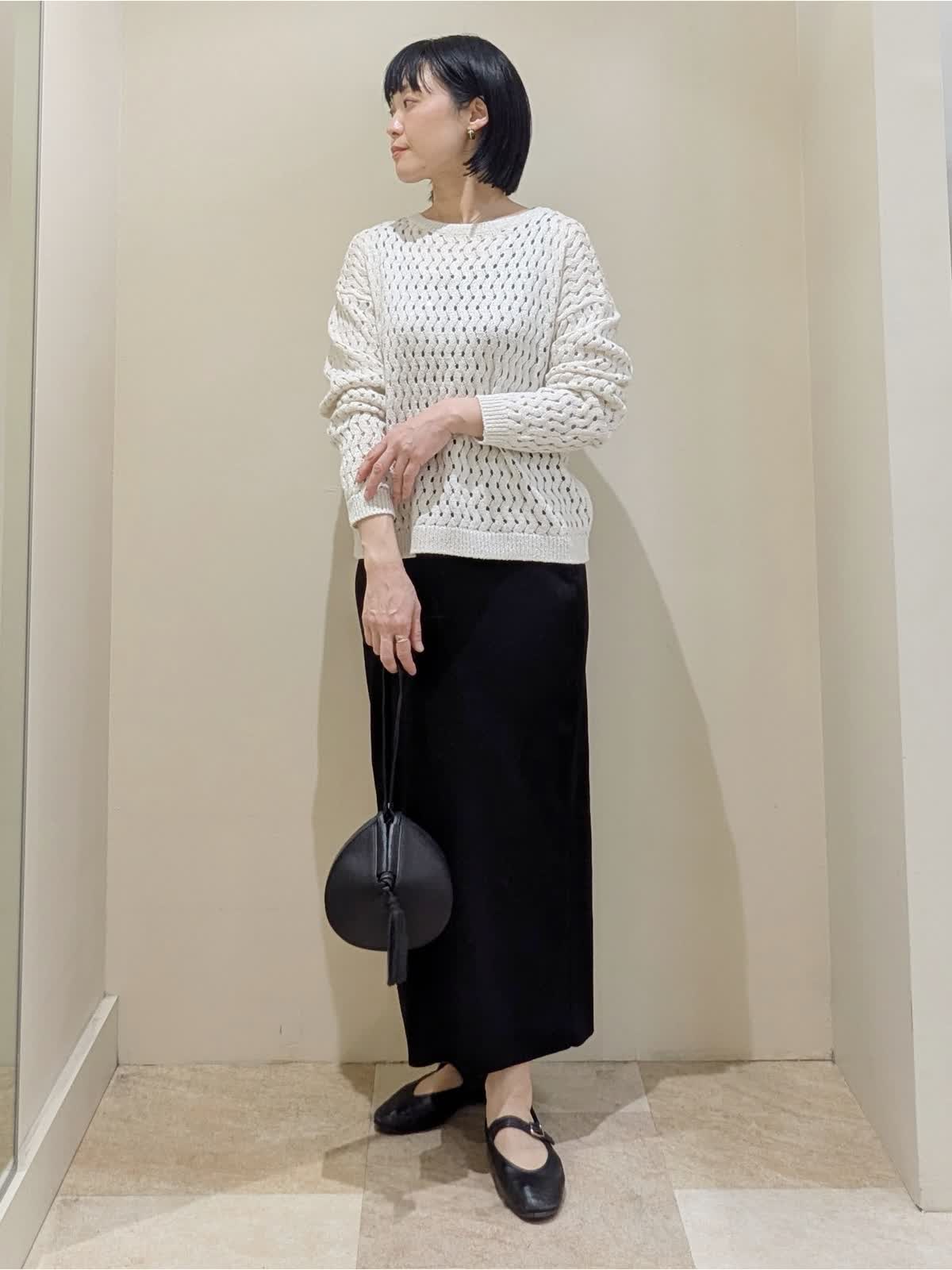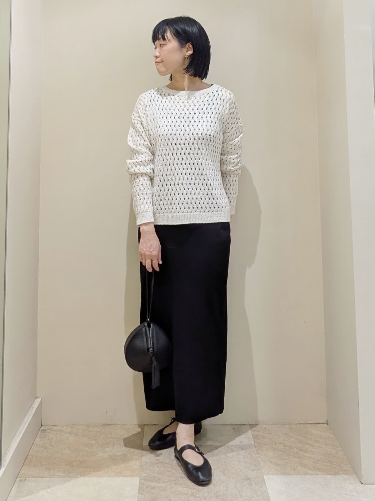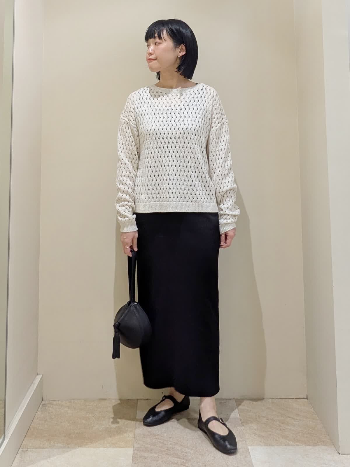 【着用サイズ】全てフリー 【着用カラー】ニット/オフホワイト、スカート/ブラック、バッグ/ブラック 春らしい透かしのニット。モノトーンで着てみると、また違った表情を見せてくれます。ニットスカートは軽さ、清涼感がありながら、安心感のある生地感で着心地抜群です!