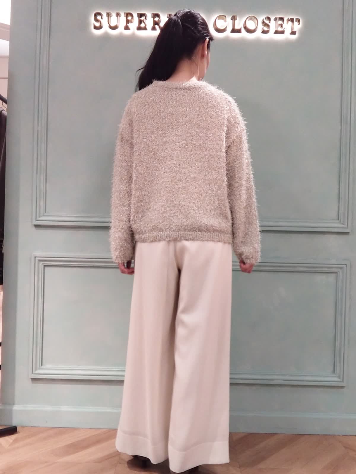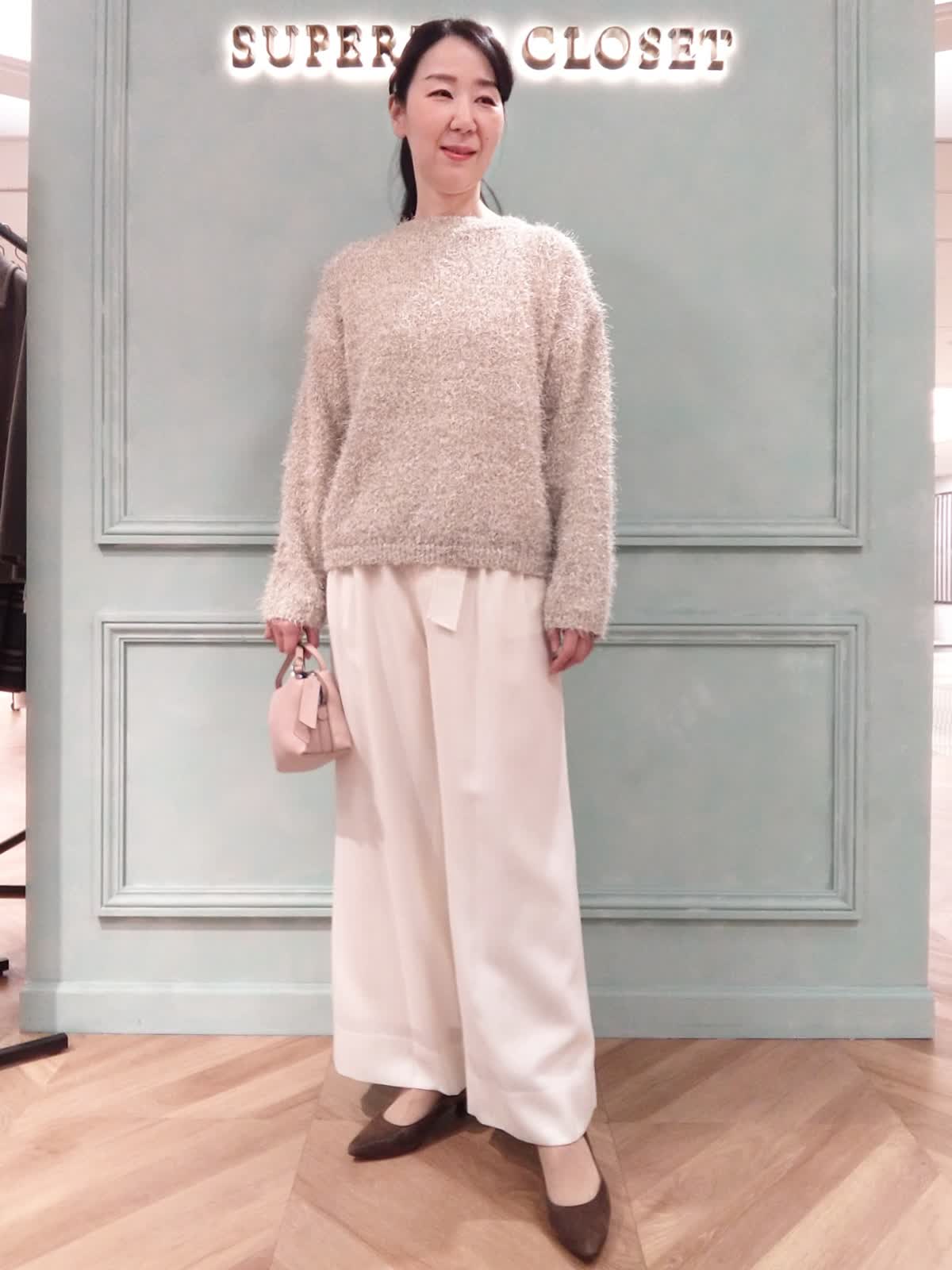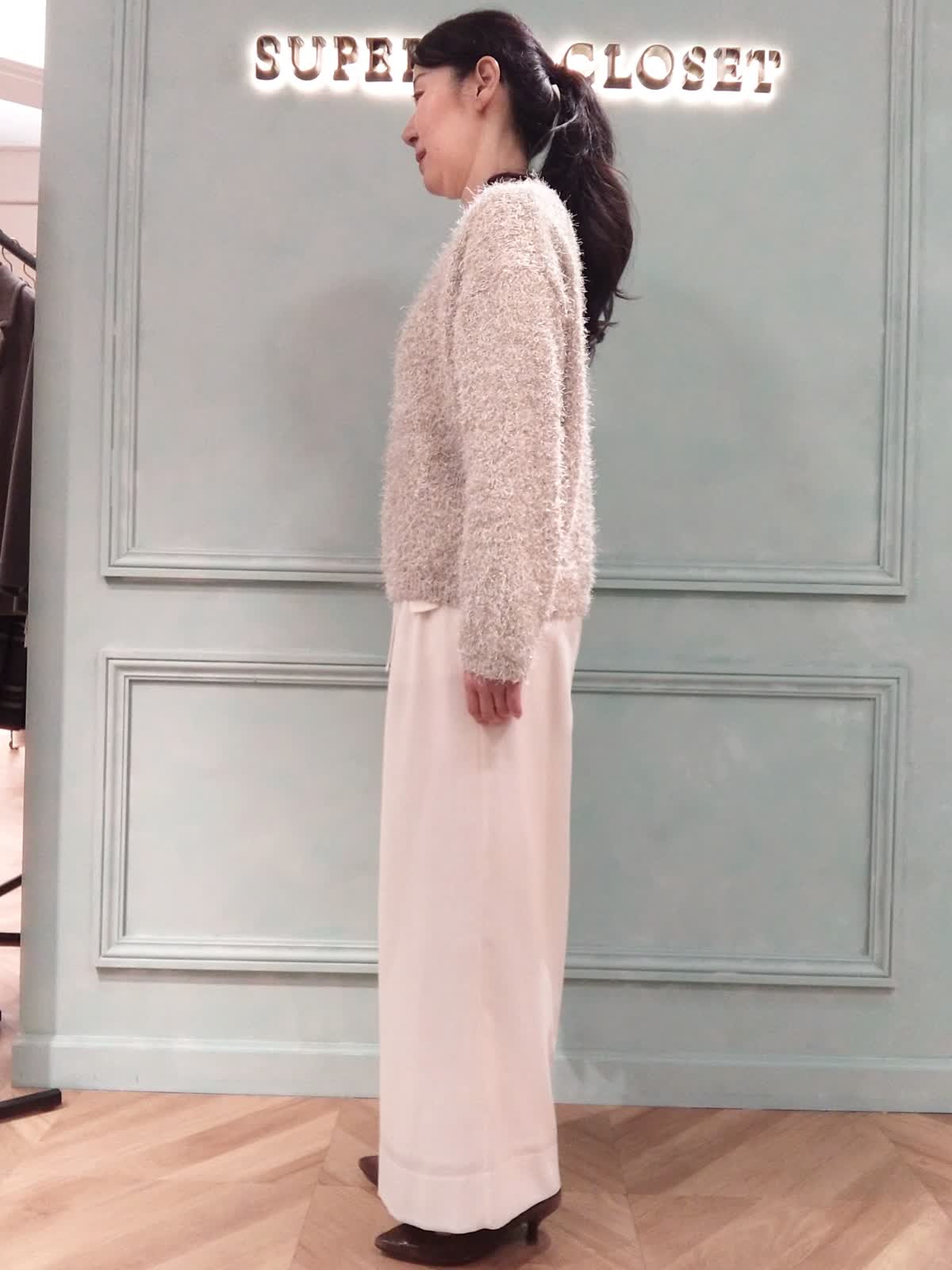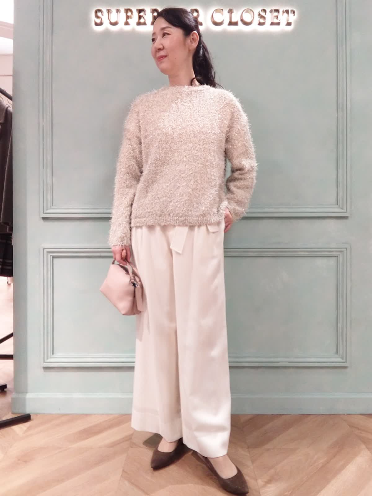 【着用サイズ】ニット:フリー、パンツ:9号 【着用カラー】ニット:オフホワイト、パンツ:オフホワイト おでかけスタイル。ラメ感のあるシャギーニットはポリエステル素材。季節の変わり目に快適に着られて華やかな印象に!パンツはライトな素材のポリエステルウールの混紡。ワイドシルエットがエレガントで優雅な印象になり、お出かけにぴったりのアイテムです。ウエストは後ろゴムでラクな履き心地です。