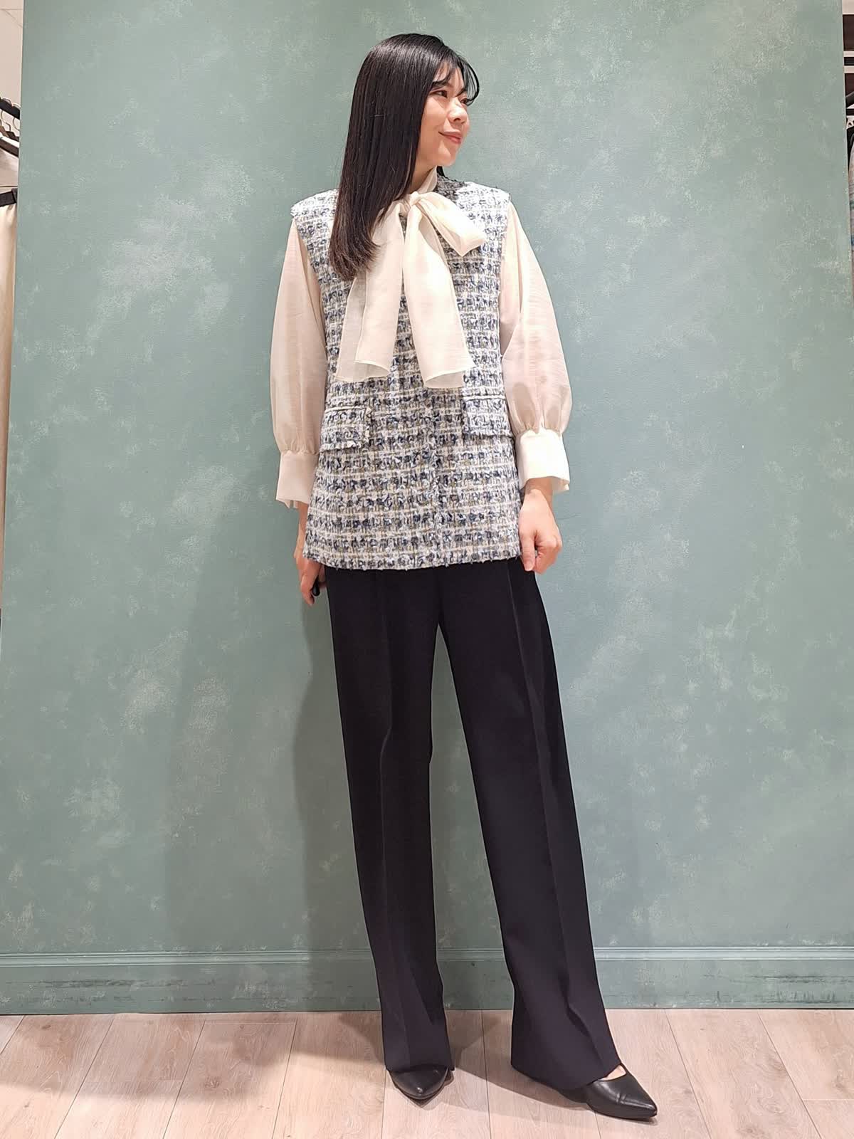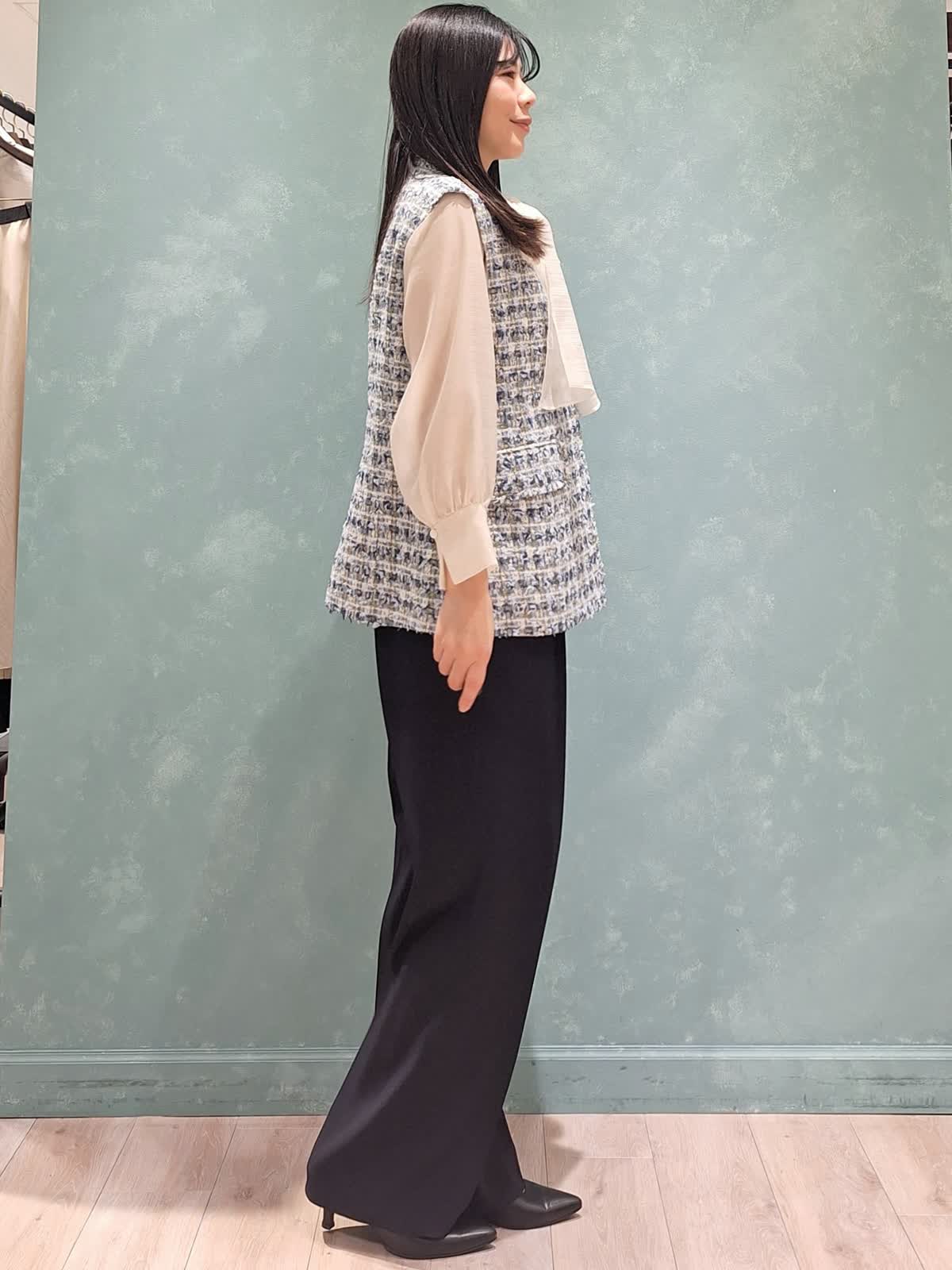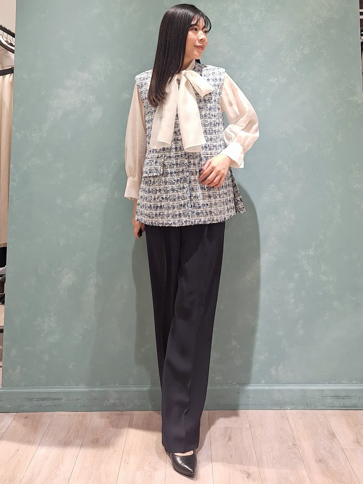 【着用サイズ、カラー】ジレ:7号、サックス ブラウス:7号、アイボリー パンツ:7号、ネイビー、ブラック お洒落を楽しむセレモニースタイル。オンオフ兼用で着回せるINEDのツィードジレ。華やかさのある明るいカラーでお祝いの日を彩れます。インナーはボリュームリボンが作れるシアーボウタイブラウス。ボウタイは取り外し可能なので、シーンに合わせた着こなしをしていただけます。ボトムはジョーゼット素材のワンタックパンツ。ゴム仕様のバックウエスト、ゆったりめのデザインで楽な着心地です。ボトムはネイビーでシャープにコーディネートしました。ぜひチェックして下さいね!