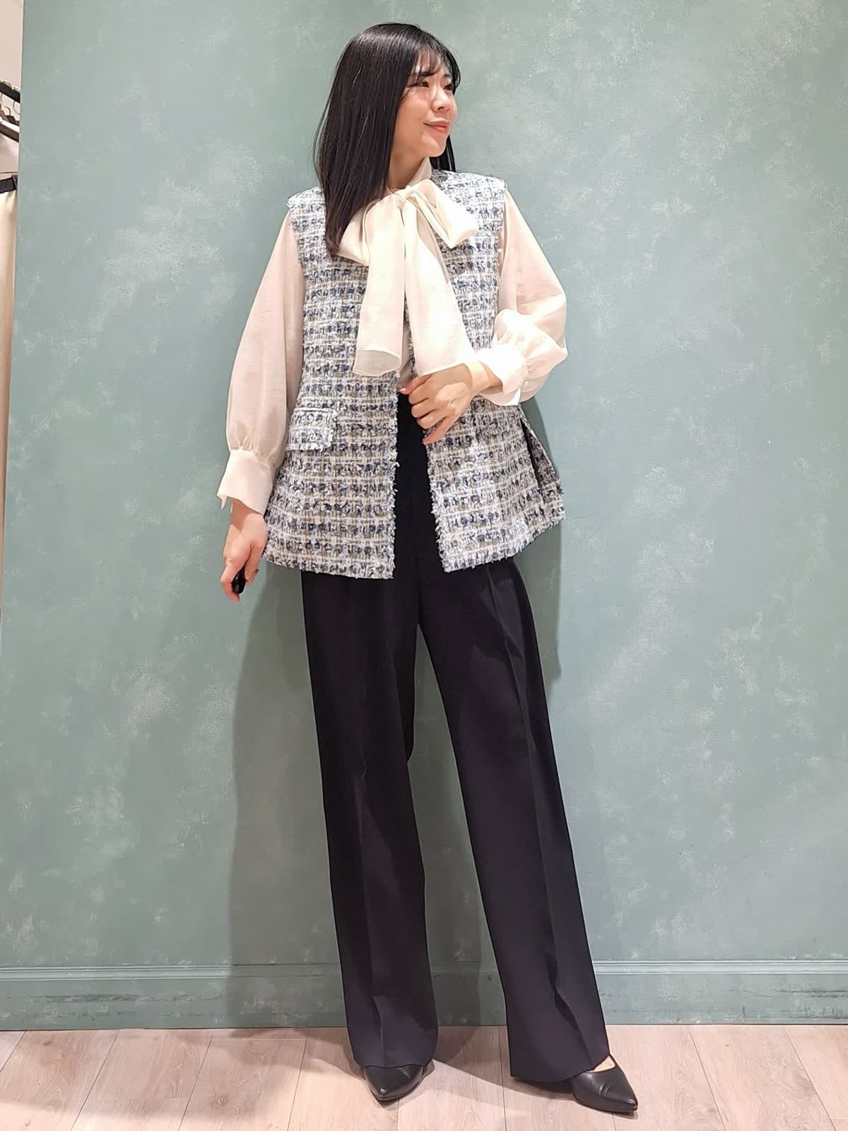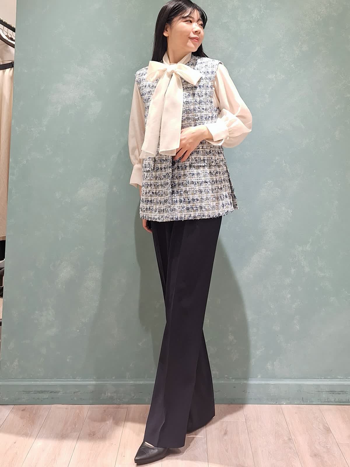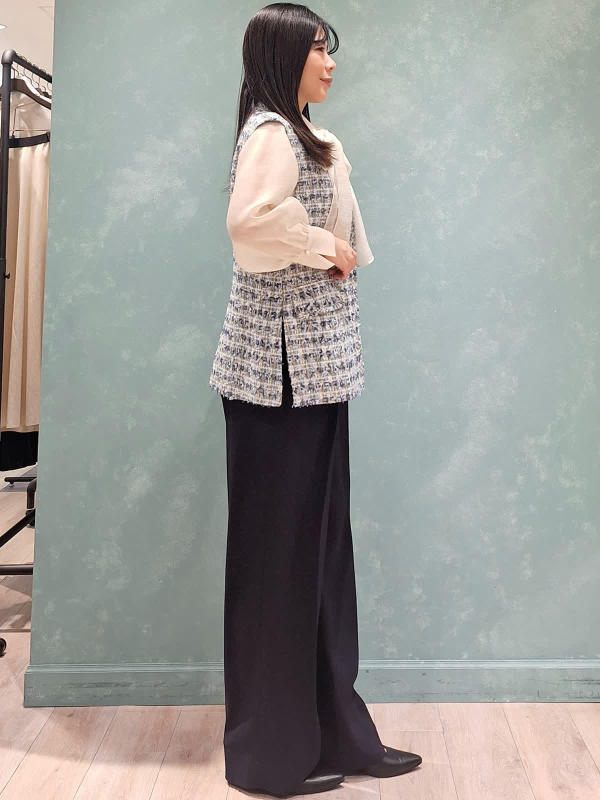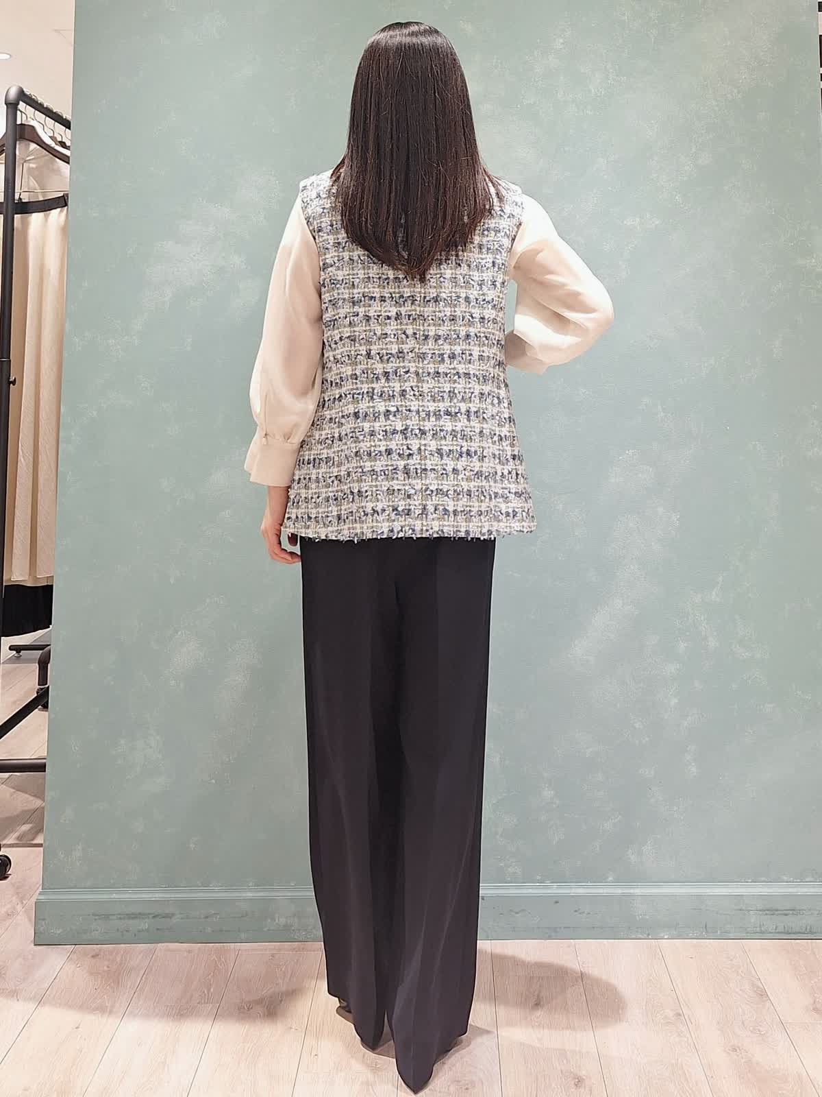 【着用サイズ、カラー】ジレ:7号、サックス ブラウス:7号、アイボリー パンツ:7号、ネイビー、ブラック お洒落を楽しむセレモニースタイル。オンオフ兼用で着回せるINEDのツィードジレ。華やかさのある明るいカラーでお祝いの日を彩れます。インナーはボリュームリボンが作れるシアーボウタイブラウス。ボウタイは取り外し可能なので、シーンに合わせた着こなしをしていただけます。ボトムはジョーゼット素材のワンタックパンツ。ゴム仕様のバックウエスト、ゆったりめのデザインで楽な着心地です。ボトムはネイビーでシャープにコーディネートしました。ぜひチェックして下さいね!
