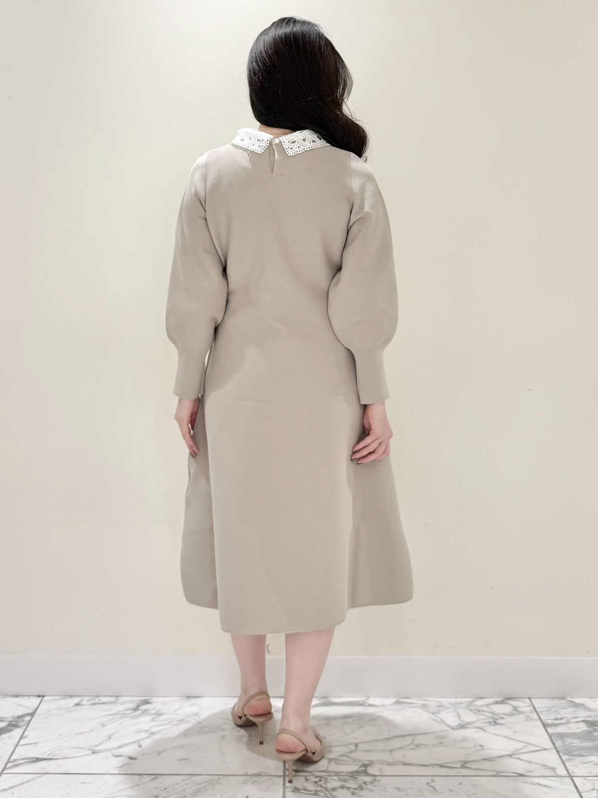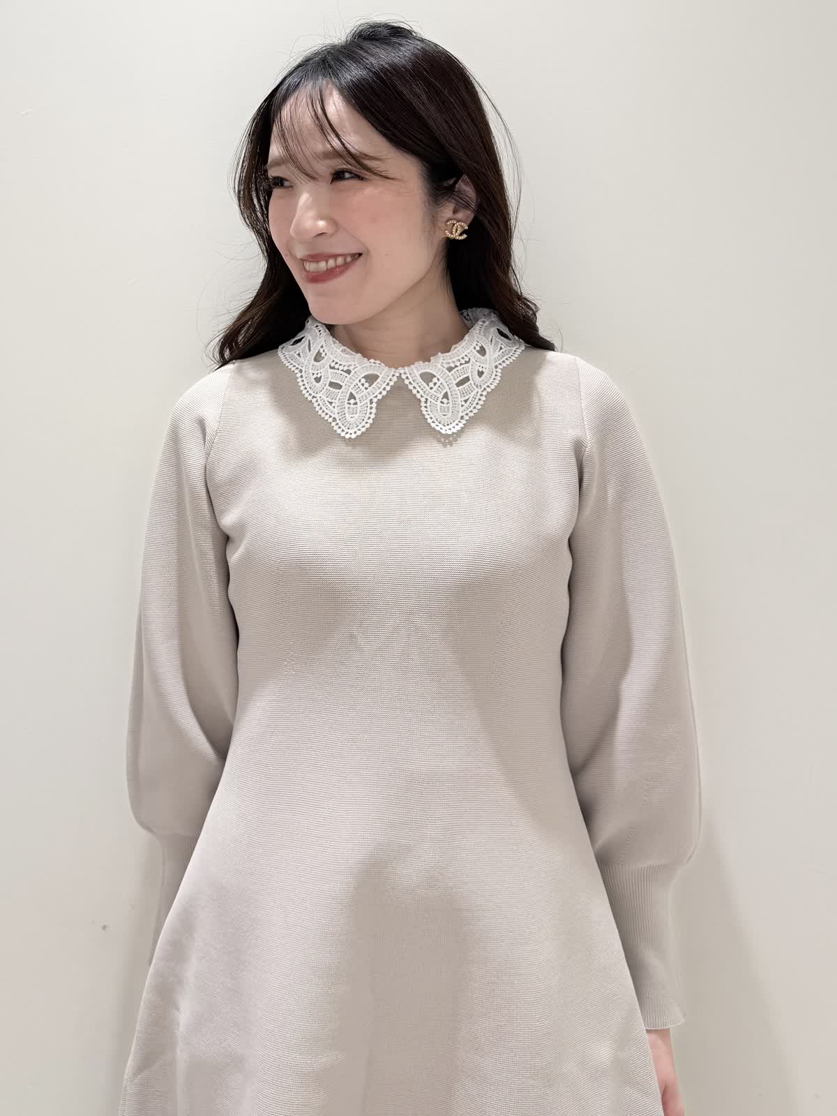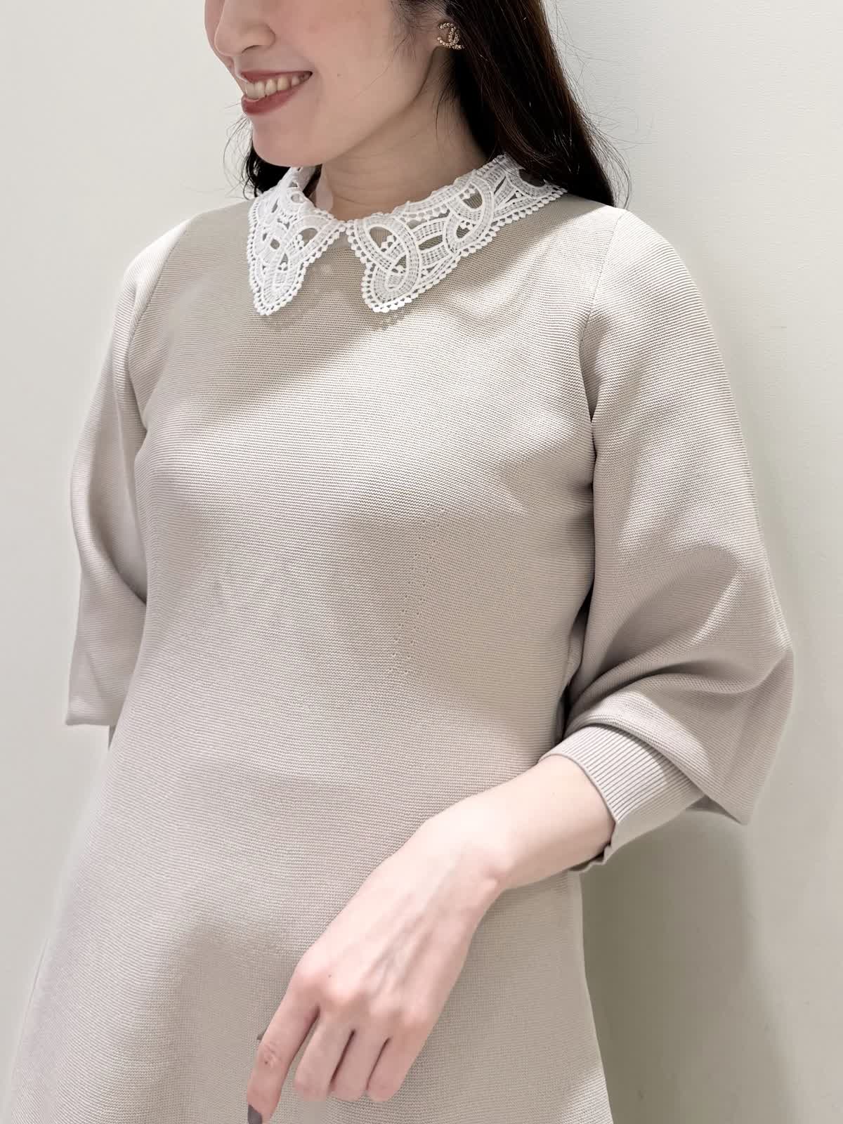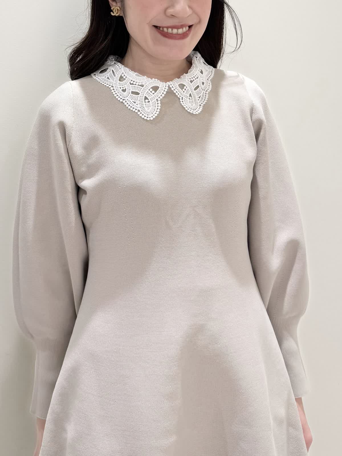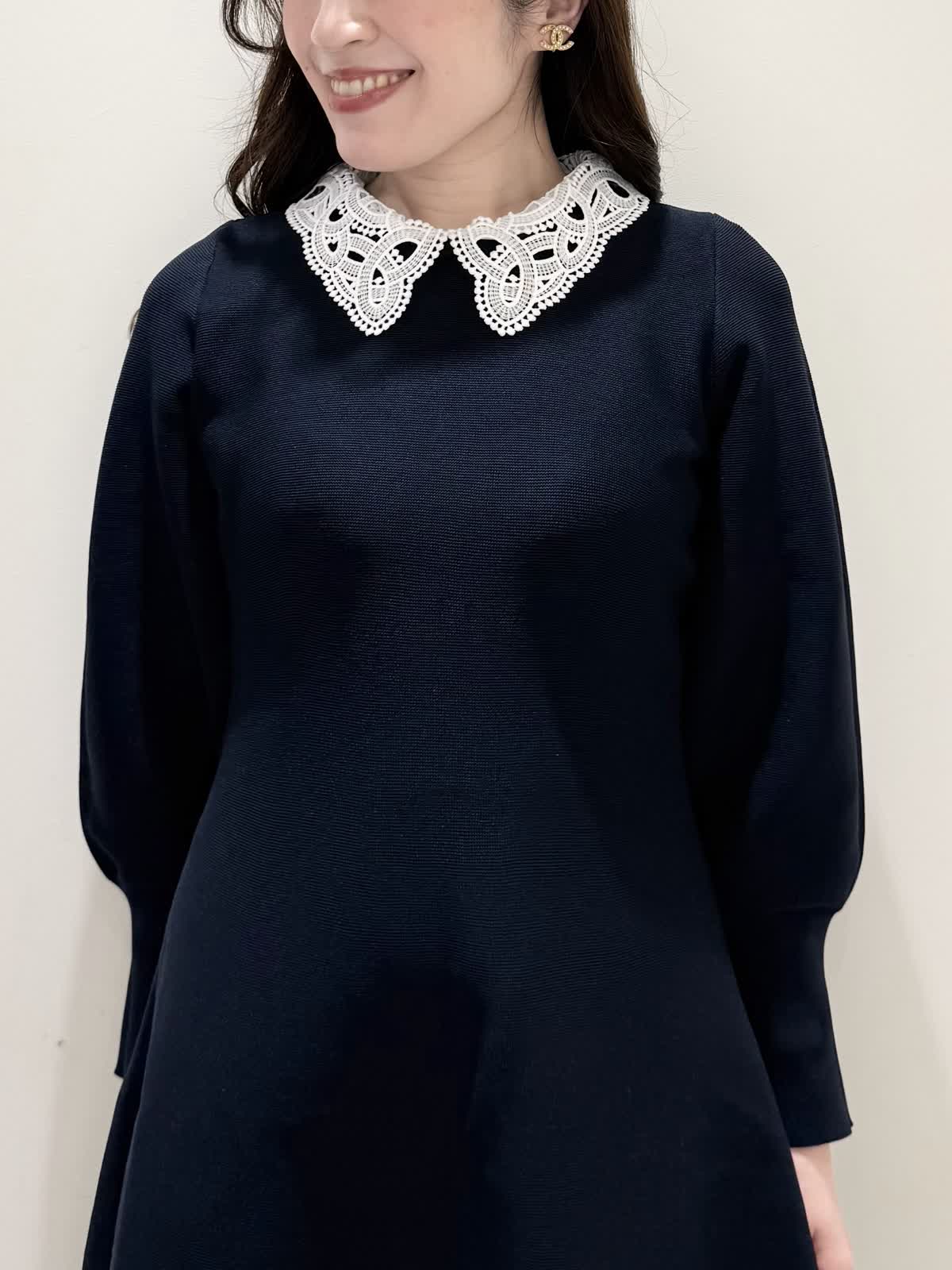 【着用サイズ/カラー】ニットワンピース:7号/ベージュ?ネイビー 今から着られる春の新作ワンピース♪おでかけやお食事会、コーディネートに困った時の必需品、ニットワンピース!襟レースが上品できちんとした印象、顔周りを明るく見せてくれます。取り外しできるので、シンプルにクルーネック仕様でネックレスをしてもおすすめです。柔らかいニット生地で着心地◎今の時期から着やすい袖丈に程よいボリュームスリーブはたくし上げたふんわり袖も可愛いです。フィット&フレアシルエットで着るだけでスタイルアップが叶い、長すぎない着丈がバランス良く着ていただけます。いつものサイズで大丈夫です。