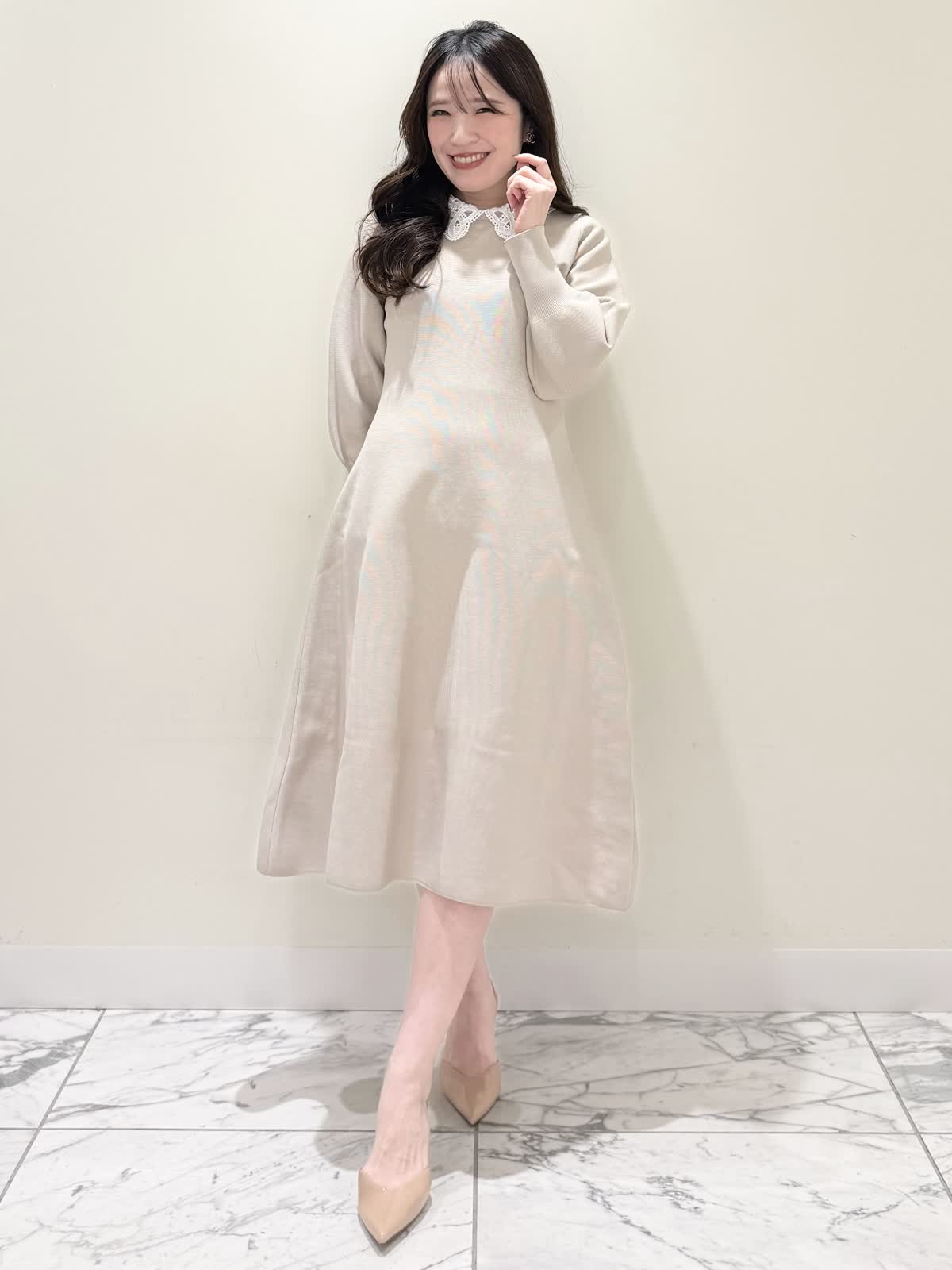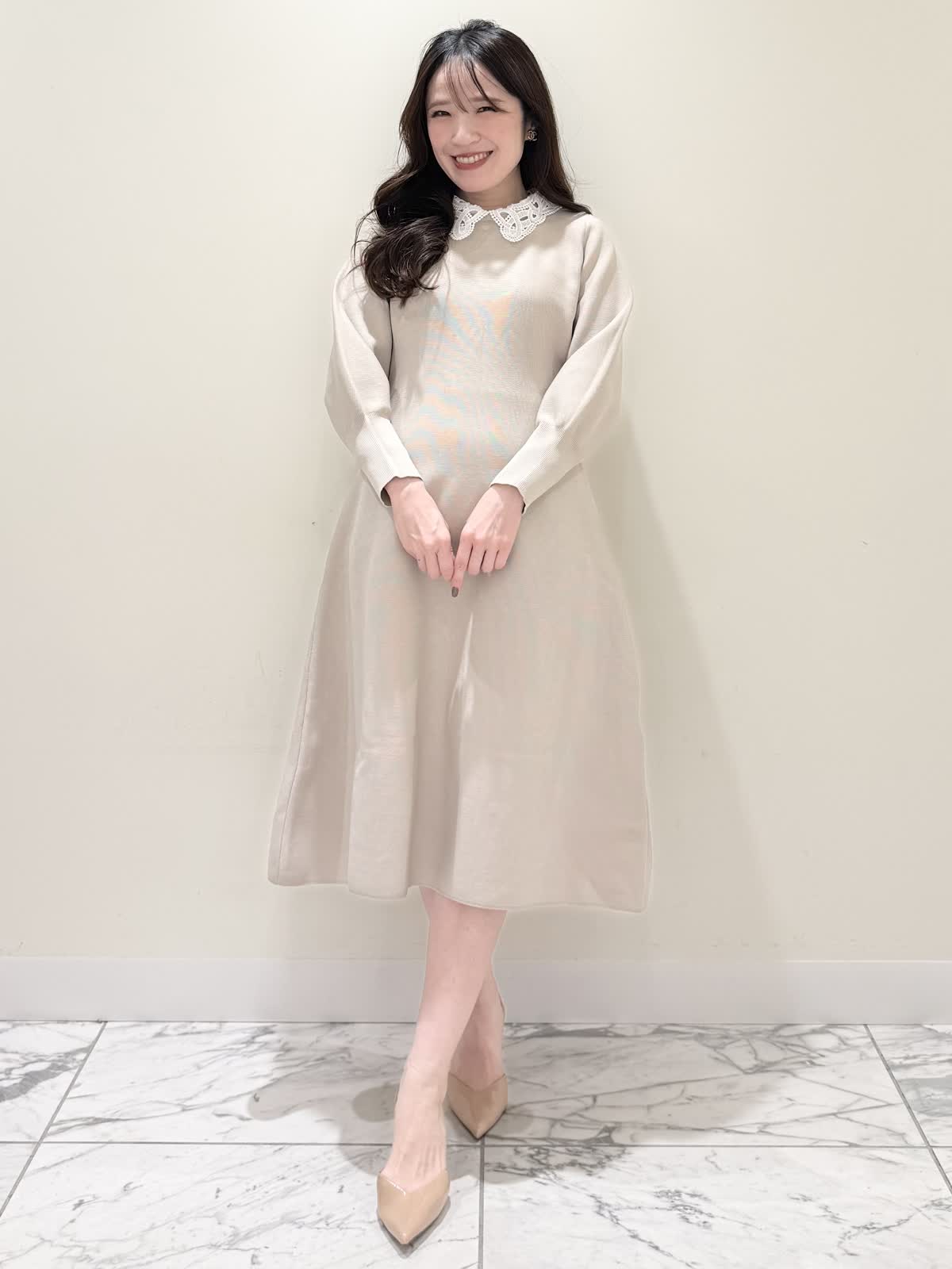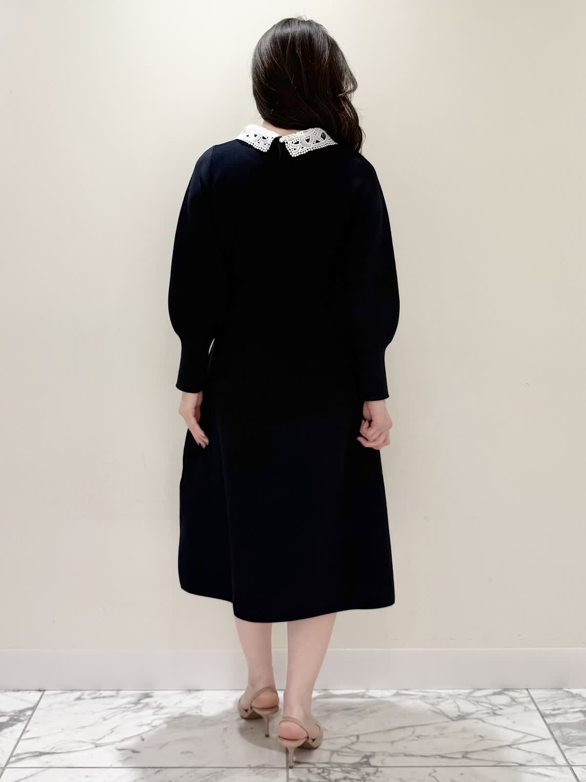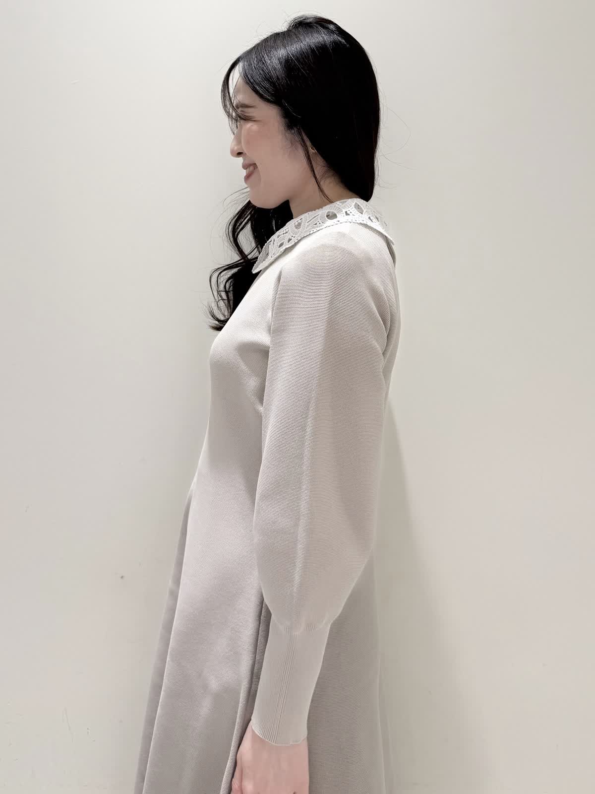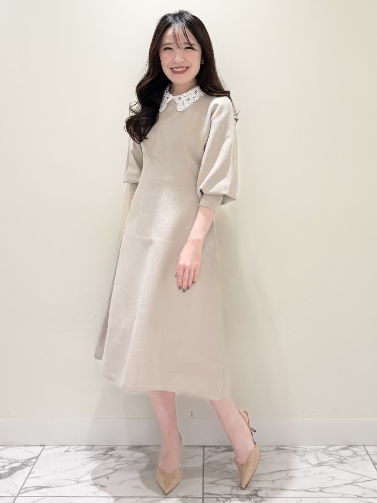 【着用サイズ/カラー】ニットワンピース:7号/ベージュ?ネイビー 今から着られる春の新作ワンピース♪おでかけやお食事会、コーディネートに困った時の必需品、ニットワンピース!襟レースが上品できちんとした印象、顔周りを明るく見せてくれます。取り外しできるので、シンプルにクルーネック仕様でネックレスをしてもおすすめです。柔らかいニット生地で着心地◎今の時期から着やすい袖丈に程よいボリュームスリーブはたくし上げたふんわり袖も可愛いです。フィット&フレアシルエットで着るだけでスタイルアップが叶い、長すぎない着丈がバランス良く着ていただけます。いつものサイズで大丈夫です。