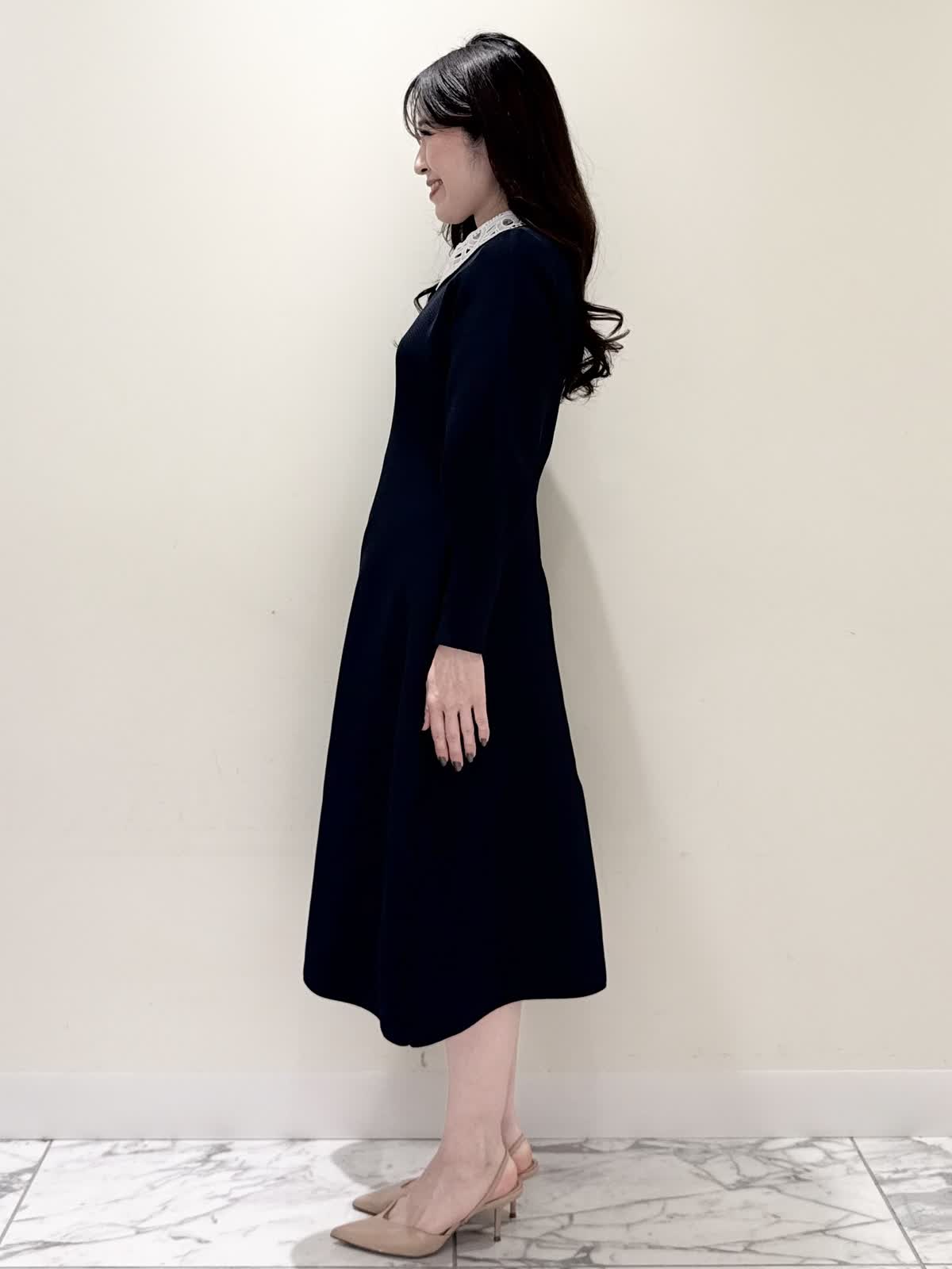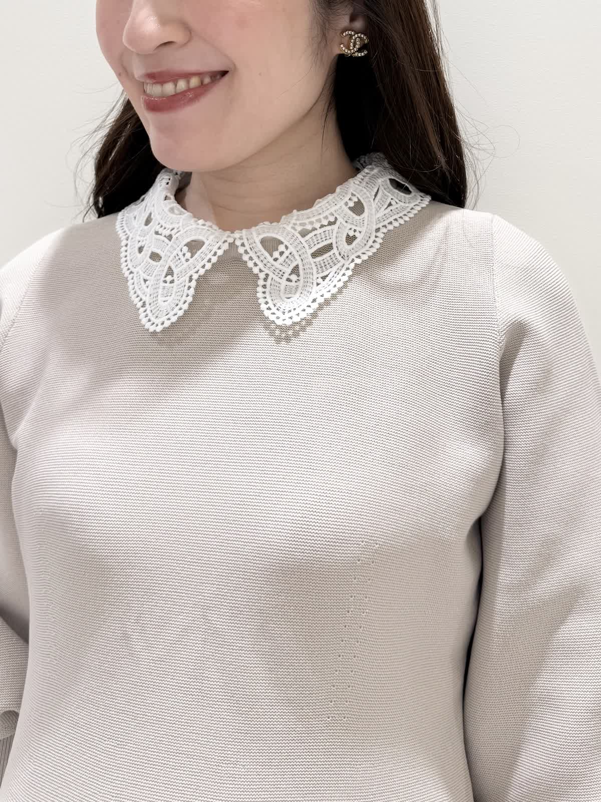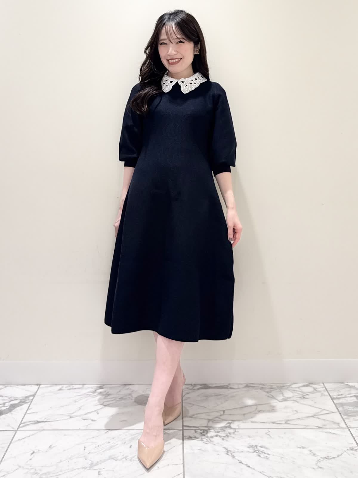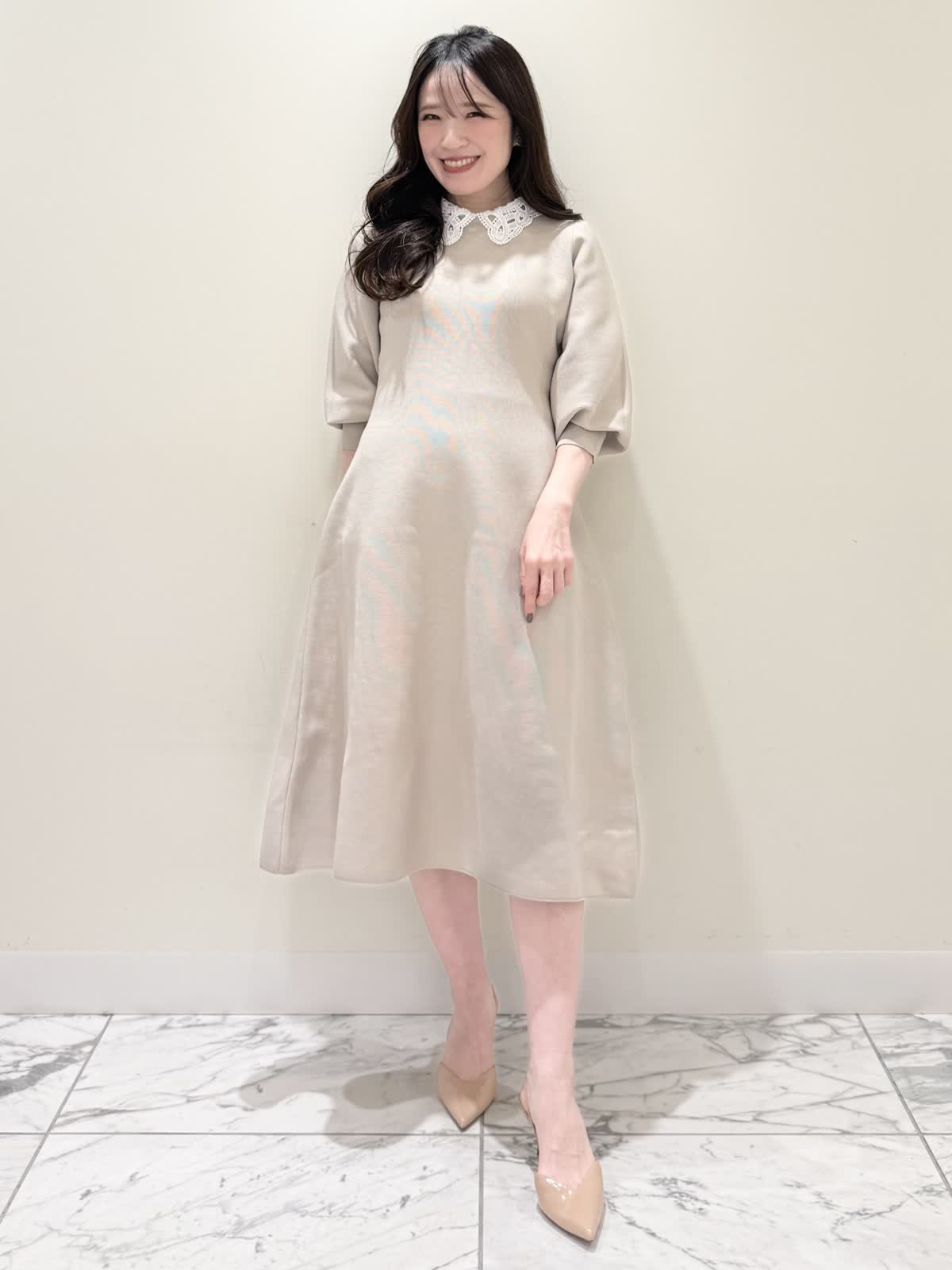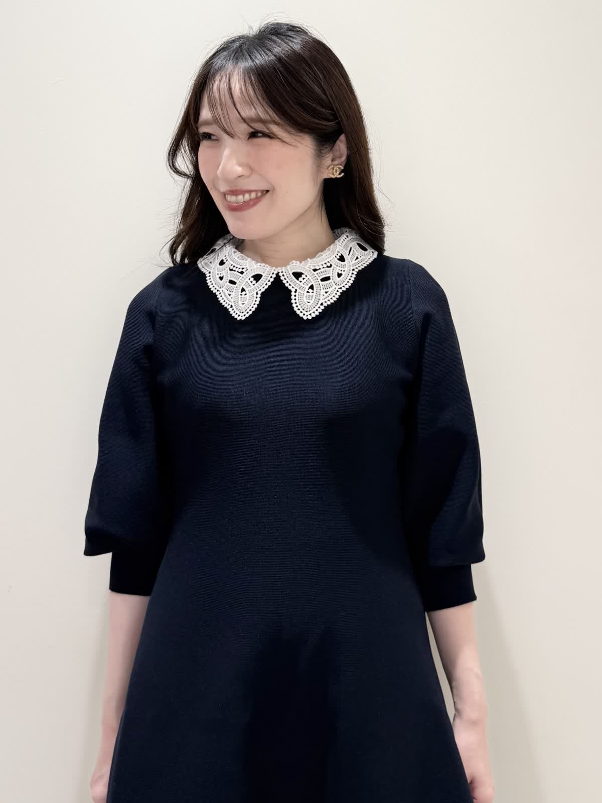 【着用サイズ/カラー】ニットワンピース:7号/ベージュ?ネイビー 今から着られる春の新作ワンピース♪おでかけやお食事会、コーディネートに困った時の必需品、ニットワンピース!襟レースが上品できちんとした印象、顔周りを明るく見せてくれます。取り外しできるので、シンプルにクルーネック仕様でネックレスをしてもおすすめです。柔らかいニット生地で着心地◎今の時期から着やすい袖丈に程よいボリュームスリーブはたくし上げたふんわり袖も可愛いです。フィット&フレアシルエットで着るだけでスタイルアップが叶い、長すぎない着丈がバランス良く着ていただけます。いつものサイズで大丈夫です。