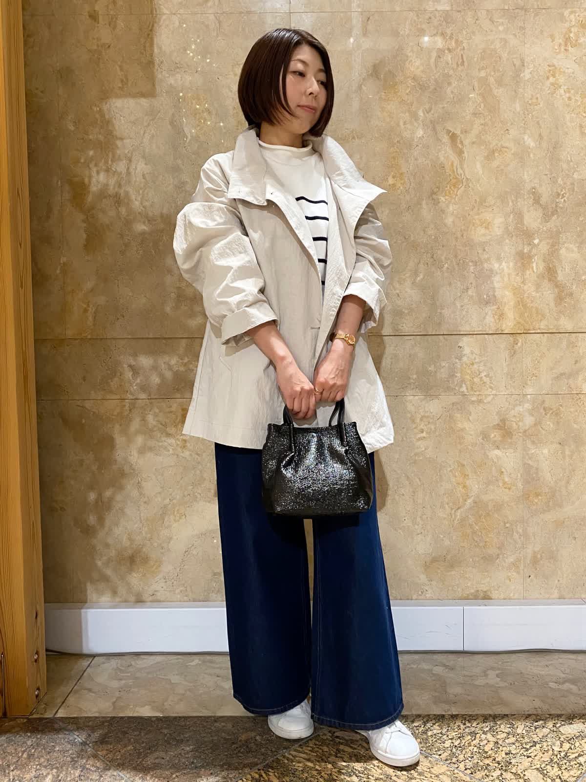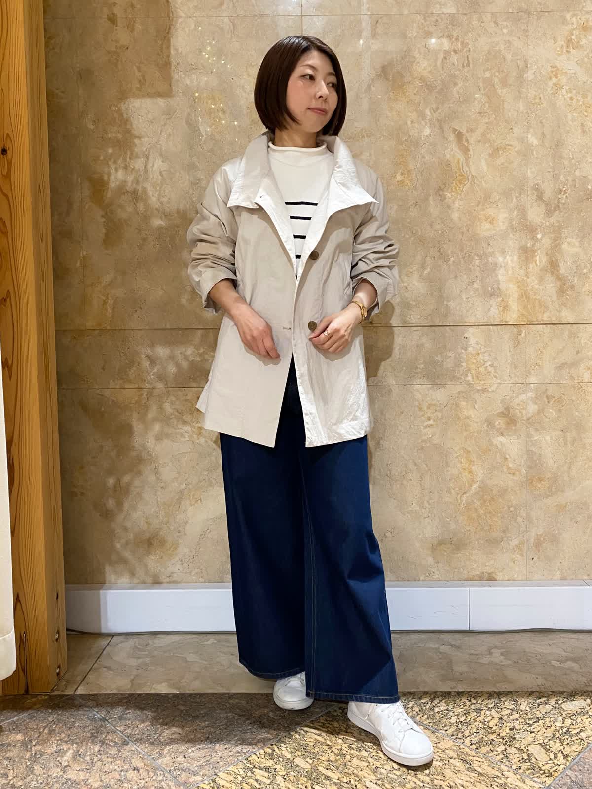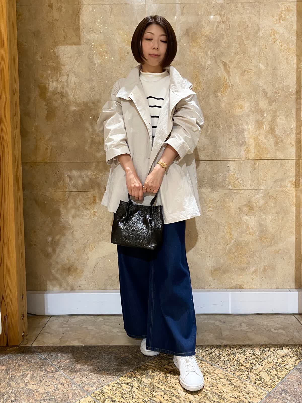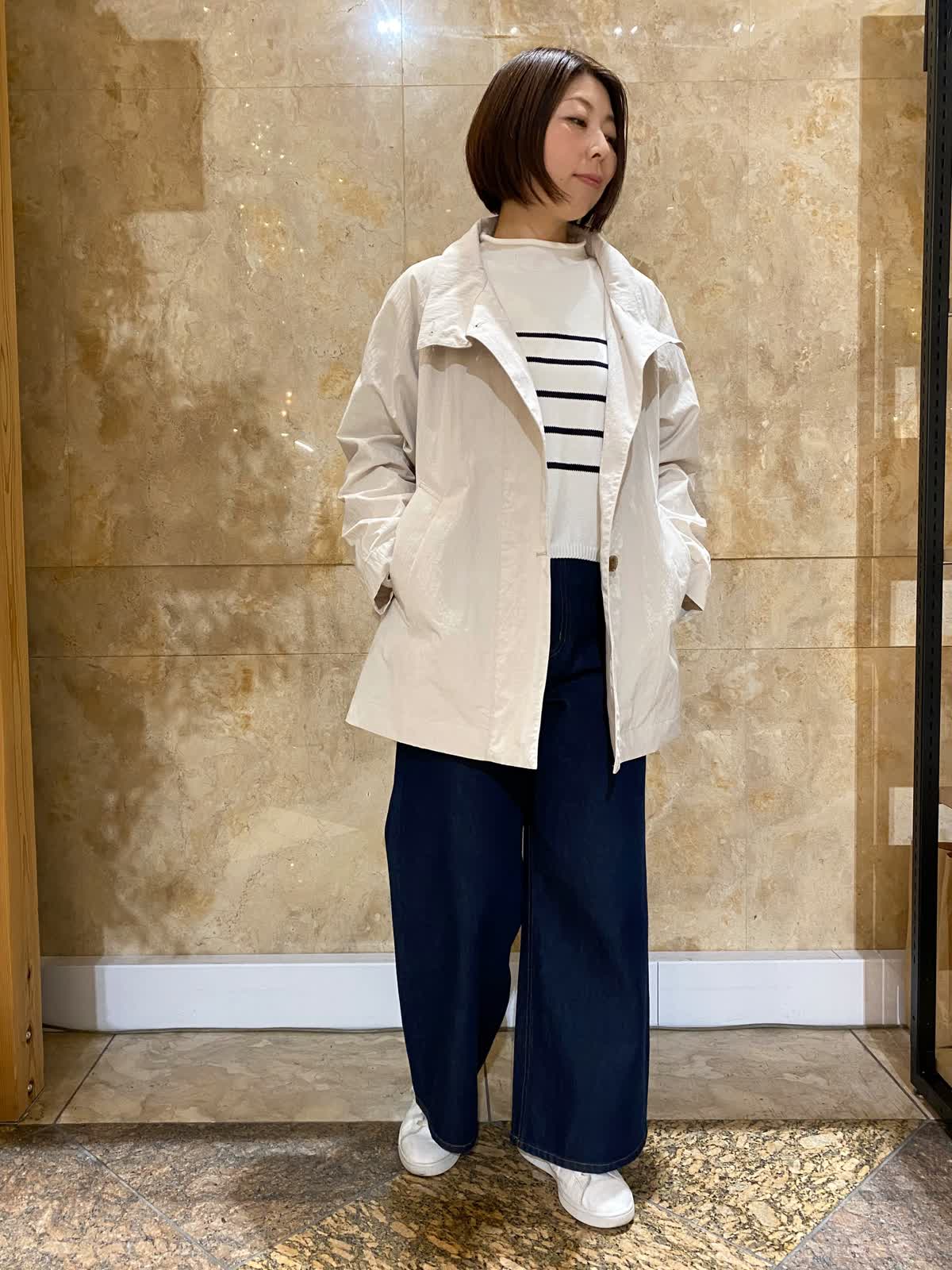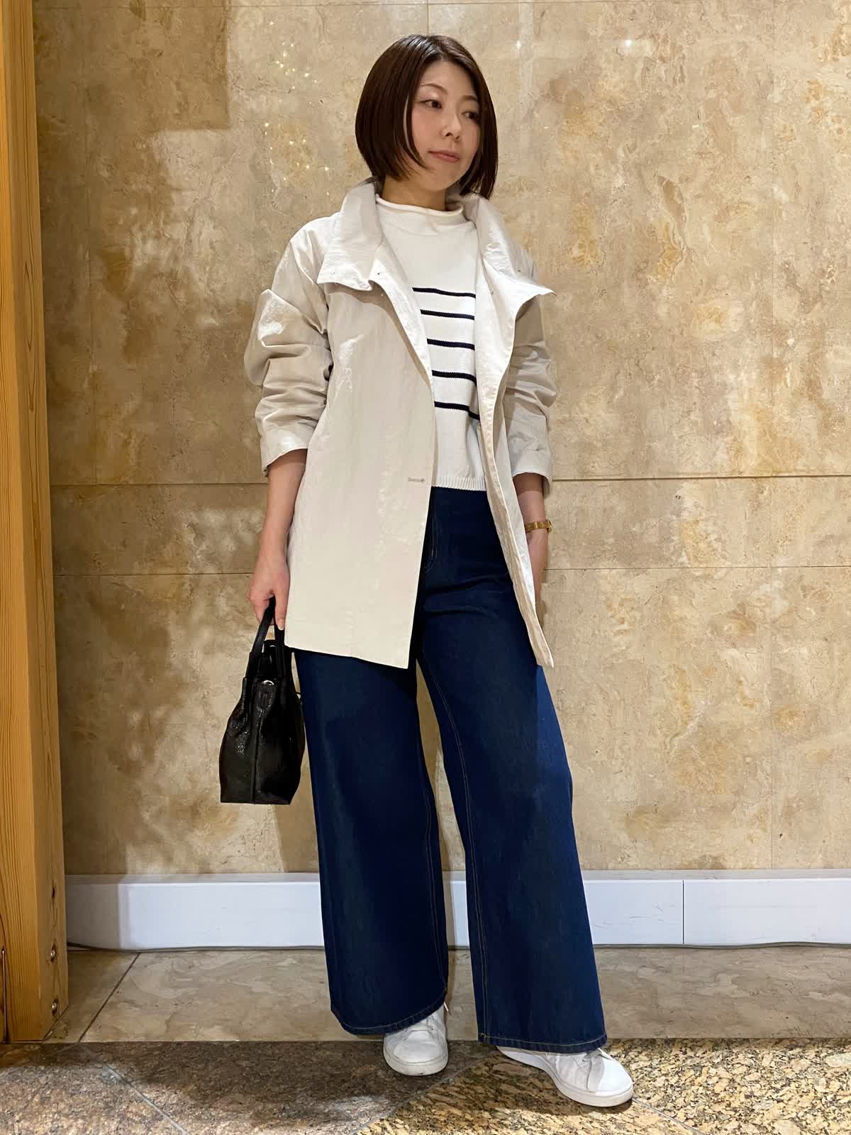 【着用サイズ/カラー】 コート:フリーサイズ /グレーベージュ ニット: フリーサイズ/ボーダー パンツ : 9号/インディゴ バッグ:フリーサイズ /ブラック テントラインのコートは、ヒップがちょうど隠れるくらいの丈で、とても軽くさらっと羽織れます。ゆったりしたデザインなので、まだ肌寒いうちは中にも着込めて重宝します。ボーダーニットとワイドデニムに合わせれば、間違いない万人受けコーデの完成。