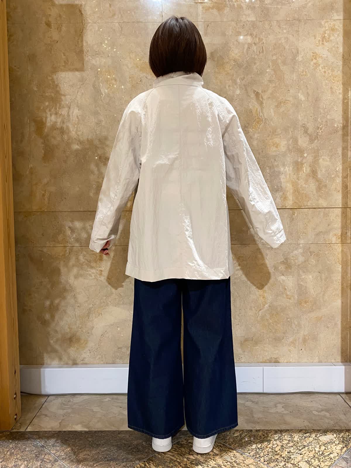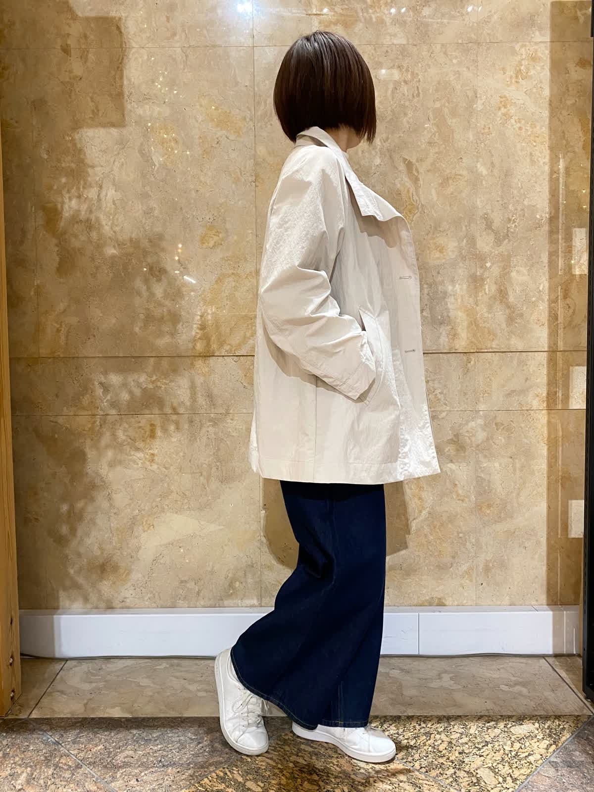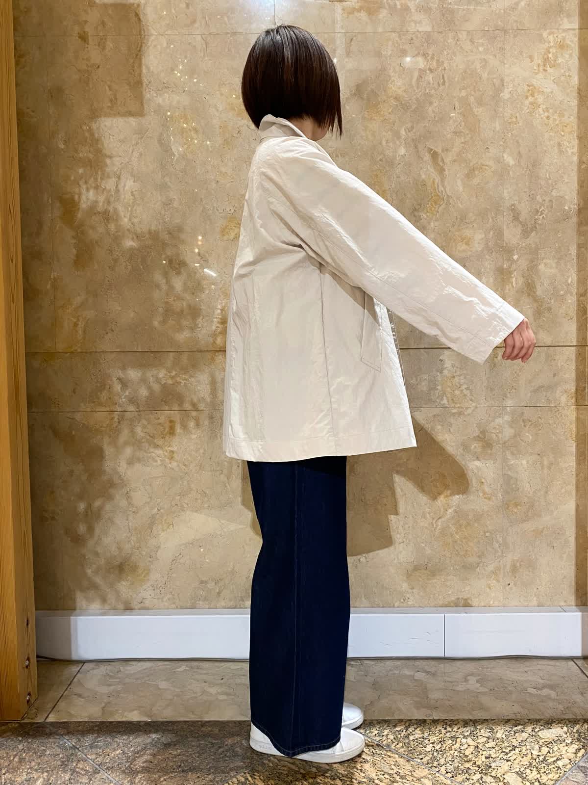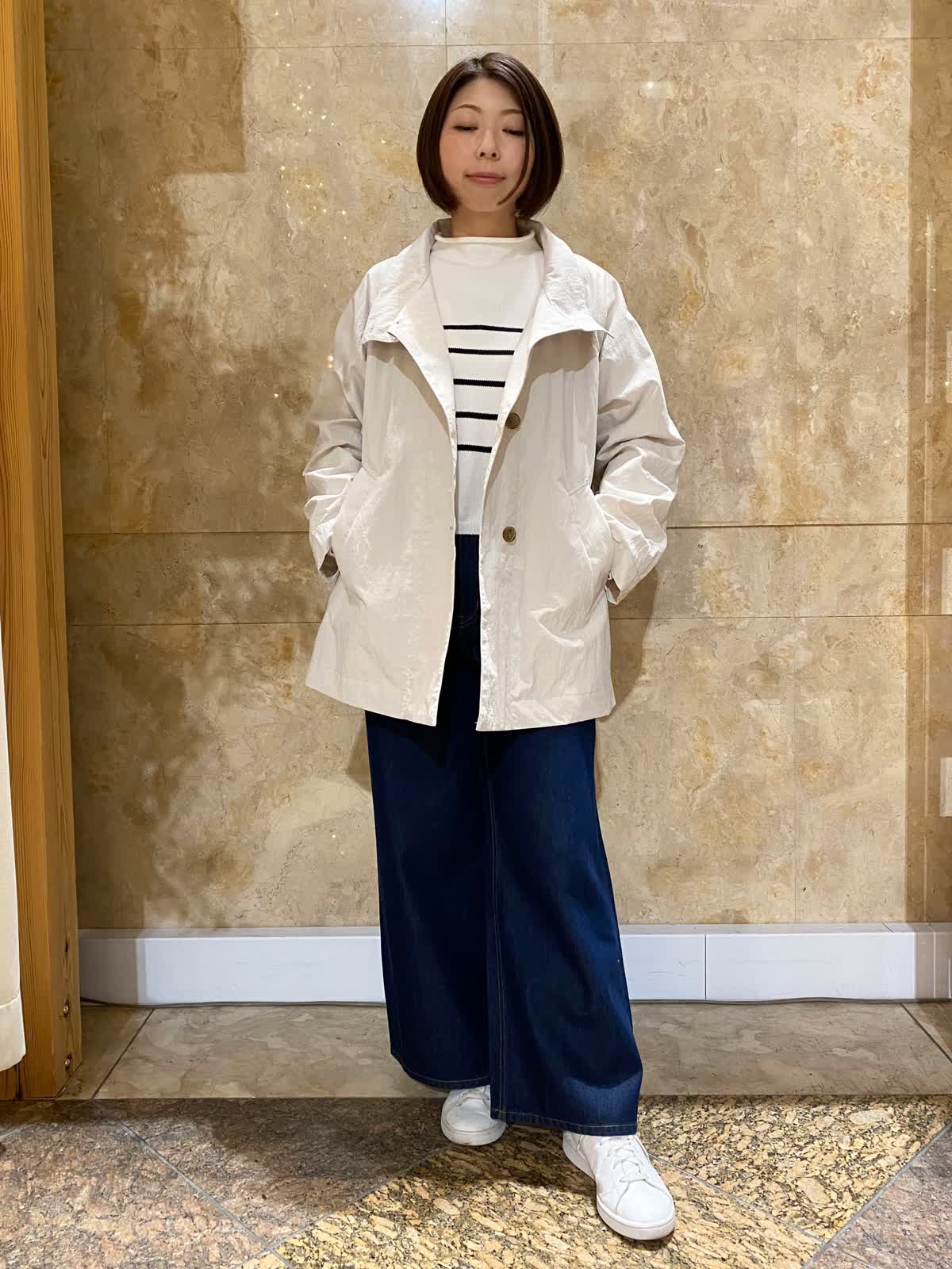 【着用サイズ/カラー】 コート:フリーサイズ /グレーベージュ ニット: フリーサイズ/ボーダー パンツ : 9号/インディゴ バッグ:フリーサイズ /ブラック テントラインのコートは、ヒップがちょうど隠れるくらいの丈で、とても軽くさらっと羽織れます。ゆったりしたデザインなので、まだ肌寒いうちは中にも着込めて重宝します。ボーダーニットとワイドデニムに合わせれば、間違いない万人受けコーデの完成。