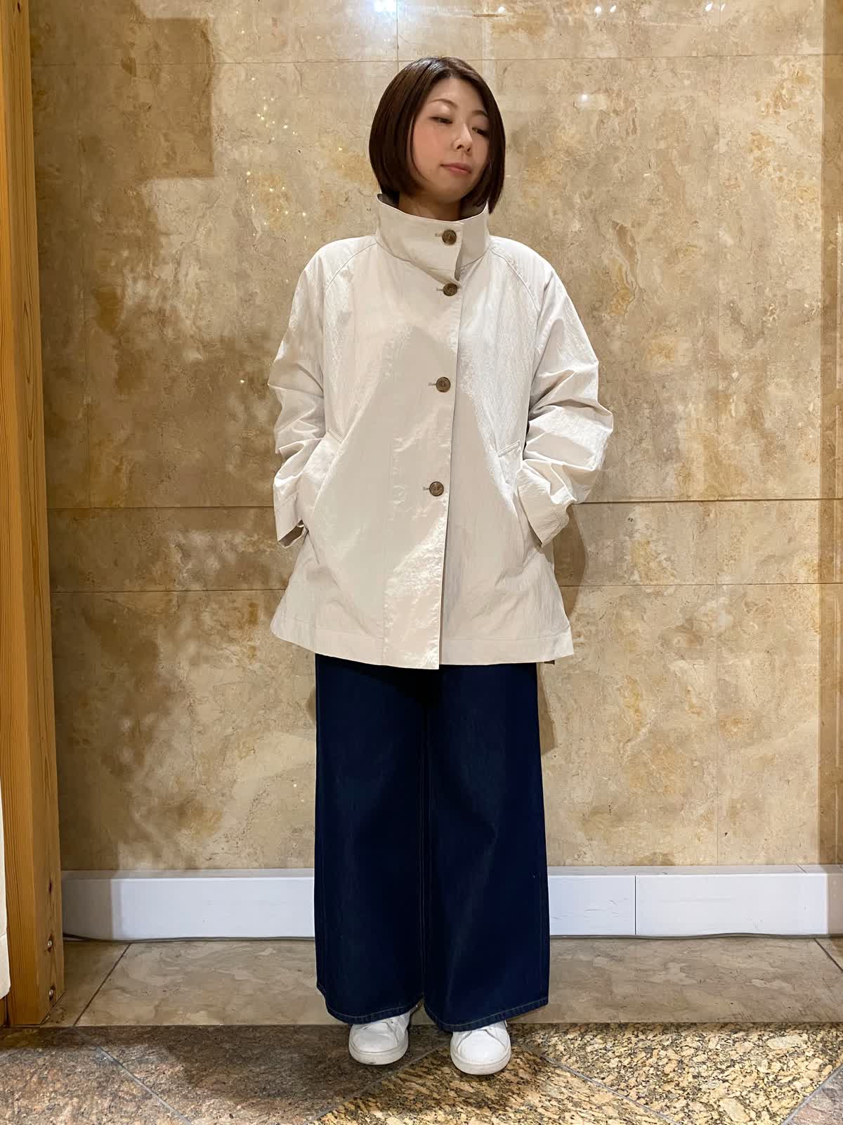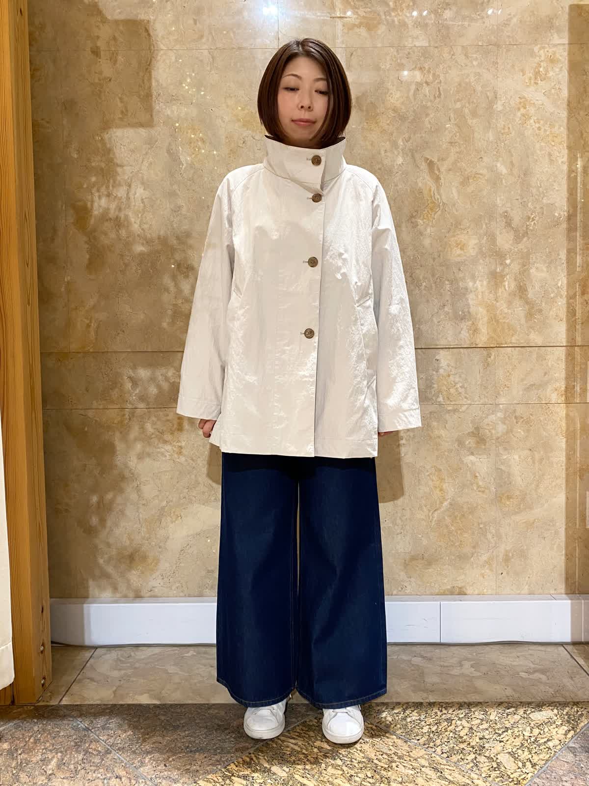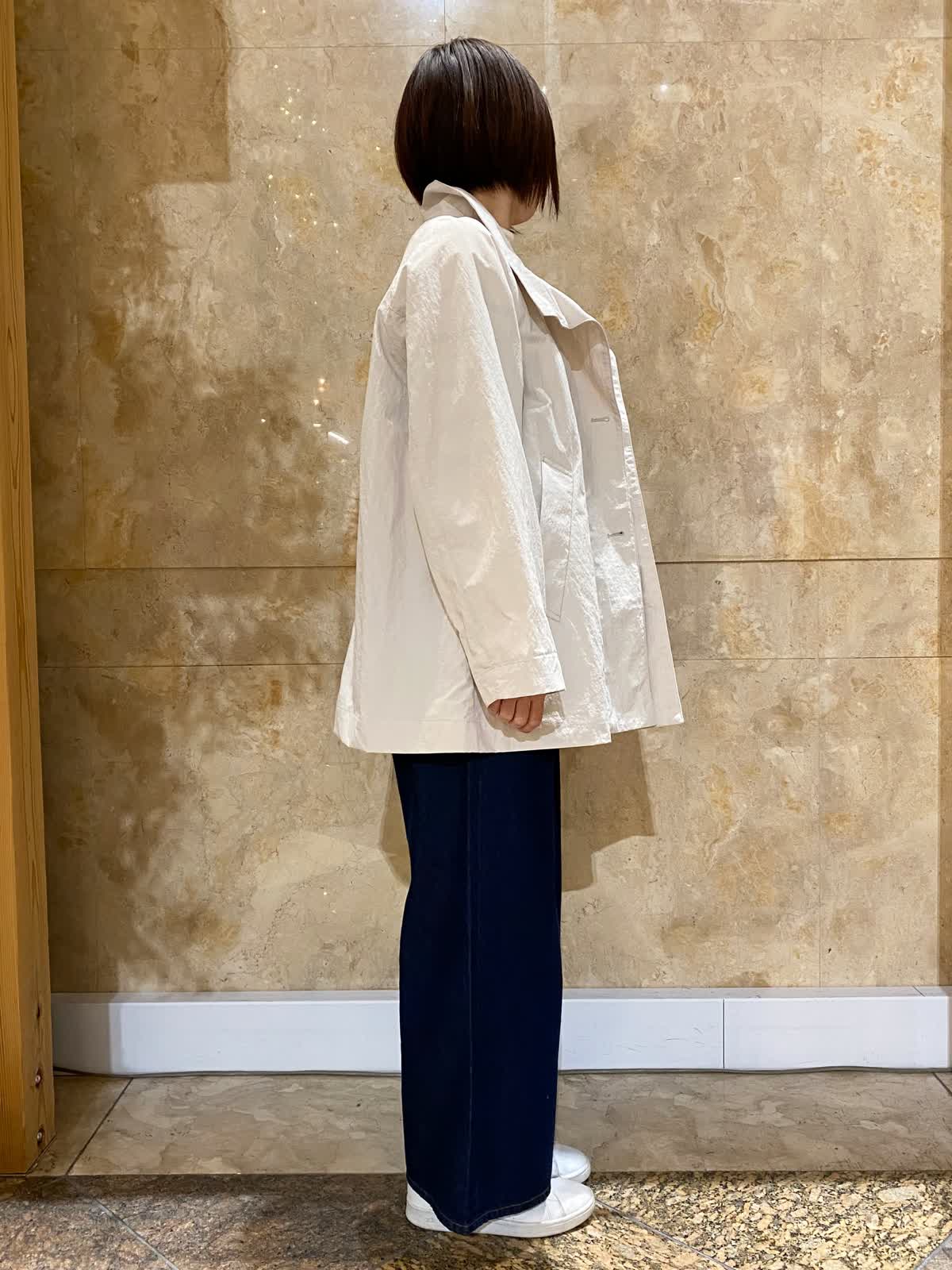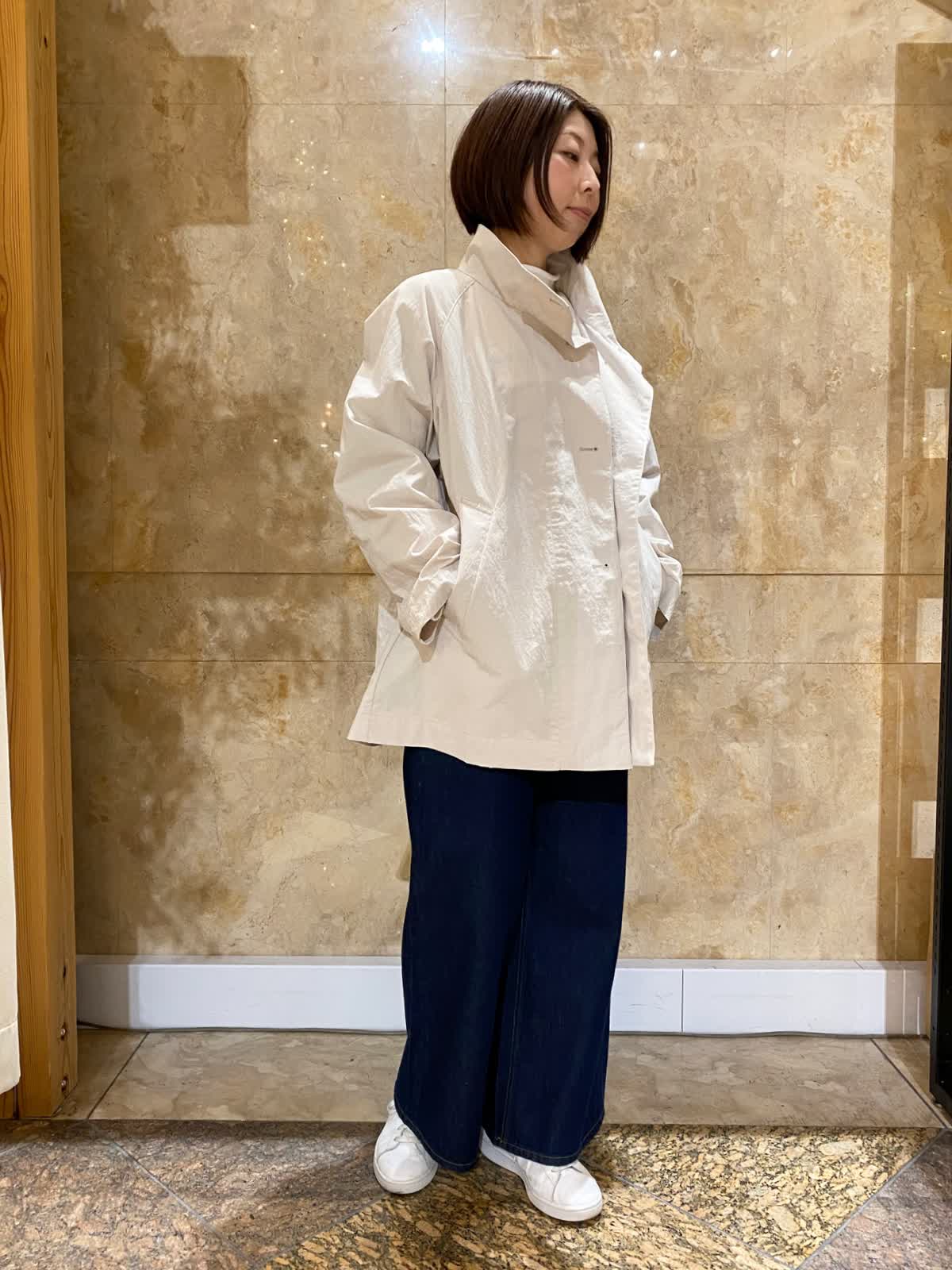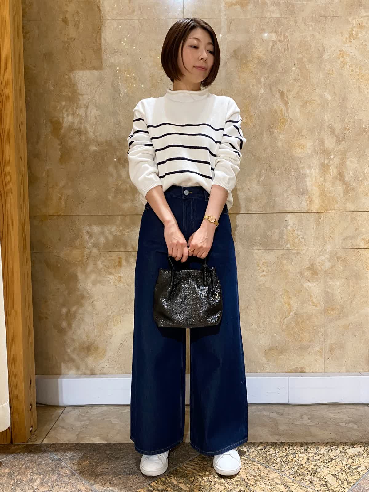 【着用サイズ/カラー】 コート:フリーサイズ /グレーベージュ ニット: フリーサイズ/ボーダー パンツ : 9号/インディゴ バッグ:フリーサイズ /ブラック テントラインのコートは、ヒップがちょうど隠れるくらいの丈で、とても軽くさらっと羽織れます。ゆったりしたデザインなので、まだ肌寒いうちは中にも着込めて重宝します。ボーダーニットとワイドデニムに合わせれば、間違いない万人受けコーデの完成。