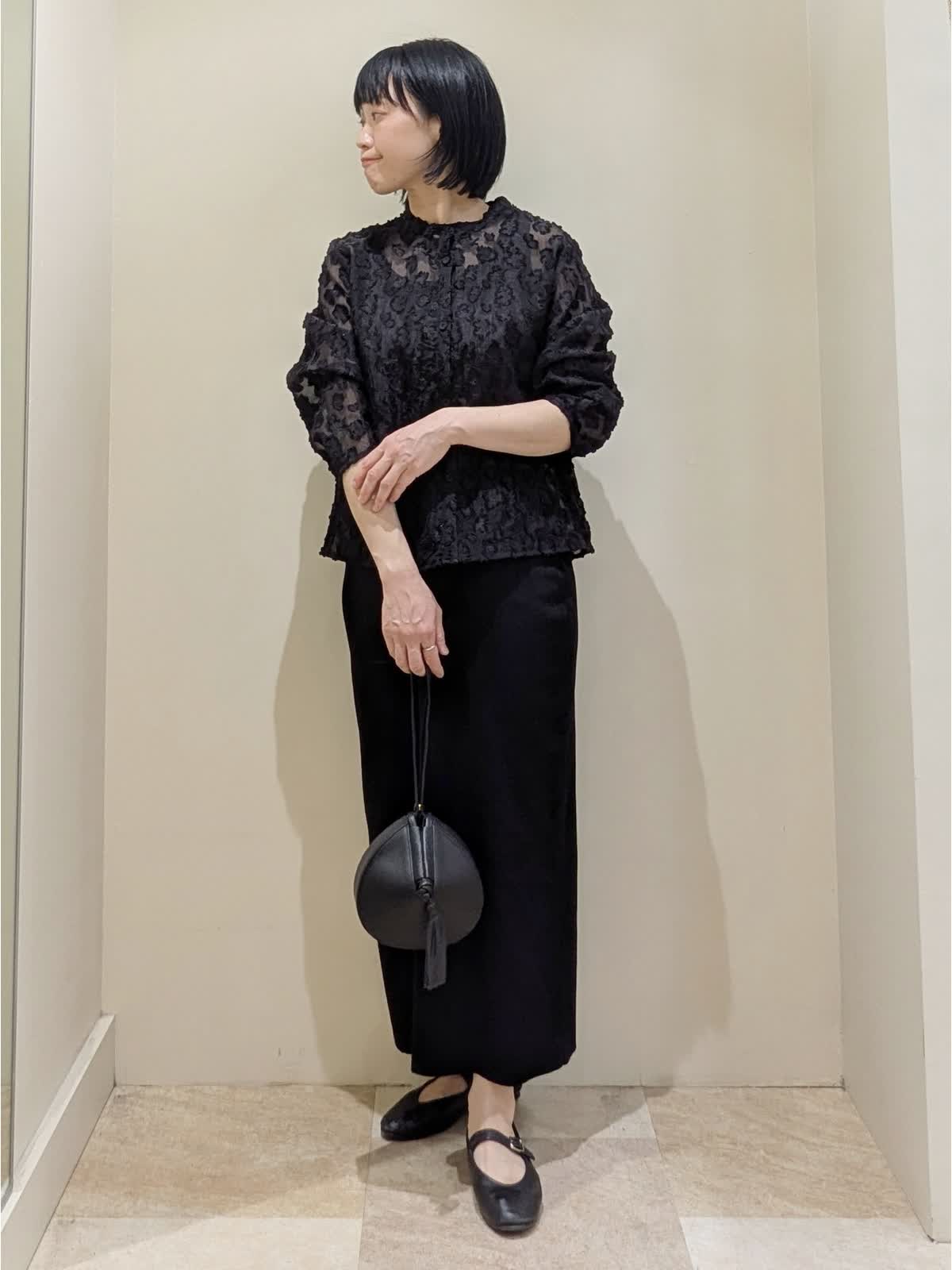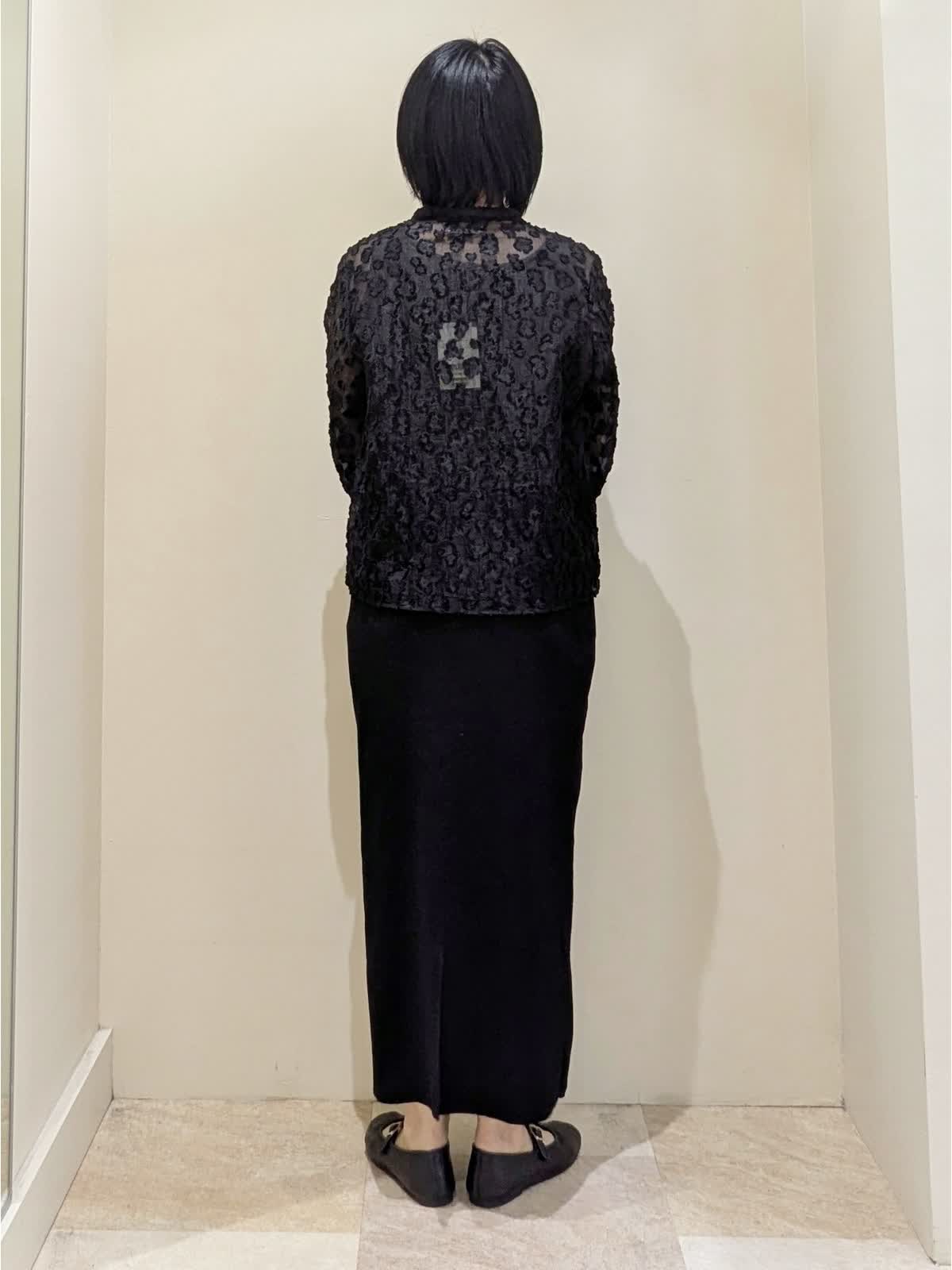 【着用サイズ】ブラウス/9号、スカート/フリー 【着用カラー】ブラウス/ブラック、スカート/ブラック、バッグ/ブラック 甘すぎないフラワーモチーフのカットジャカードブラウス。上品で、セレモニースタイルにも活躍。前開きデザインは着方次第で着回し自在。黒のニットスカートはスッキリ見え、万能アイテムです!
