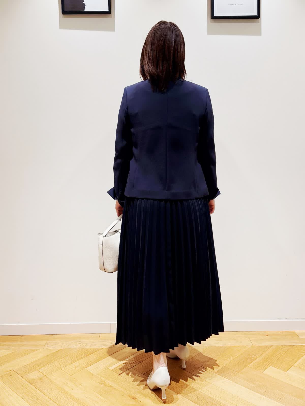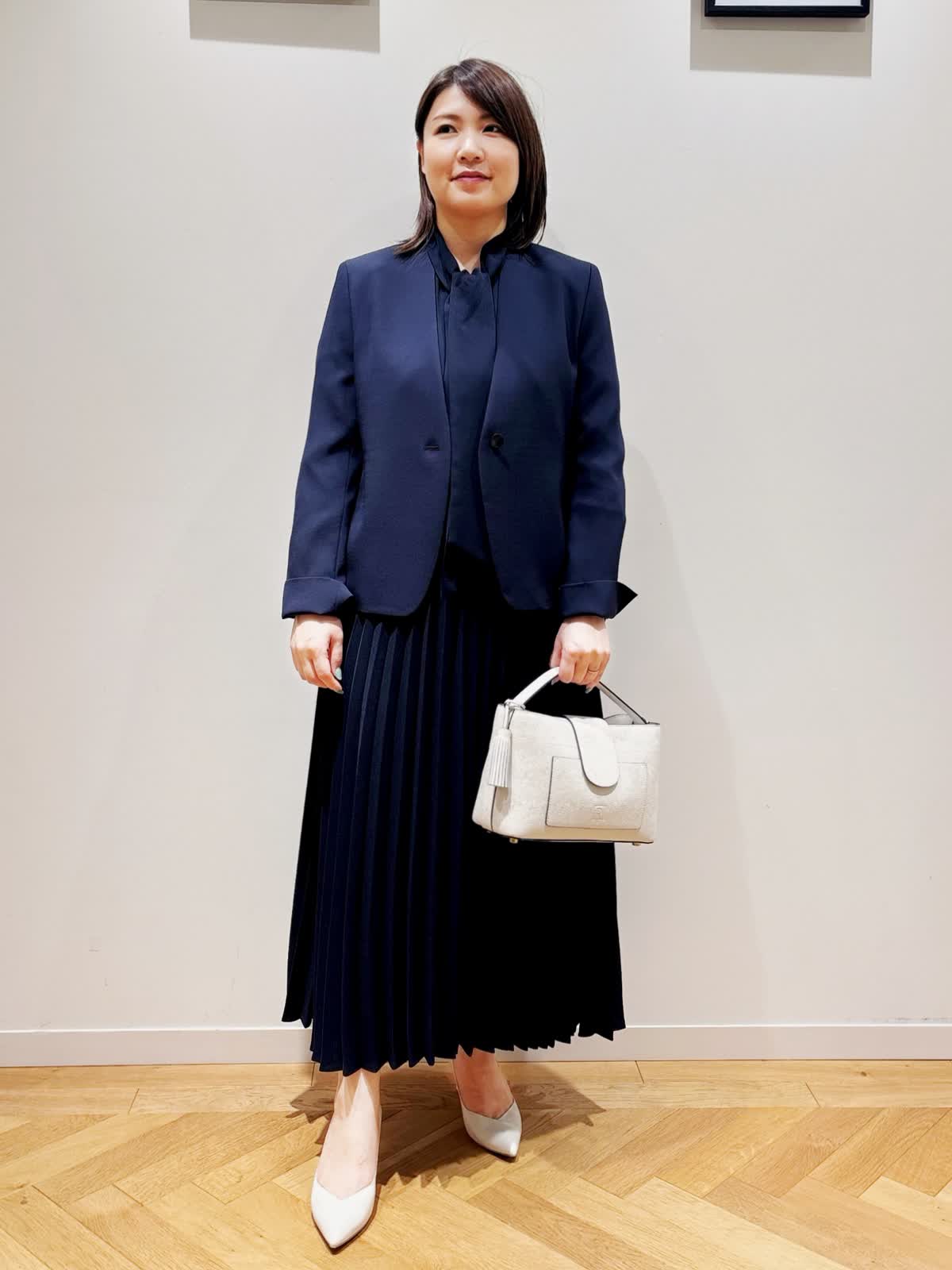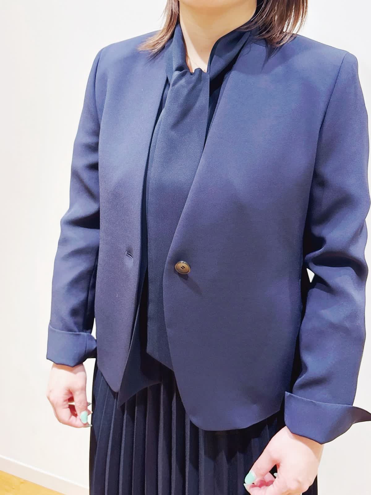 【着用サイズ】全て9号 【着用カラー】ジャケット:ネイビー ワンピース:ネイビー バック:オフホワイト すっきりとしたノーカラージャケットに上品なボウタイ付きワンピースを合わせたセレモニーコーディネートです。ジャケットはストレッチが入っており着心地抜群です。ワンピースはウエストはゴム仕様でストレスフリーです。お袖デザインも可愛くフォーマルシーンに最適です。