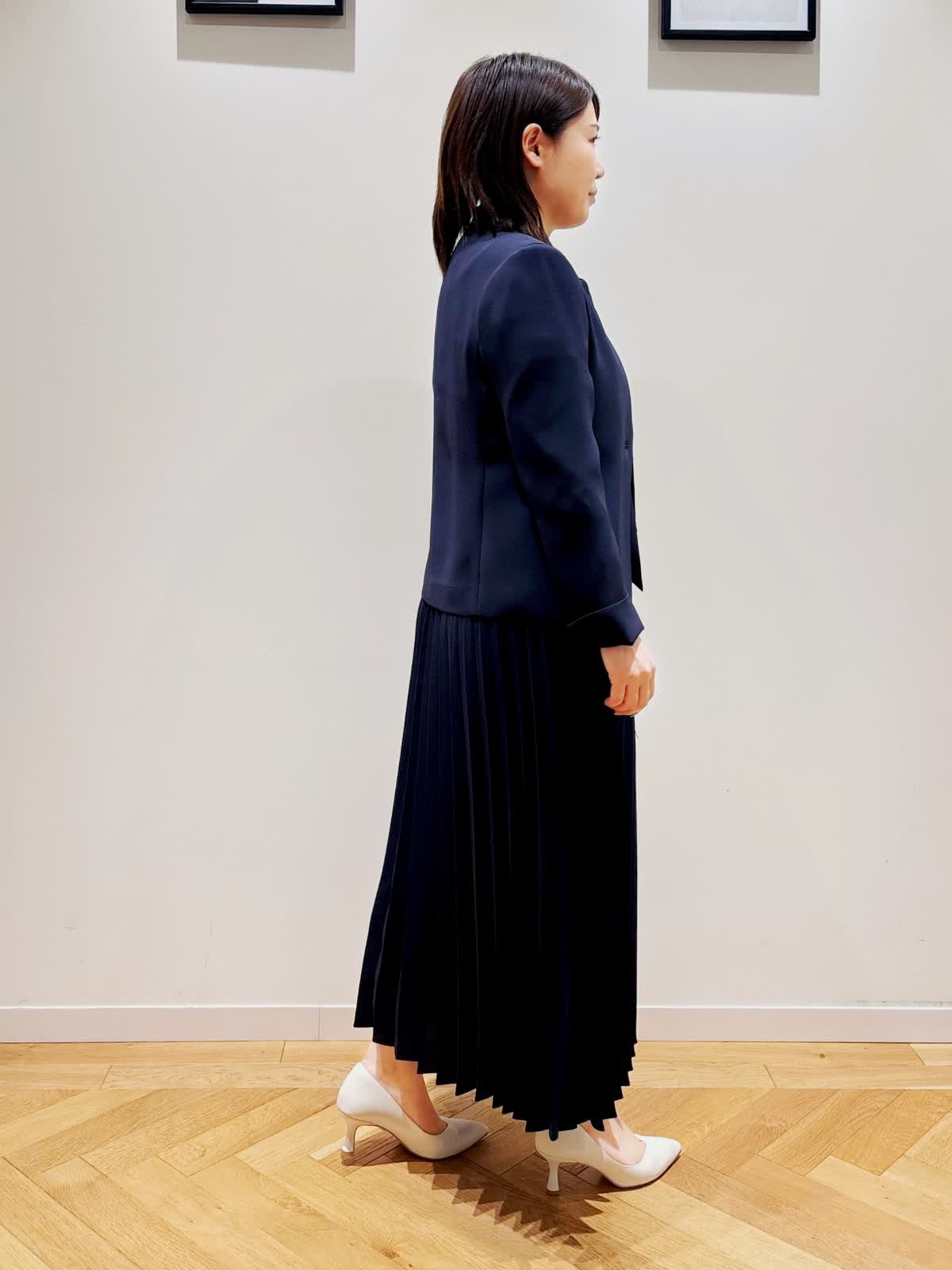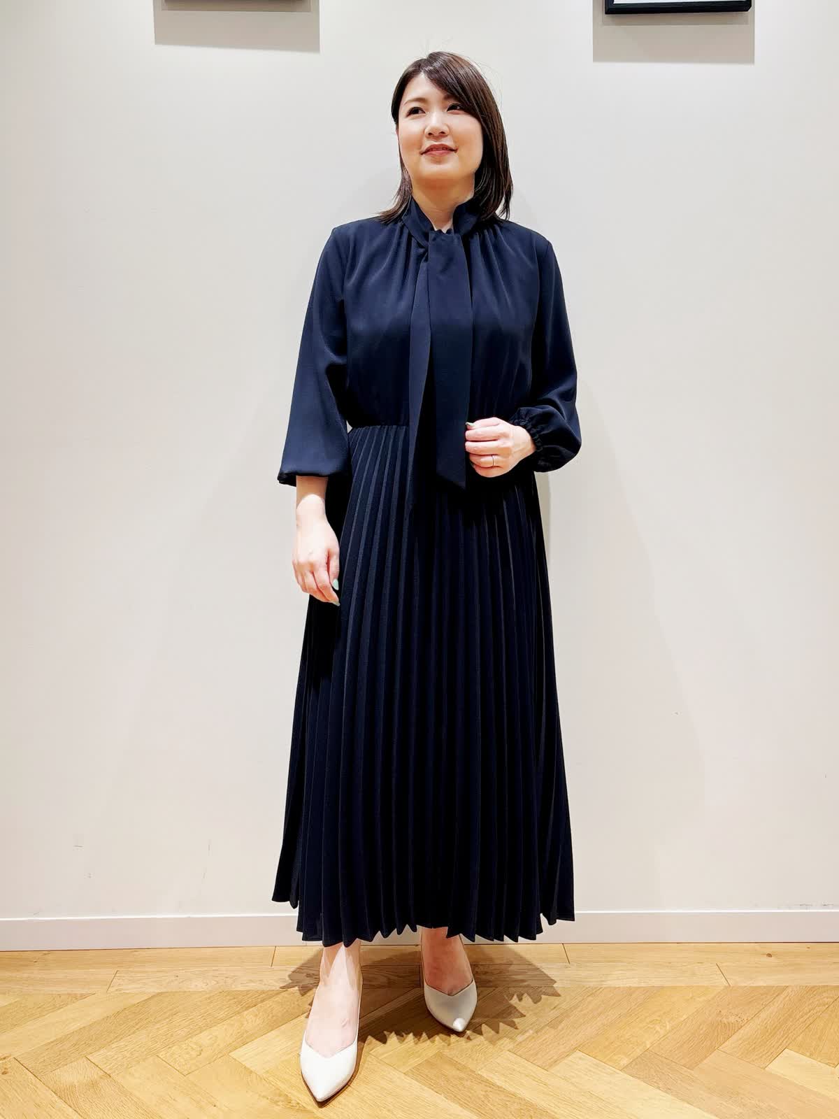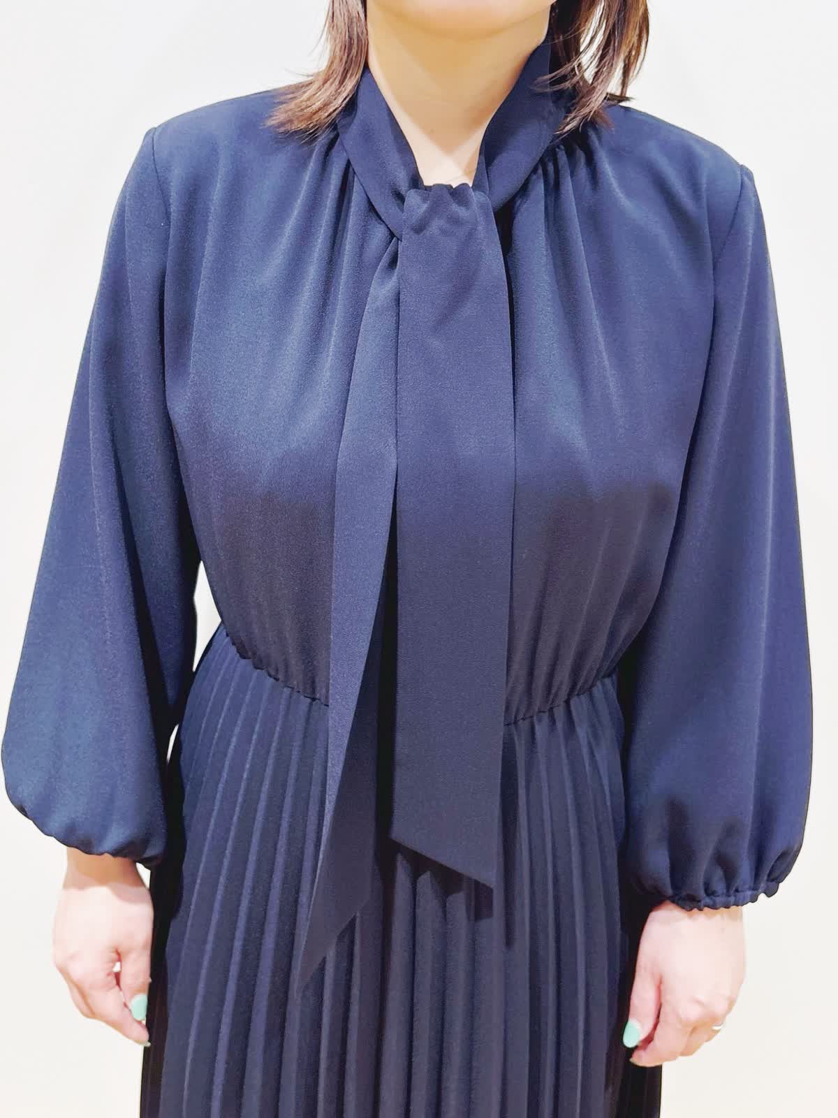 【着用サイズ】全て9号 【着用カラー】ジャケット:ネイビー ワンピース:ネイビー バック:オフホワイト すっきりとしたノーカラージャケットに上品なボウタイ付きワンピースを合わせたセレモニーコーディネートです。ジャケットはストレッチが入っており着心地抜群です。ワンピースはウエストはゴム仕様でストレスフリーです。お袖デザインも可愛くフォーマルシーンに最適です。