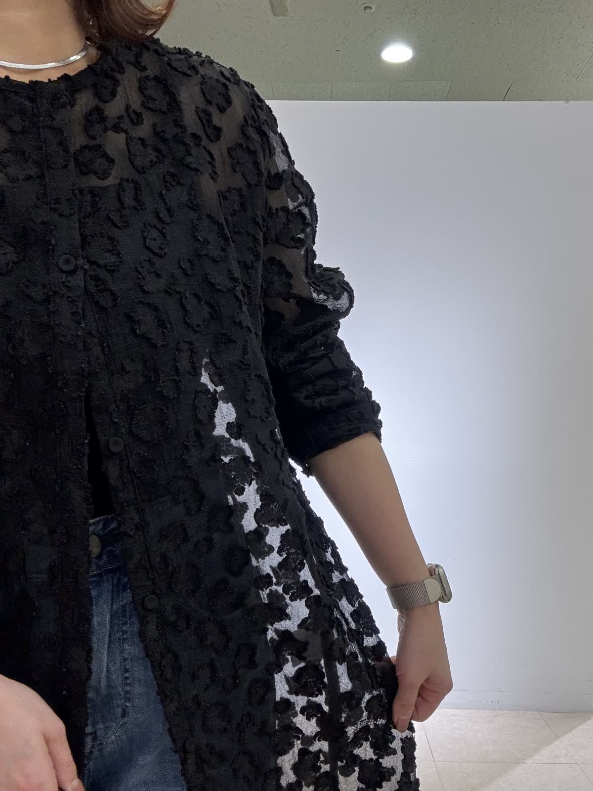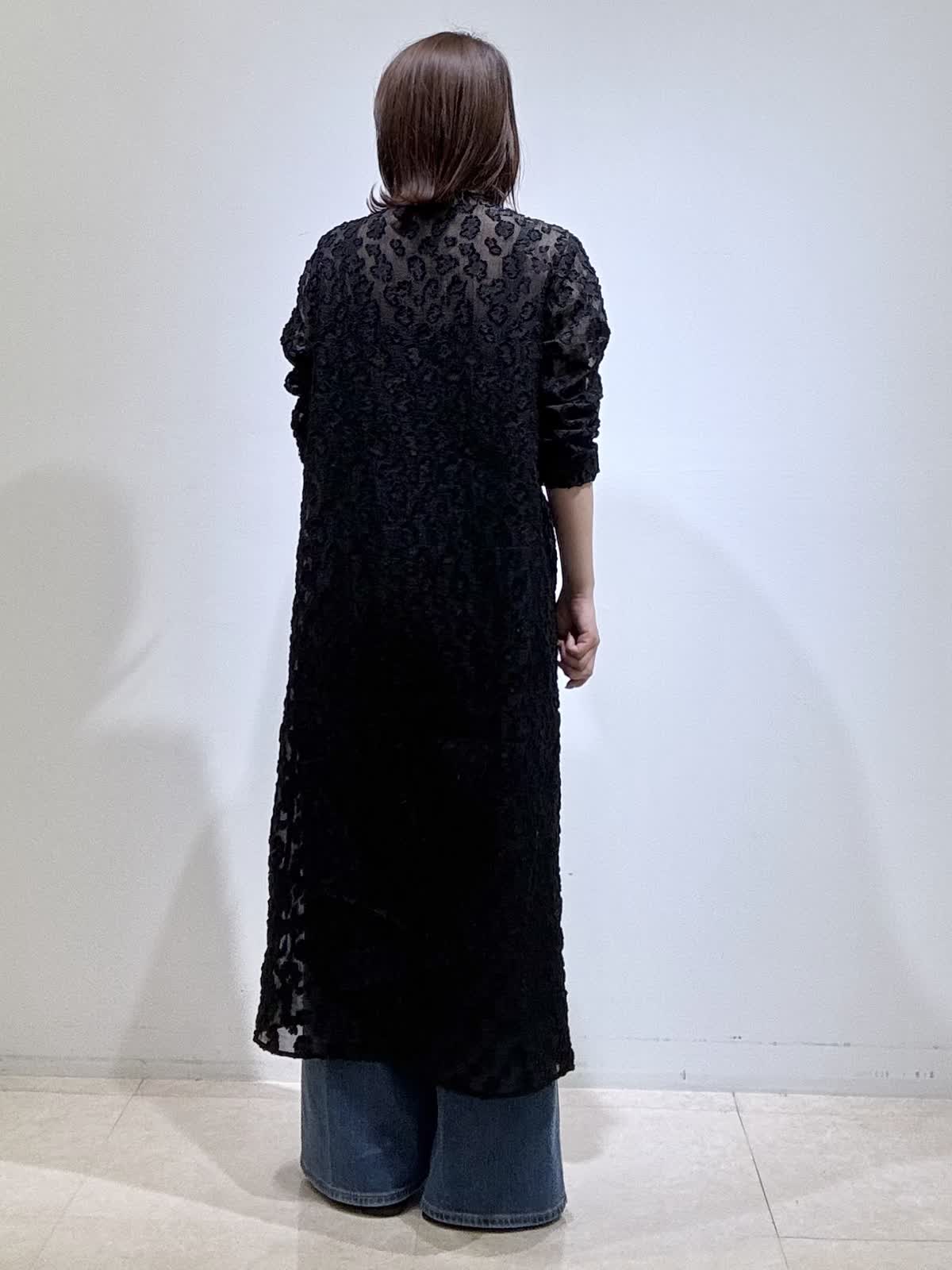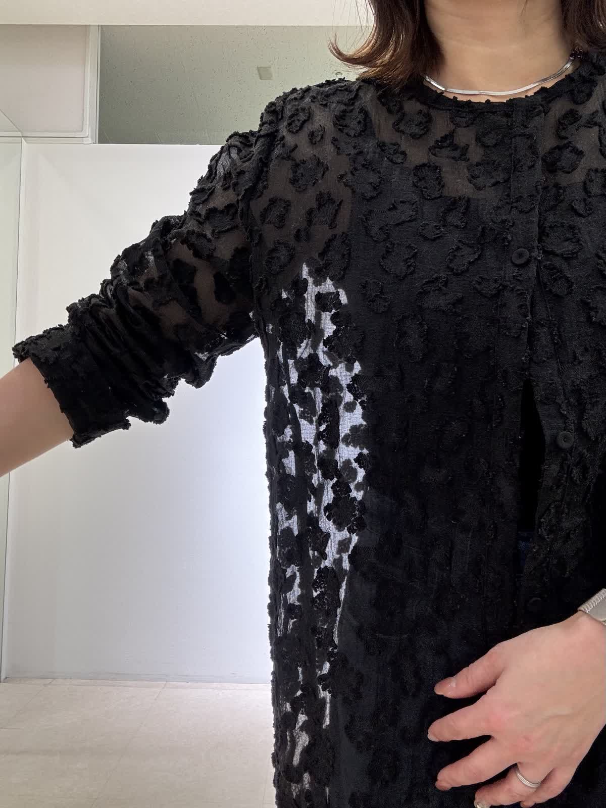 【着用サイズ】全て9号 シアー感のあるカットジャカード素材が目を惹くワンピース。 ふんわり袖×ボクシーシルエットで抜け感のある一枚です。クロップト丈とくるみ釦が上品なアクセントに。 軽く羽織りとしても使える万能デザインです。 シワになりにくく、水洗いOKでデイリーにもおすすめです