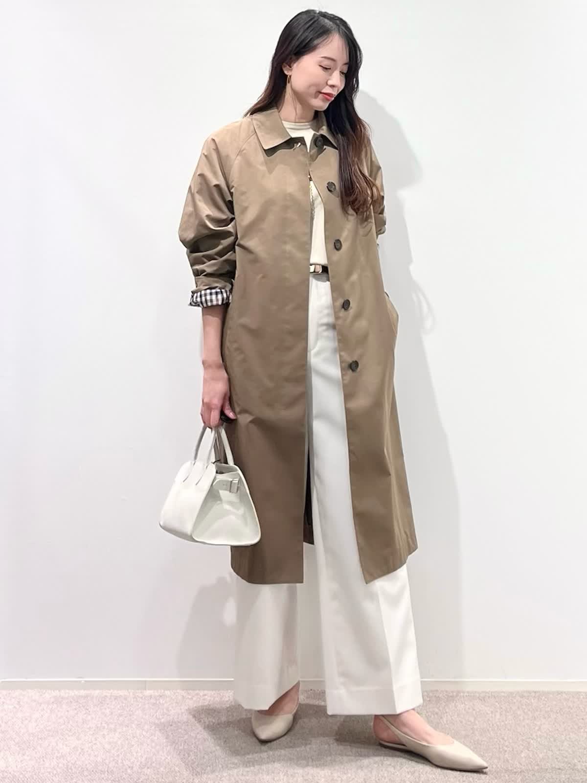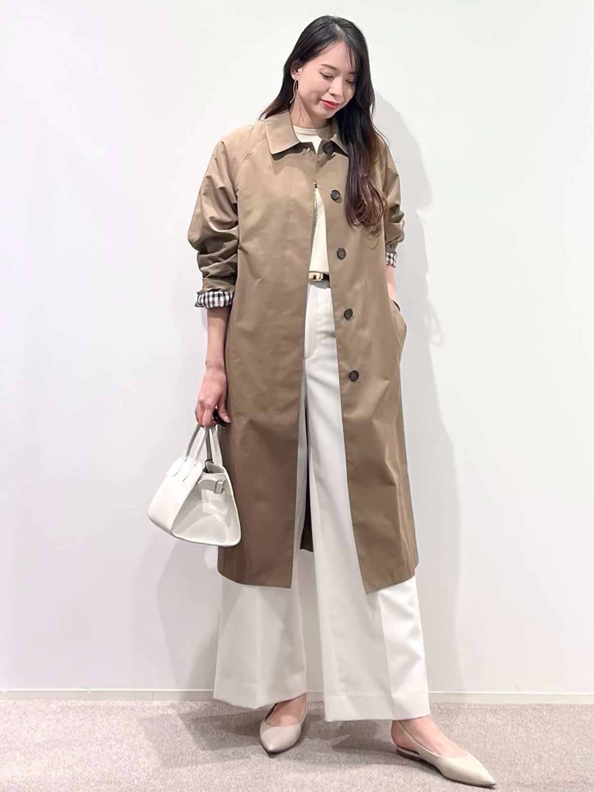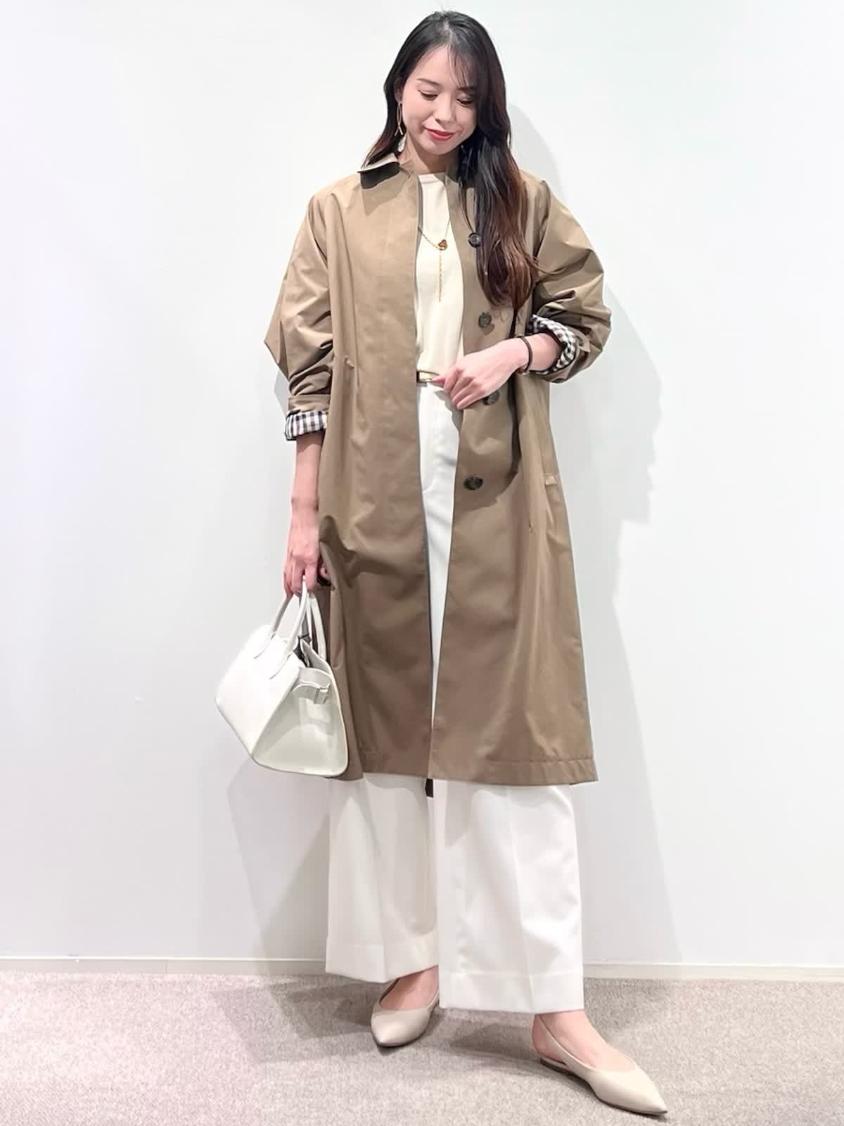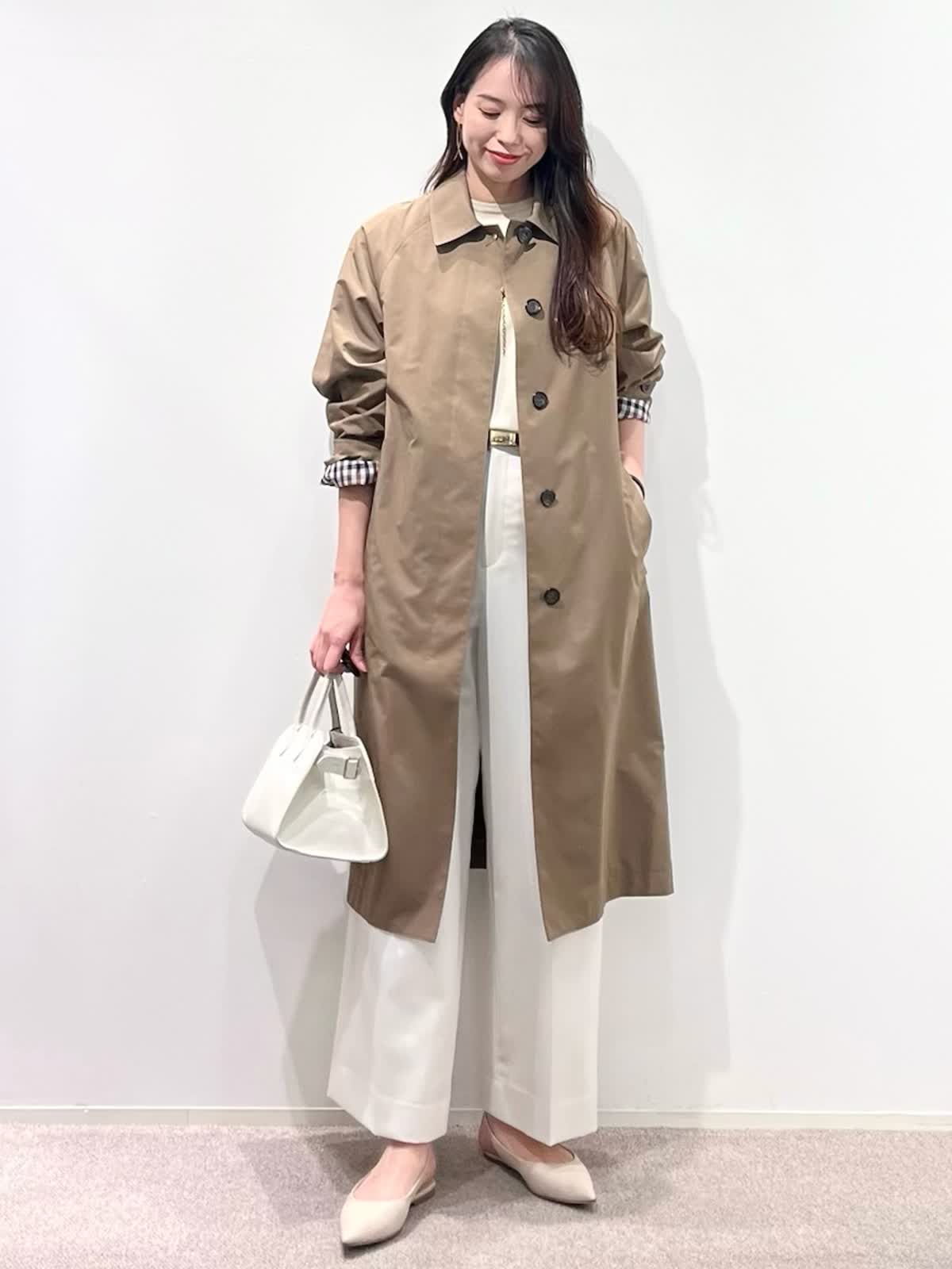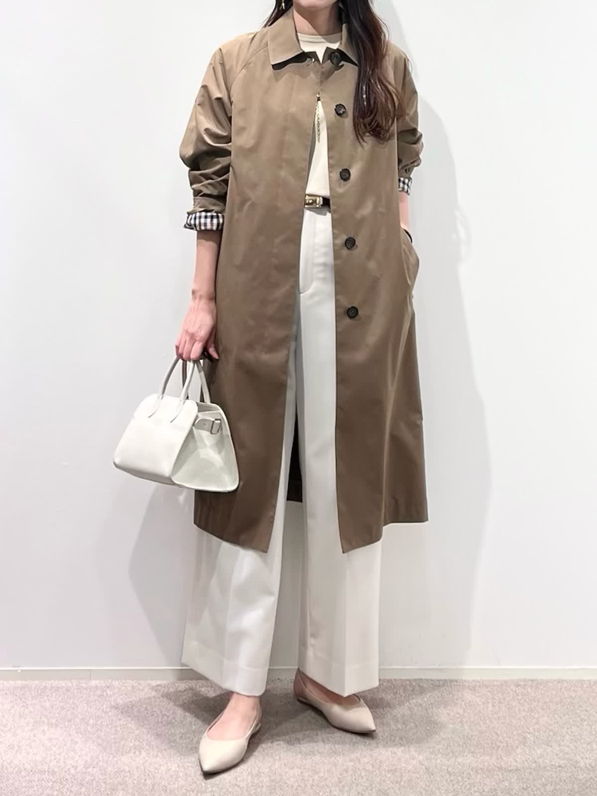 【着用サイズ】コート:9号 カーディガン:9号 ニット:9号 パンツ:9号 【着用カラー】コート:モカチャ カーディガン: ベージュ ニット:ベージュ パンツ:オフホワイト バッグ:グレー 、グレーベージュ 「春のお出かけ王道アウター×パンツコーデ」 軽くて羽織るだけで一気に春顔になる【アクアスキュータム】のステンカラーコート。ゆとりのあるシルエットとロング丈のバランスがすっきり着こなせるデザイン。袖口のチェックの裏地がおしゃれで、こなれ感のある着こなしに。 インナーは、オフィスシーンや休日にも万能なニュアンスカラーのアンサンブルニット。オーバーサイズの1枚着ニットと、ベーシックカーディガンで、単品でも着回し力抜群です。 ロングシーズン活躍出来るおすすめの春コーデです。