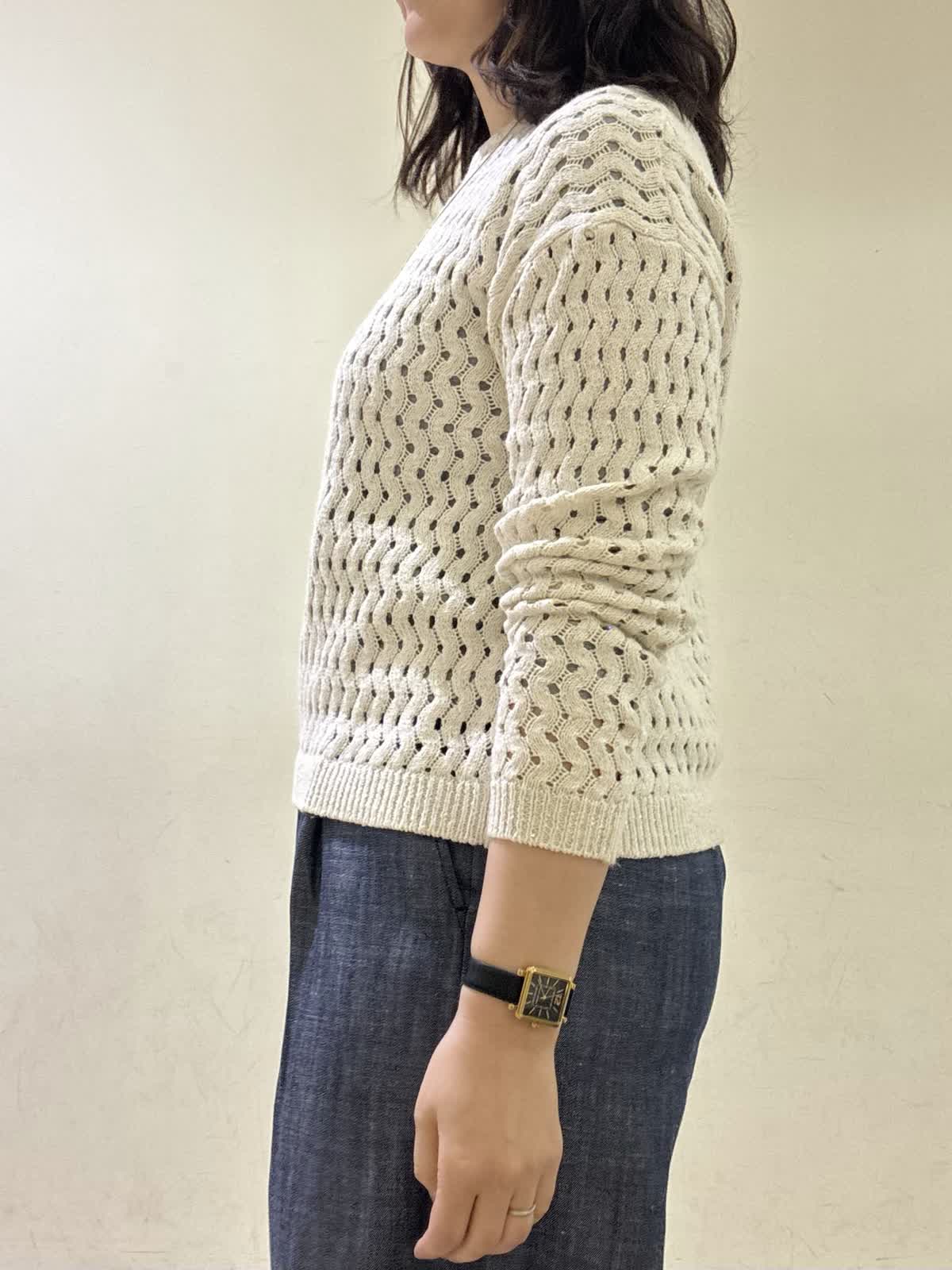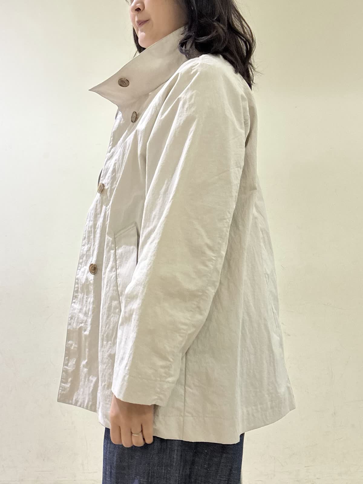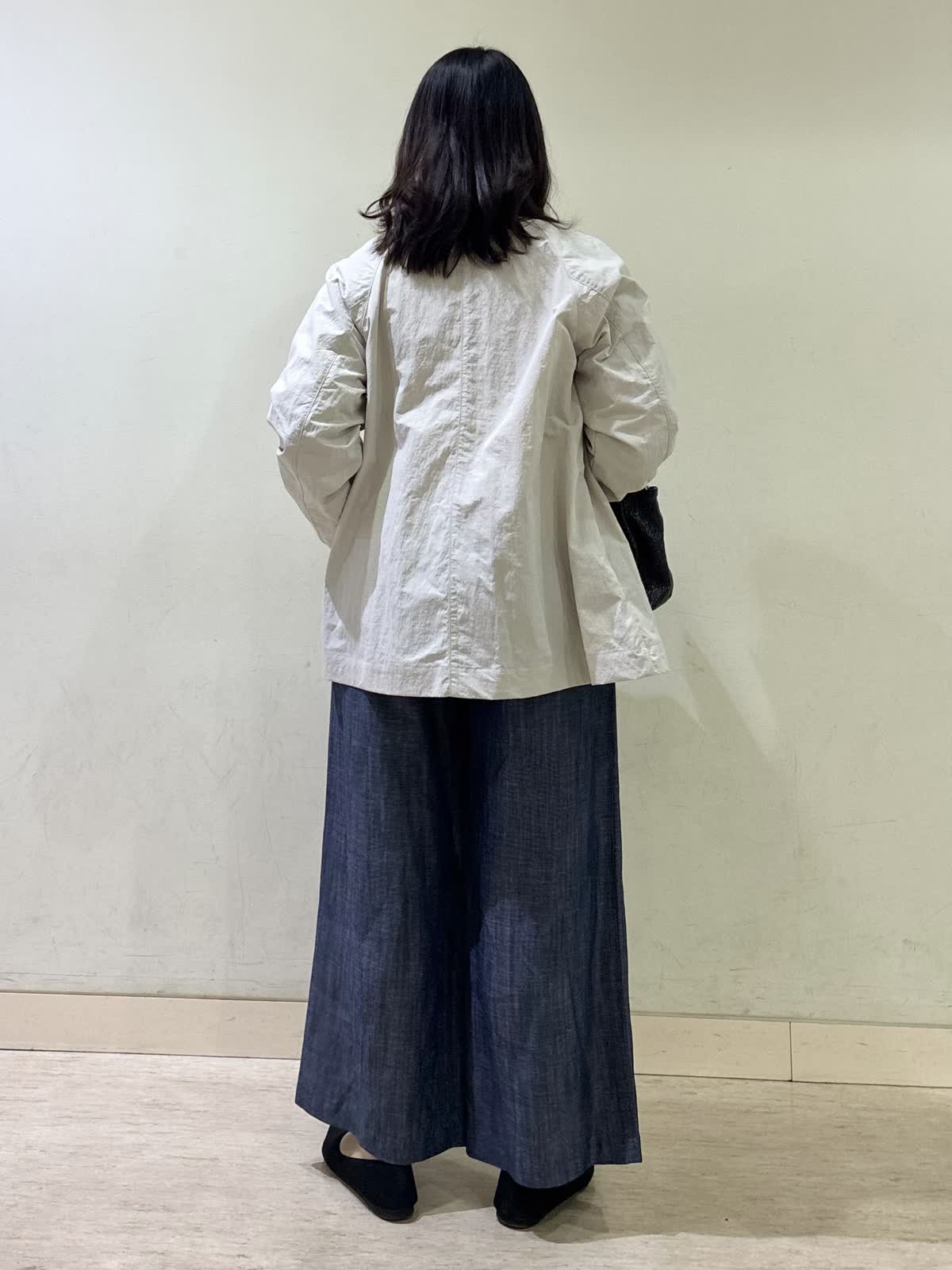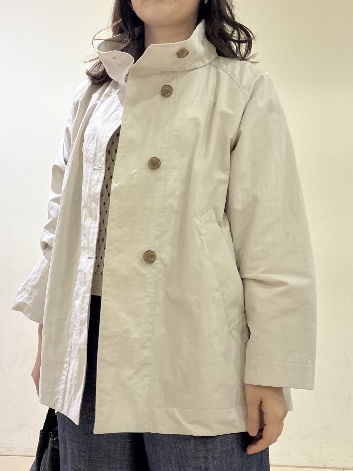 【着用カラー/サイズ】コート:グレーベージュ/フリー セーター:オフホワイト/フリー パンツ :ネイビー/11号 通勤でも休日でも使いやすいミドル丈コートです。ナイロン素材なのでとても軽くて、さっと羽織りやすいです。ハリ感があるので前を開けても襟がしっかりと立ちます。透かし柄セーターと合わせて春らしくコーディネート。
