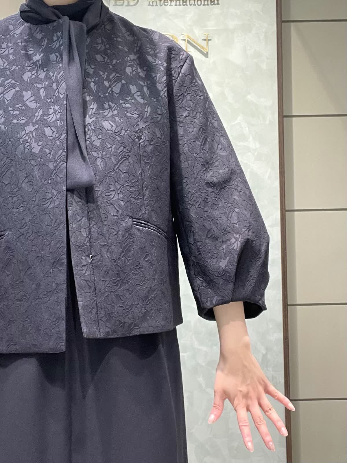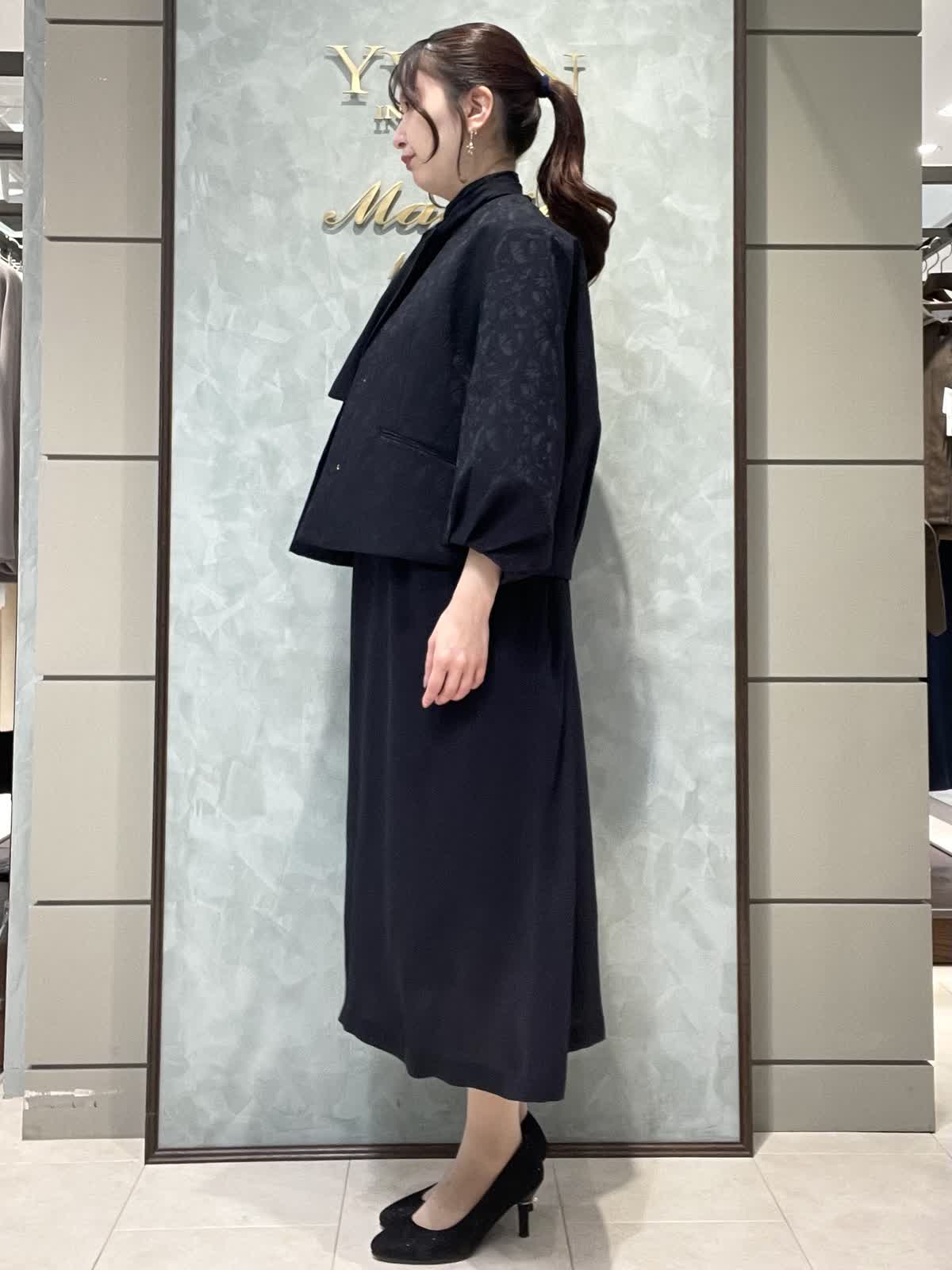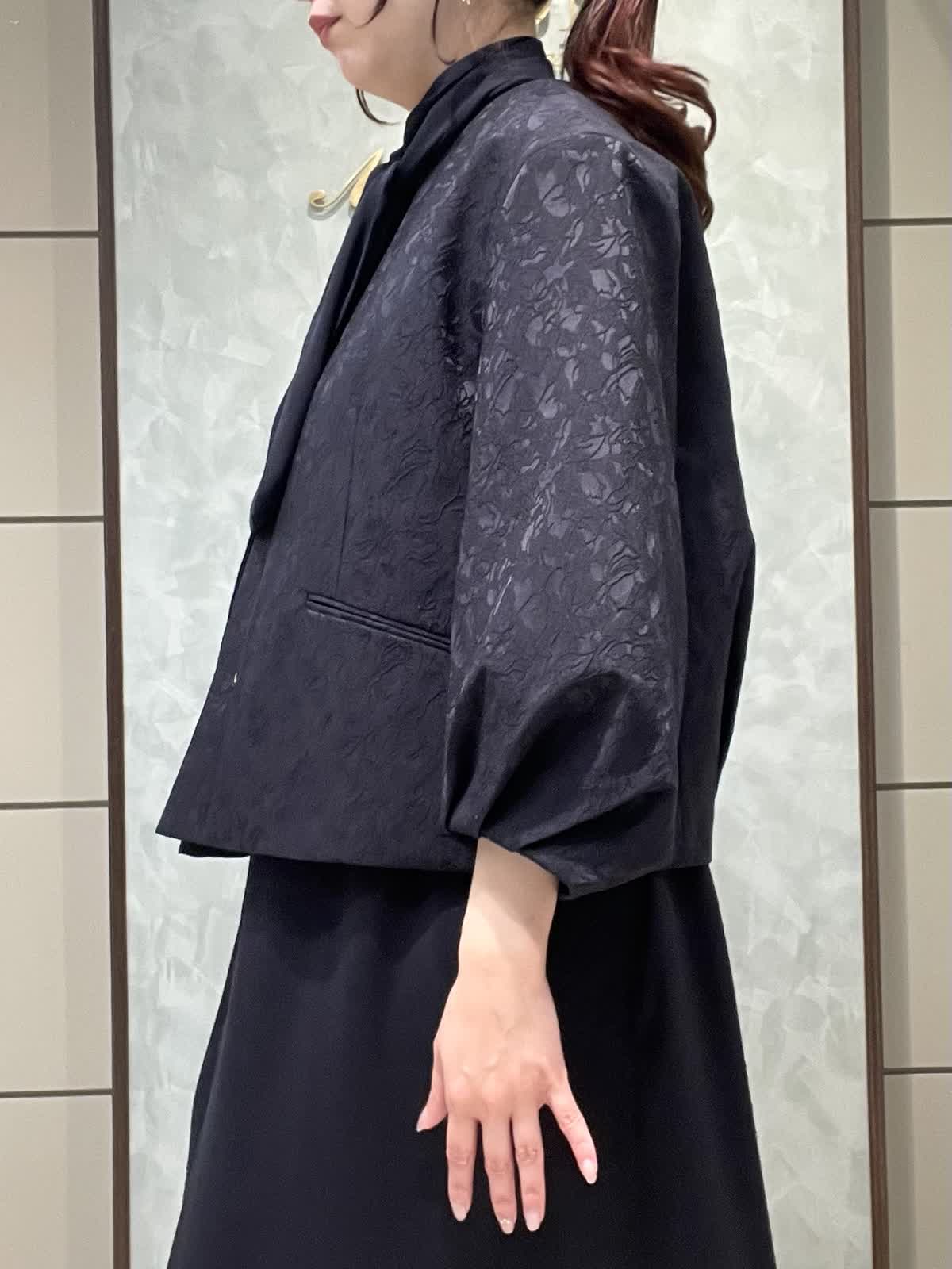 【着用サイズ】ジャケット:7号 ワンピース:7号 セレモニースタイリングです。ジャケットはシーズンレスで着用できる軽くて羽織りやすいジャガードのお素材です。丸みのあるお袖、ゆったりすぎない身幅、すっきりの着丈で全体のバランスが良いです。普段使いでカットソーにデニム合わせも素敵です。ワンピースはさらっとしていて落ち感のあるポリエステルのお素材です。ボディライン拾いにくく、シルエットが綺麗です。お袖口ゴム、ポケットあり、ペチコート付きです。着丈は157センチでふくらはぎくらいです。