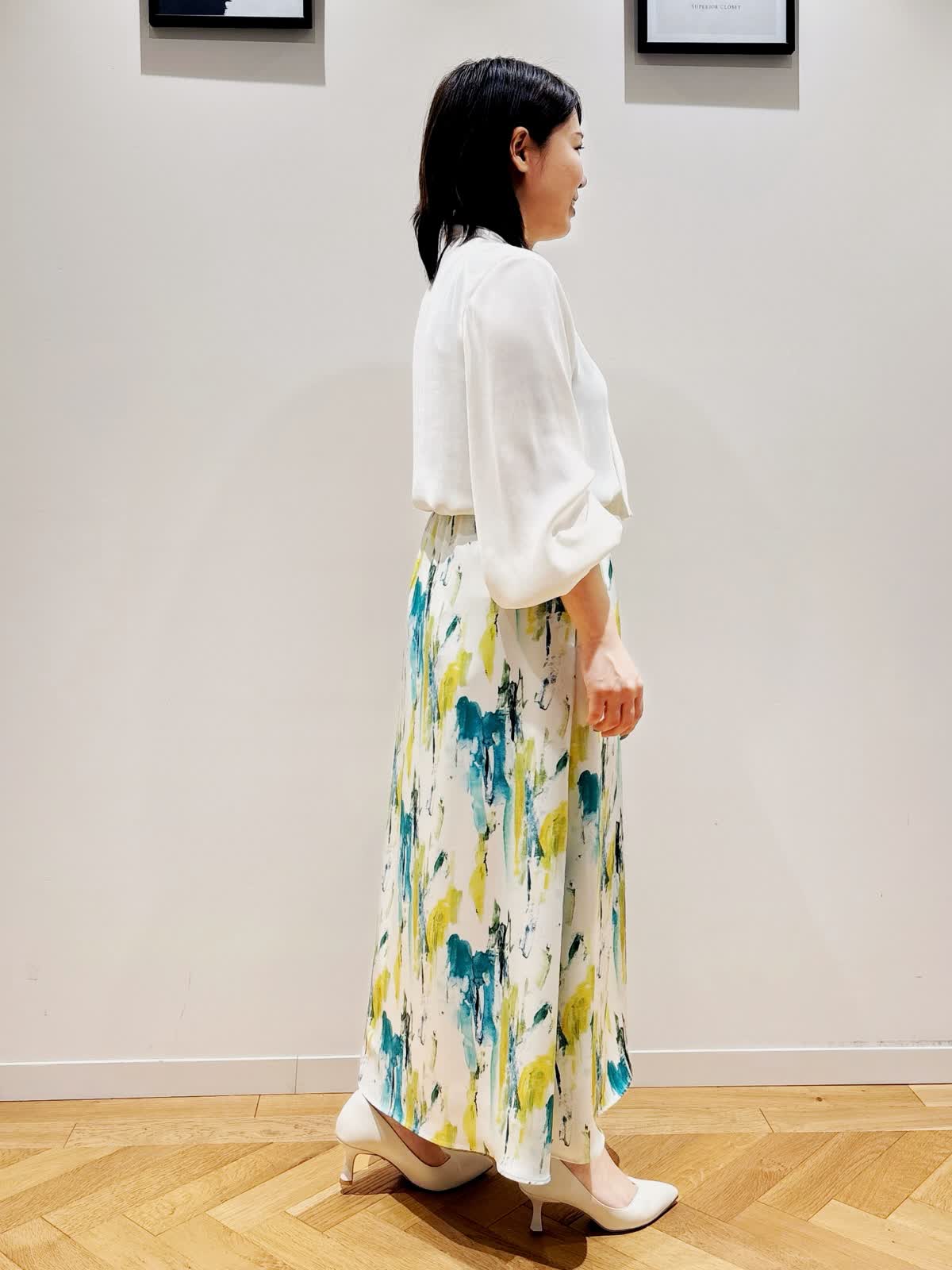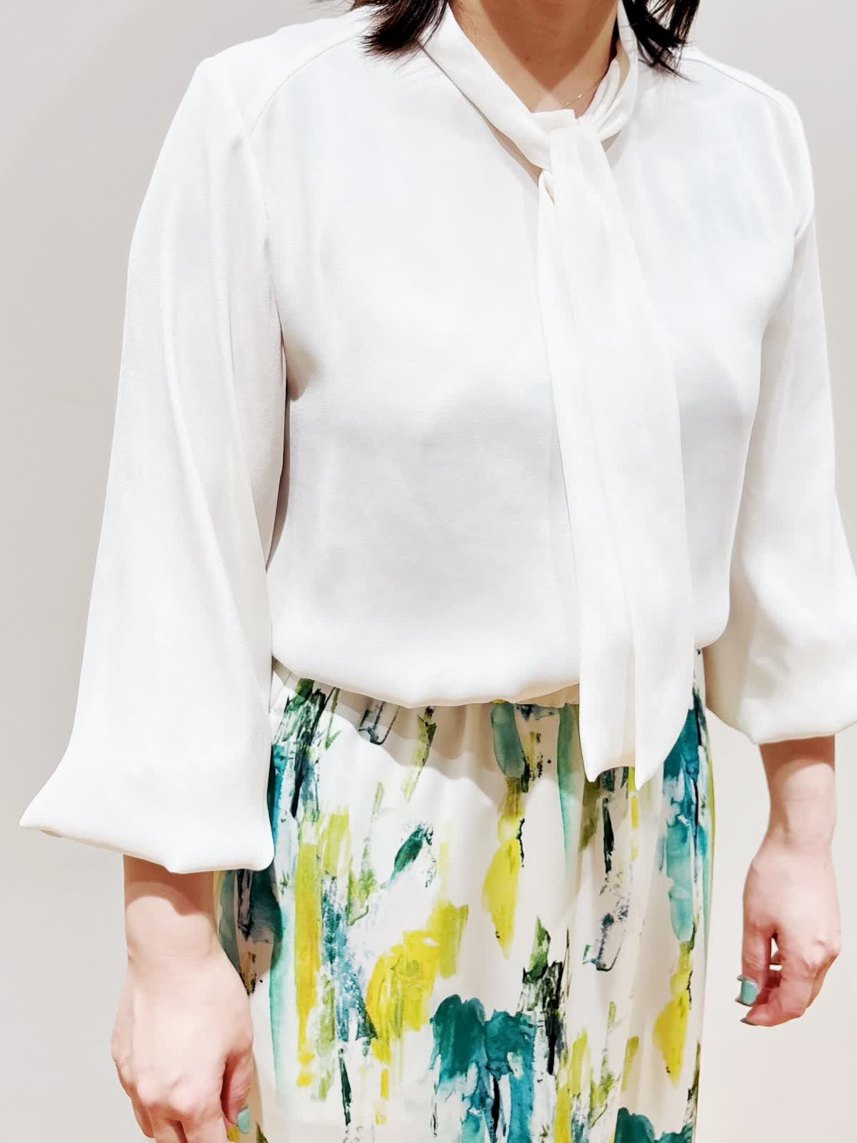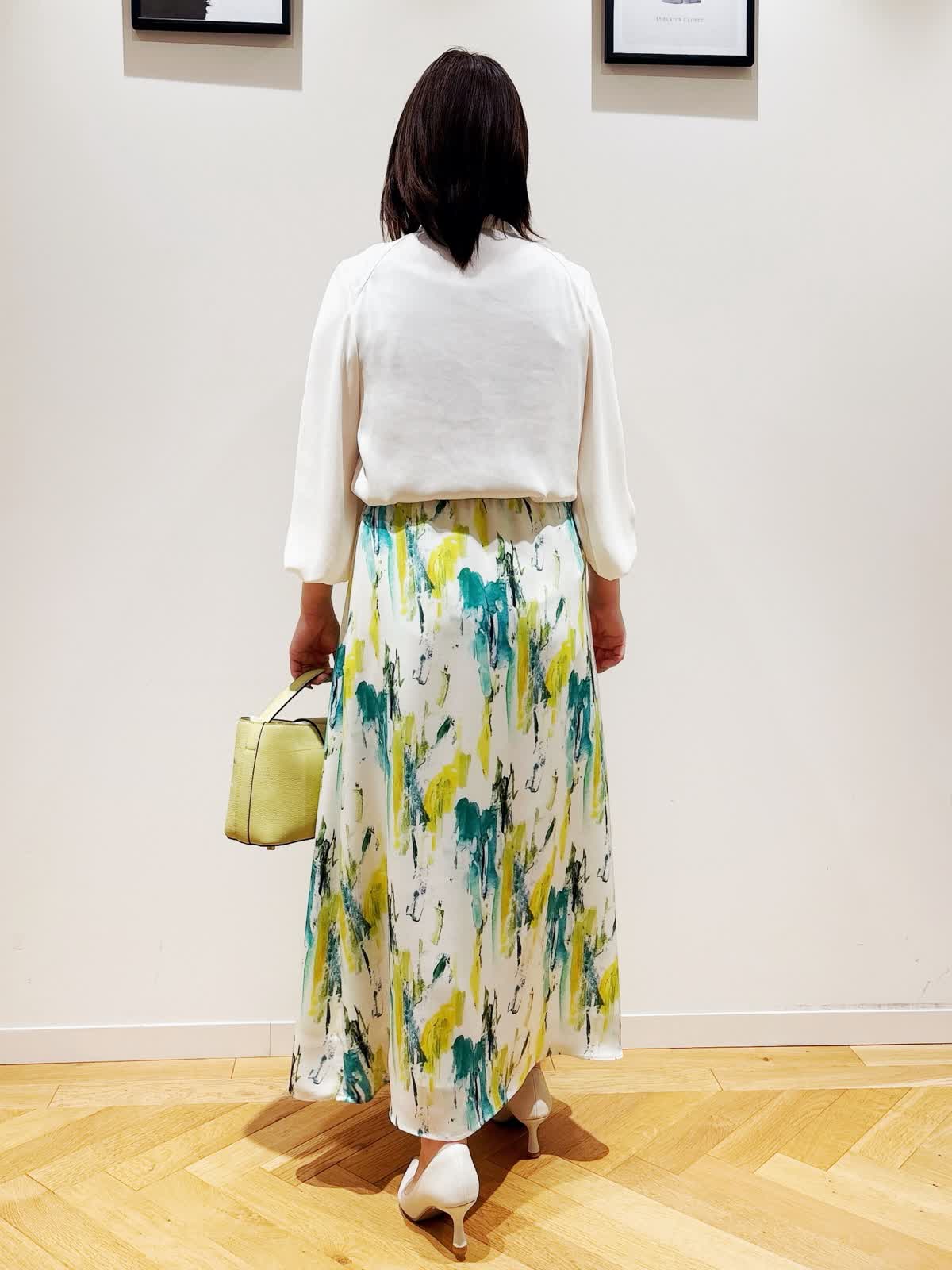【着用サイズ】全て9号 【着用カラー】ブラウス:オフホワイト スカート:ペパーミント バック:キミドリ ブラウスは前開きになっており着脱しやすいです。ボリューム感のある袖のデザインがこなれ感のある雰囲気を演出します。スカートはキレイ色のプリントデザインです。サラッと落ち感のある生地なので広がりすぎないです。ウエストはゴム仕様なので、低身長の方でも調整しやすいです。