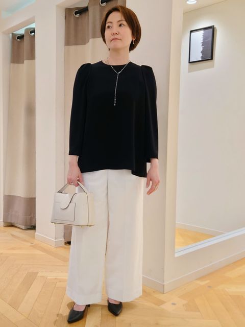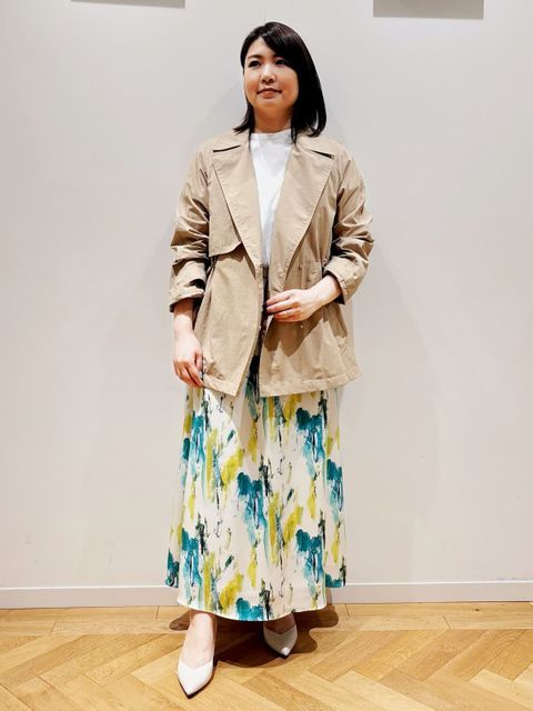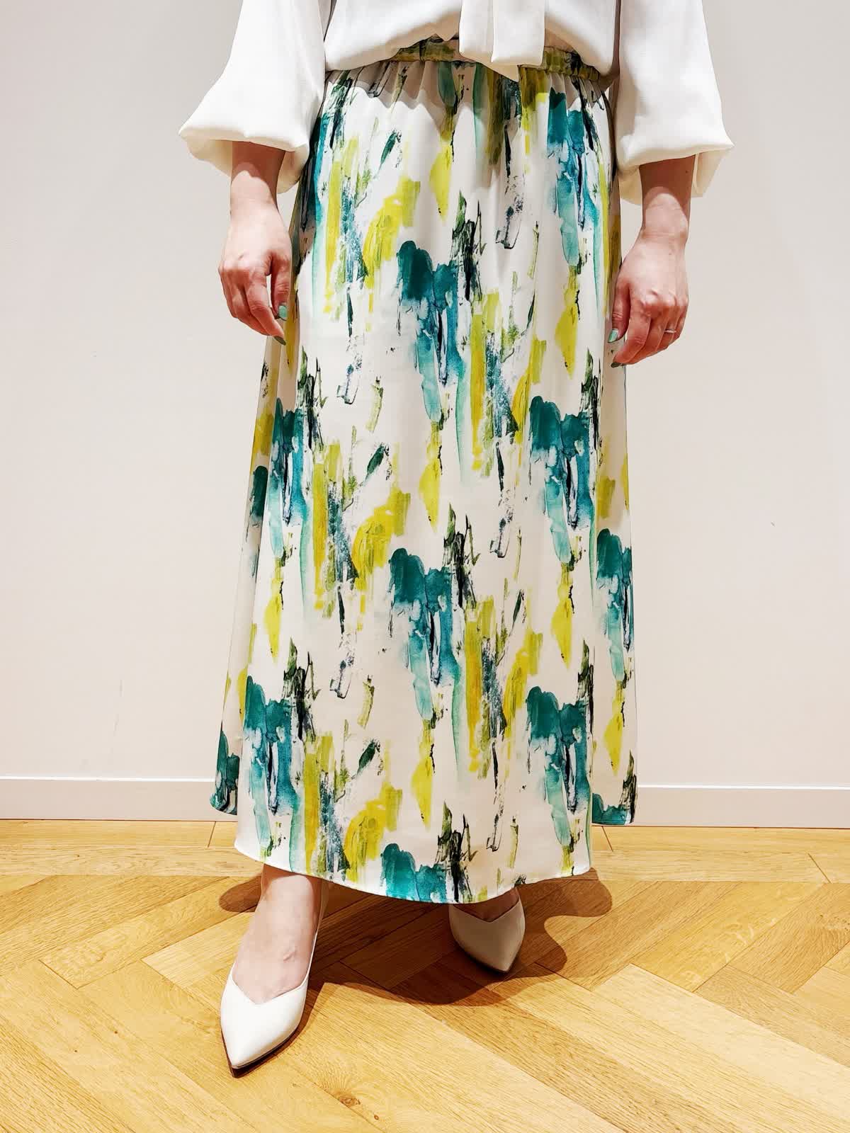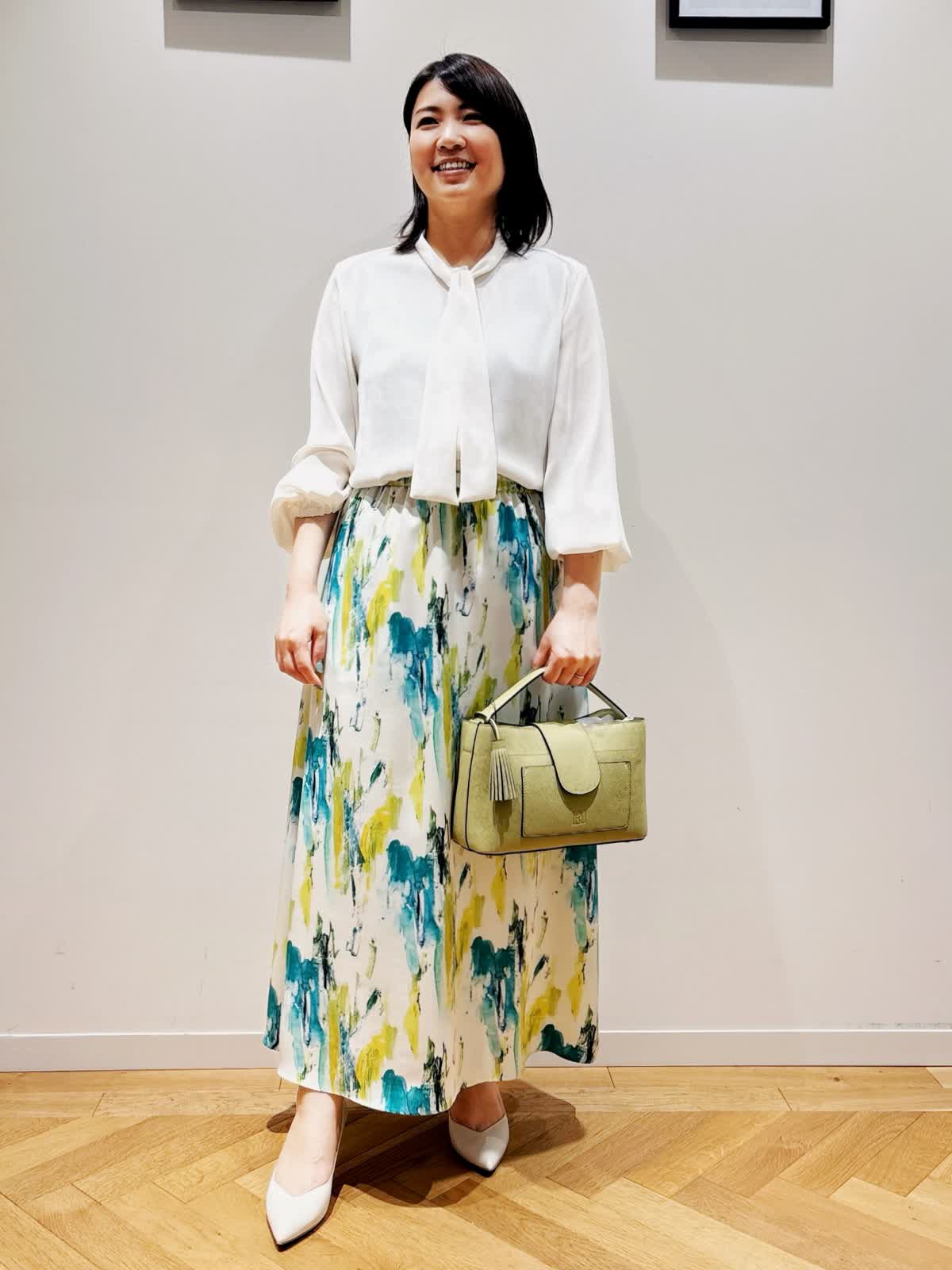 【着用サイズ】全て9号 【着用カラー】ブラウス:オフホワイト スカート:ペパーミント バック:キミドリ ブラウスは前開きになっており着脱しやすいです。ボリューム感のある袖のデザインがこなれ感のある雰囲気を演出します。スカートはキレイ色のプリントデザインです。サラッと落ち感のある生地なので広がりすぎないです。ウエストはゴム仕様なので、低身長の方でも調整しやすいです。