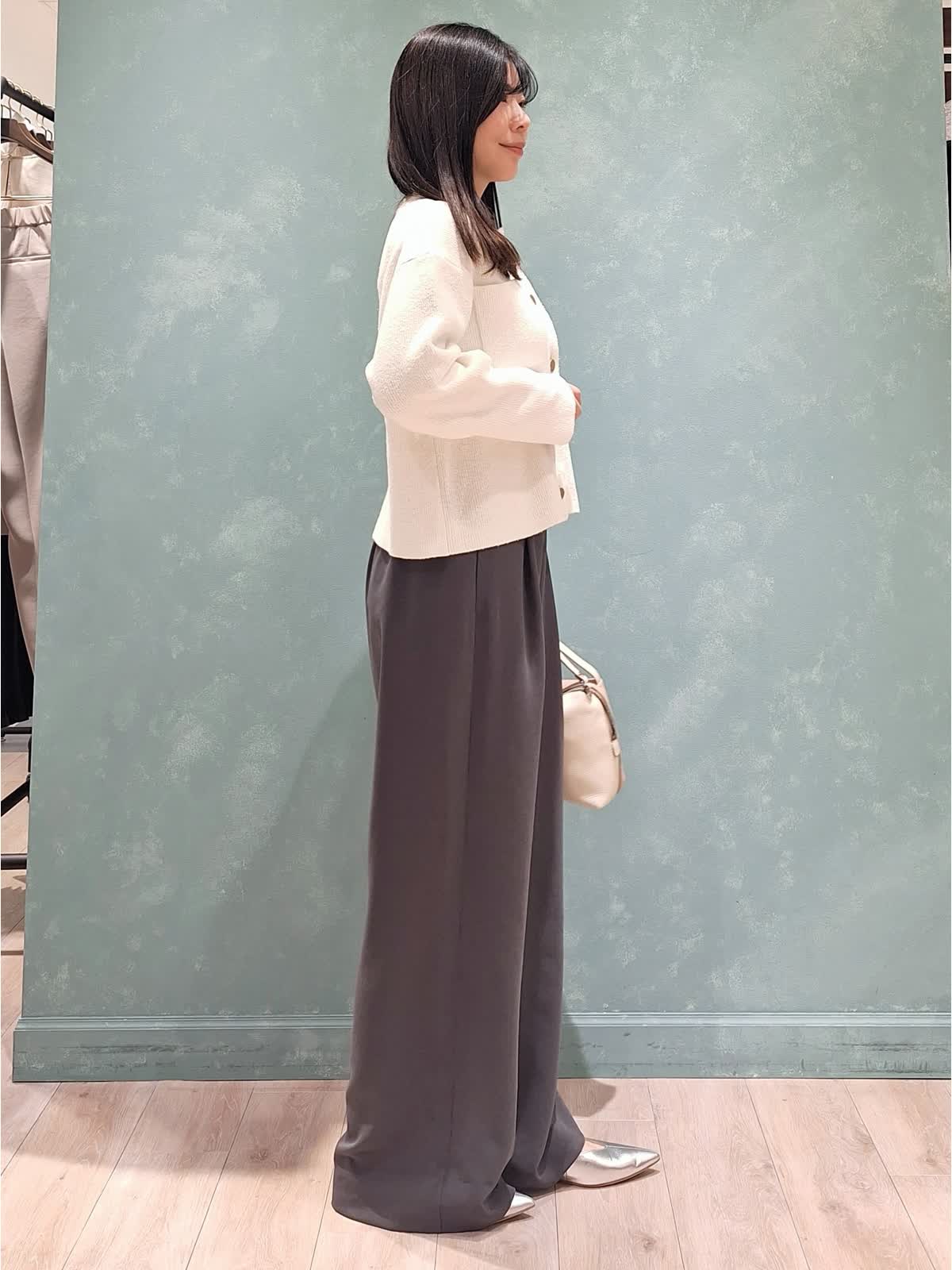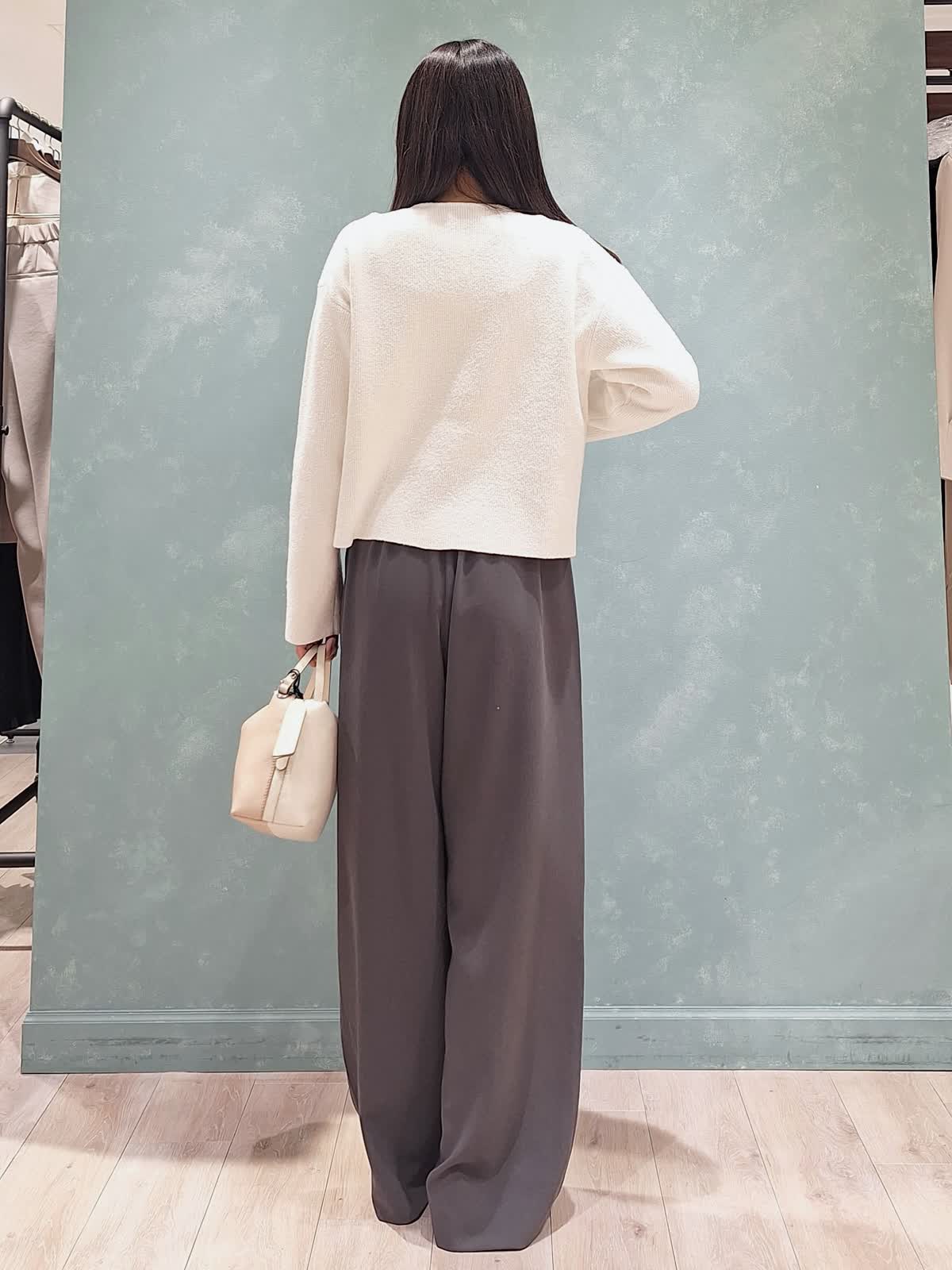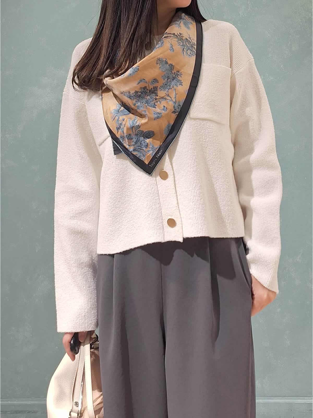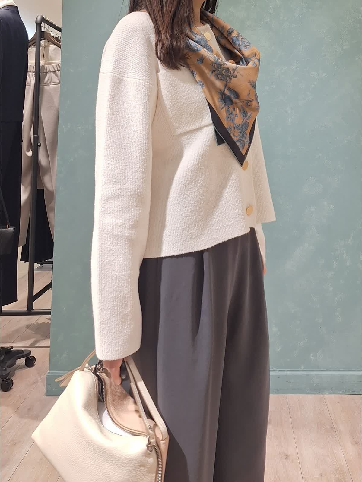 【着用サイズ、カラー】カーディガン:9号、オフホワイト パンツ7号、チャコールグレー 春の休日お出掛けスタイル。金ボタンがポイントのクルーネックニットカーディガン。弾力のあるブークレ生地で着心地もGOOD!程よくゆったり着れるサイズ感で重ね着も◯長すぎない着丈で着るだけで決まります。ボトムはイージーワイドパンツ。ファスナー無し、ゴム仕様のバックウエストで超楽チン♪シワもなりにくいので旅行にもお勧めです。一着あるとロングシーズン活躍します!首元にはスカーフを合わせて大人のカジュアルスタイルにコーディネートしました。