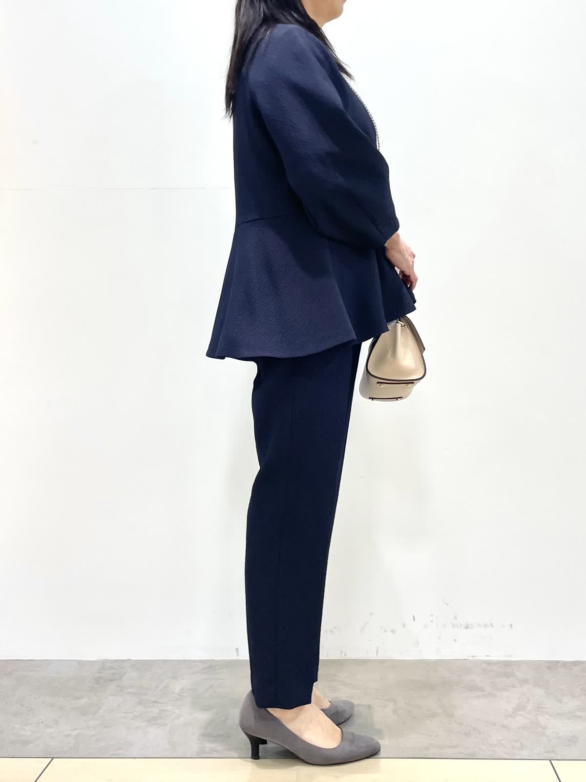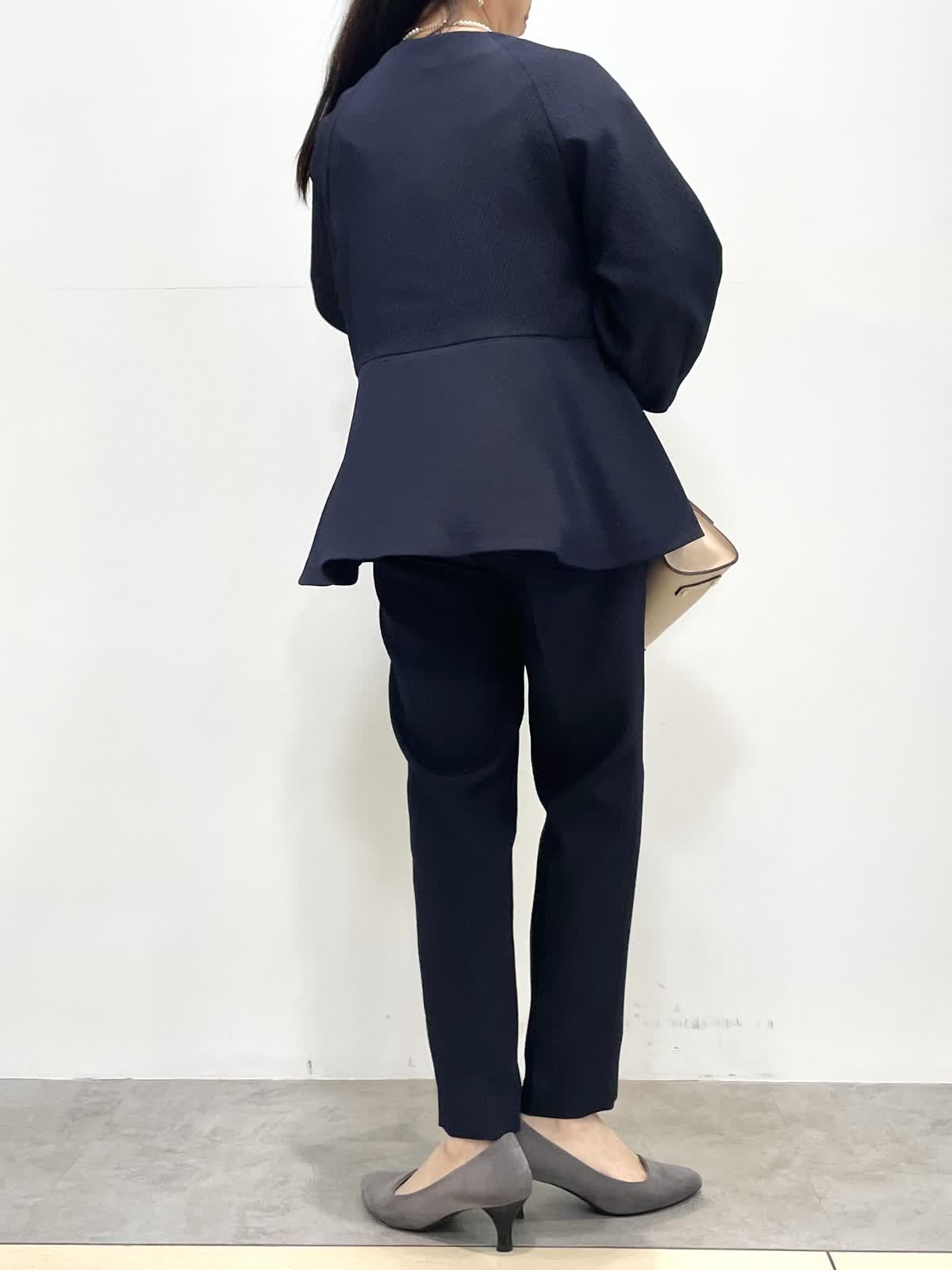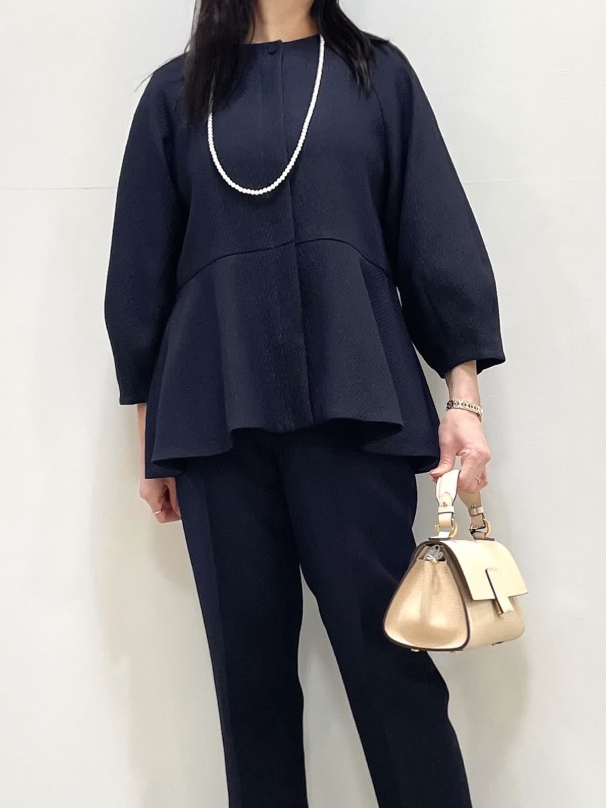 【着用サイズ】全て9号 【着用カラー】ネイビー 華やかセレモニースタイル。立体的な織り柄の高級感のあるブラウスとパンツのセットアップ。とても軽くふんわりとした着心地です。シワになりにくいのも嬉しいポイント。ブラウスは前開きなので羽織としても着用いただけます。