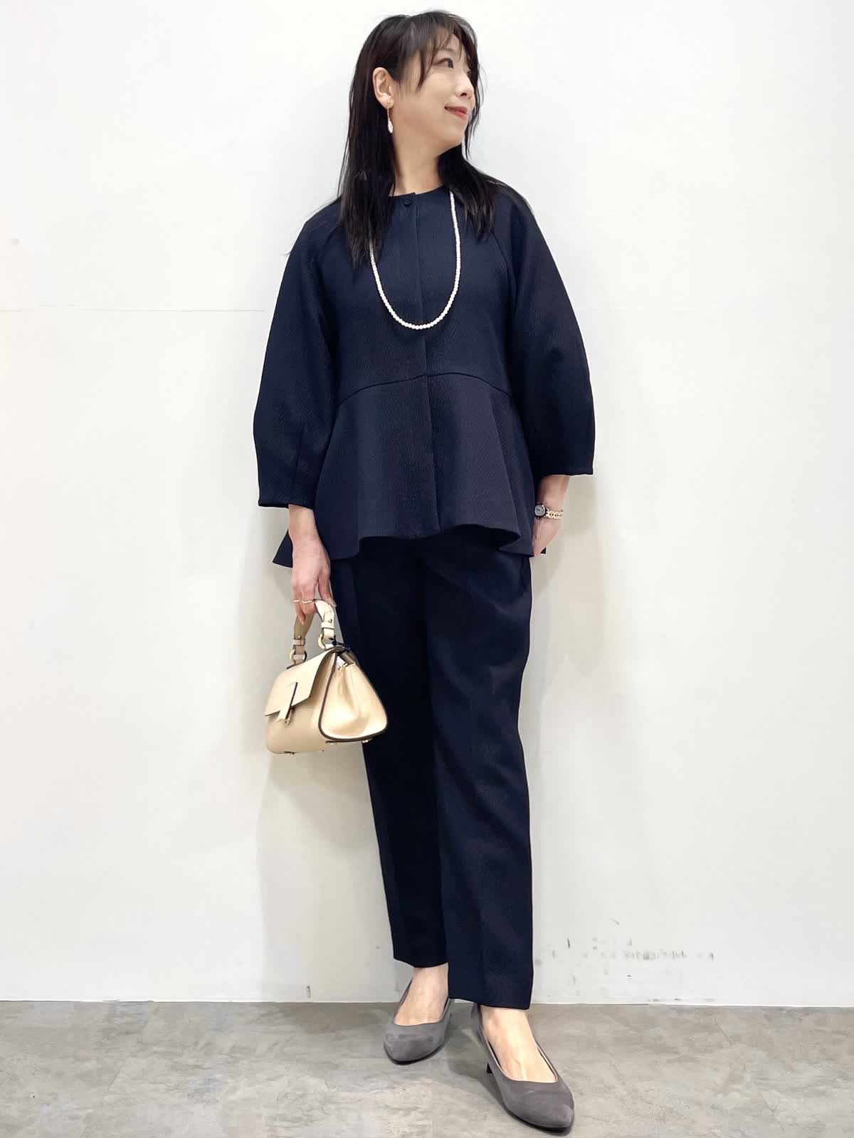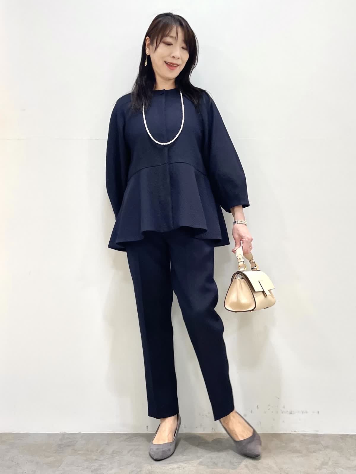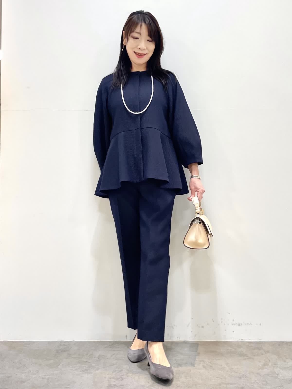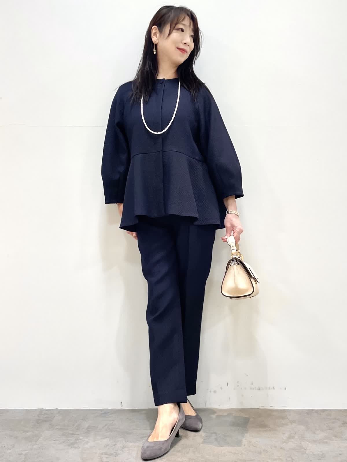 【着用サイズ】全て9号 【着用カラー】ネイビー 華やかセレモニースタイル。立体的な織り柄の高級感のあるブラウスとパンツのセットアップ。とても軽くふんわりとした着心地です。シワになりにくいのも嬉しいポイント。ブラウスは前開きなので羽織としても着用いただけます。