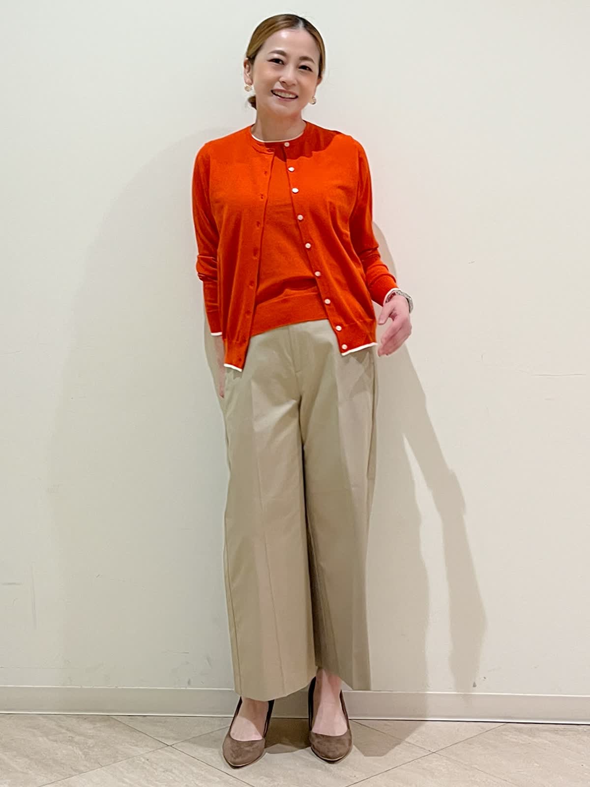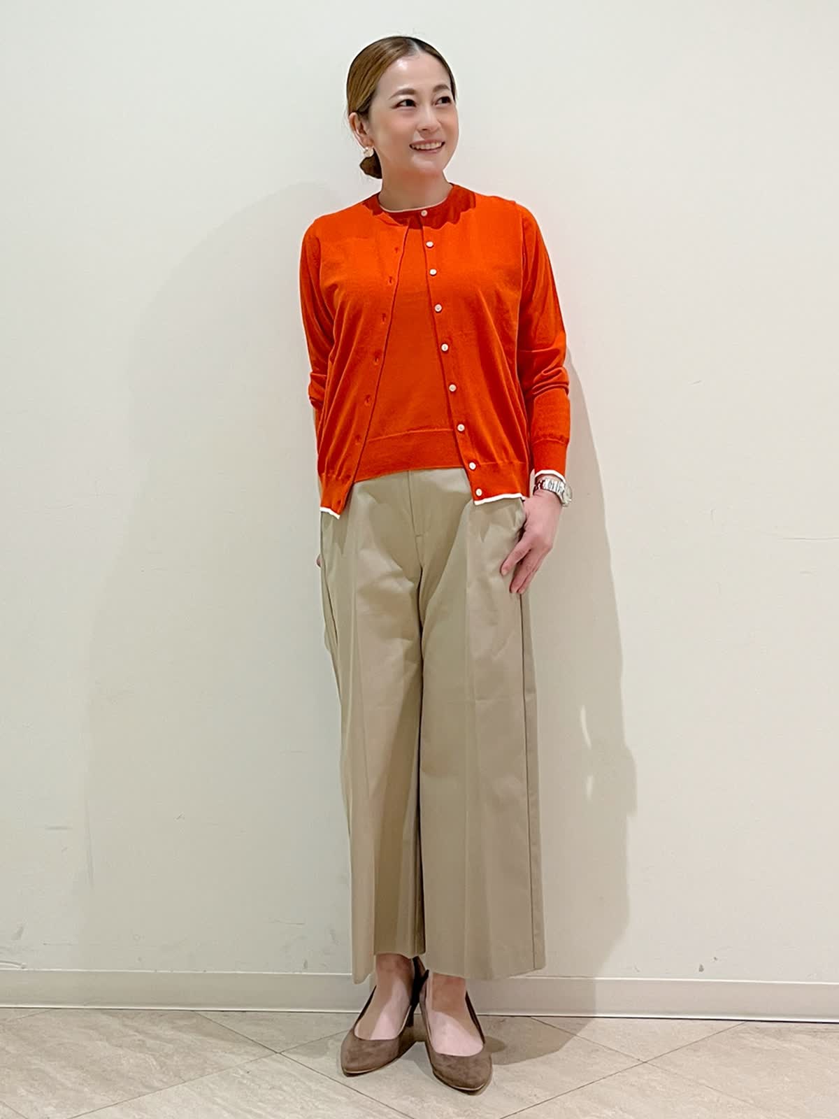 【着用サイズ】アンサンブル:9号 パンツ:9号 【着用カラー】アンサンブル:シュイロ パンツ:キャメル 春のお出かけコーディネートです。パッと目を引くきれい色のアンサンブルです。お顔まわりを明るく見せてくれます。着回し力のあるアンサンブルです。それぞれ単品でもスタイリングを楽しめます。パンツは脚のラインを拾わない安心ワイドです。